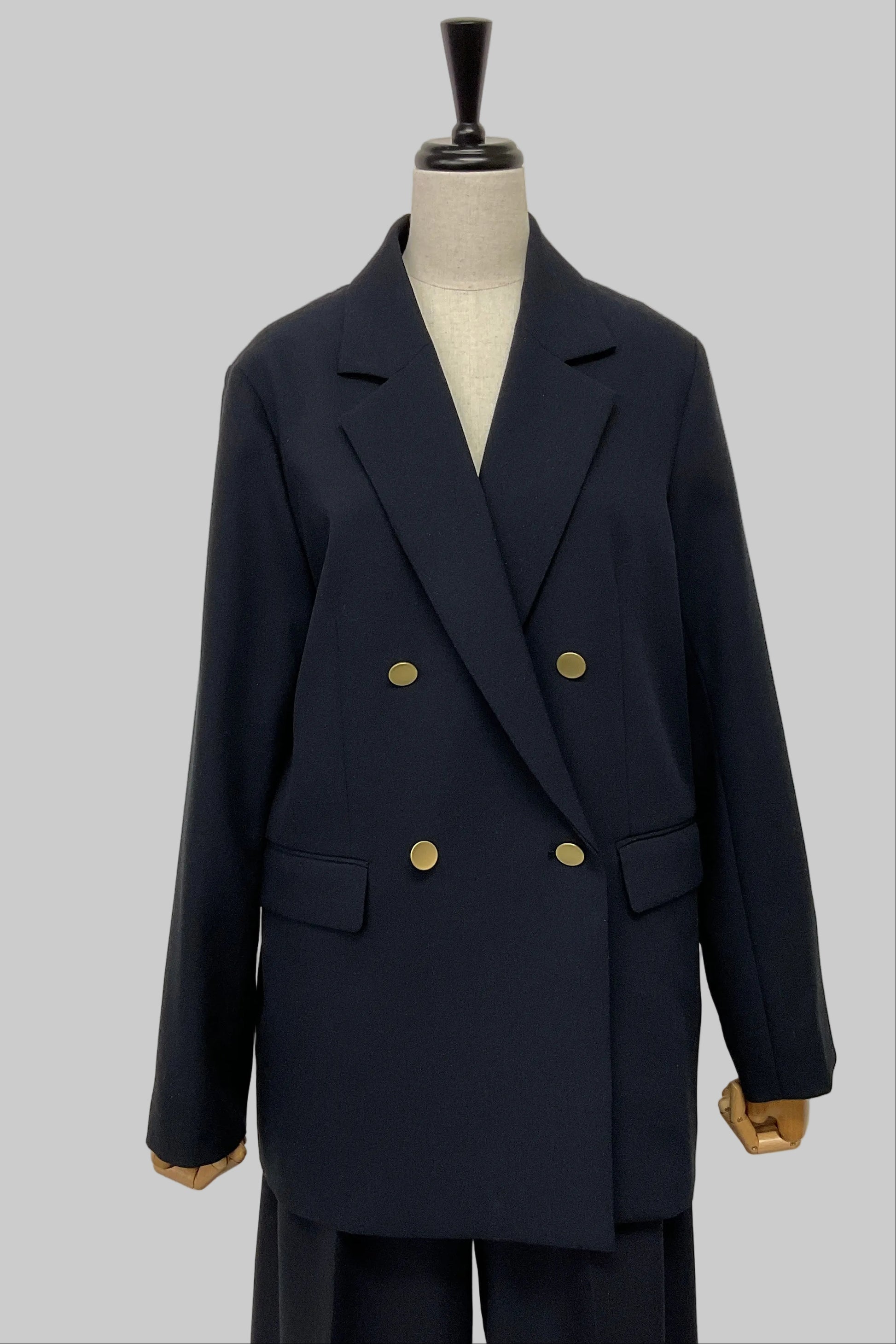 ダブルボタンのデザインと上品なゴールドボタンが、