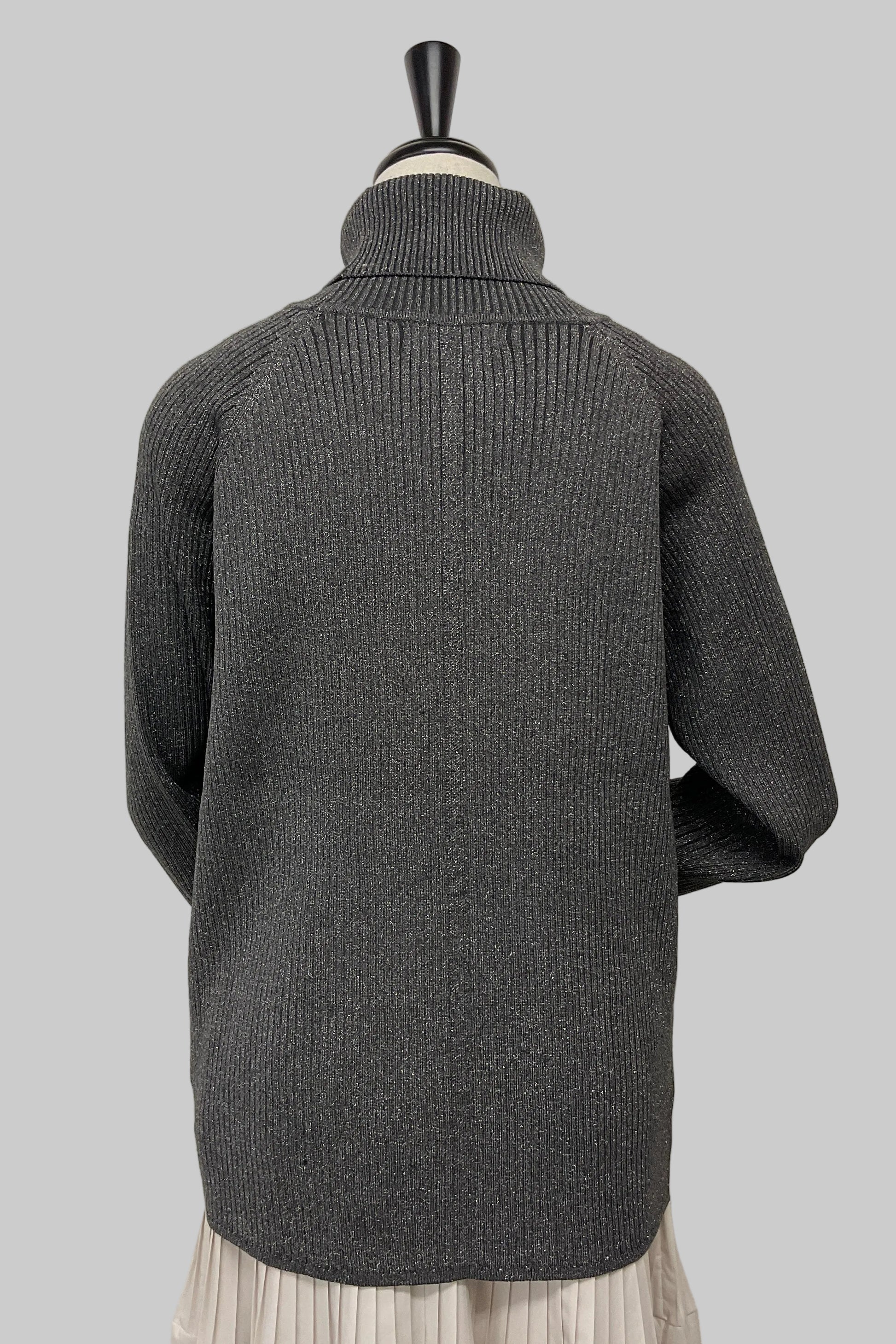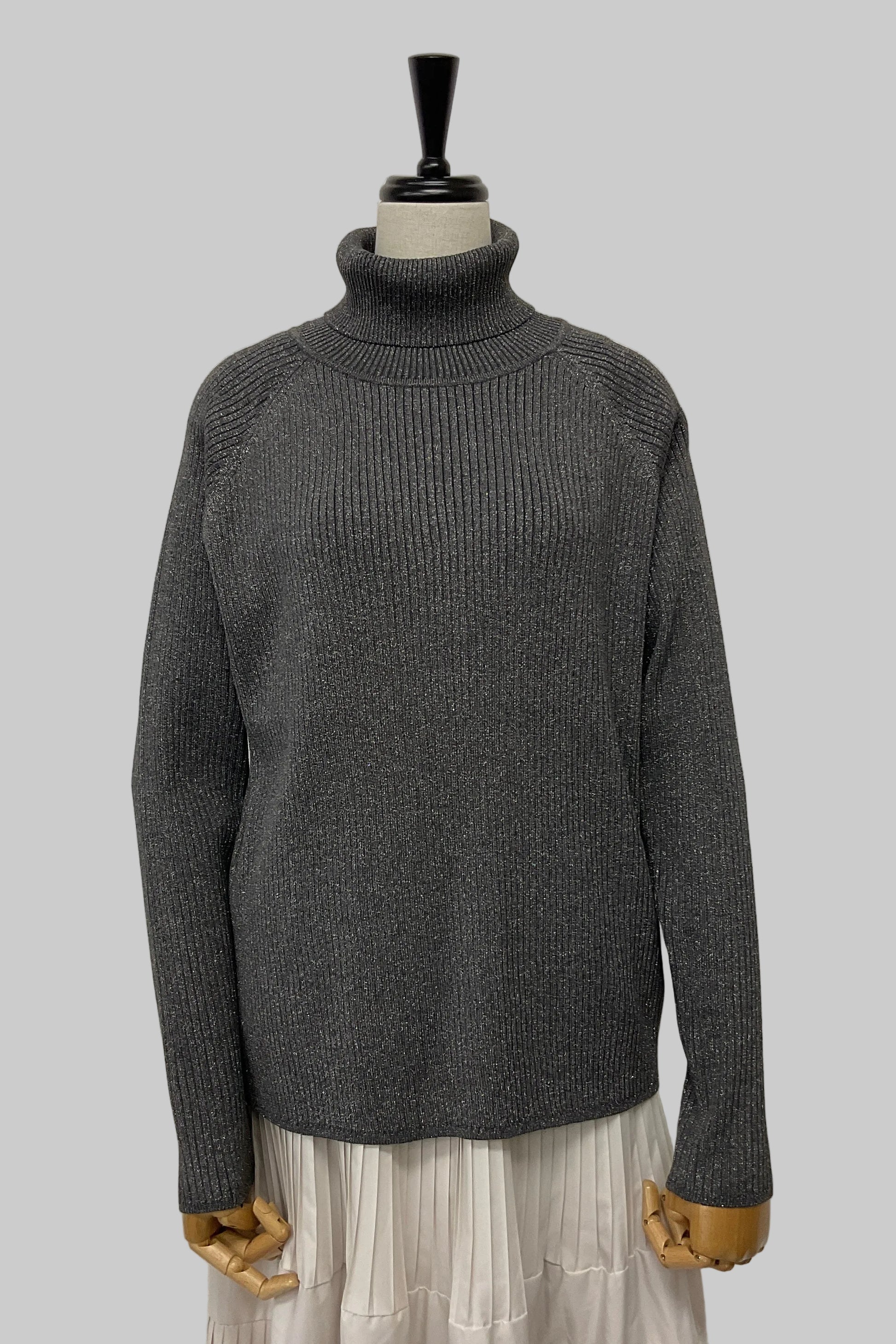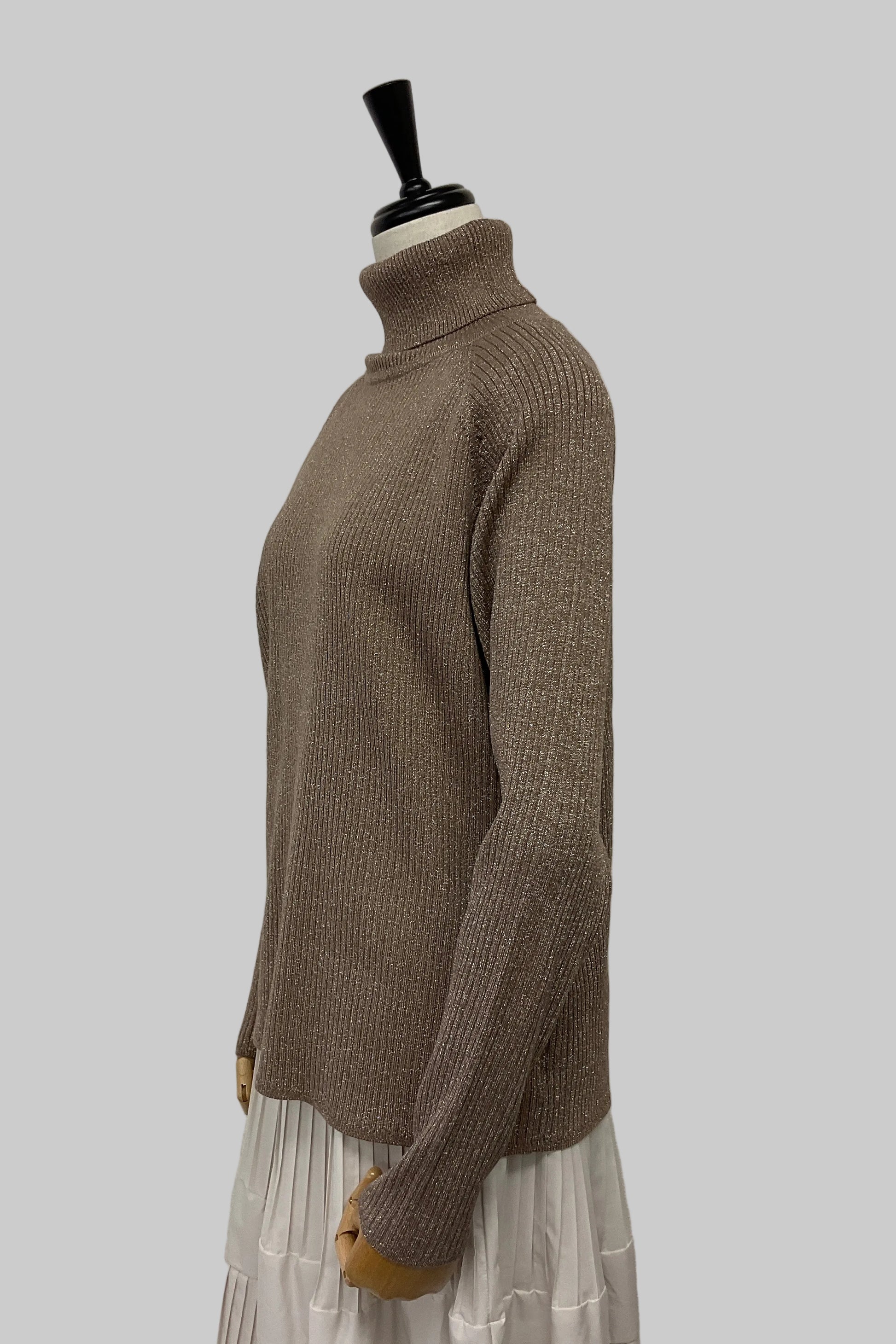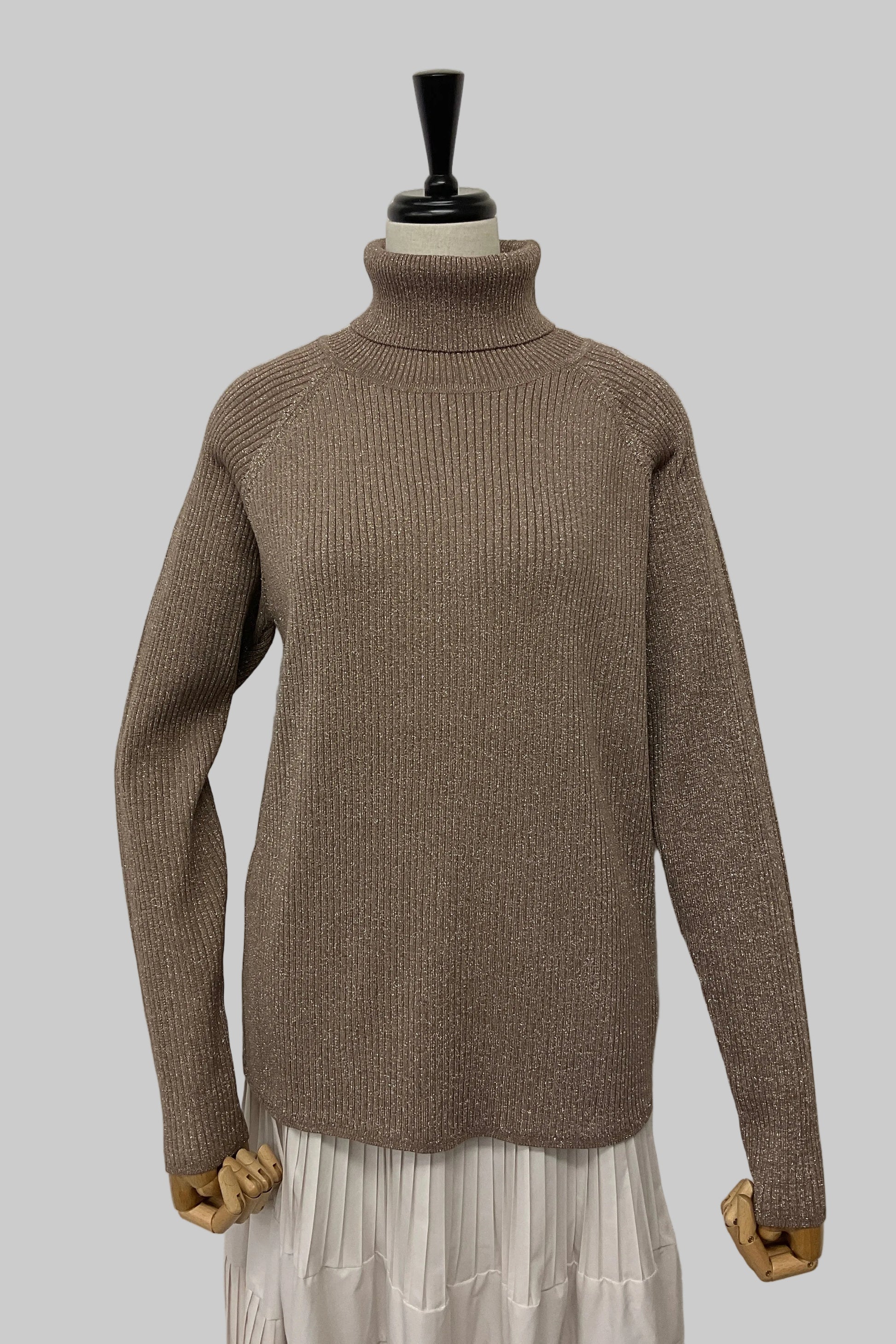 ほんのりと光を集めるラメ糸を全体に織り込み、上品なきらめきをまとったタートルニット。すっきりとしたリブ編みと細見えシルエットで、シンプルなのに女性らしく決まる一枚です。デイリーにもきれいめコーデにも合わせやすく、冬の装いにさりげない華やかさをプラスしてくれます。