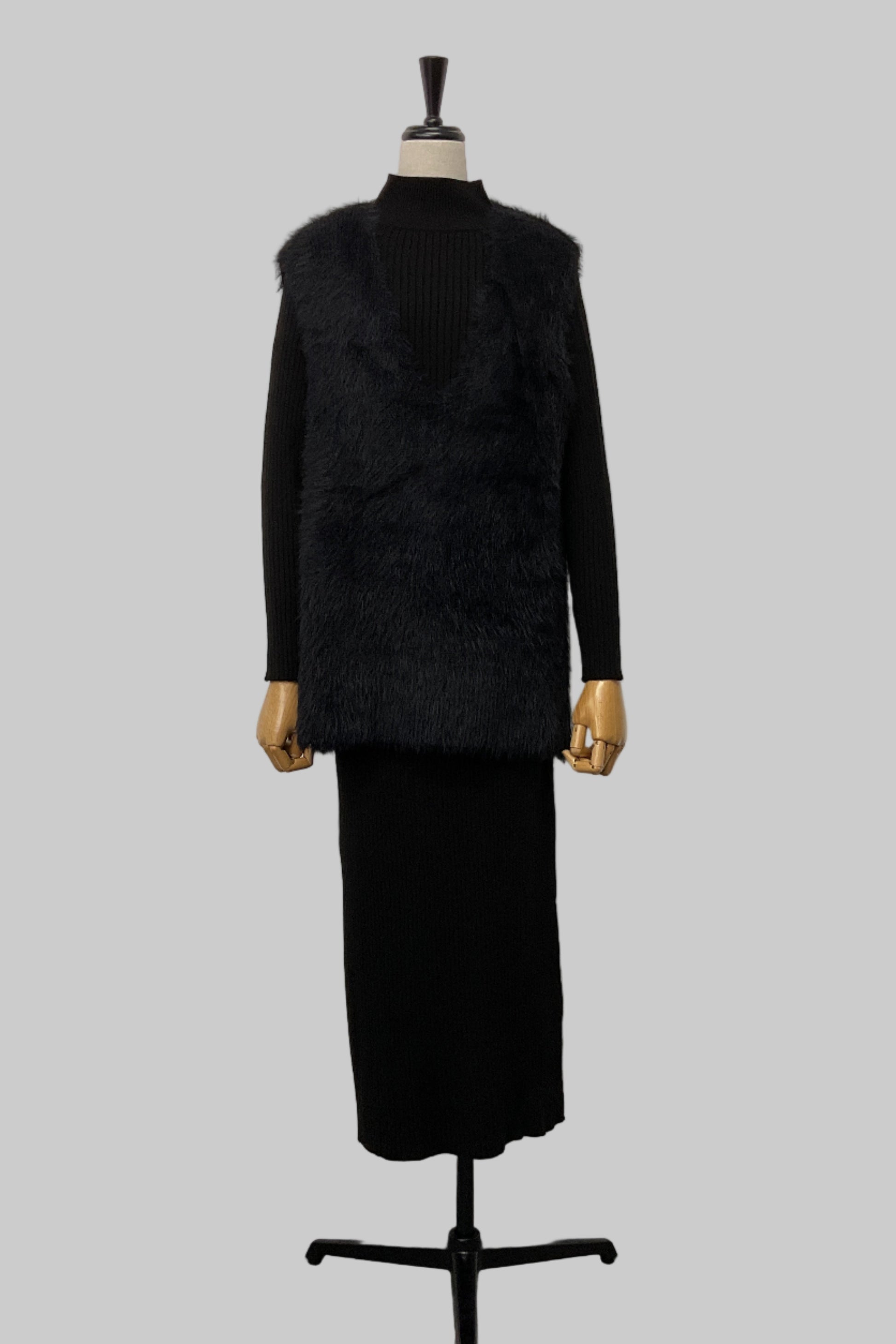 季節感たっぷりのシャギーベストと、すっきりシルエットのリブニットワンピースを組み合わせたセットアイテム。異素材のコントラストが映える、シンプルながらも存在感のある着こなしを叶えます。