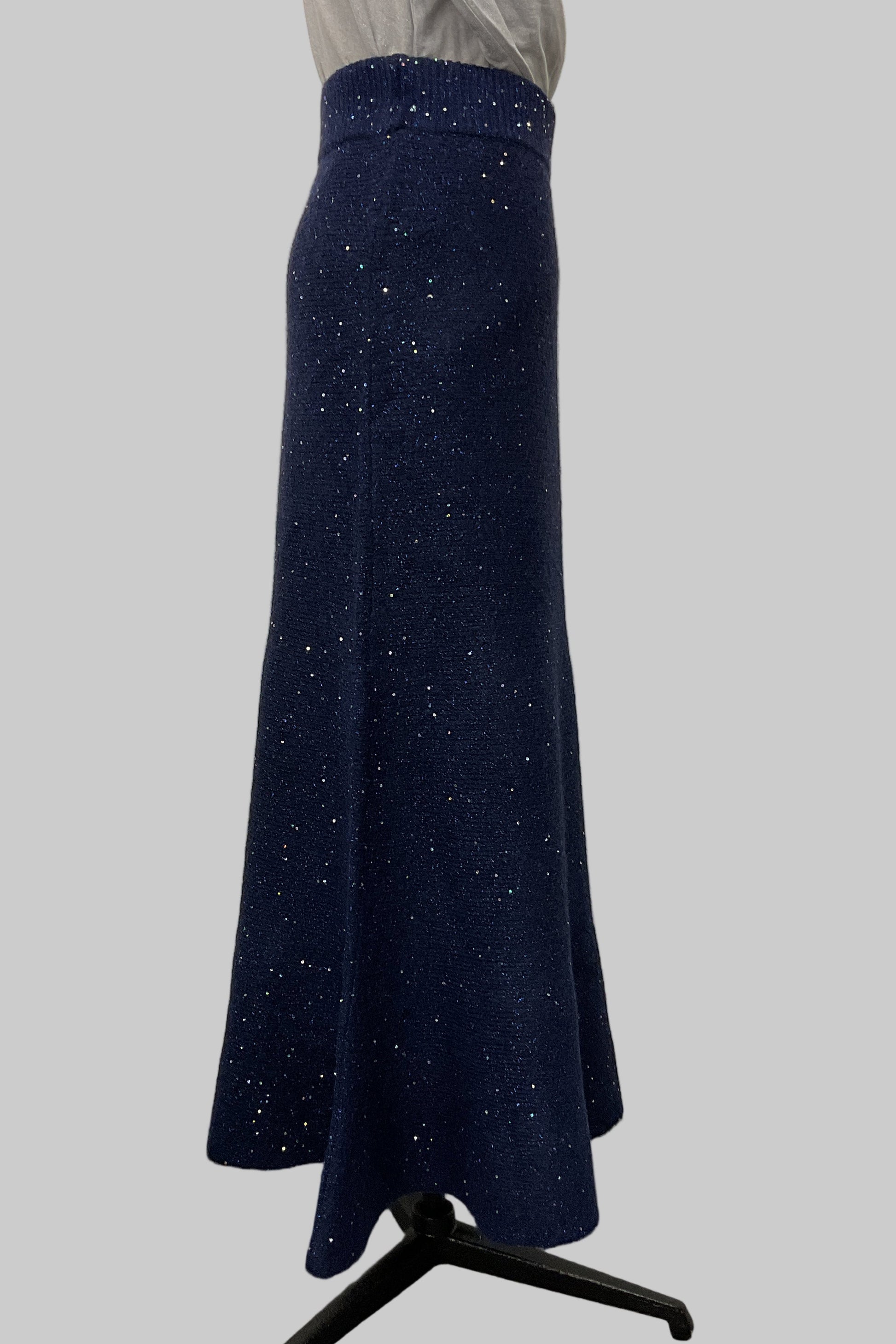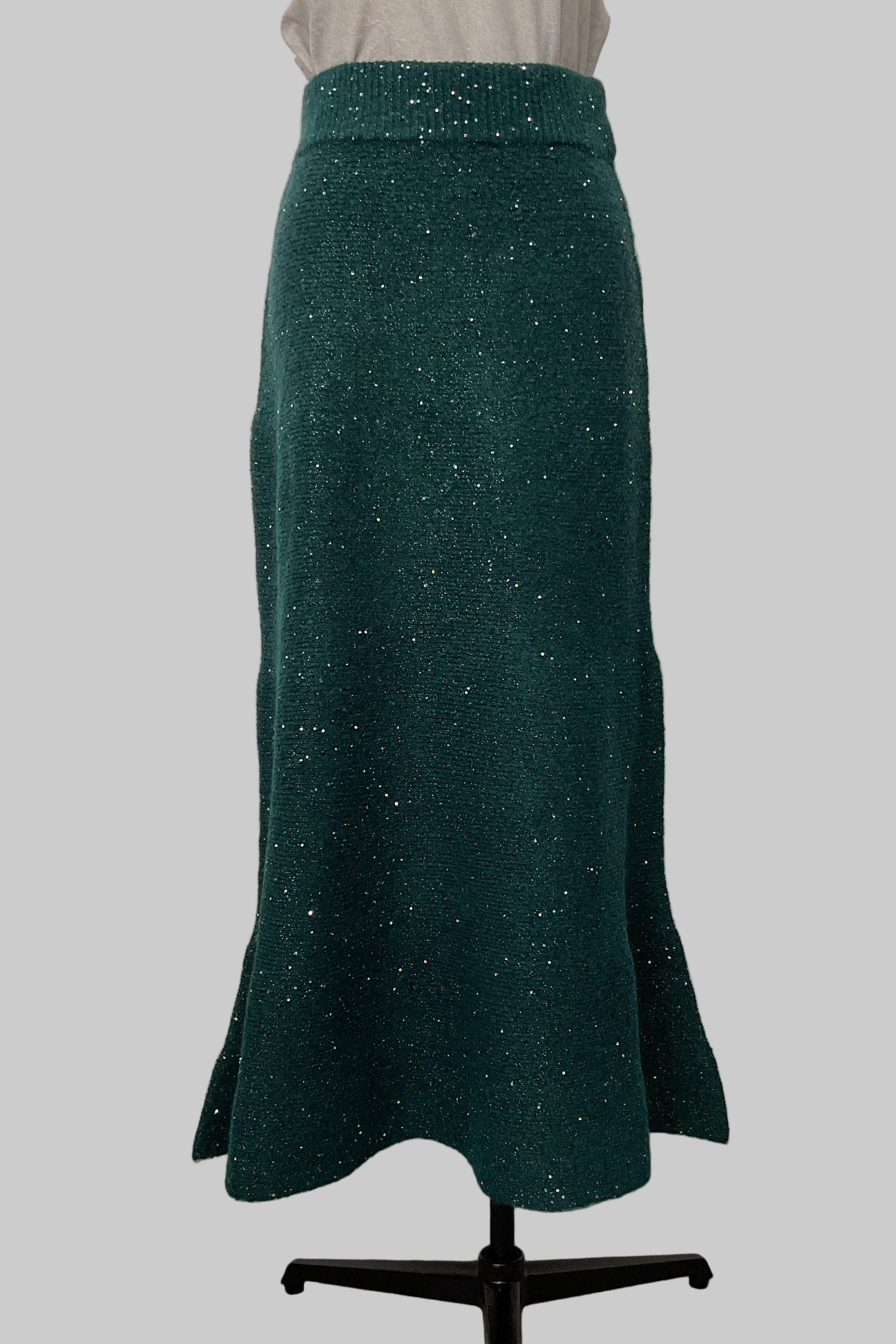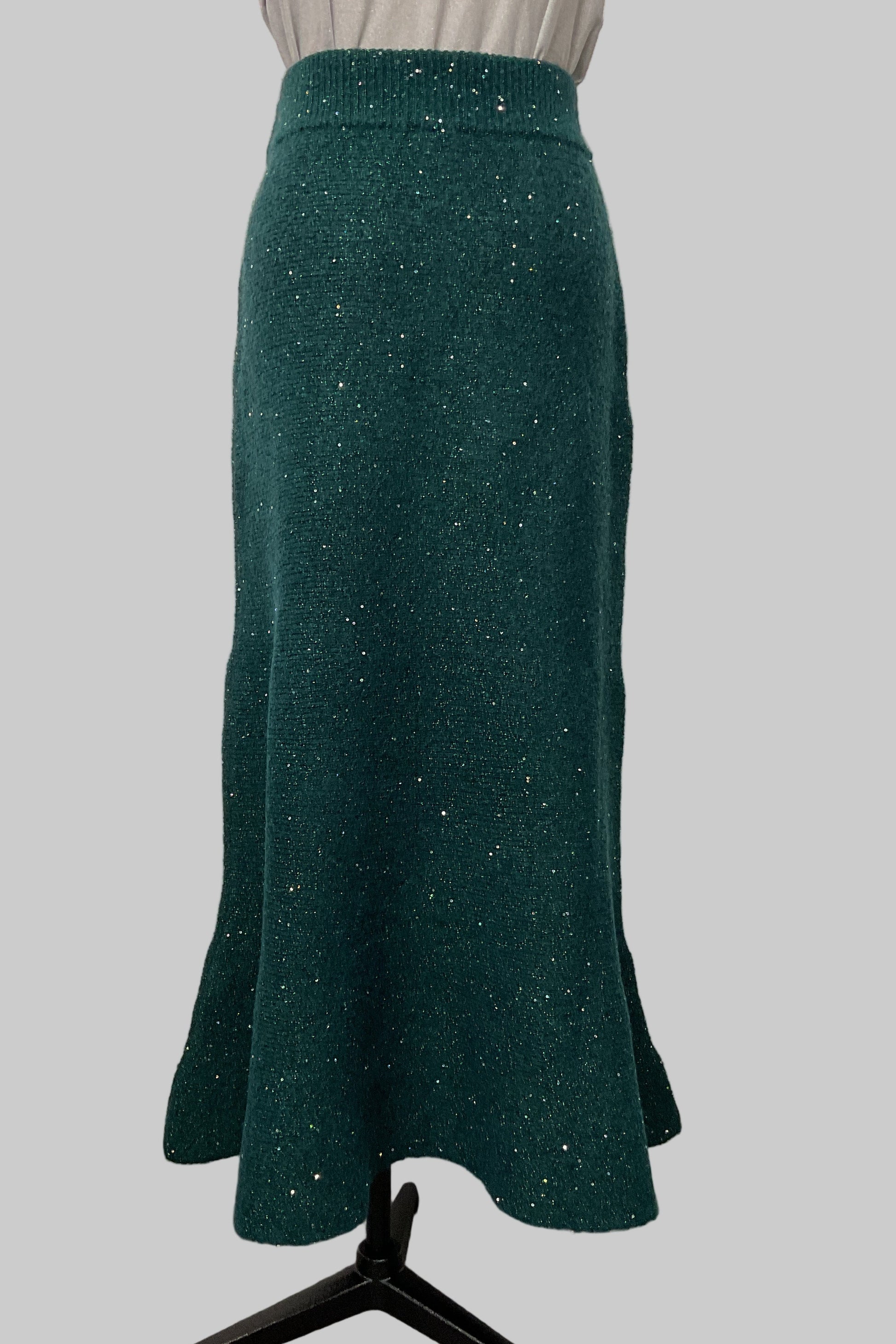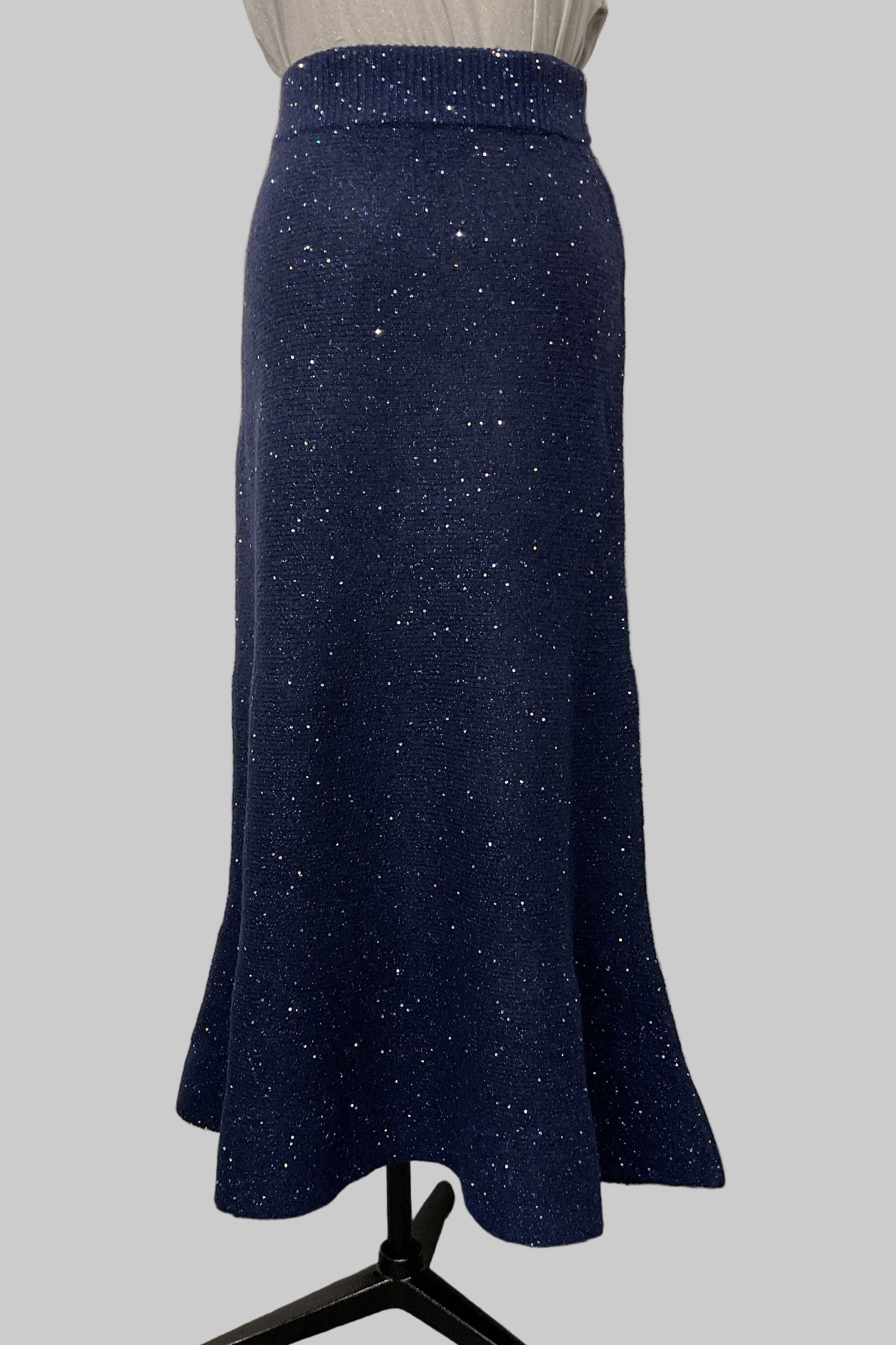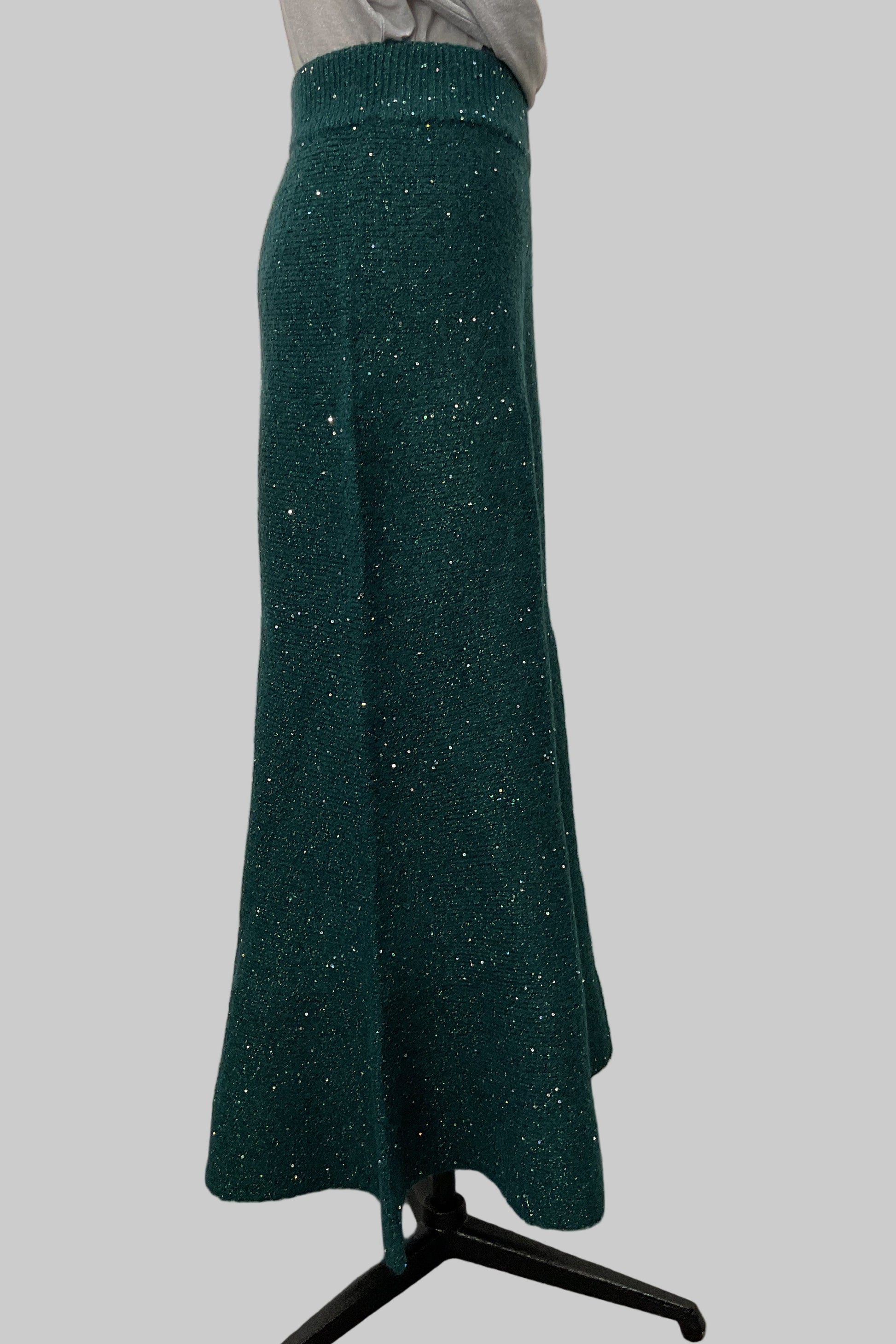 動くたびにきらめきが揺れる、華やかなラメニットスカート。
