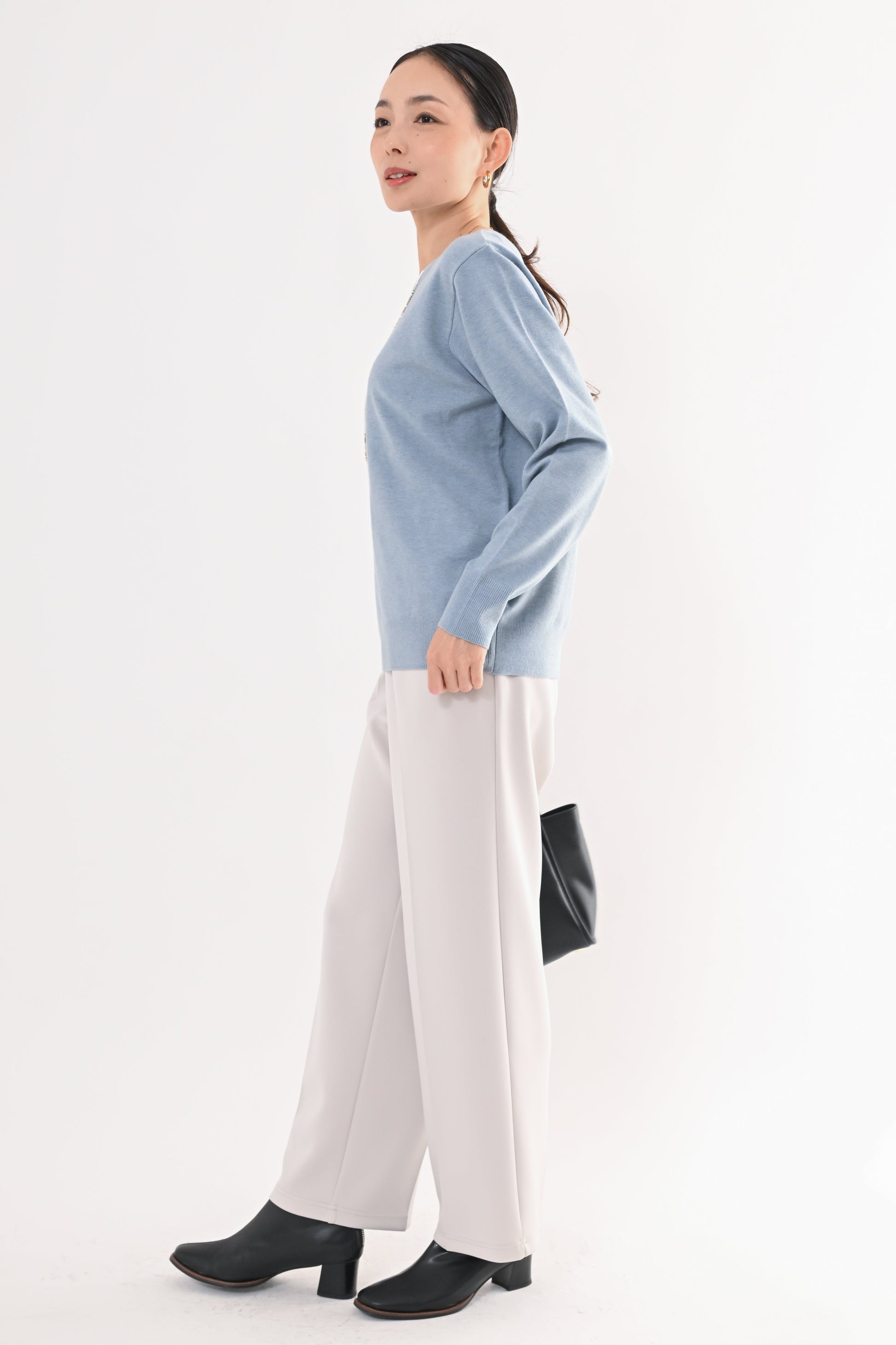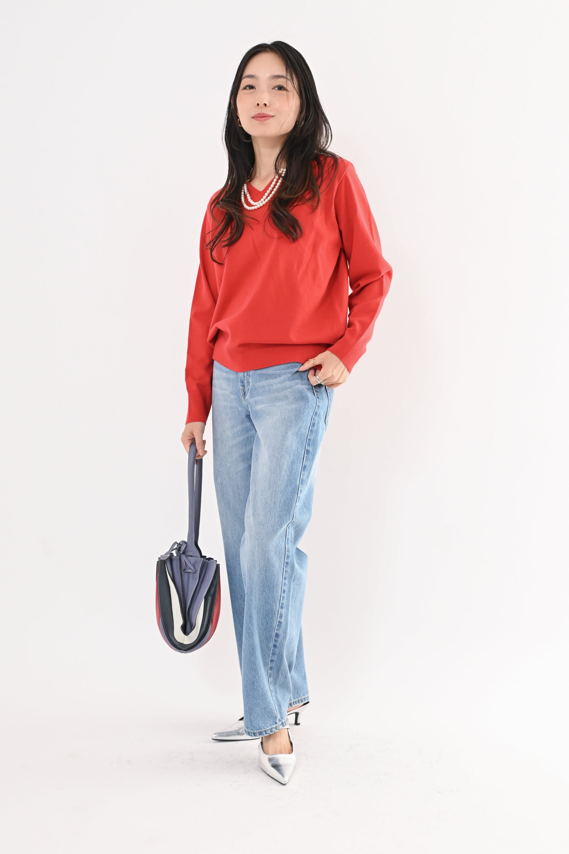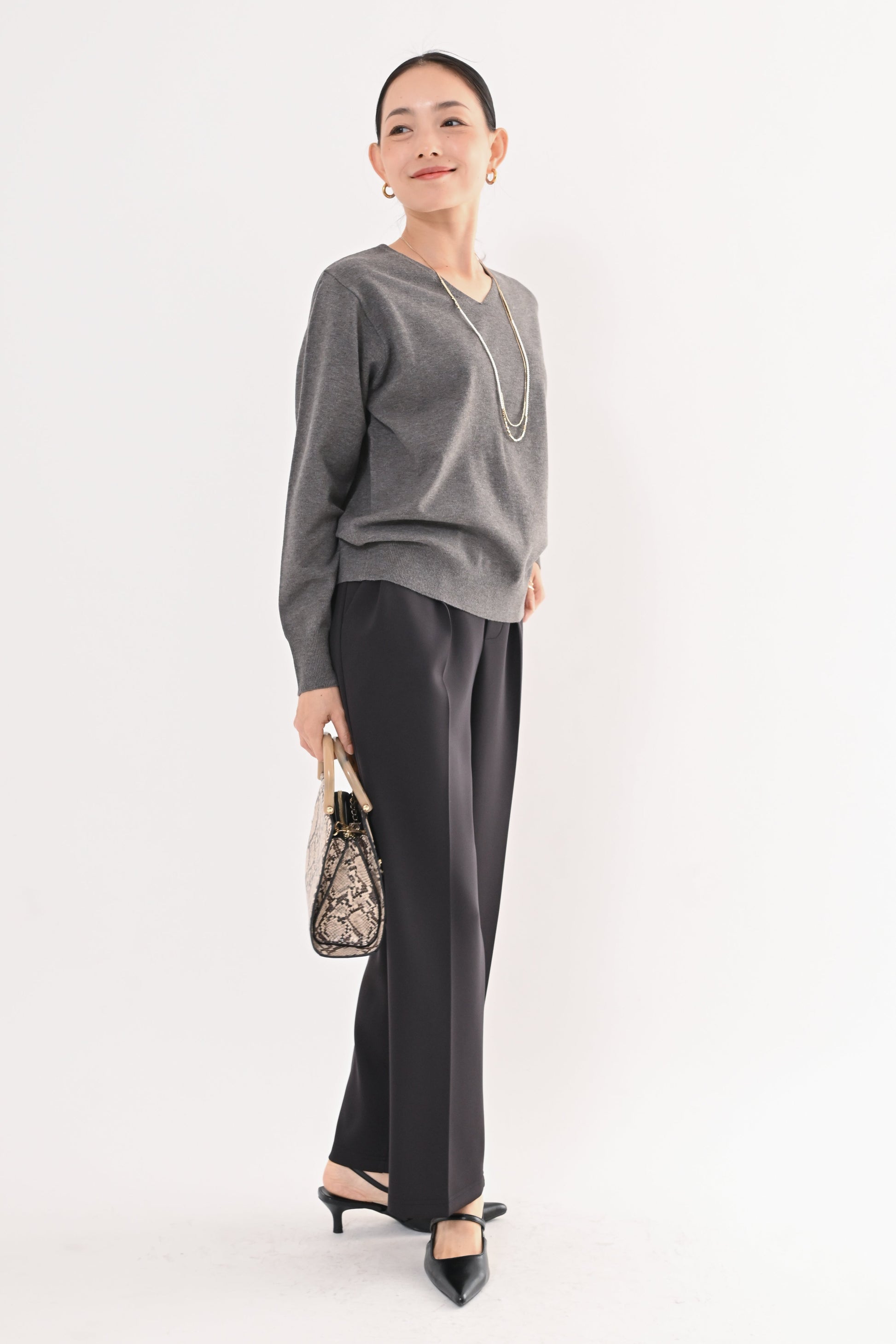 シンプルながらも顔まわりをすっきり見せるVネックがポイントのニットプルオーバー。