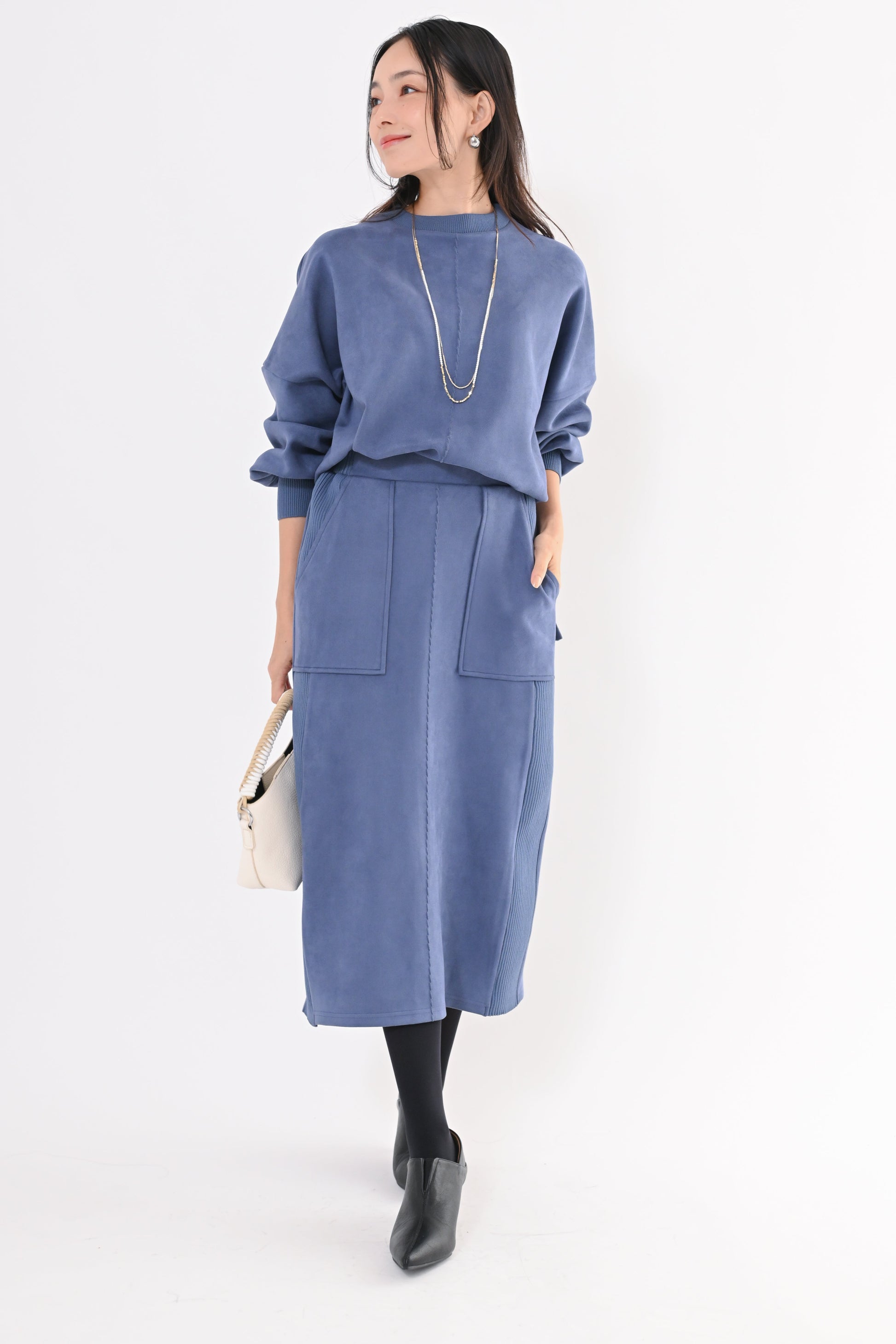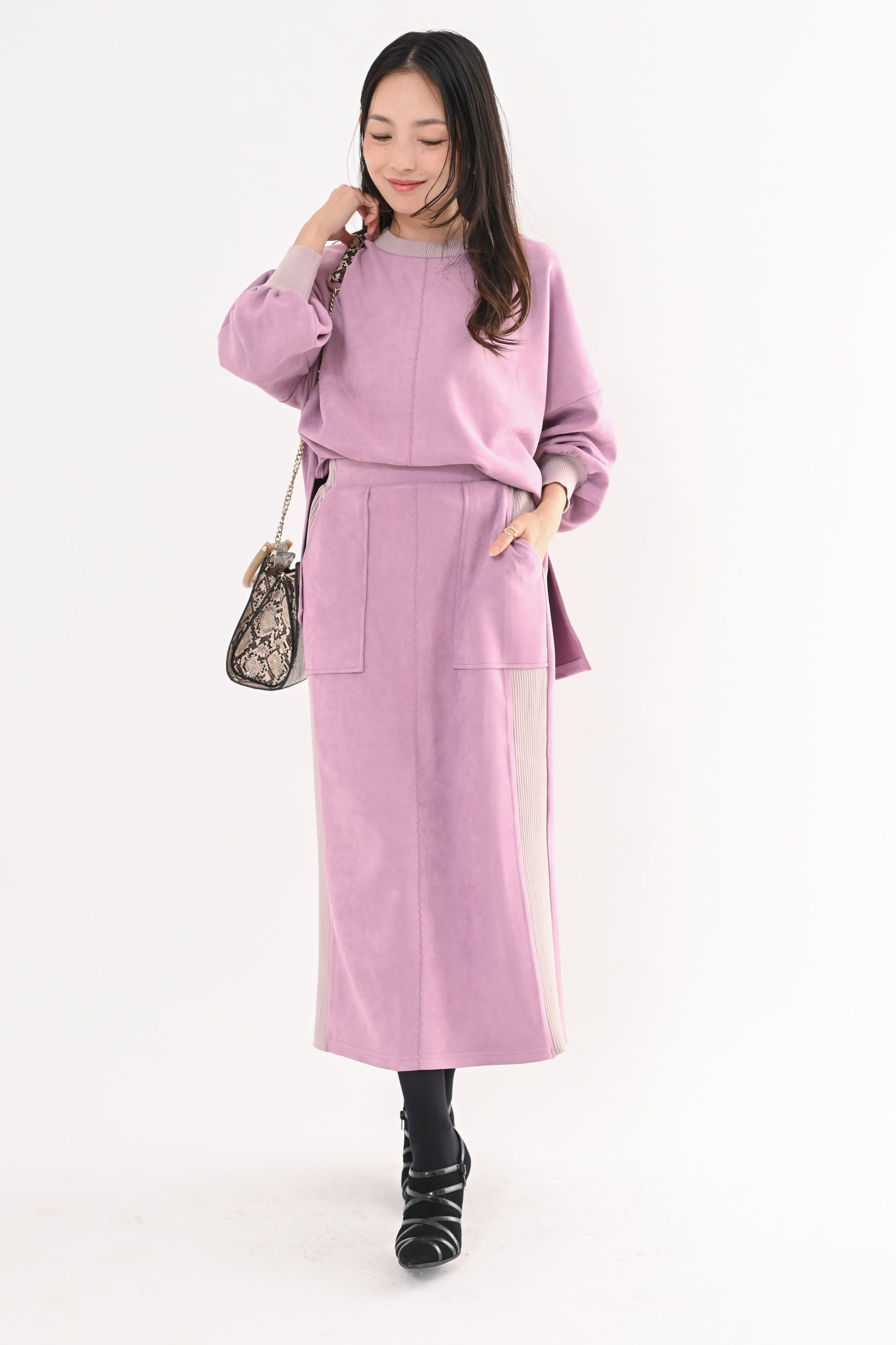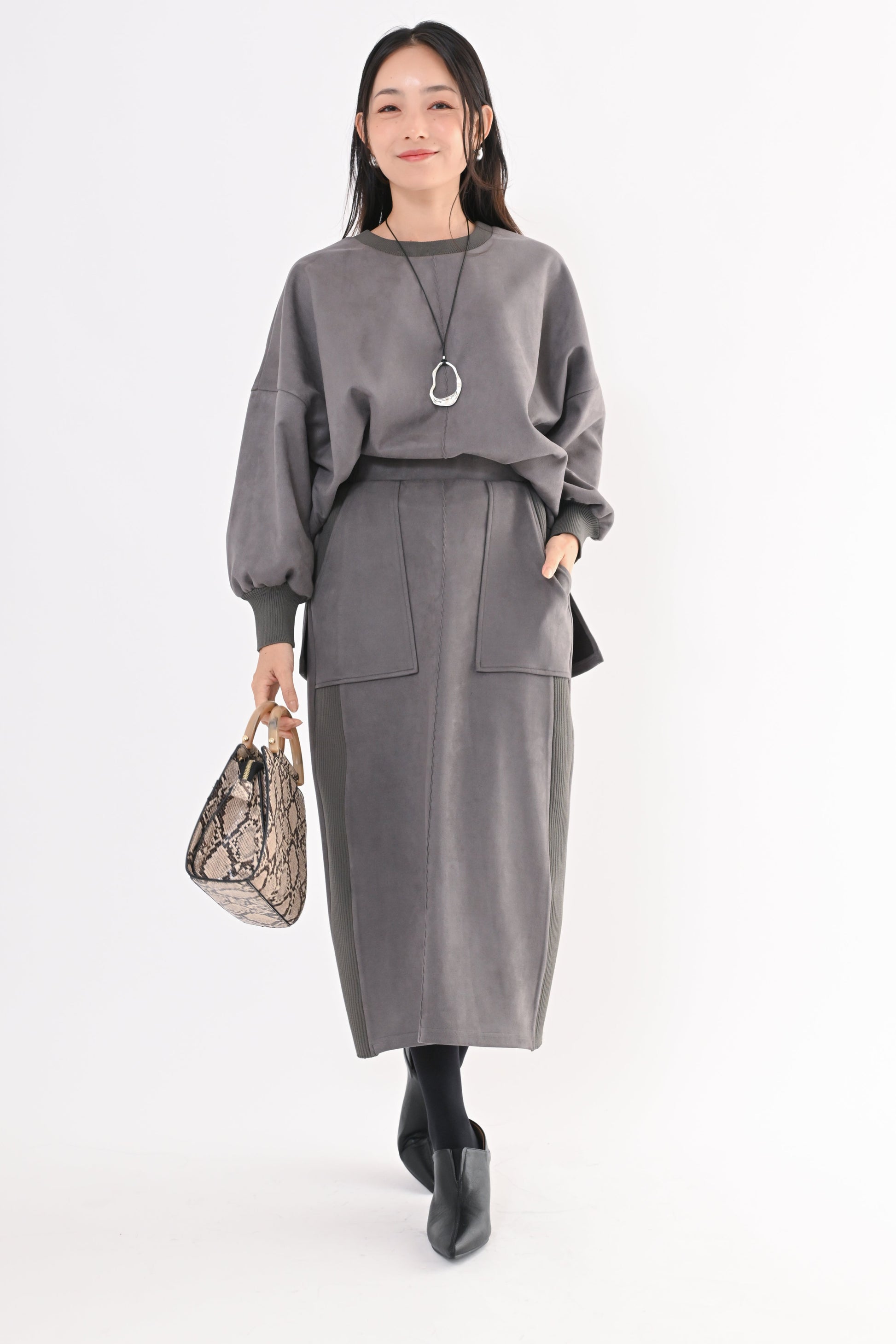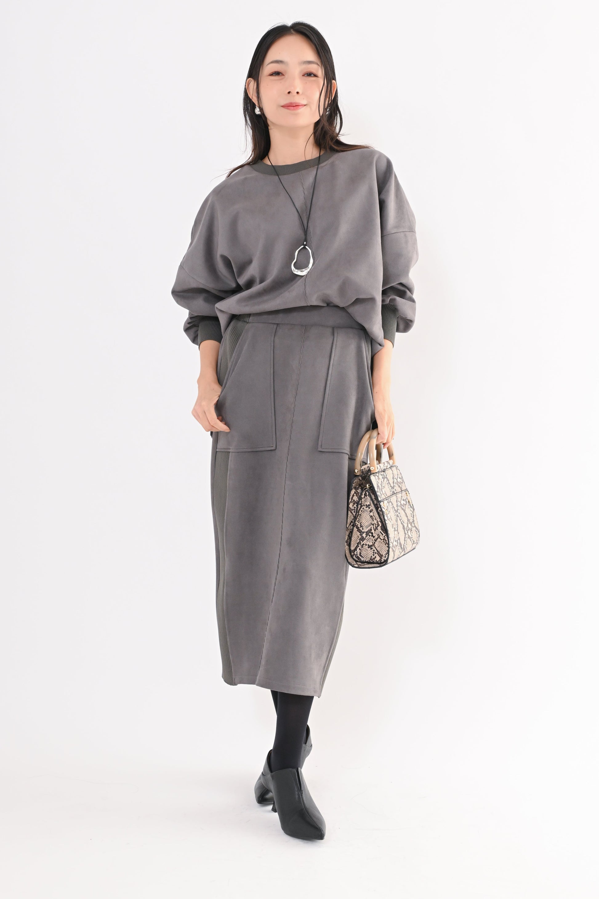 しっとりとしたスエード調素材にリブを切り替えた、表情豊かなタイトスカート。縦ラインを強調するデザインで、すっきりとスタイルアップを叶えます。ポケット付きで実用性もあり、同素材のプルオーバーと合わせれば、洗練されたセットアップスタイルに。