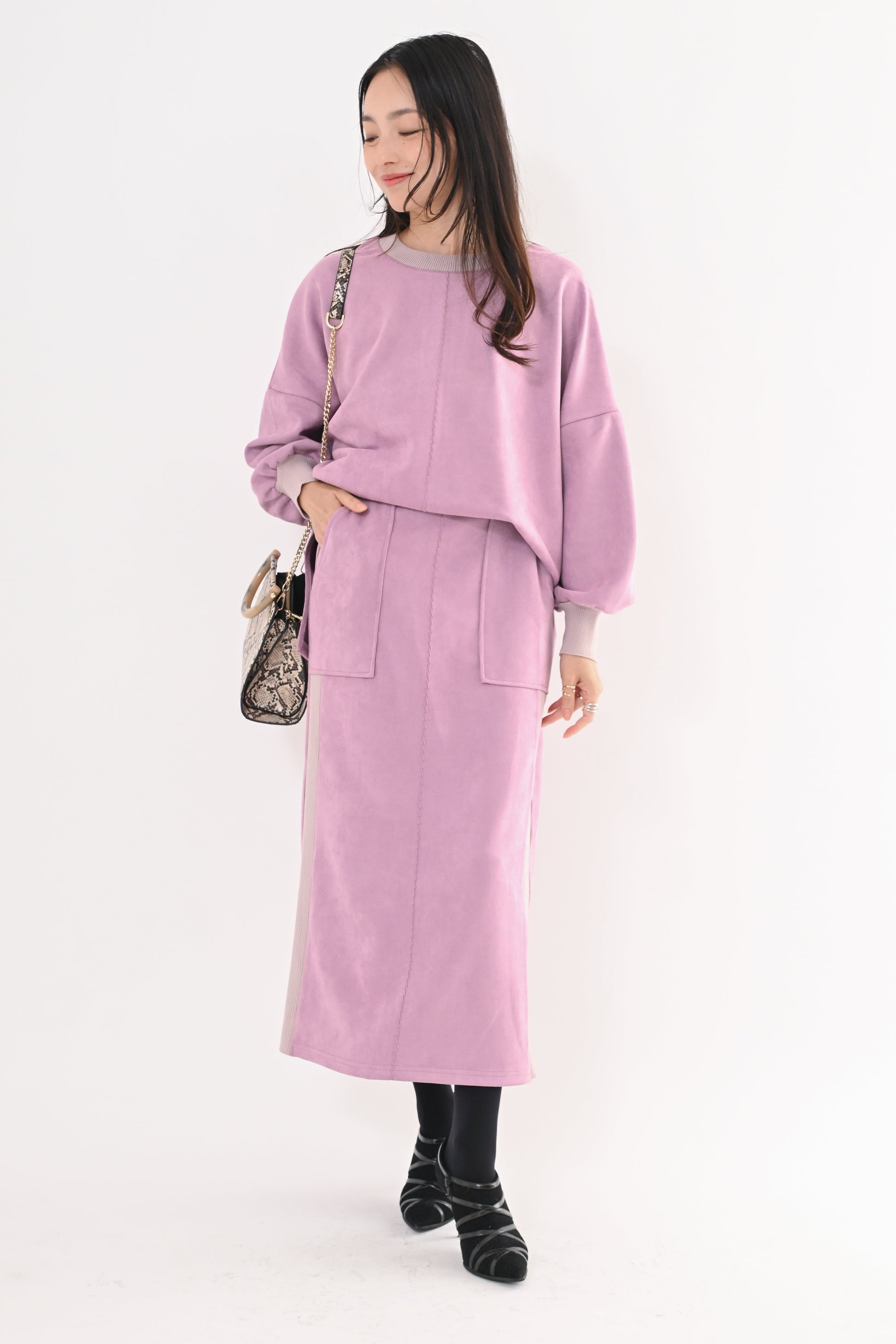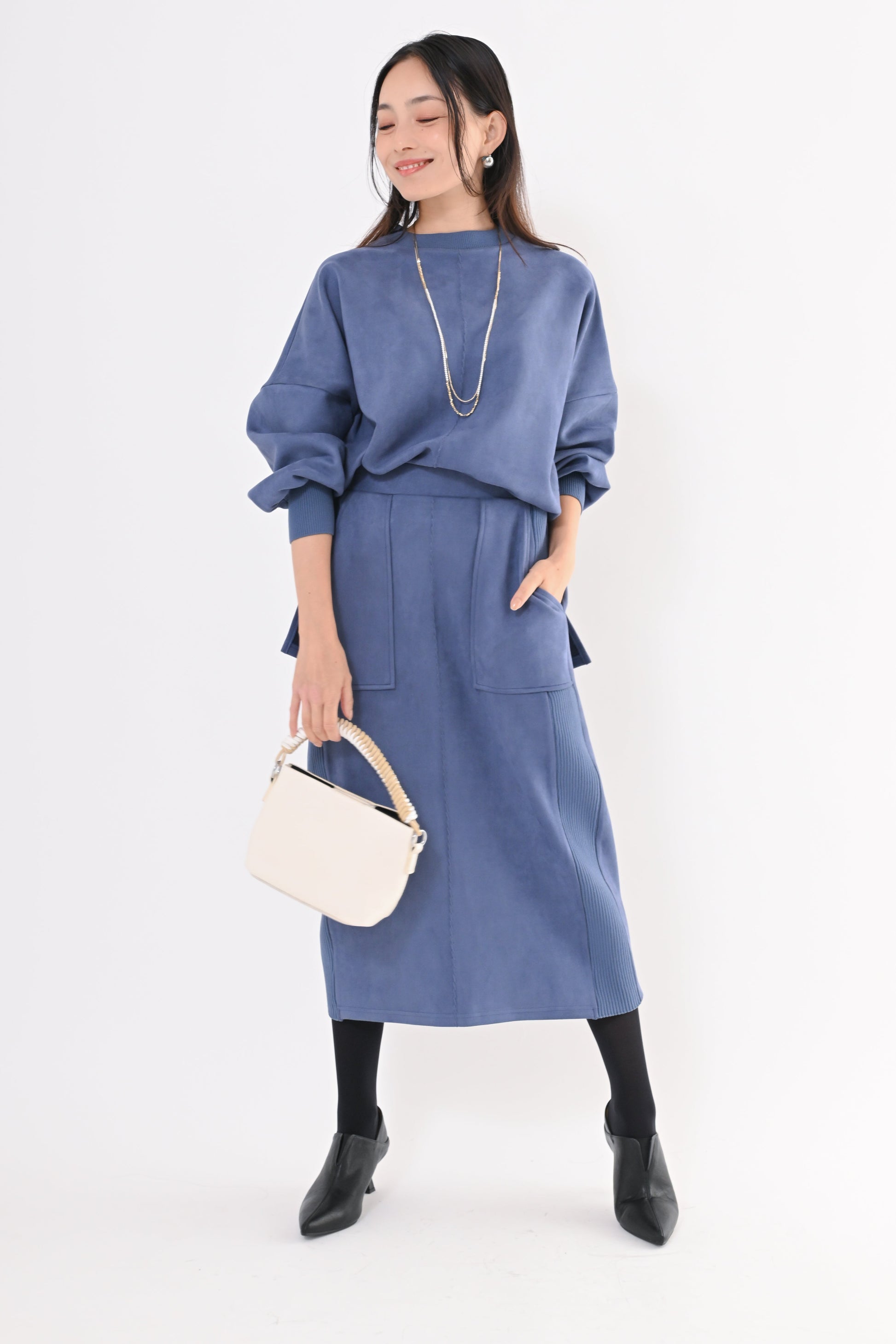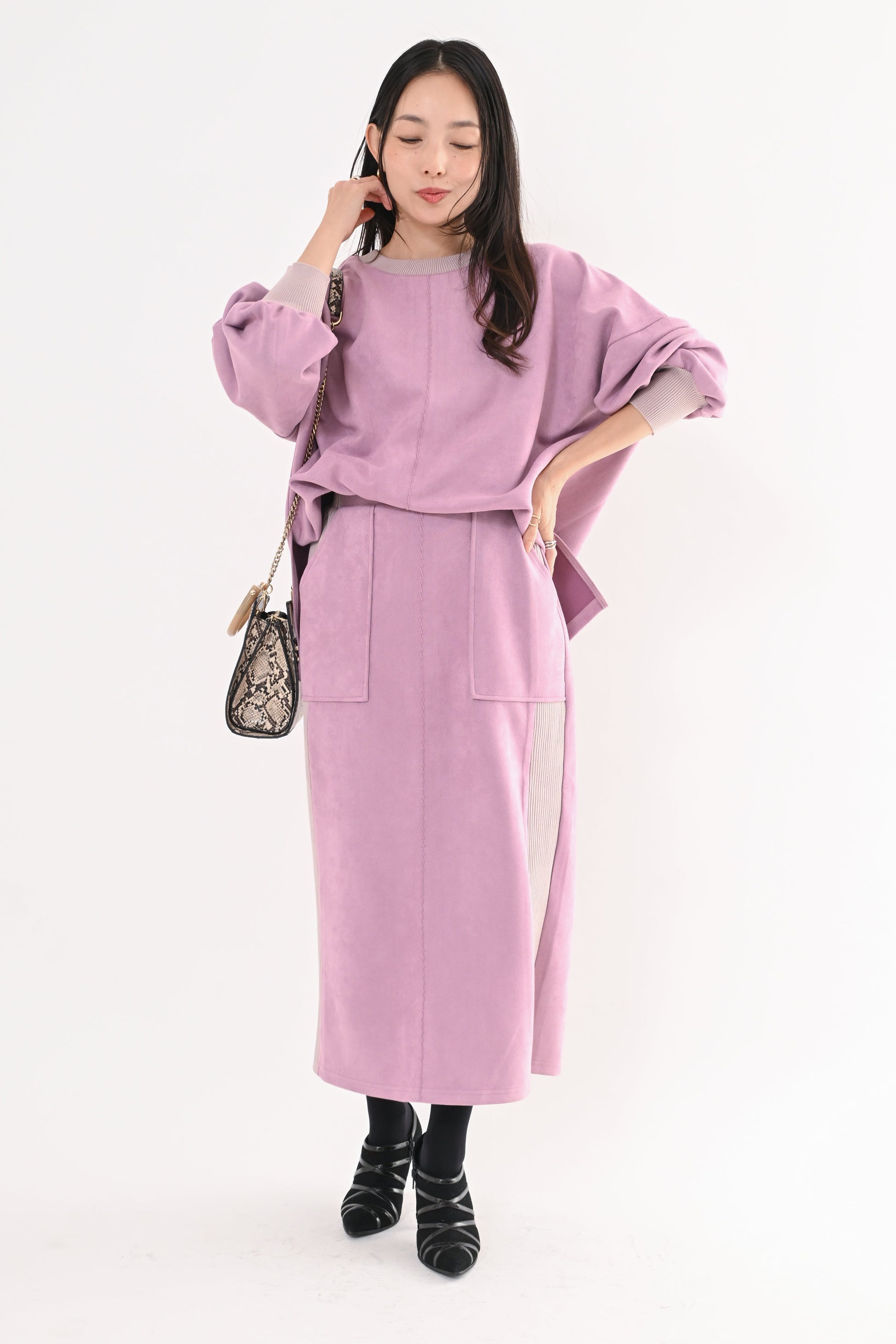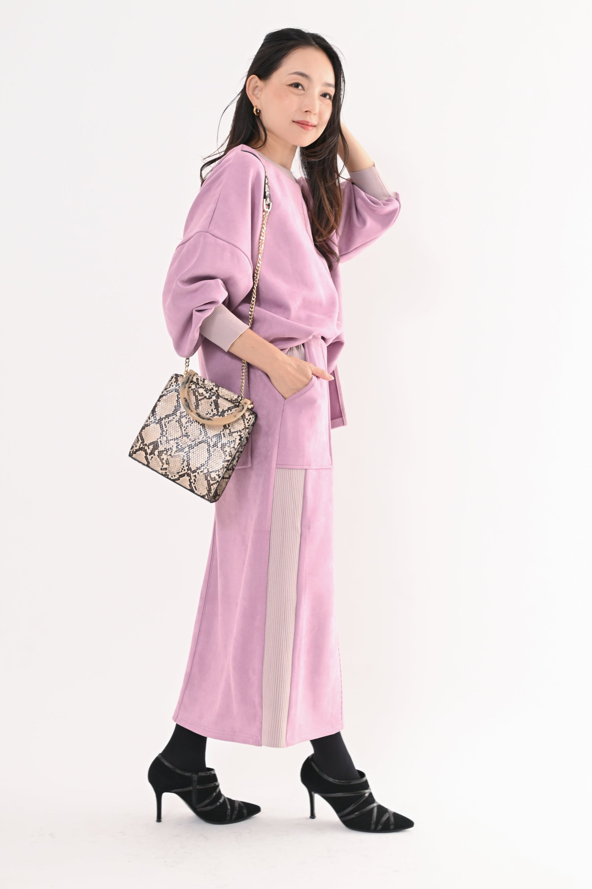 しっとりとしたスエード調素材にリブを切り替えた、表情豊かなタイトスカート。縦ラインを強調するデザインで、すっきりとスタイルアップを叶えます。ポケット付きで実用性もあり、同素材のプルオーバーと合わせれば、洗練されたセットアップスタイルに。