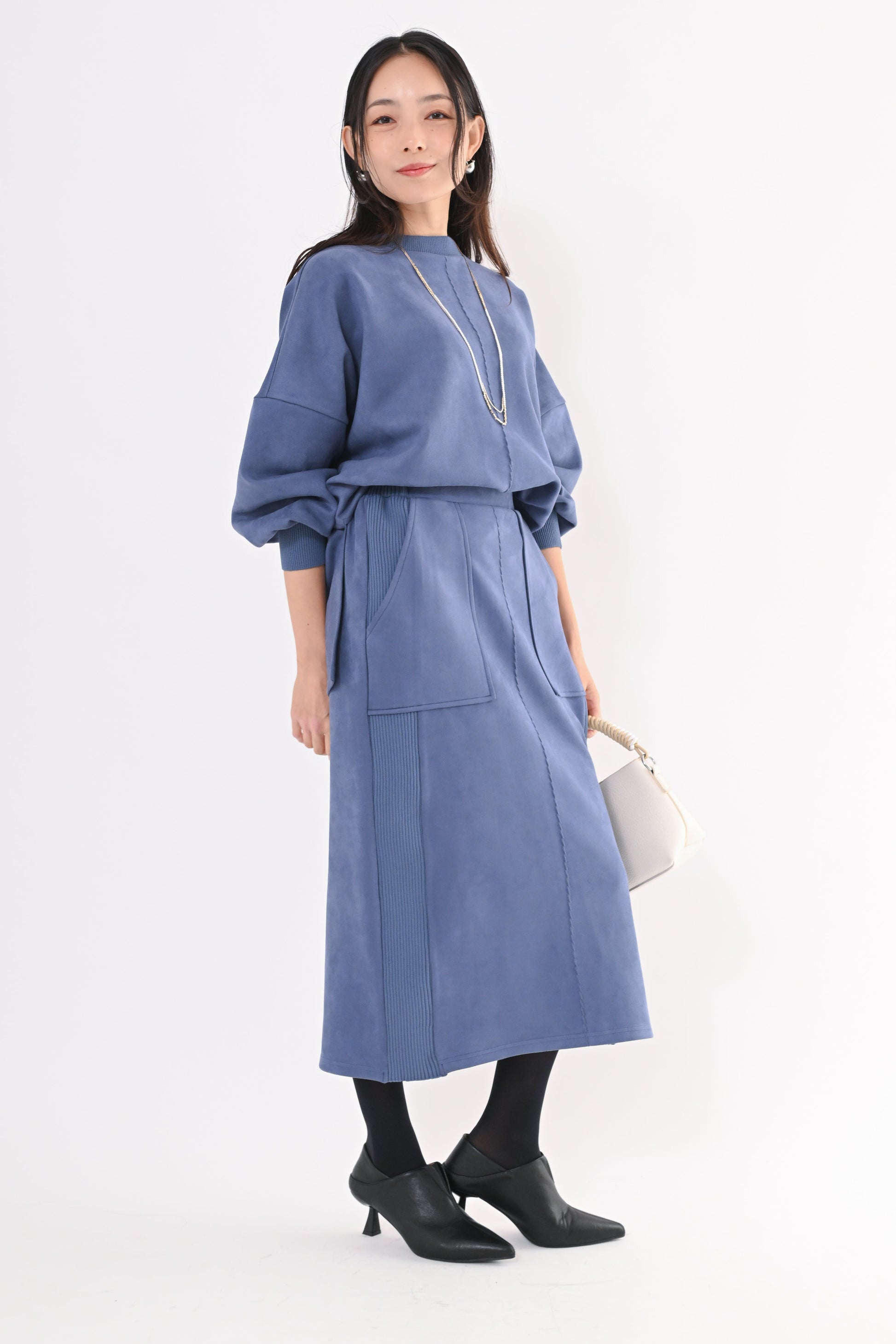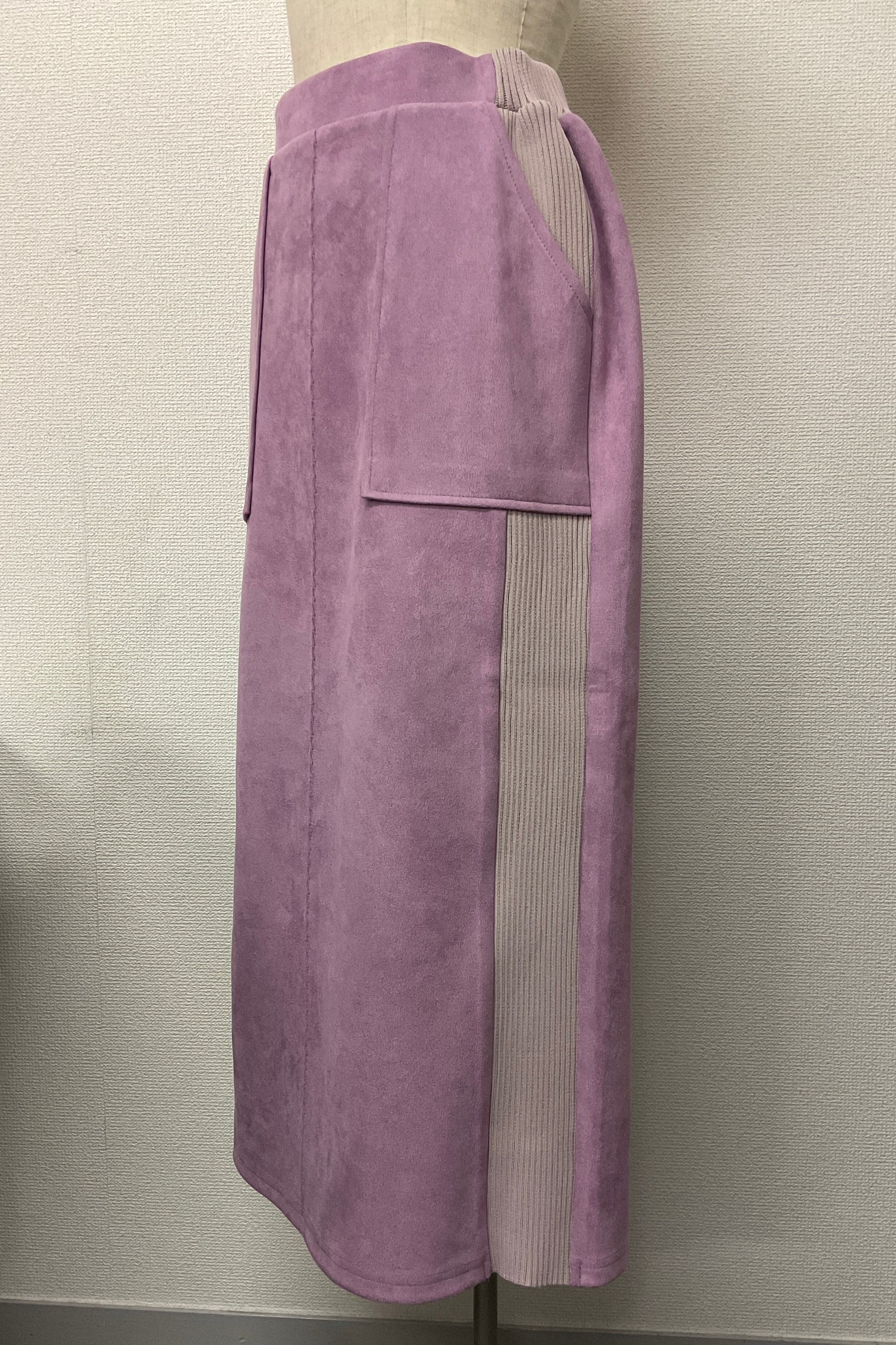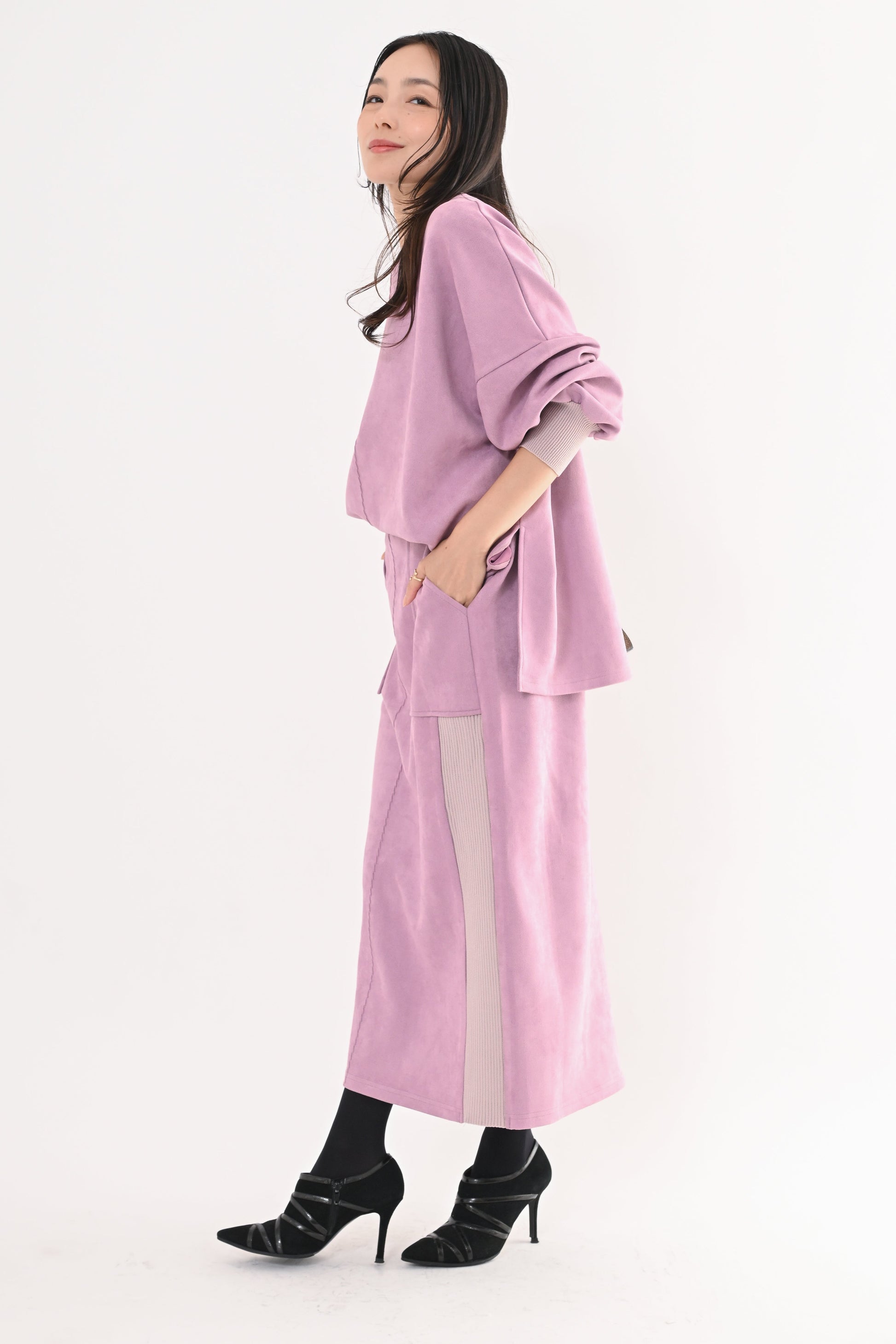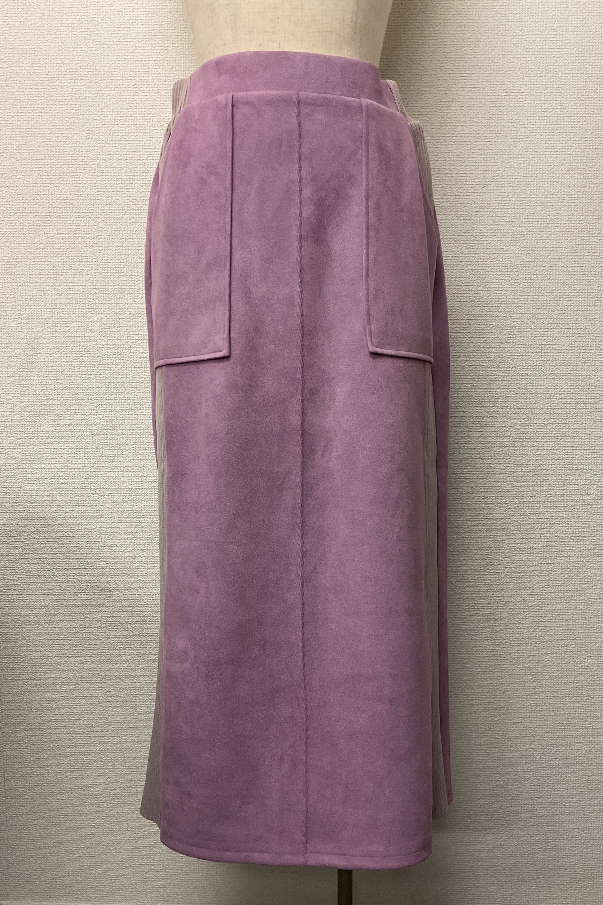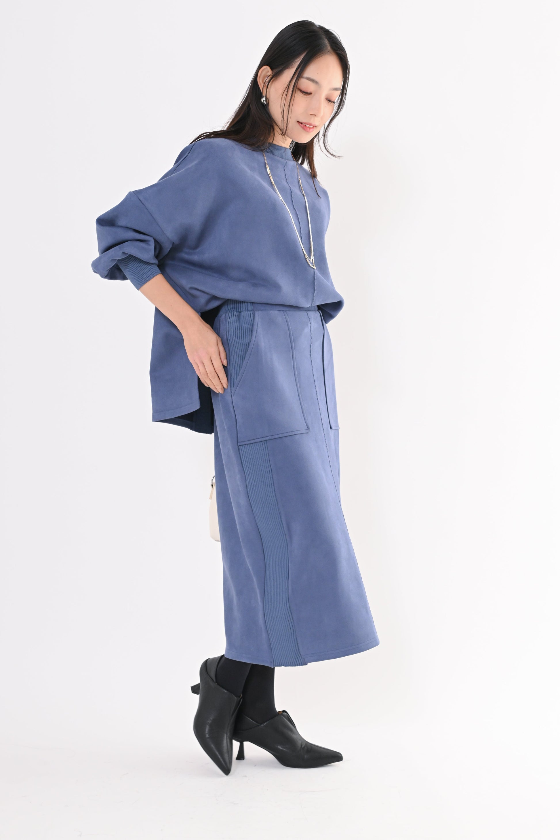 しっとりとしたスエード調素材にリブを切り替えた、表情豊かなタイトスカート。縦ラインを強調するデザインで、すっきりとスタイルアップを叶えます。ポケット付きで実用性もあり、同素材のプルオーバーと合わせれば、洗練されたセットアップスタイルに。
