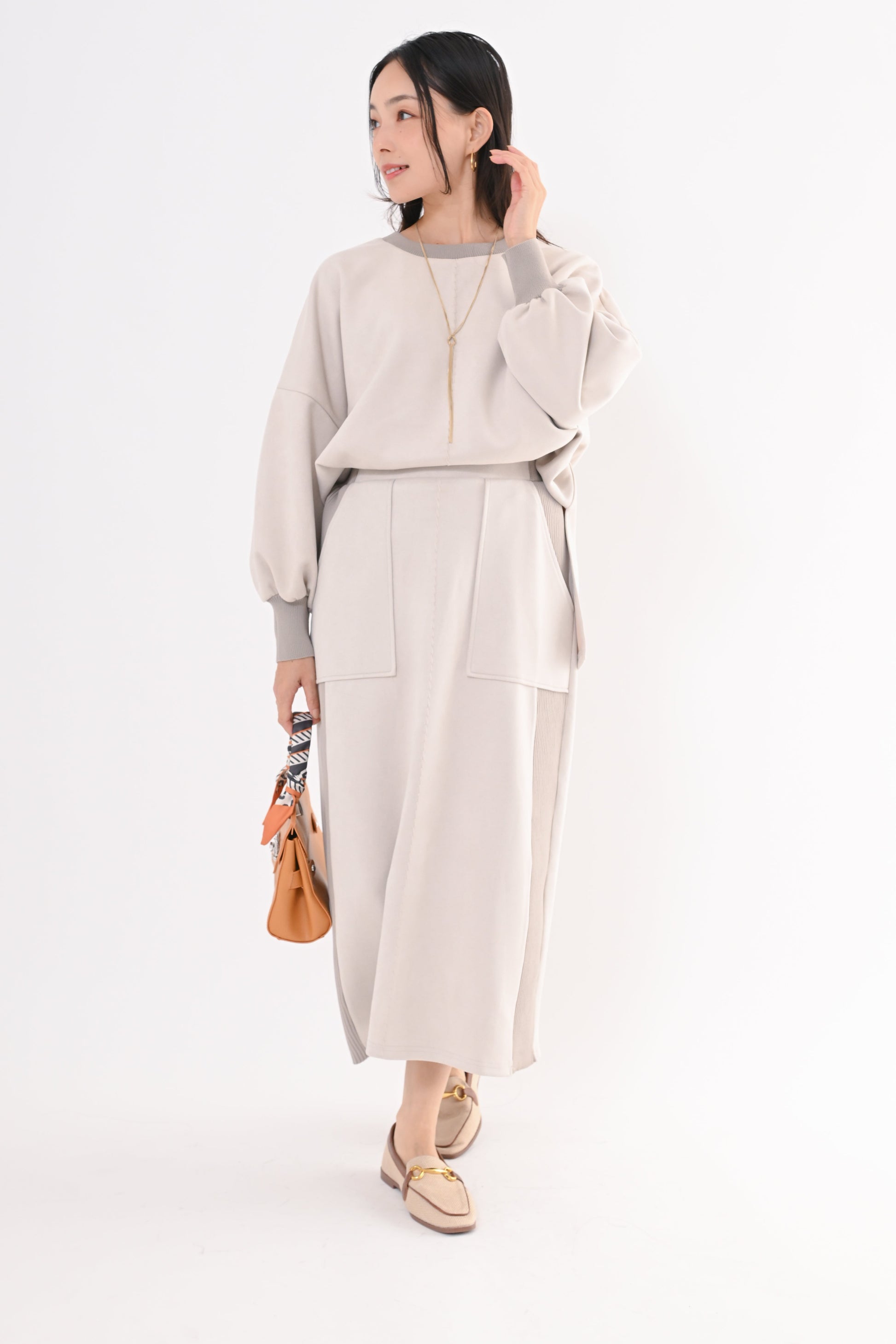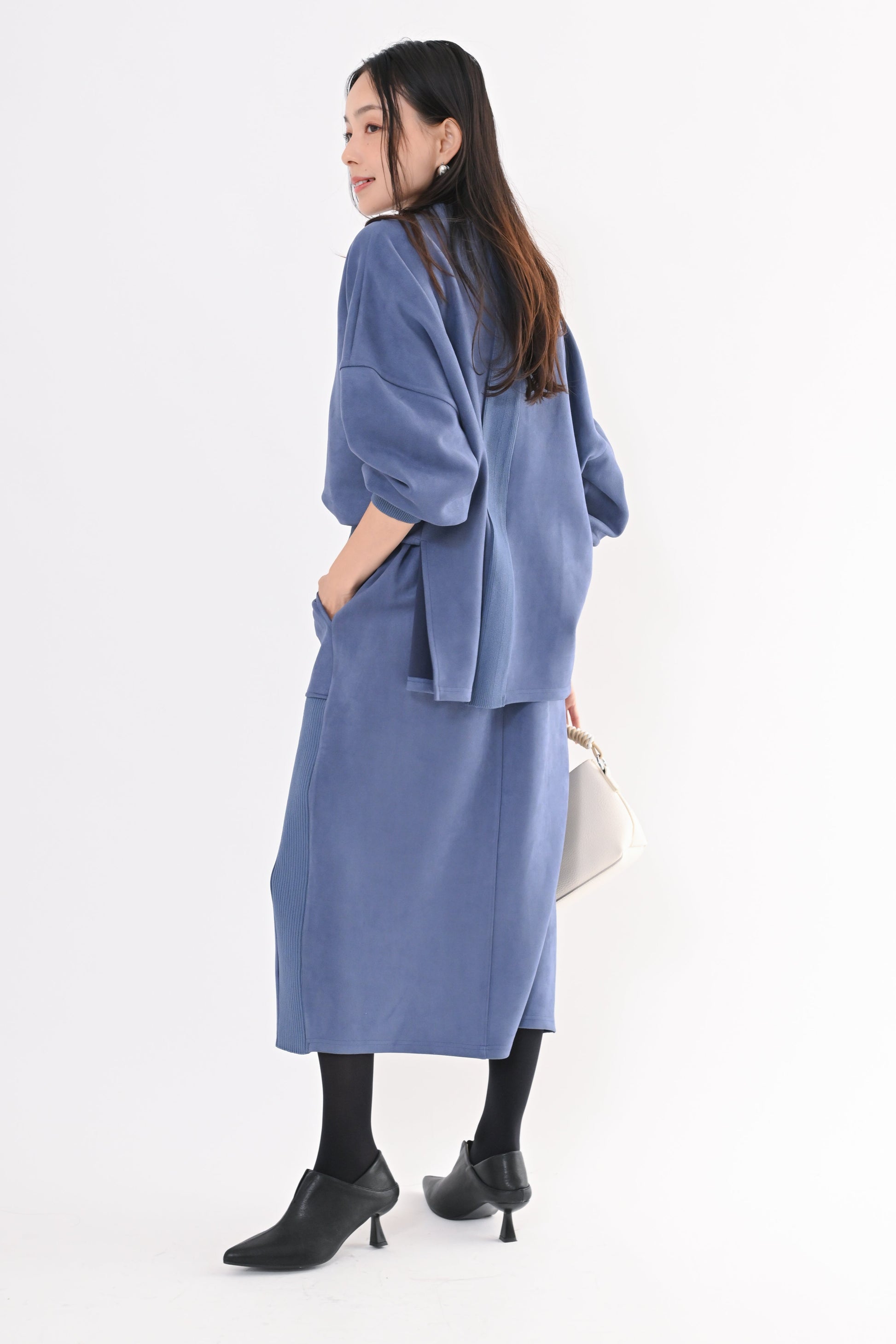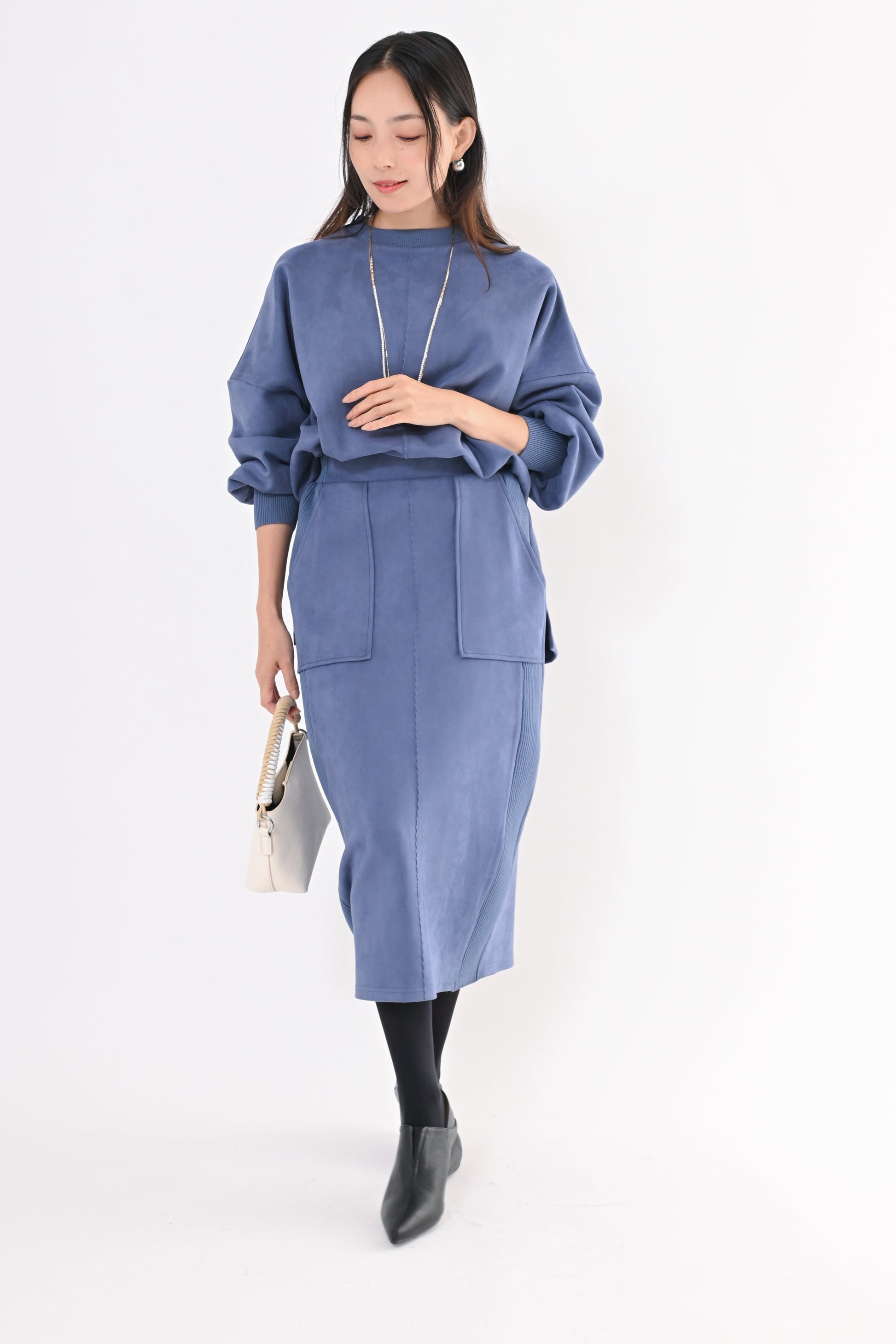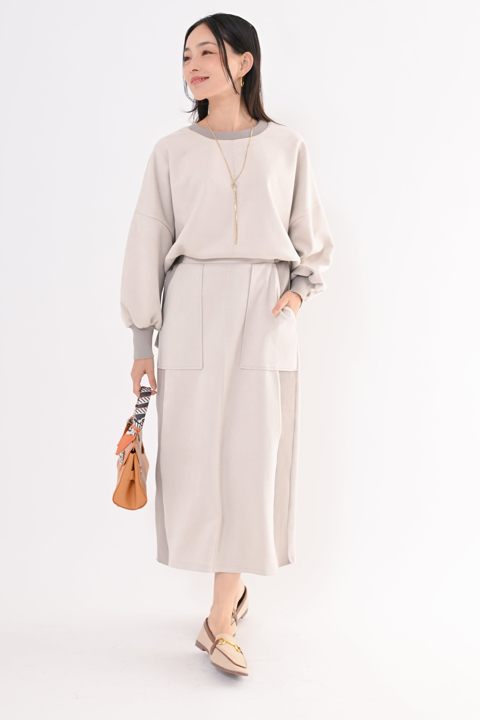 しっとりとしたスエード調素材にリブを切り替えた、表情豊かなタイトスカート。縦ラインを強調するデザインで、すっきりとスタイルアップを叶えます。ポケット付きで実用性もあり、同素材のプルオーバーと合わせれば、洗練されたセットアップスタイルに。