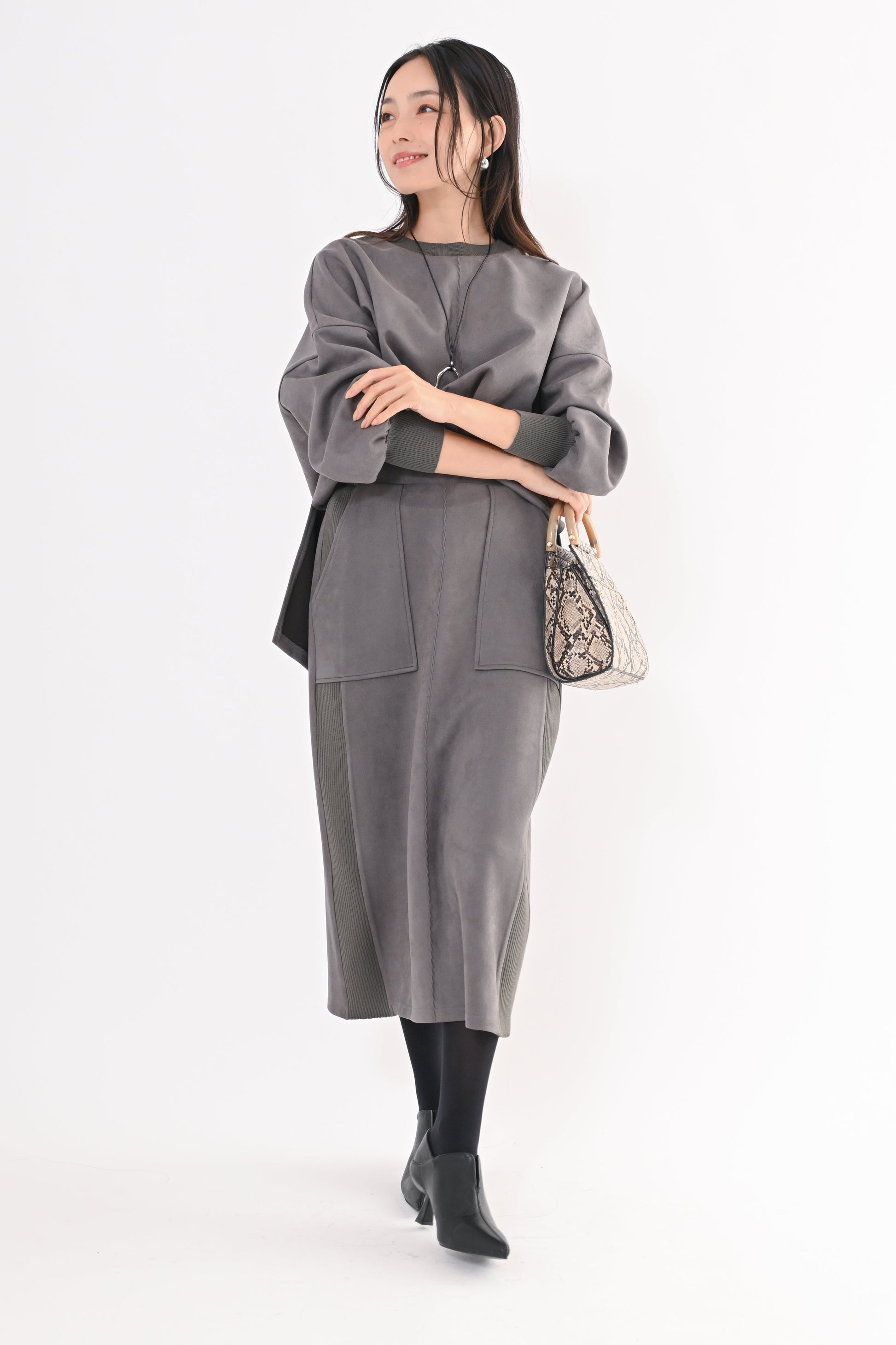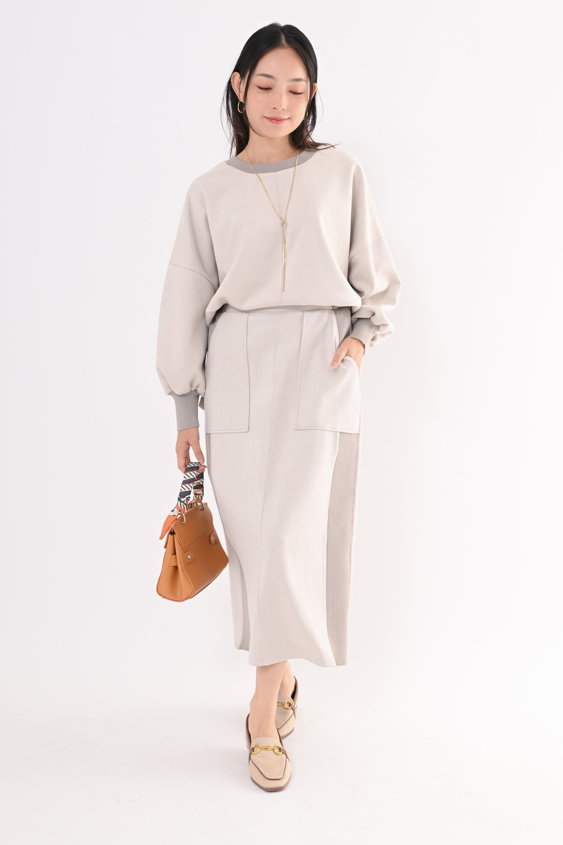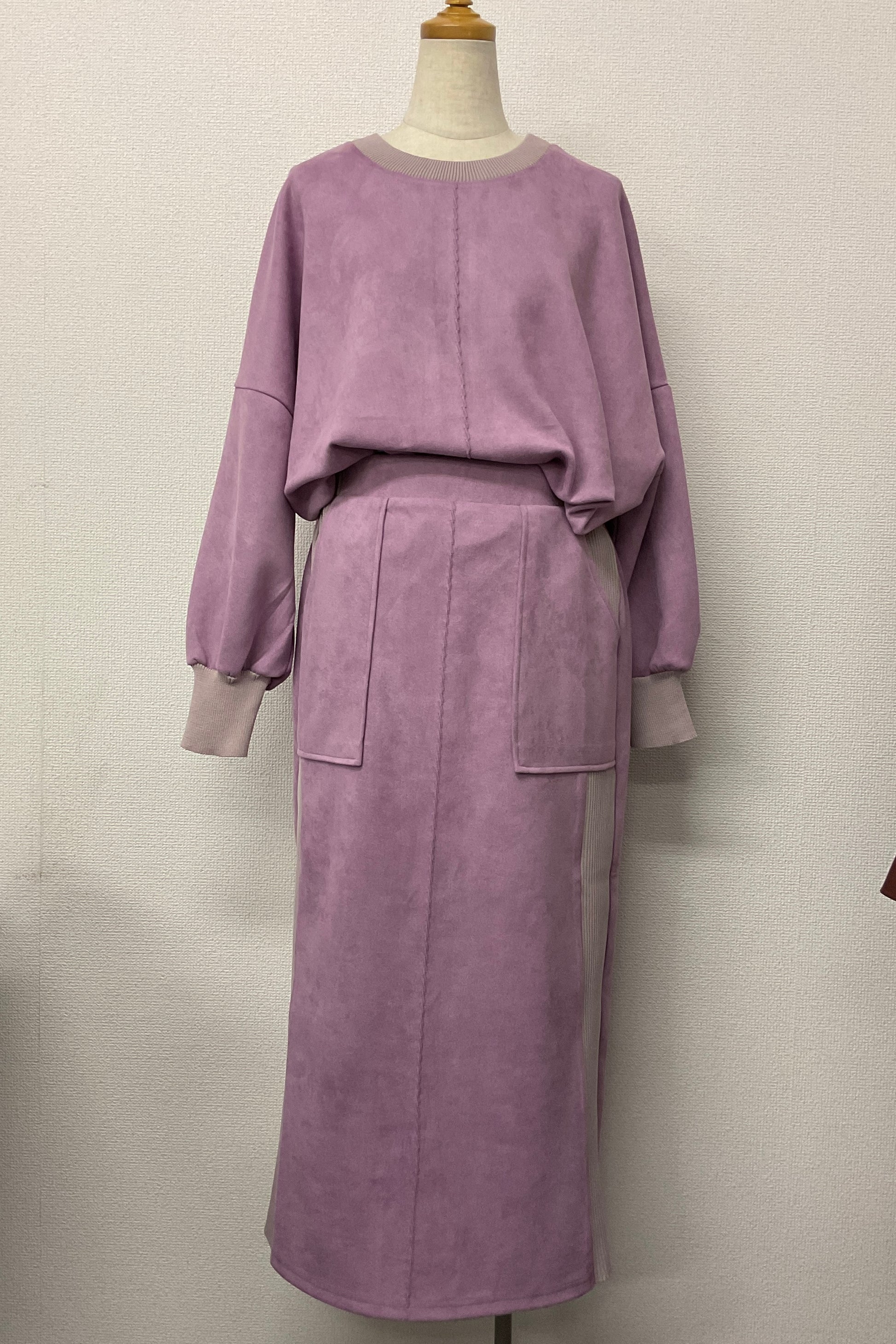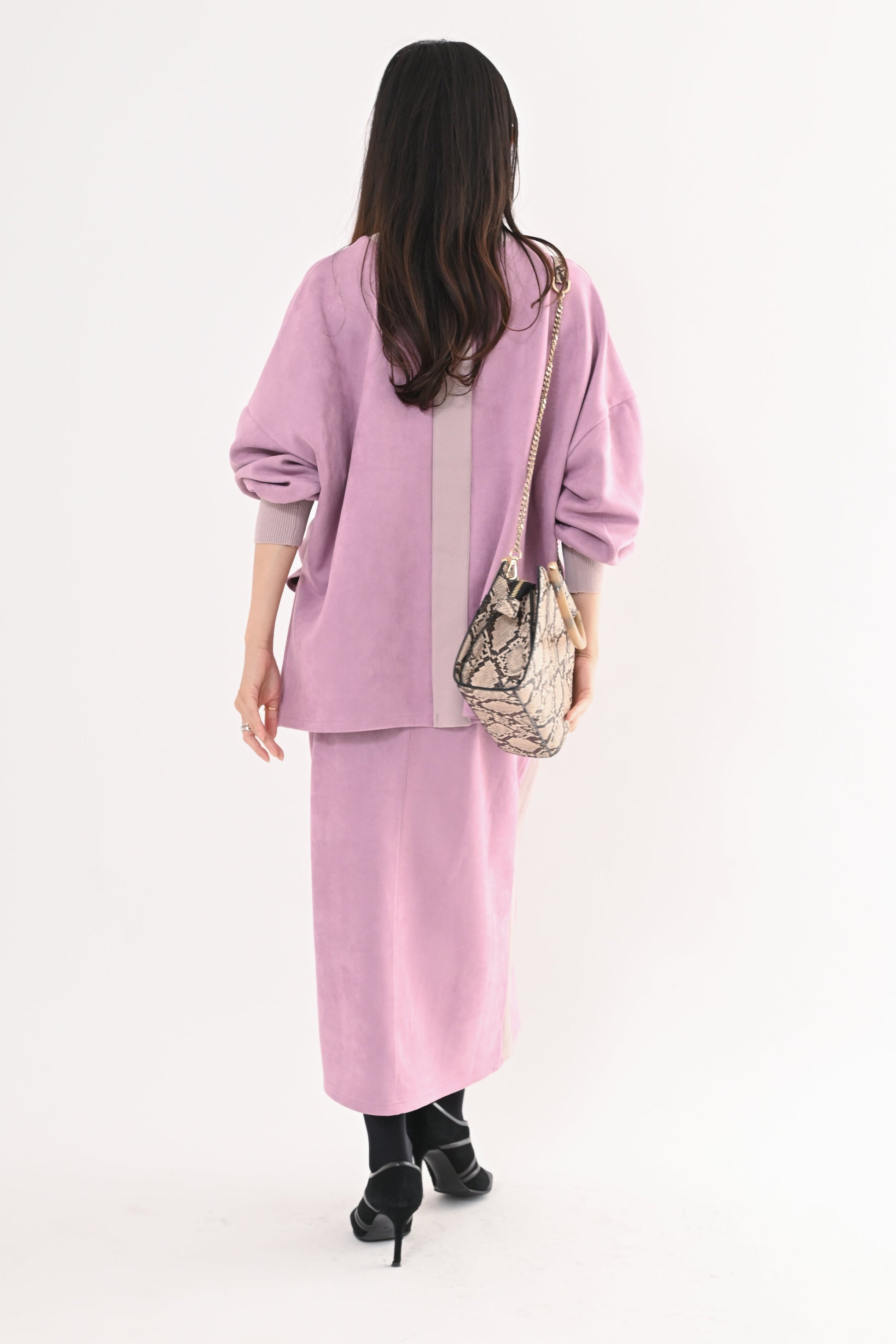 しっとりとしたスエード調素材にリブを切り替えた、表情豊かなタイトスカート。縦ラインを強調するデザインで、すっきりとスタイルアップを叶えます。ポケット付きで実用性もあり、同素材のプルオーバーと合わせれば、洗練されたセットアップスタイルに。
