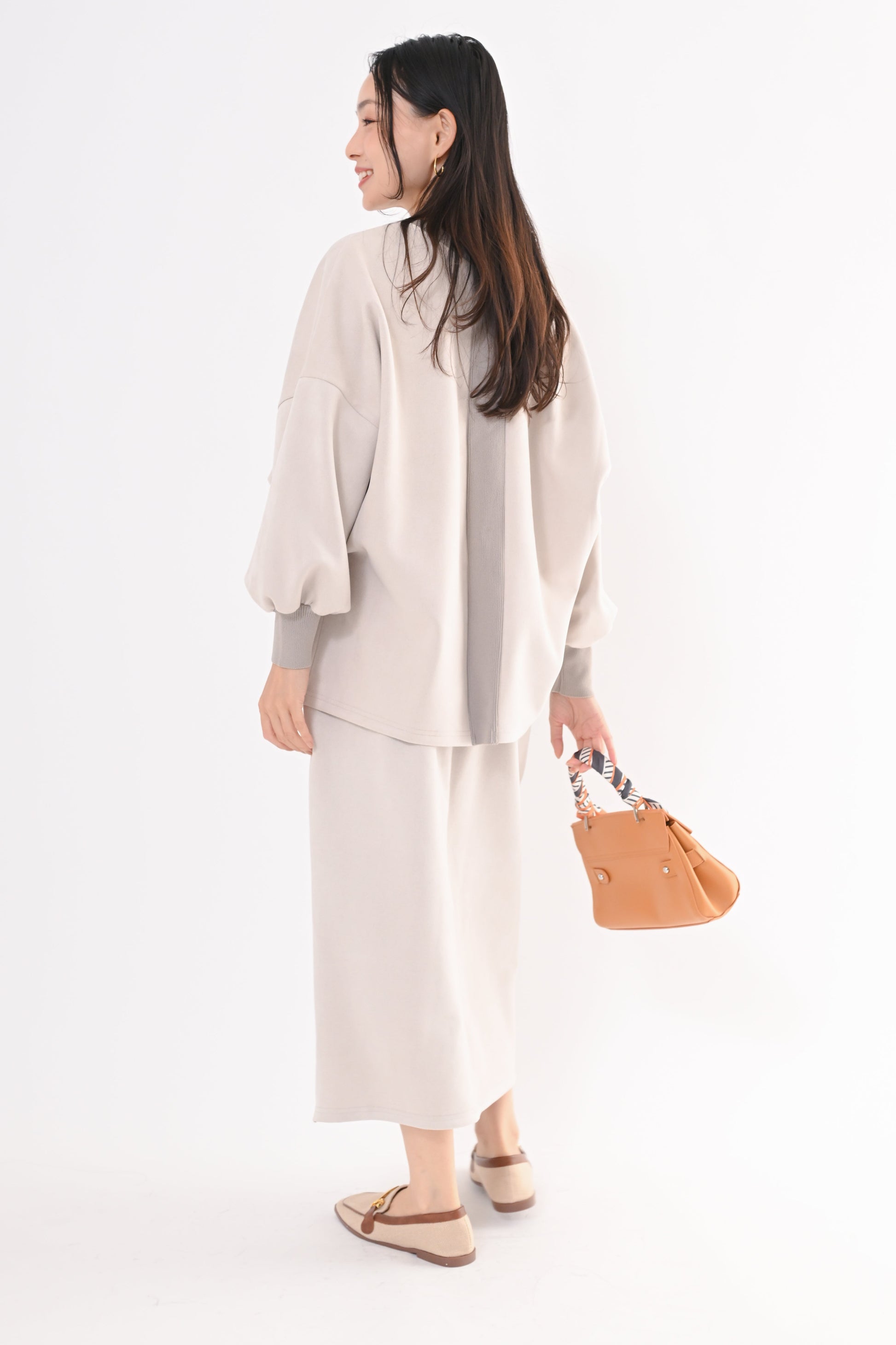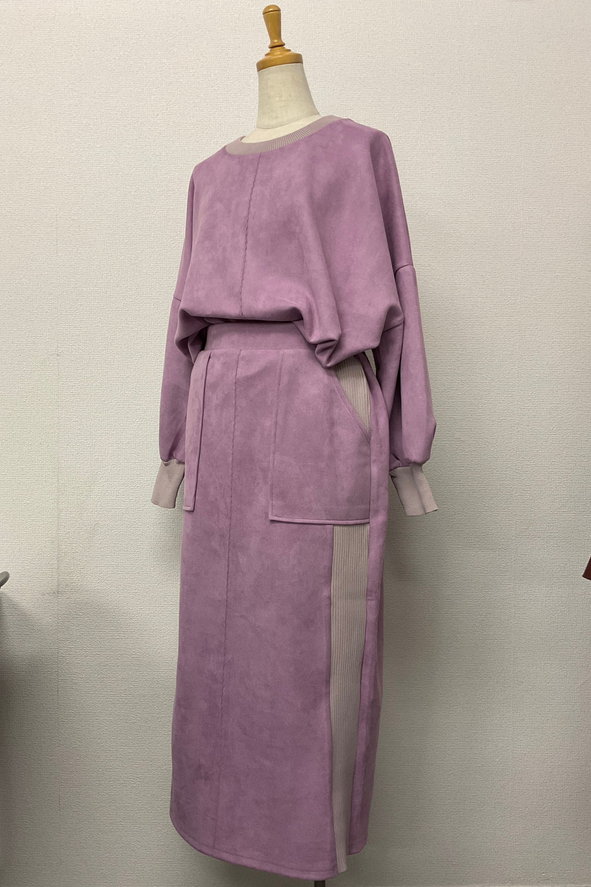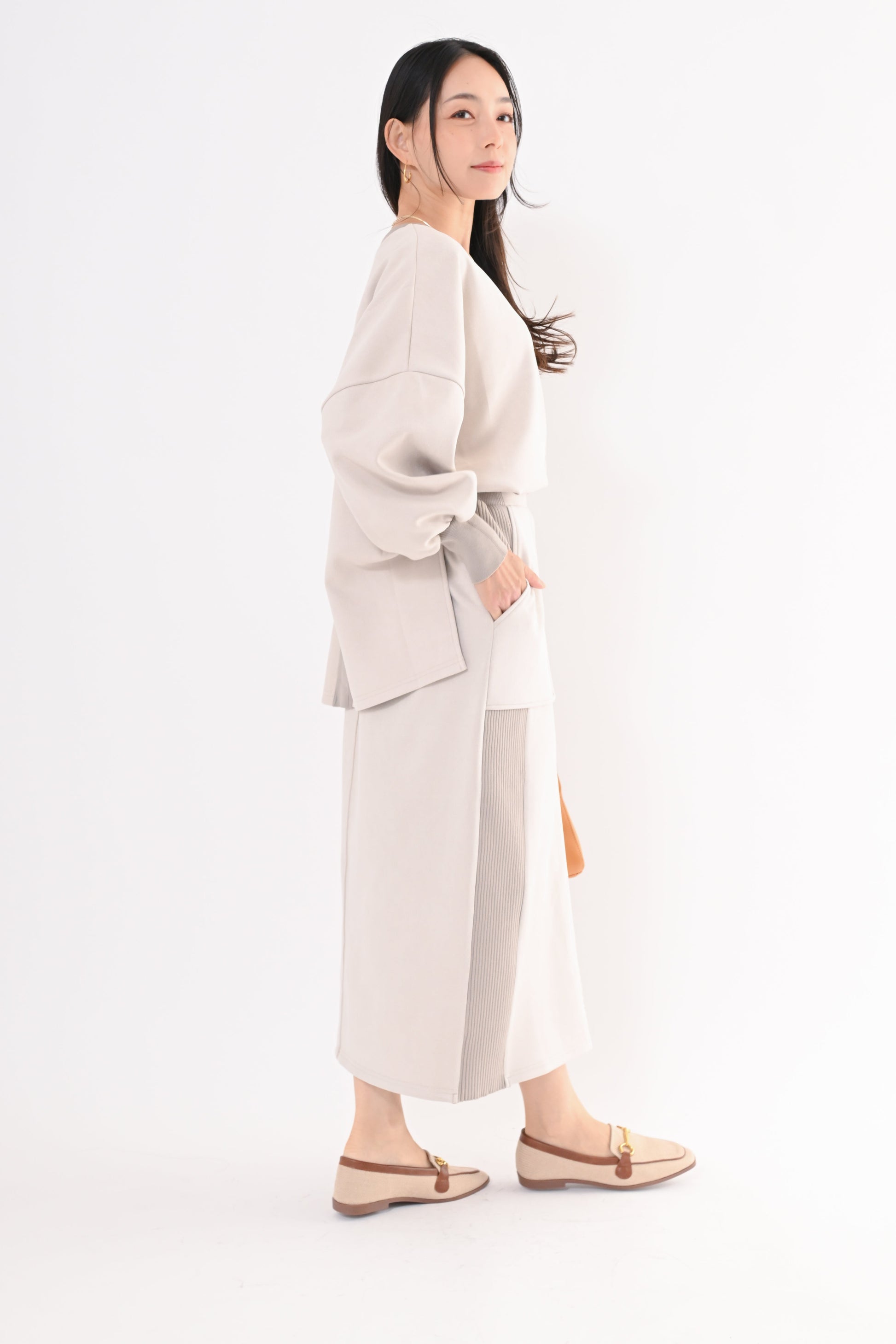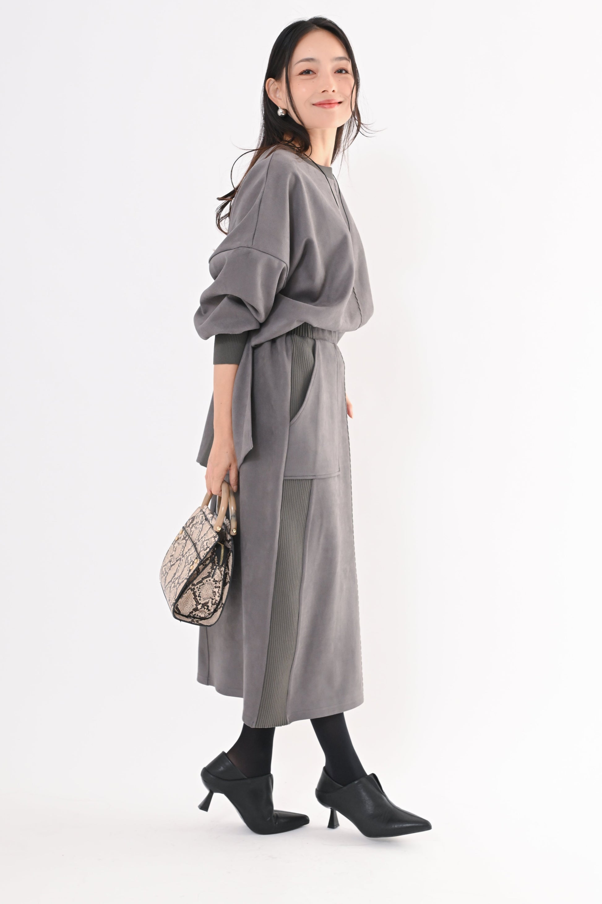 セットアップアイテムとしてスエード×リブワイドプルオーバーも展開しています。