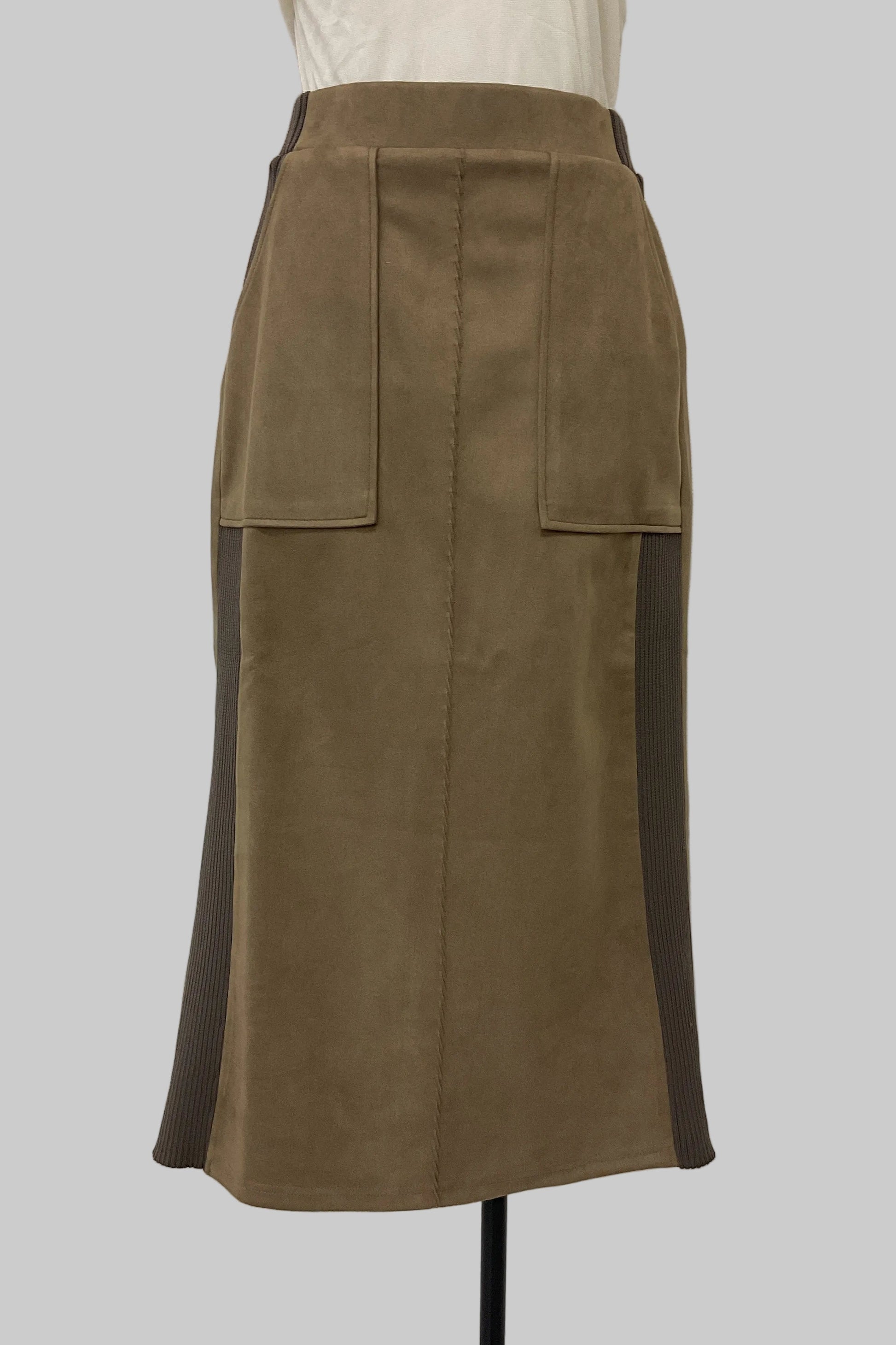 しっとりとしたスエード調素材にリブを切り替えた、表情豊かなタイトスカート。縦ラインを強調するデザインで、すっきりとスタイルアップを叶えます。ポケット付きで実用性もあり、同素材のプルオーバーと合わせれば、洗練されたセットアップスタイルに。