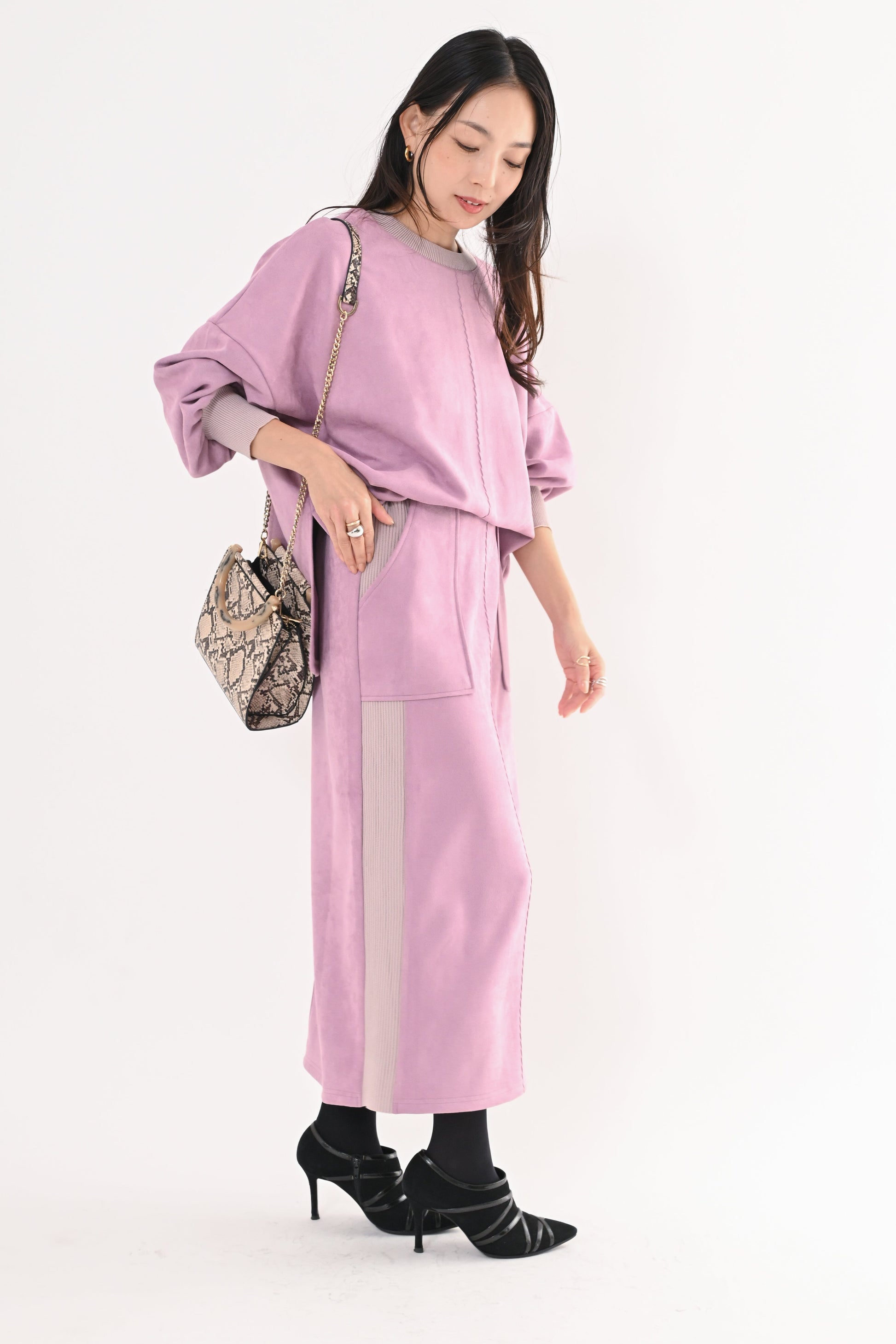 しっとりとしたスエード調素材にリブを切り替えた、表情豊かなタイトスカート。縦ラインを強調するデザインで、すっきりとスタイルアップを叶えます。ポケット付きで実用性もあり、同素材のプルオーバーと合わせれば、洗練されたセットアップスタイルに。