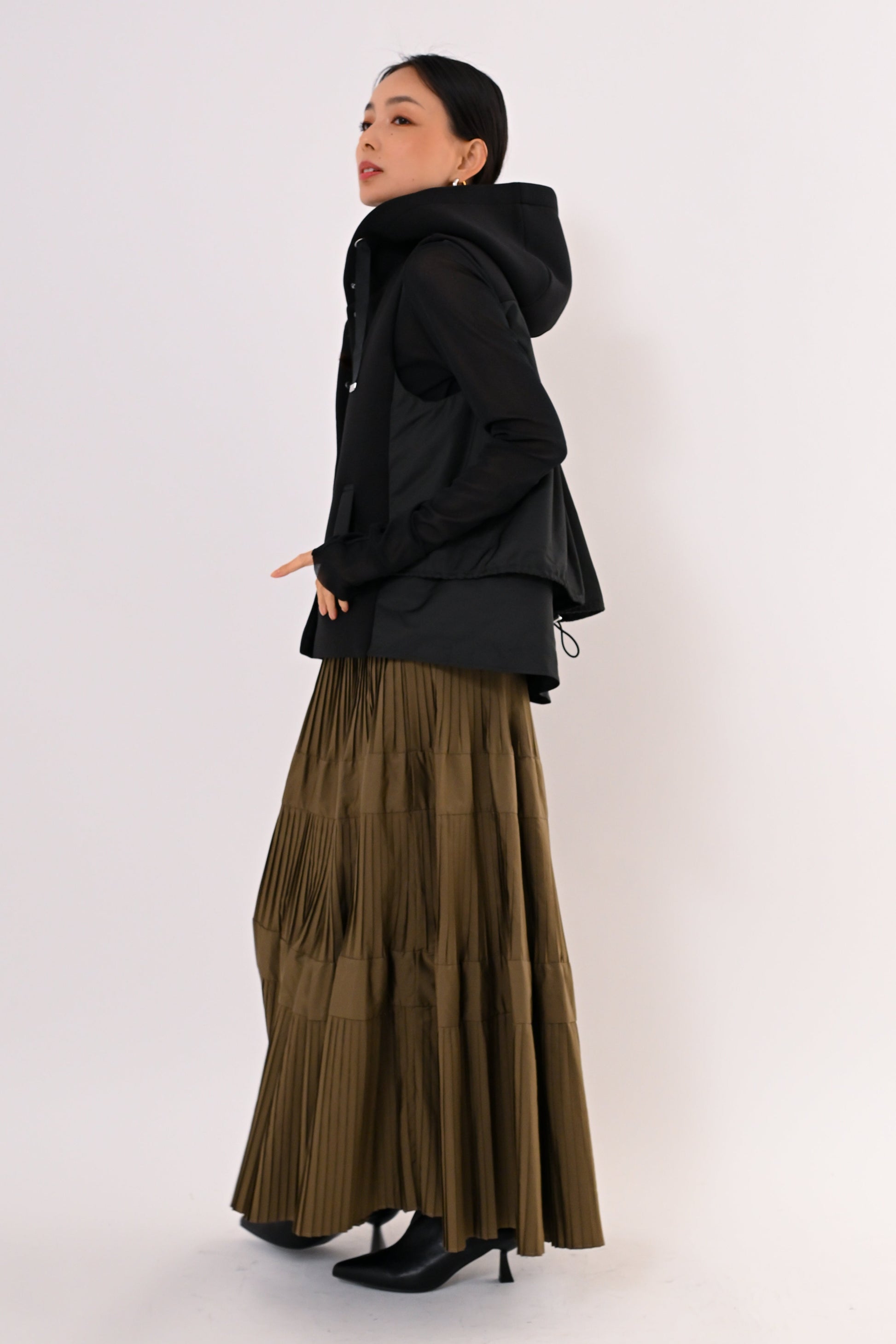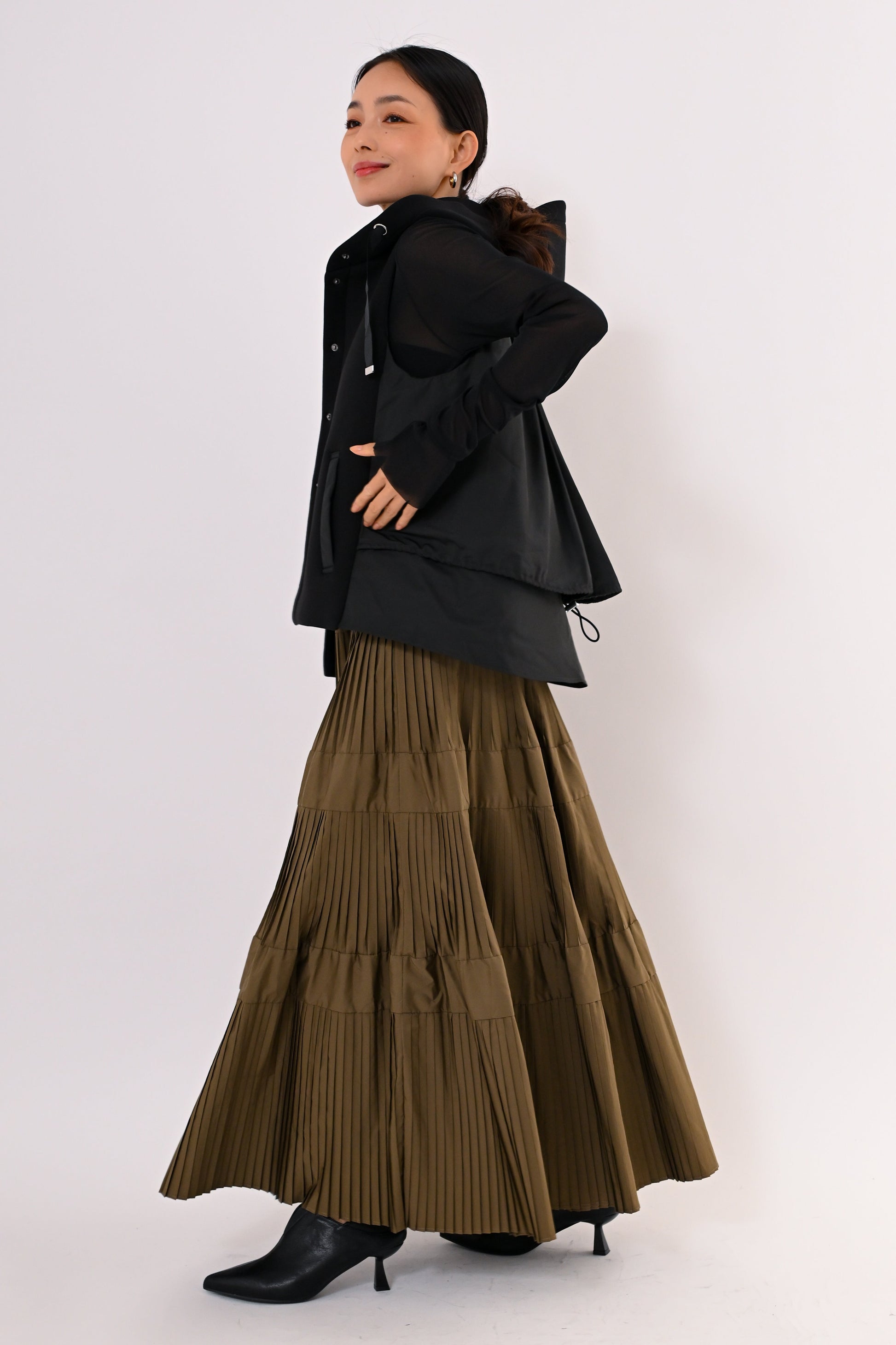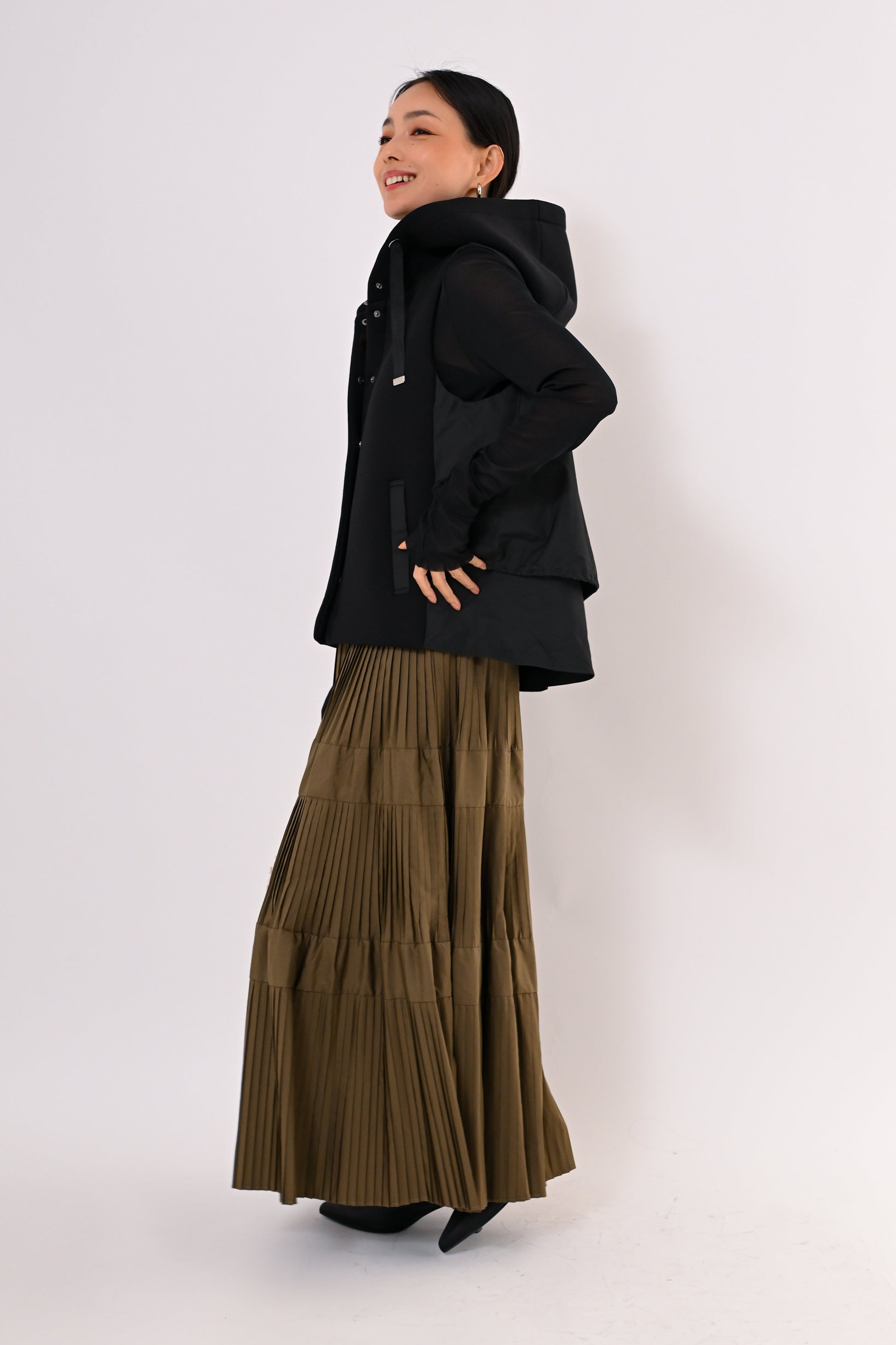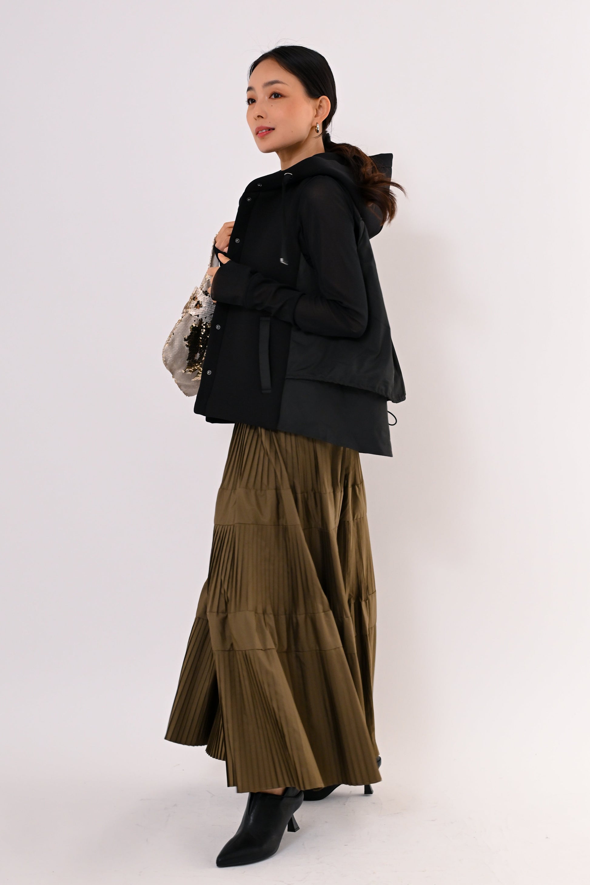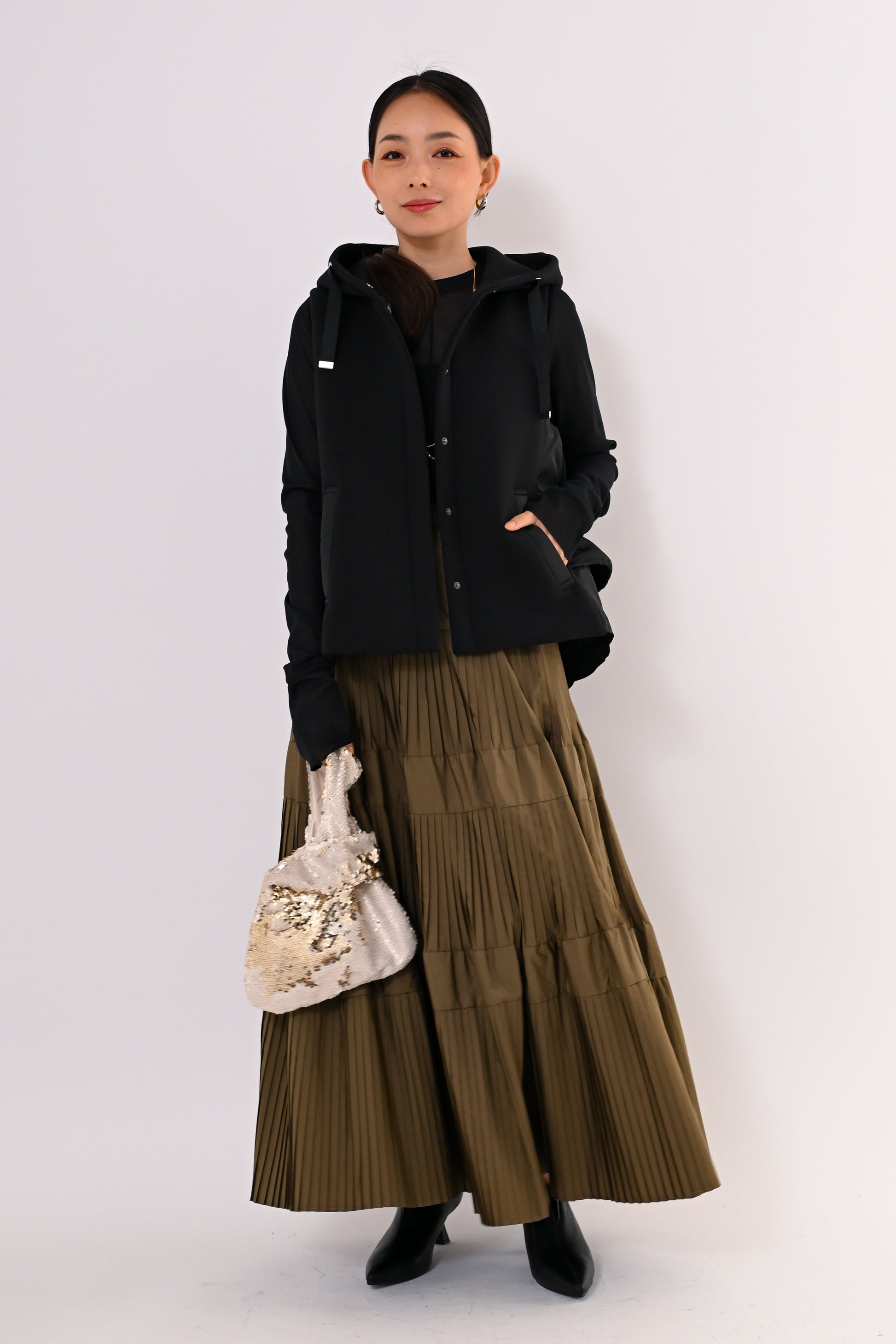 フロントは滑らかなダンボールニット、バックは布帛を使用し、立体感のあるシルエットに仕上げました。さりげない光沢と素材のコントラストが、カジュアルになりがちなフードスタイルを洗練された印象へと導きます。