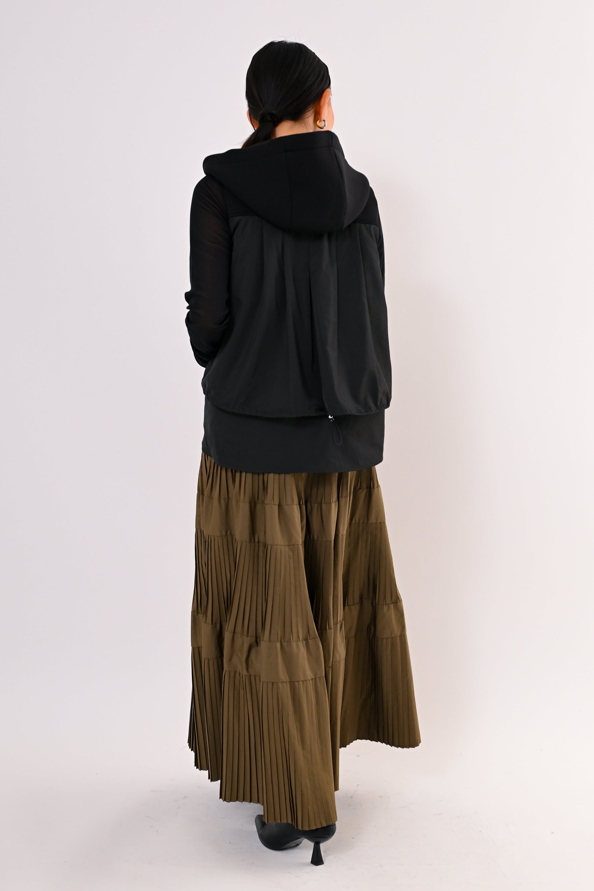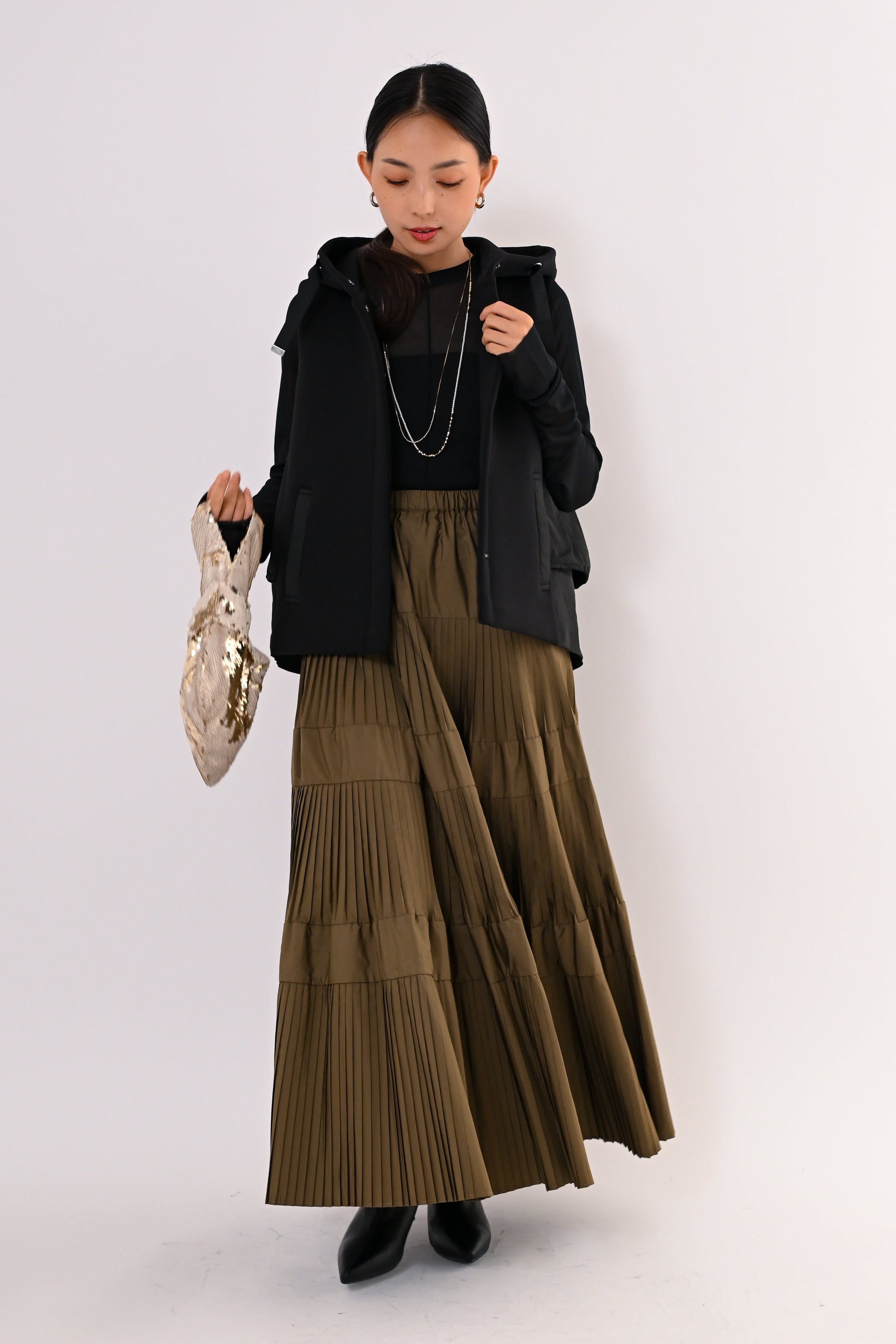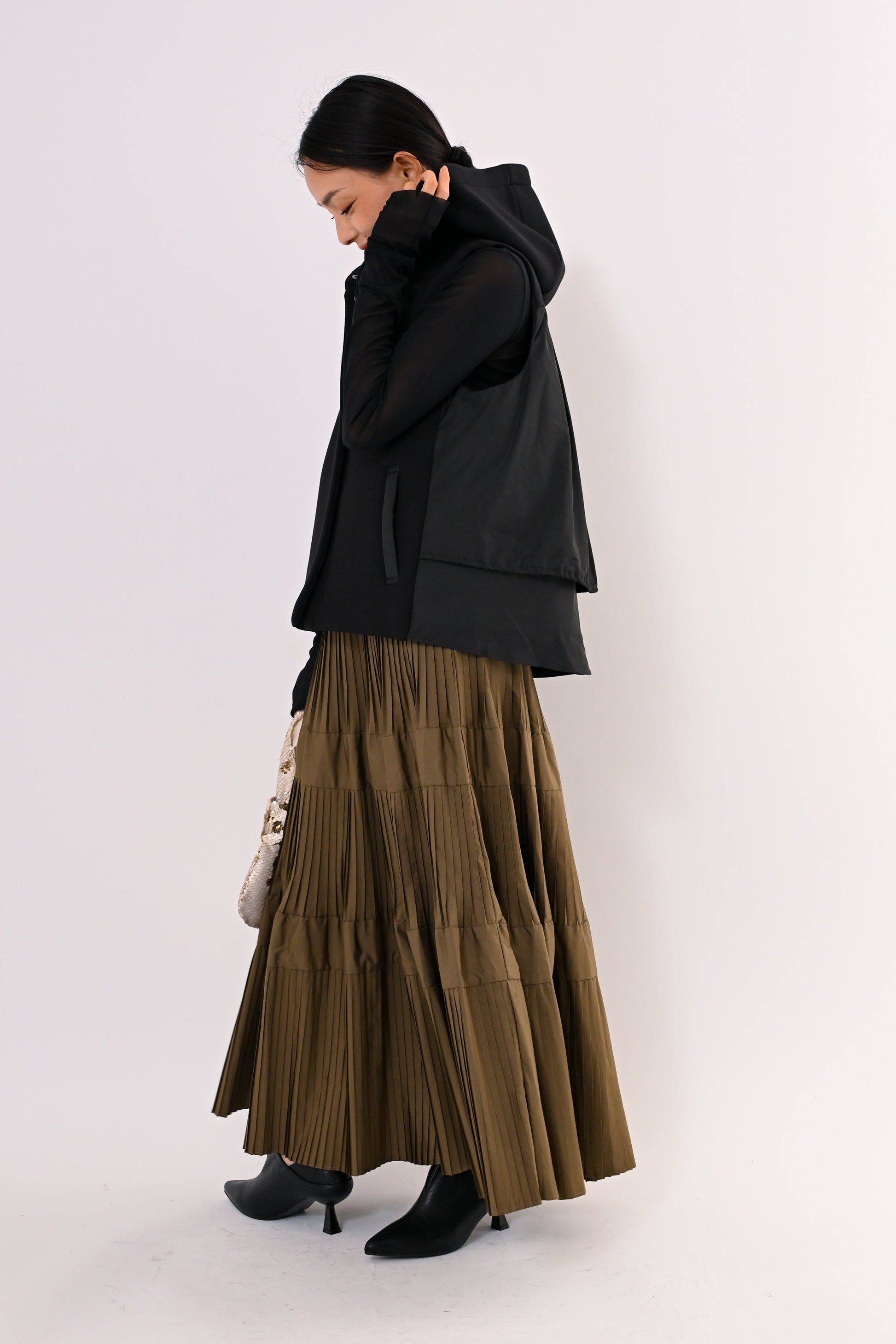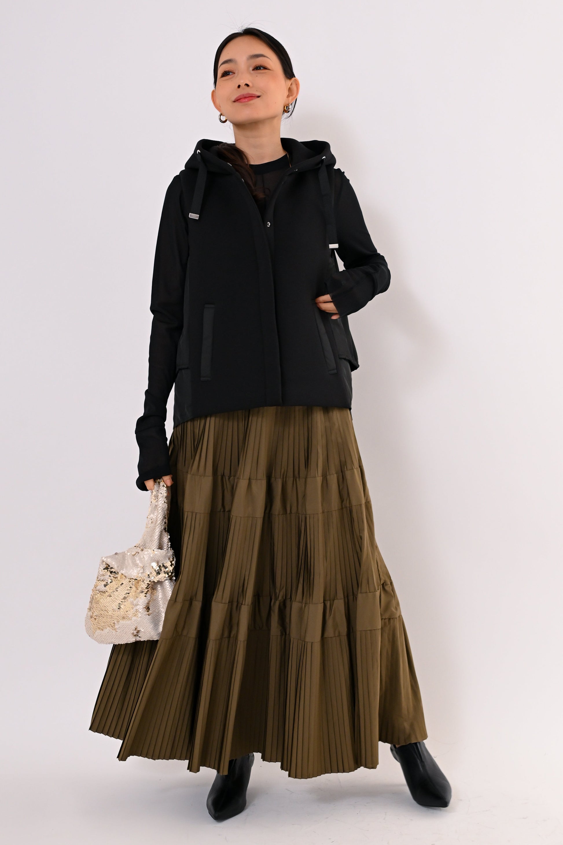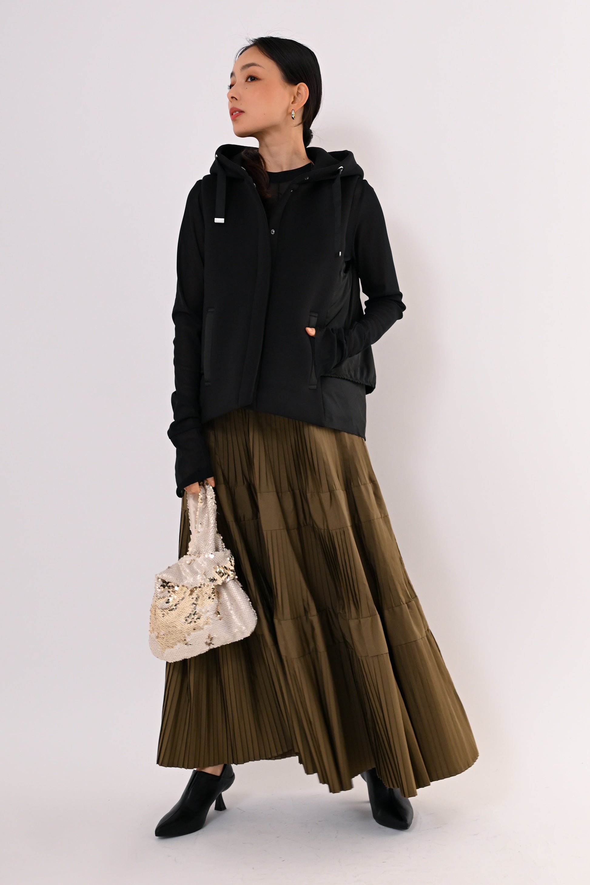 上品な異素材切り替えが目を惹く、大人のためのフードベスト。