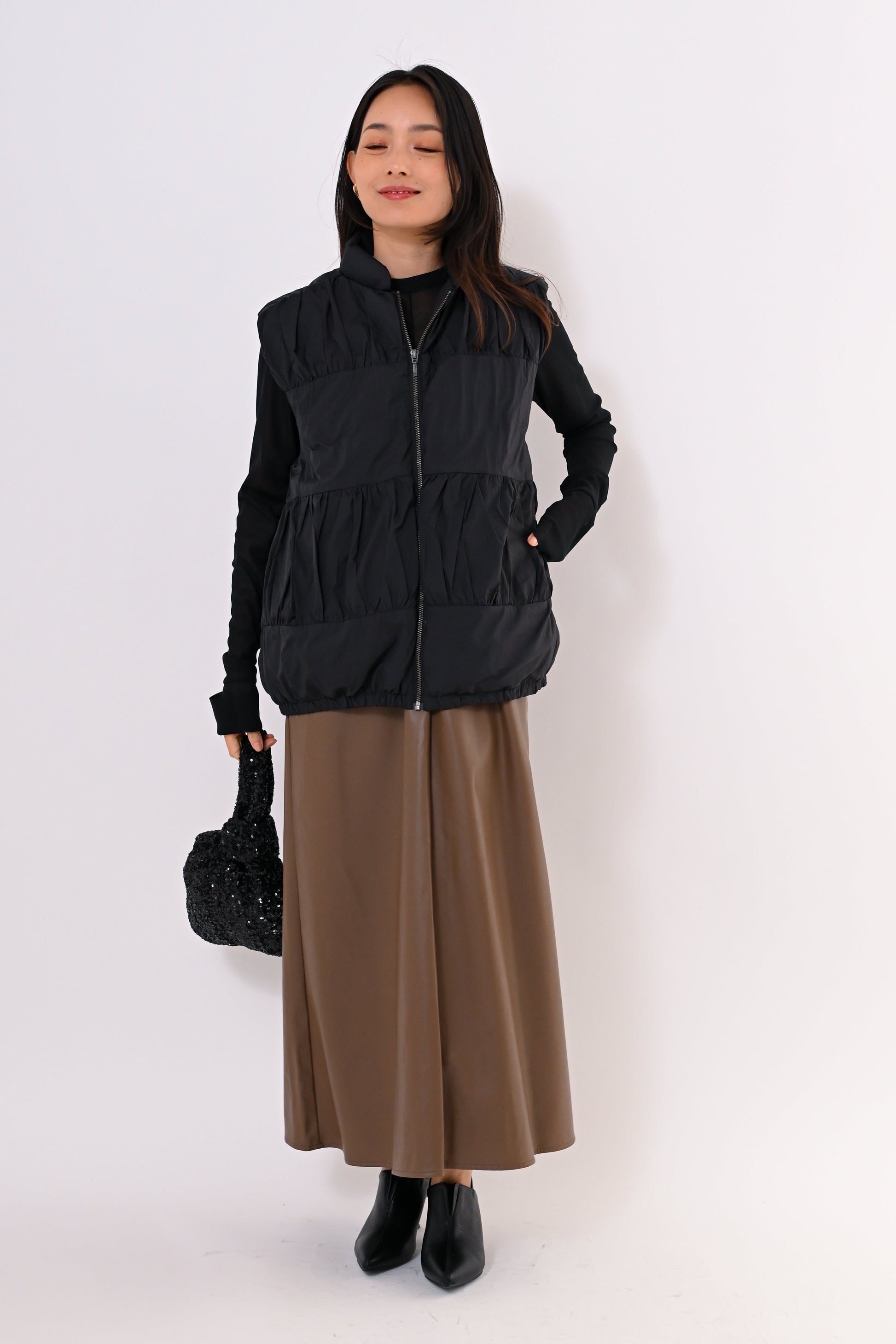 ふんわりとしたティアードデザインが女性らしい印象のダウンベスト。