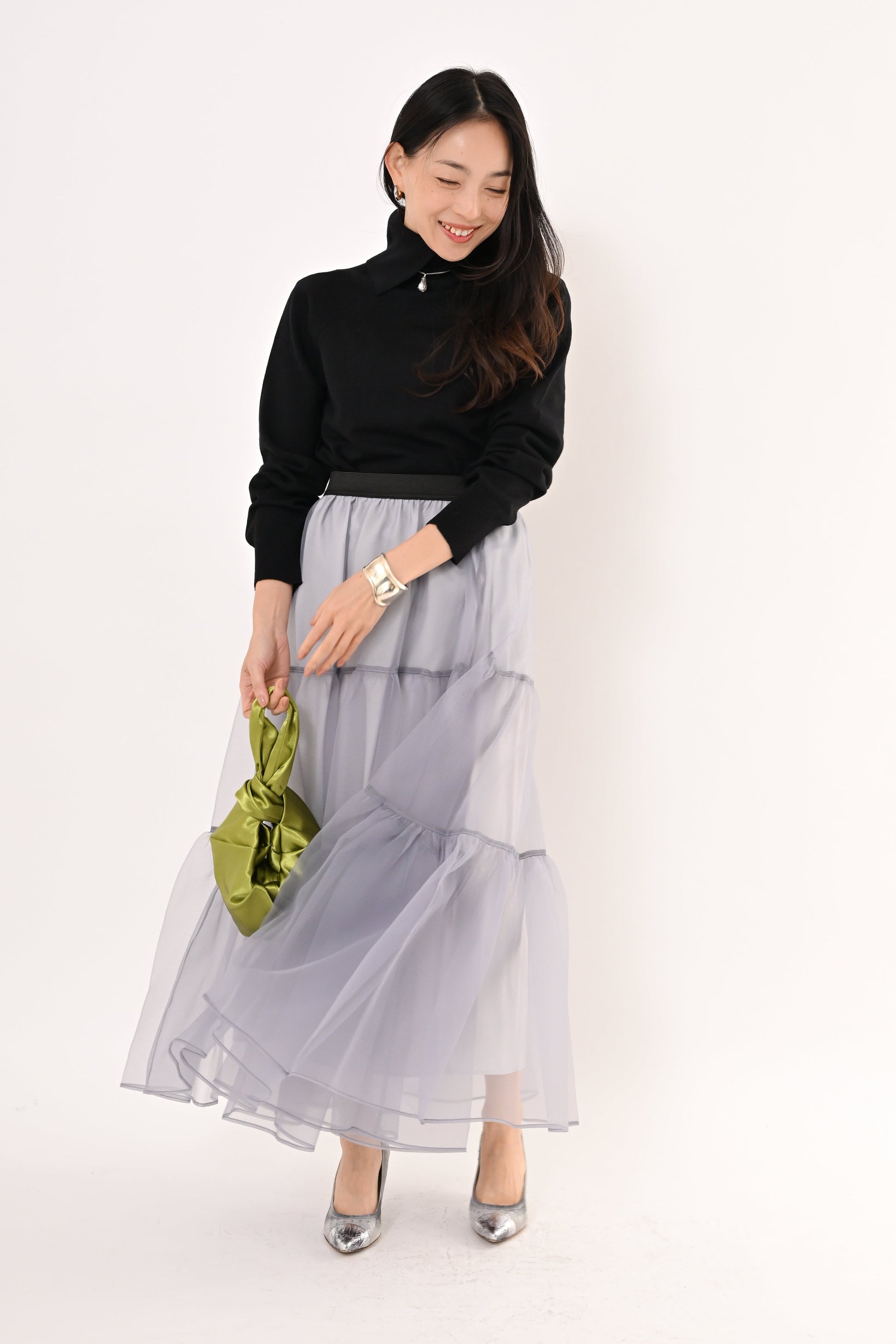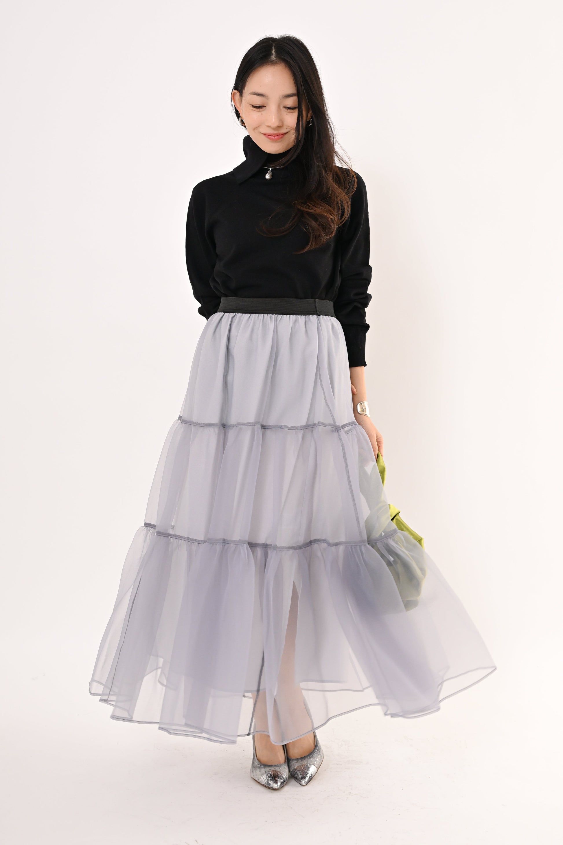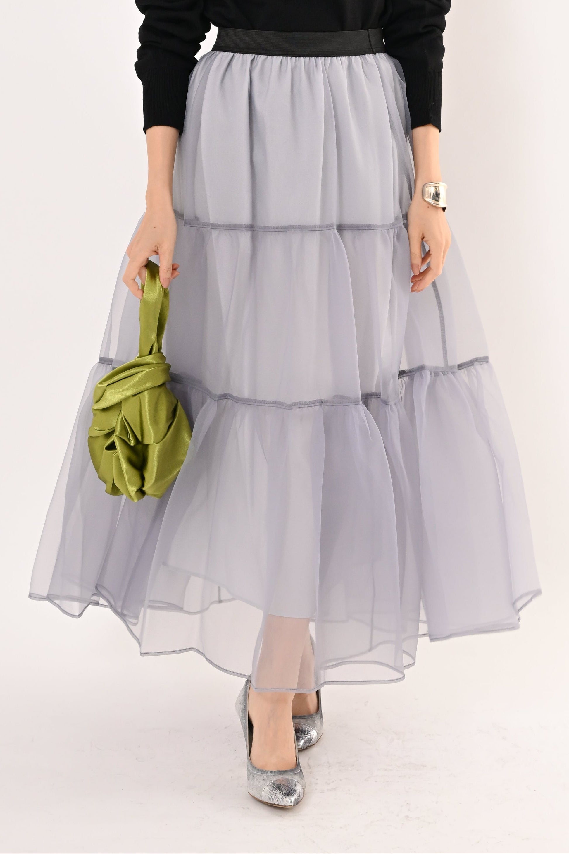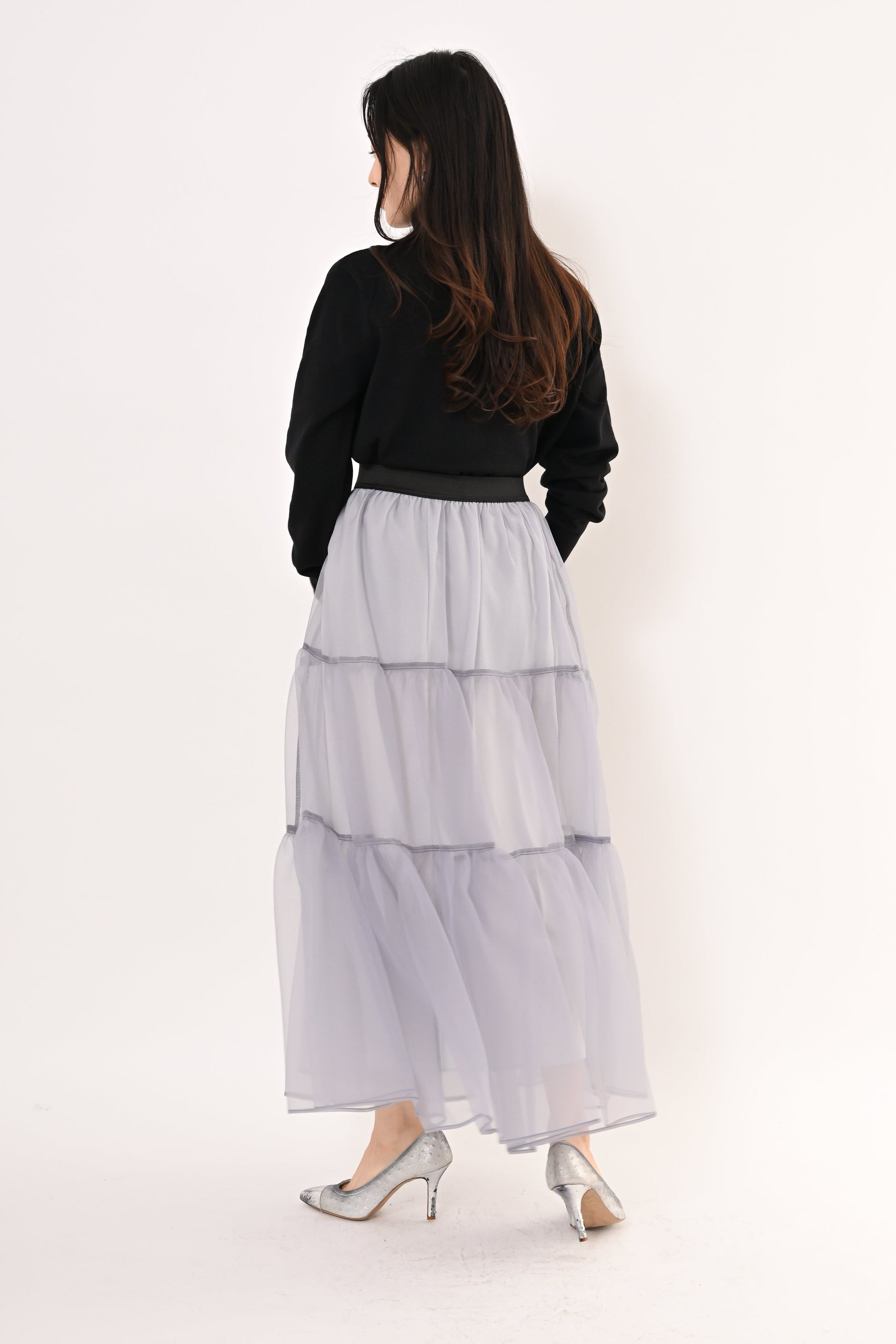 表面感とラメ感のあるオーガンジー素材を使用したティアードスカート。