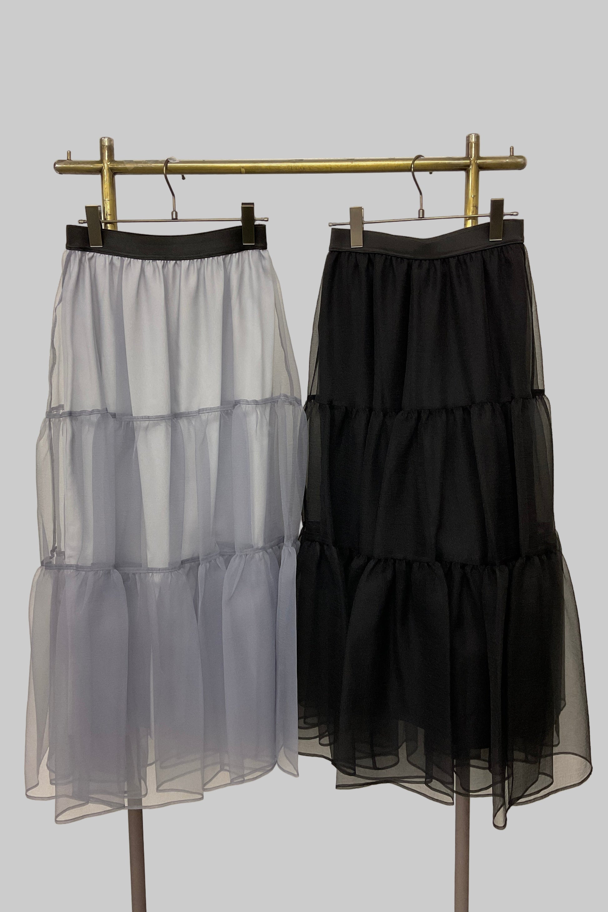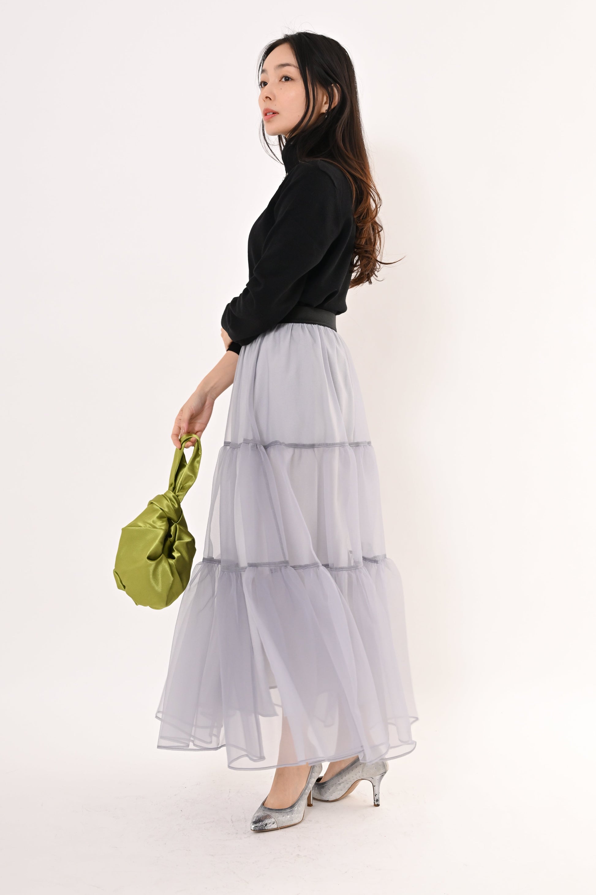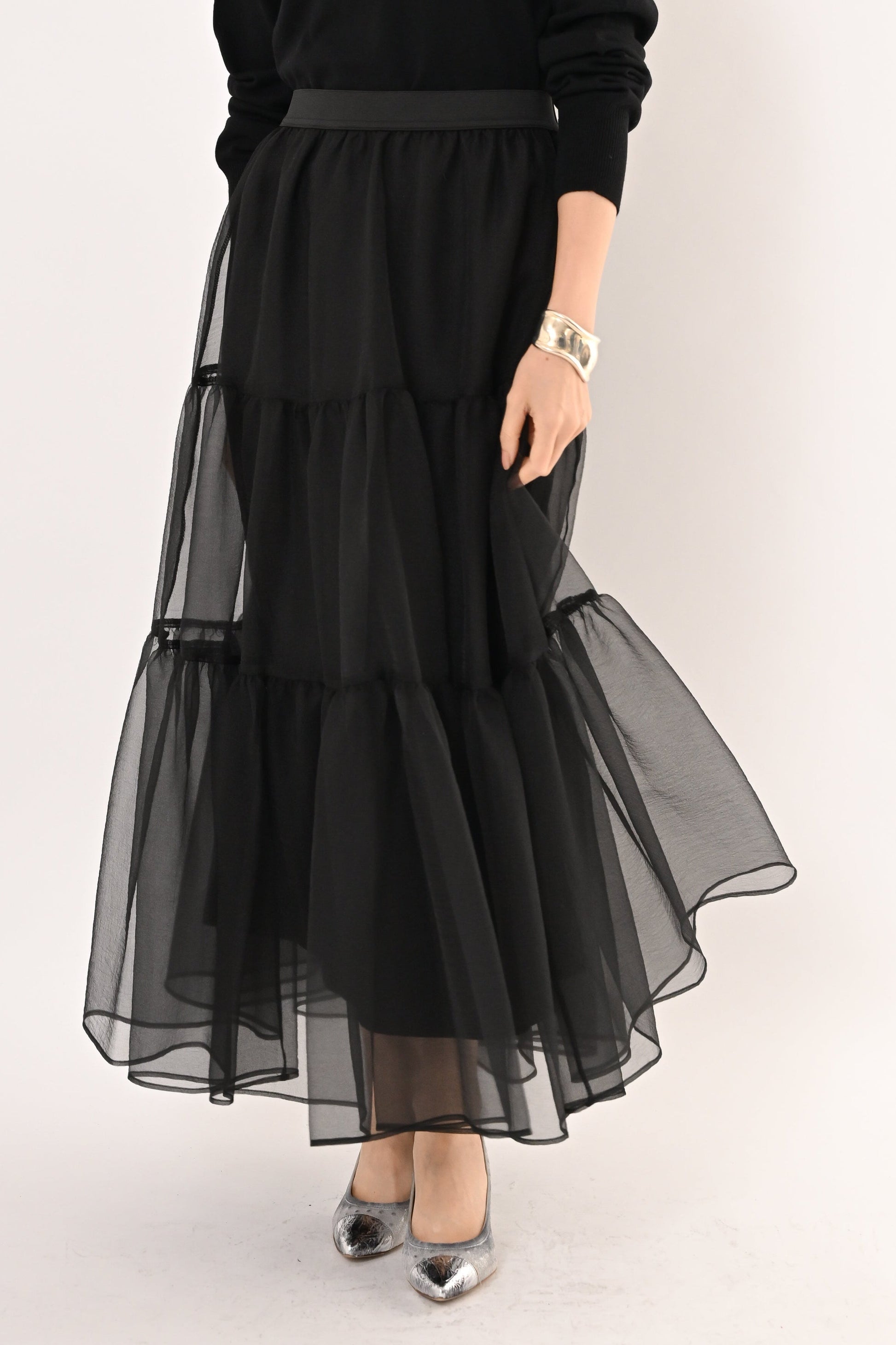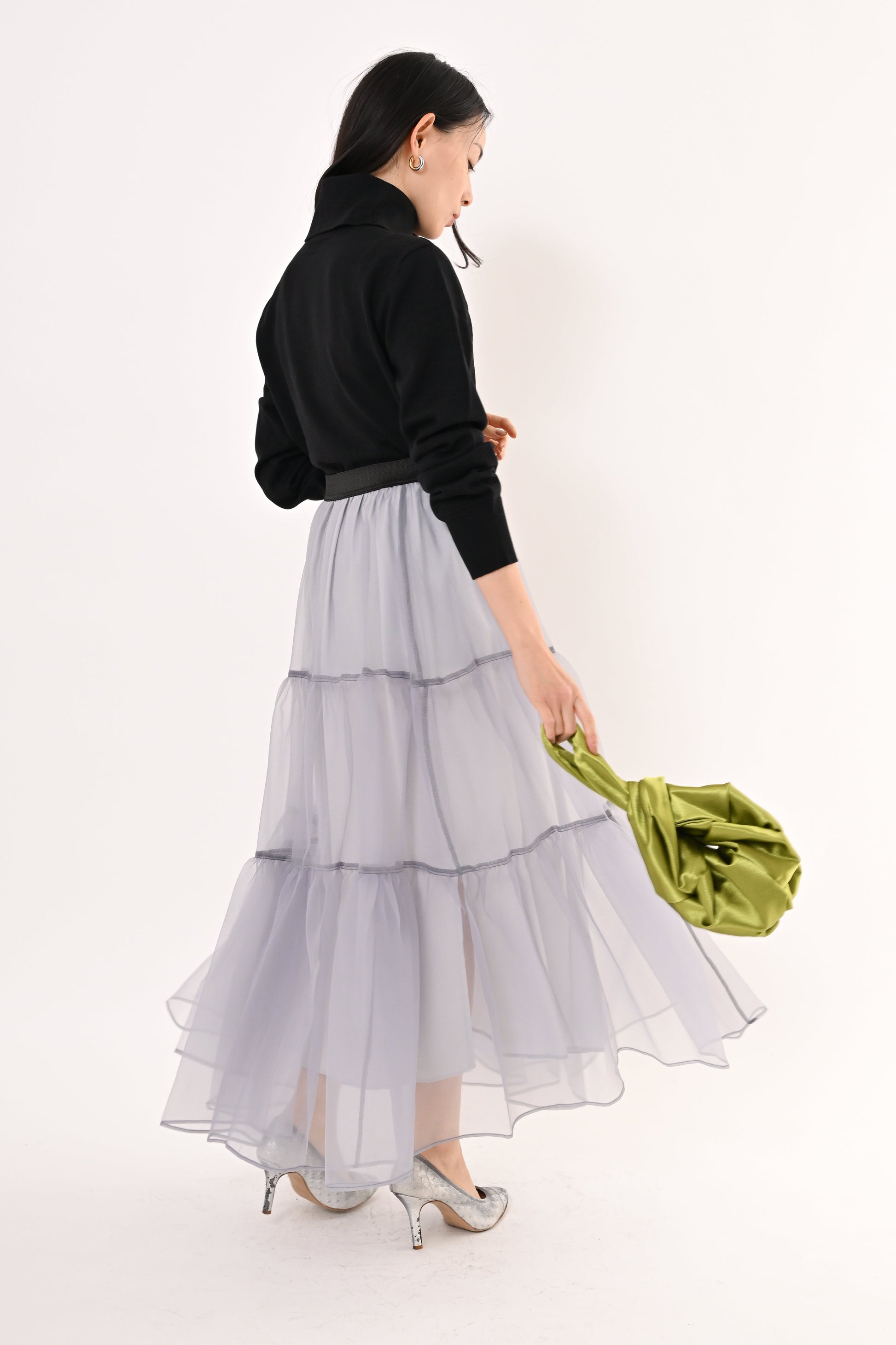 表面感とラメ感のあるオーガンジー素材を使用したティアードスカート。