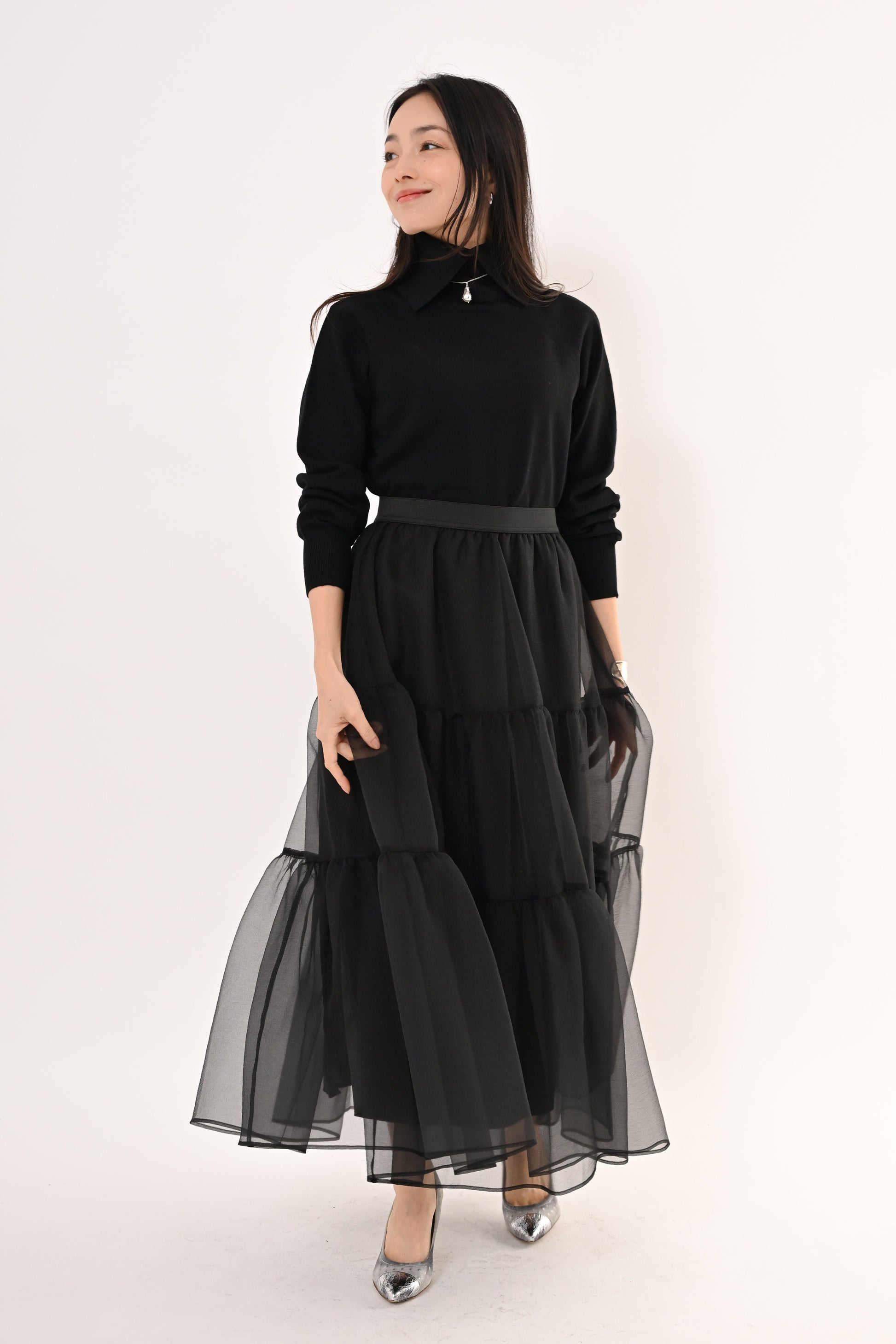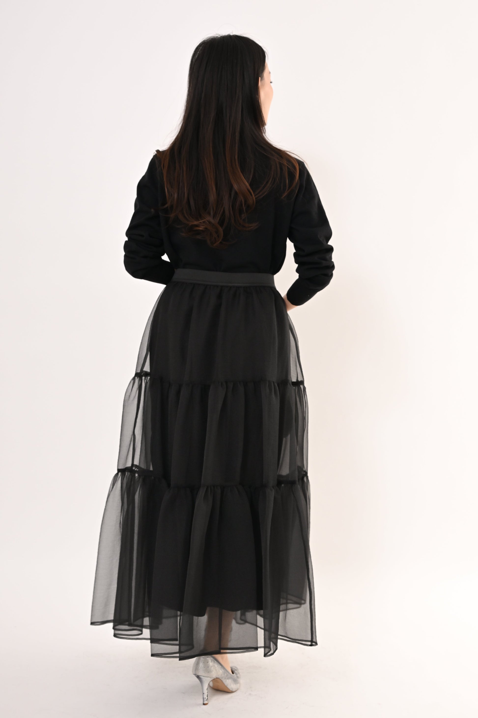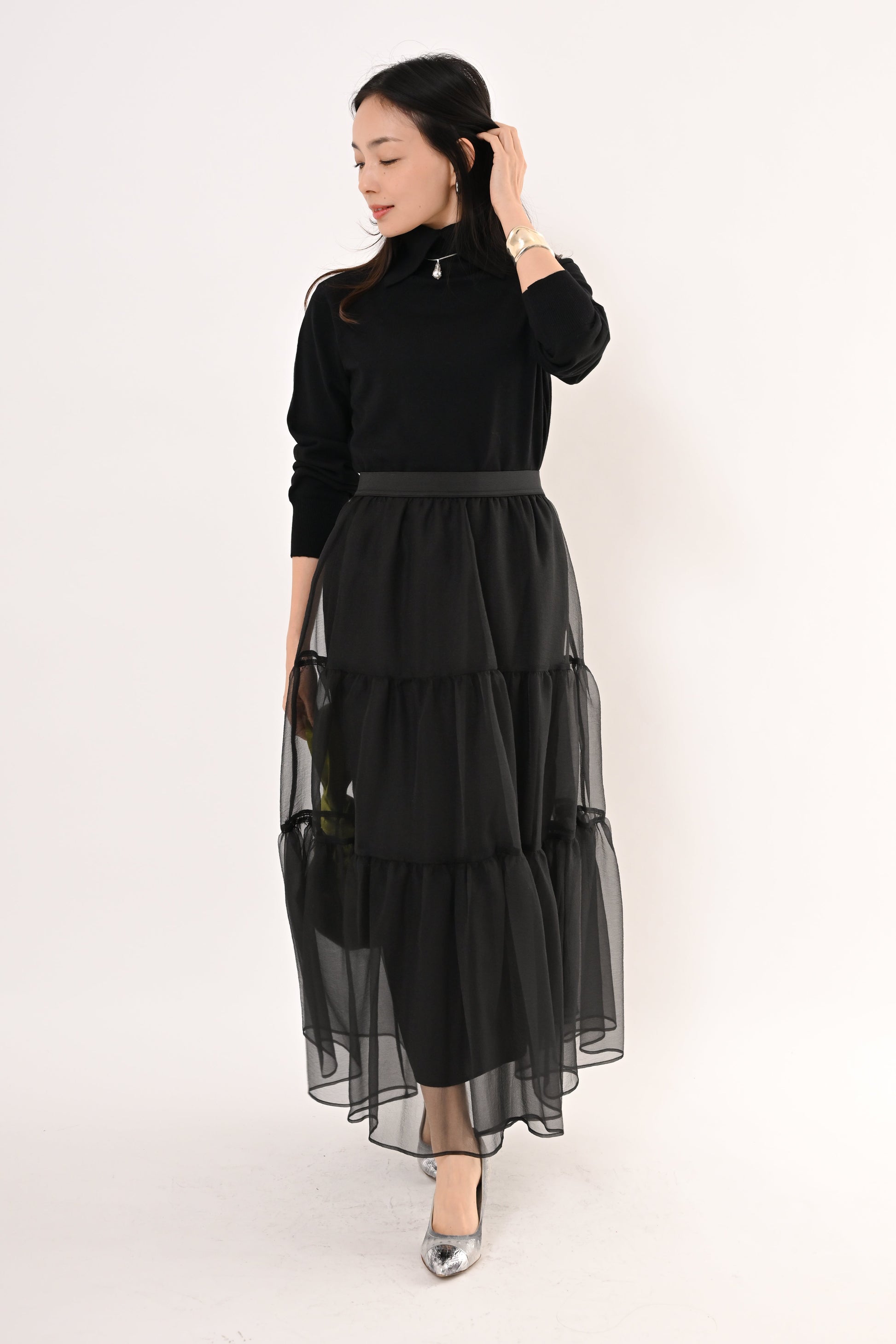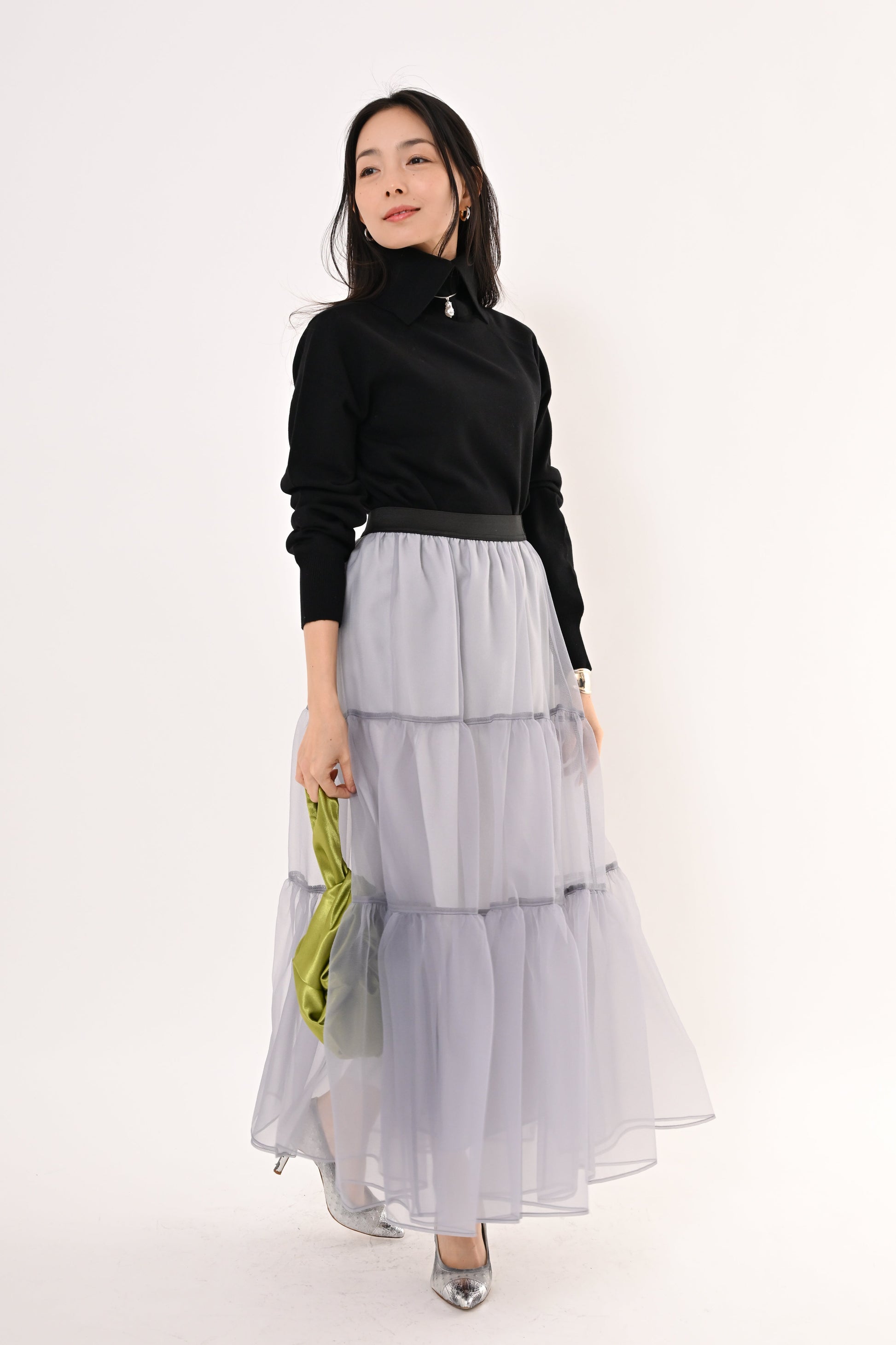 表面感とラメ感のあるオーガンジー素材を使用したティアードスカート。