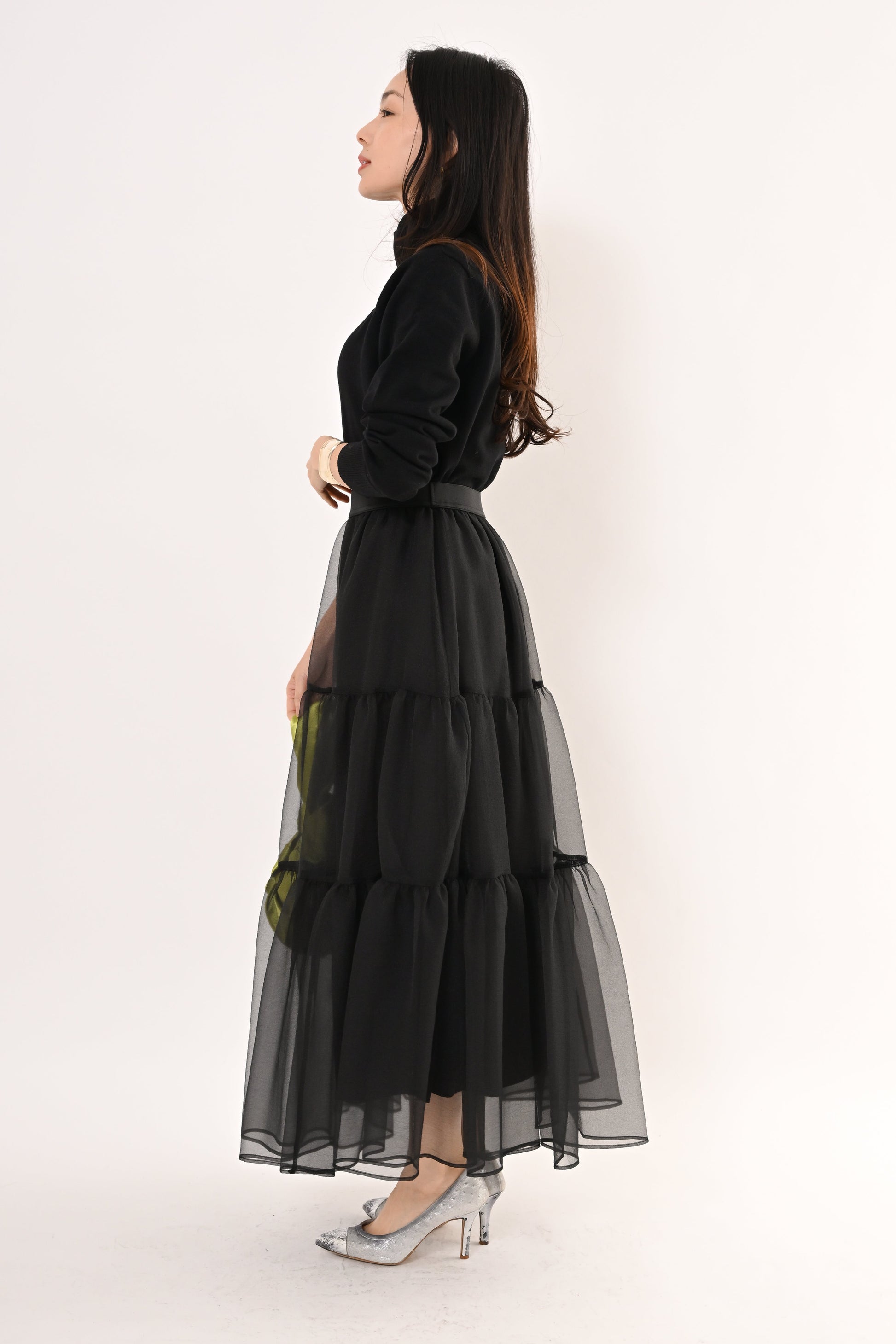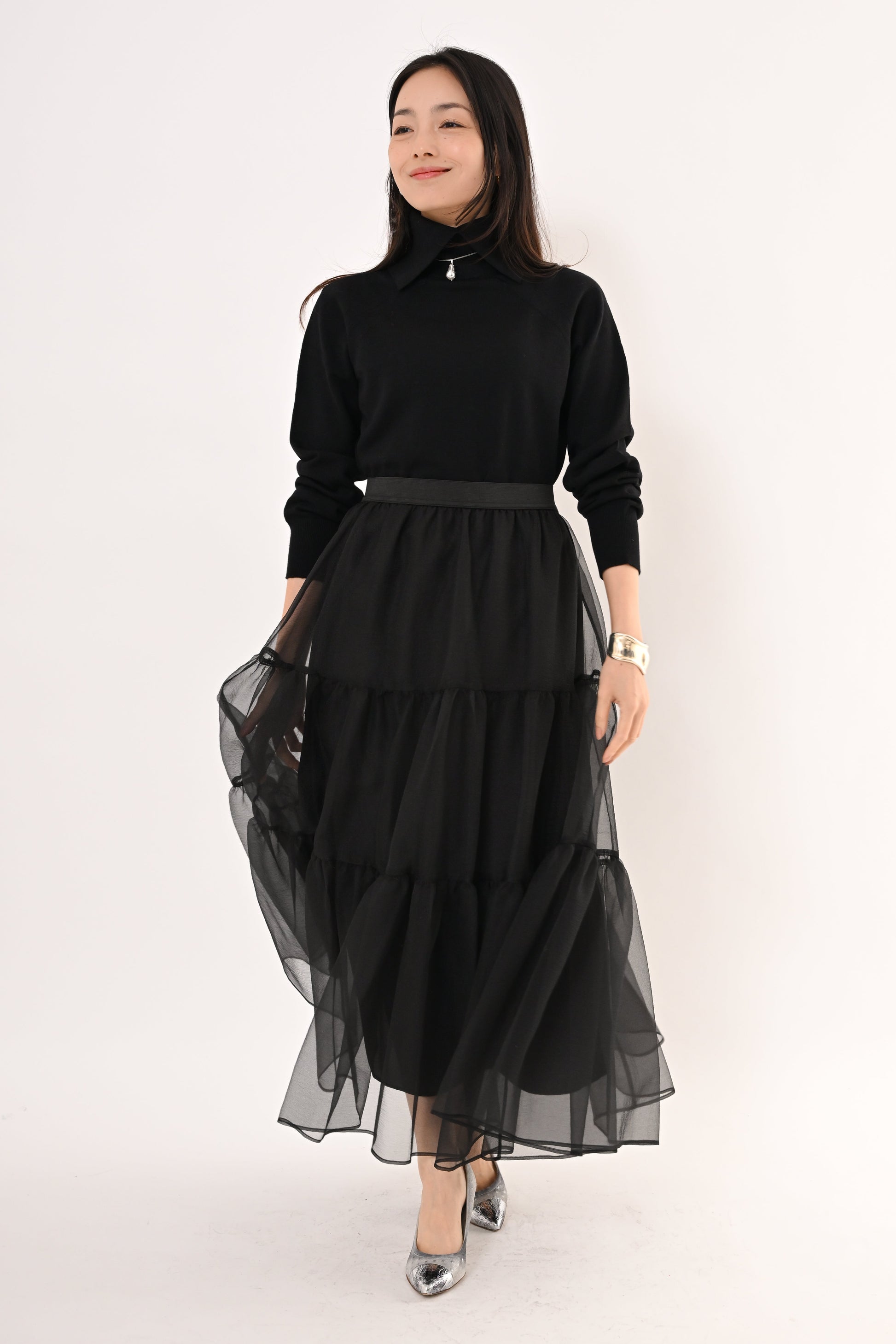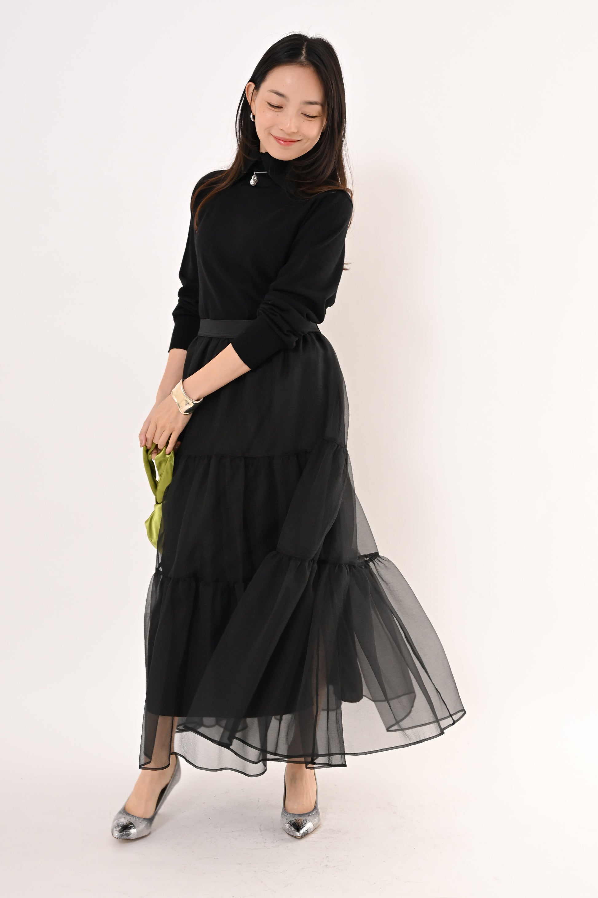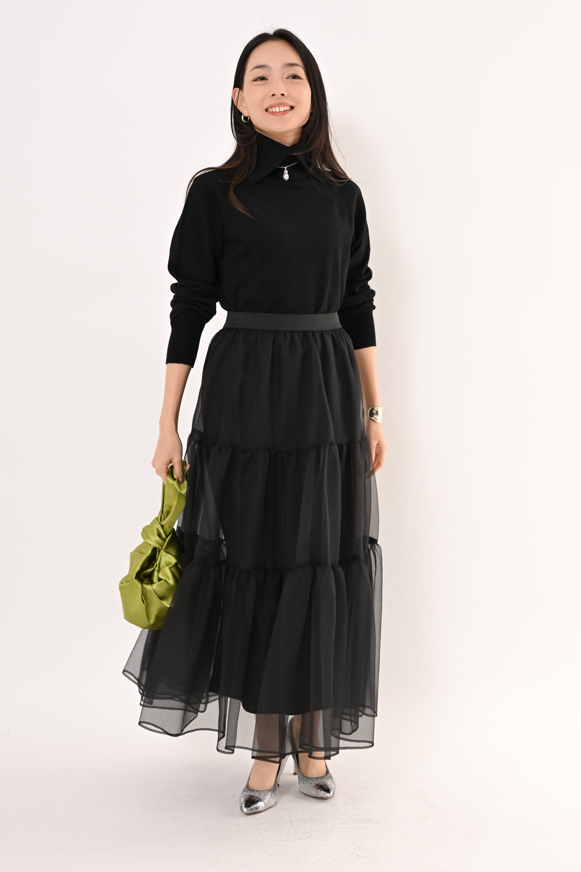 表面感とラメ感のあるオーガンジー素材を使用したティアードスカート。