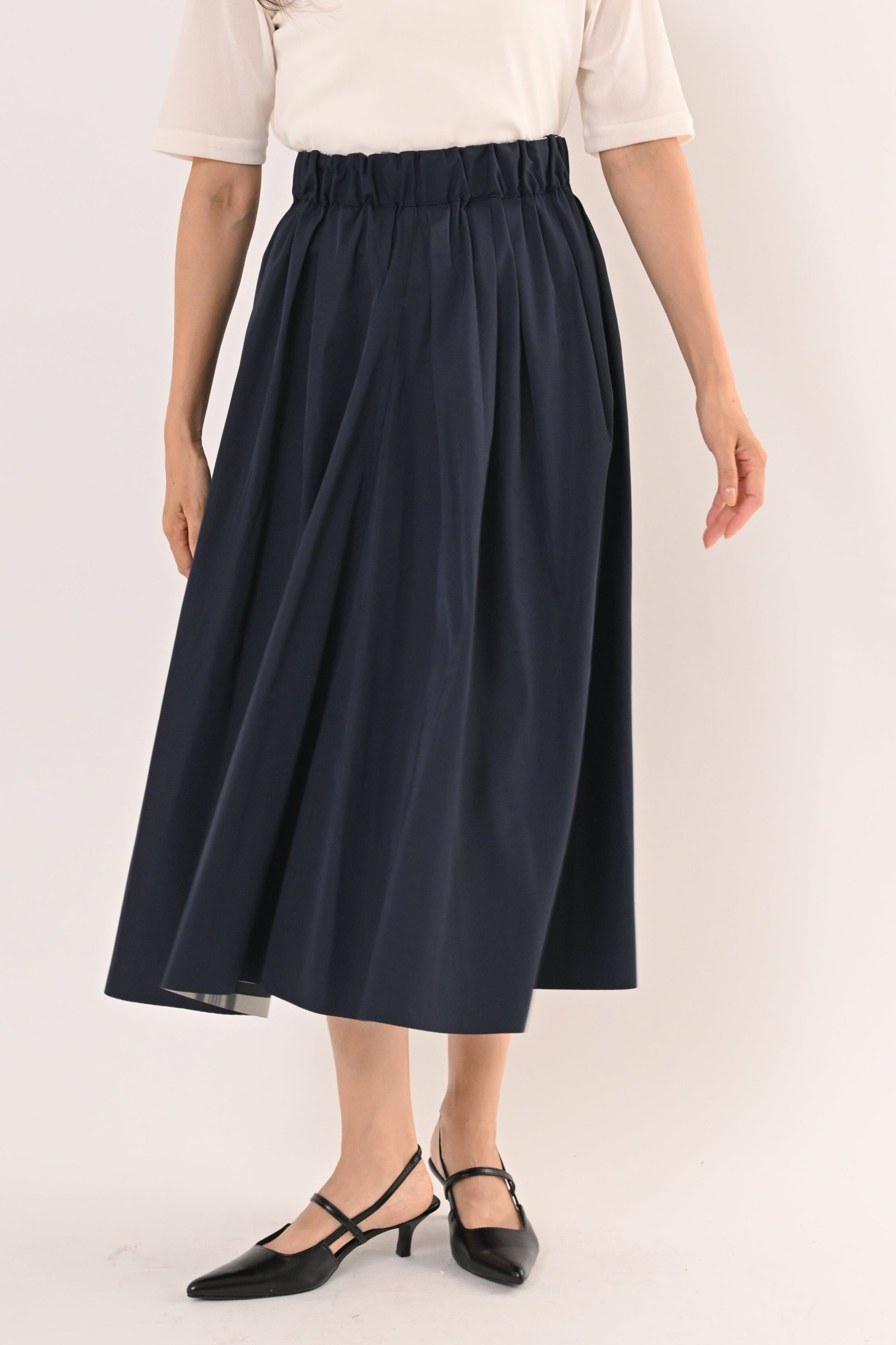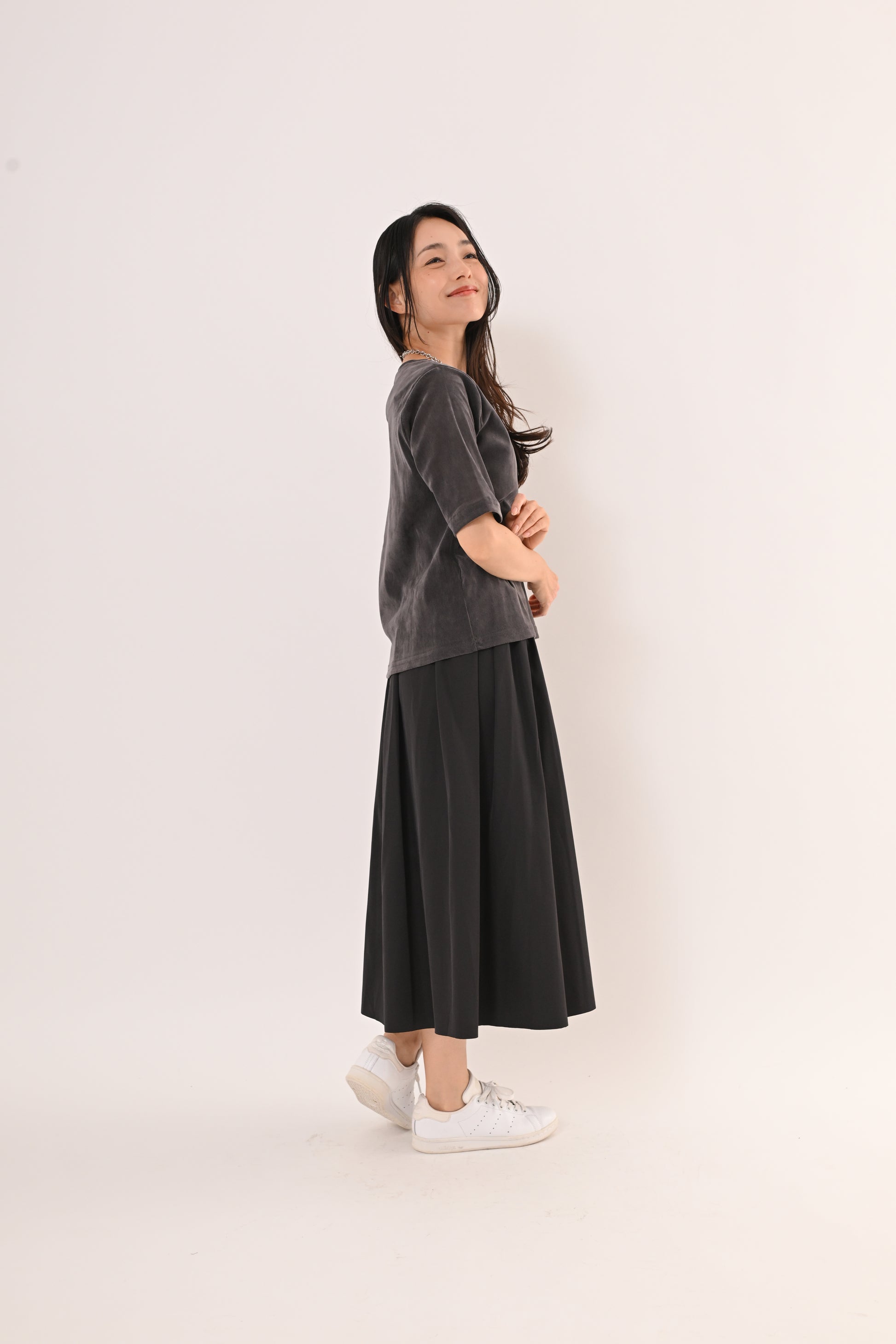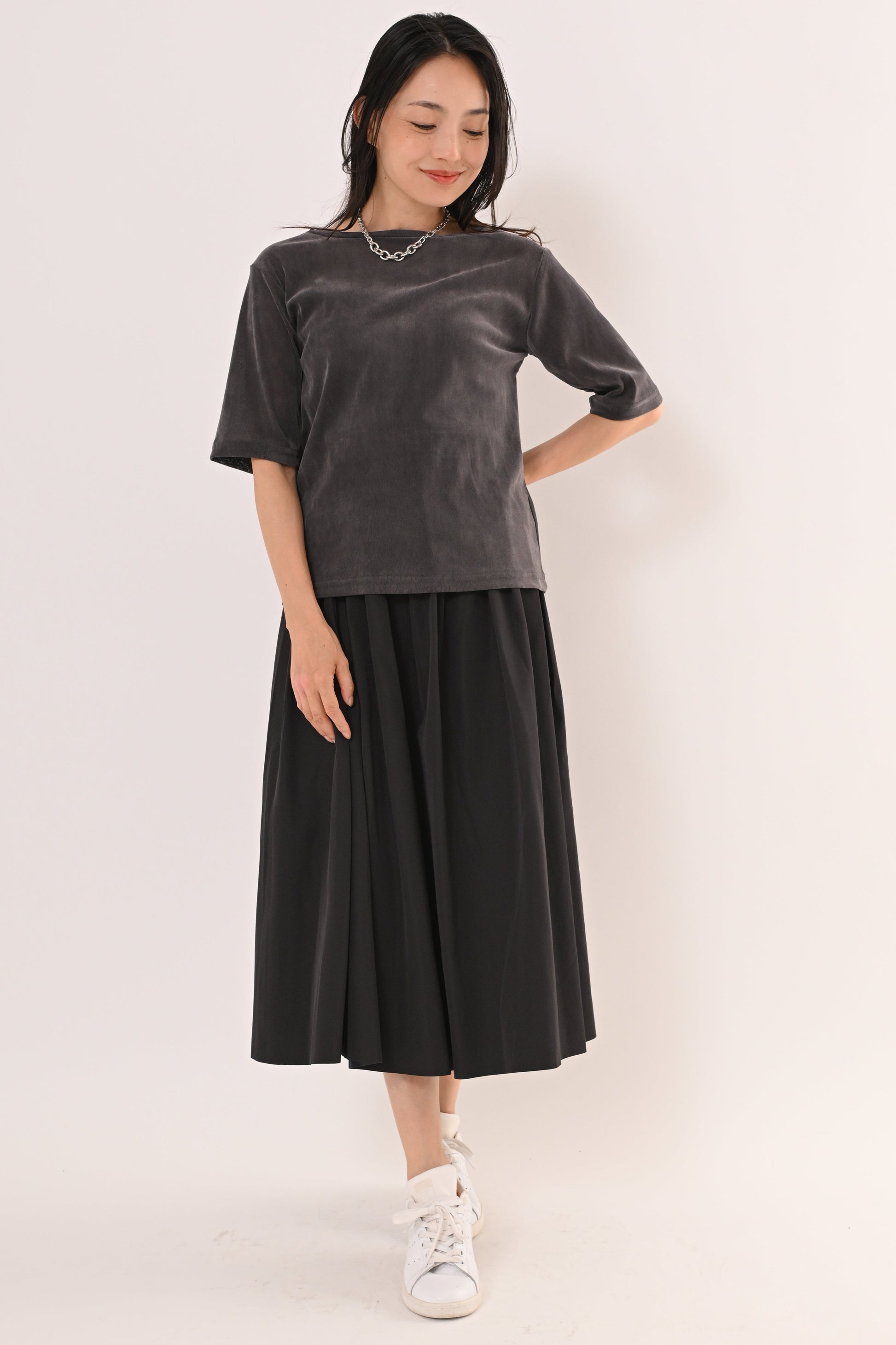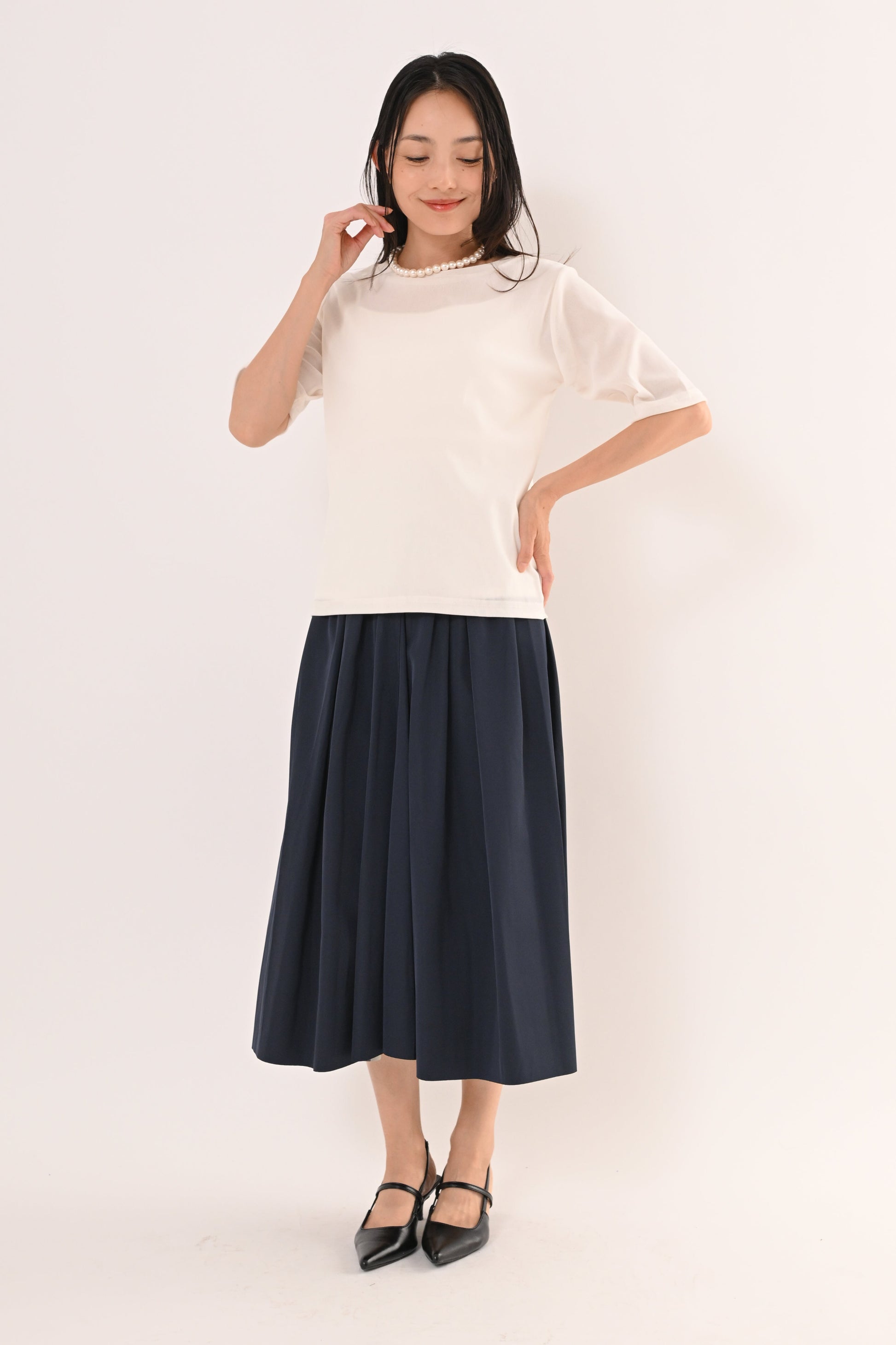 ハリのある素材で、裾にかけて広がる程よいボリュームのフレアラインが、