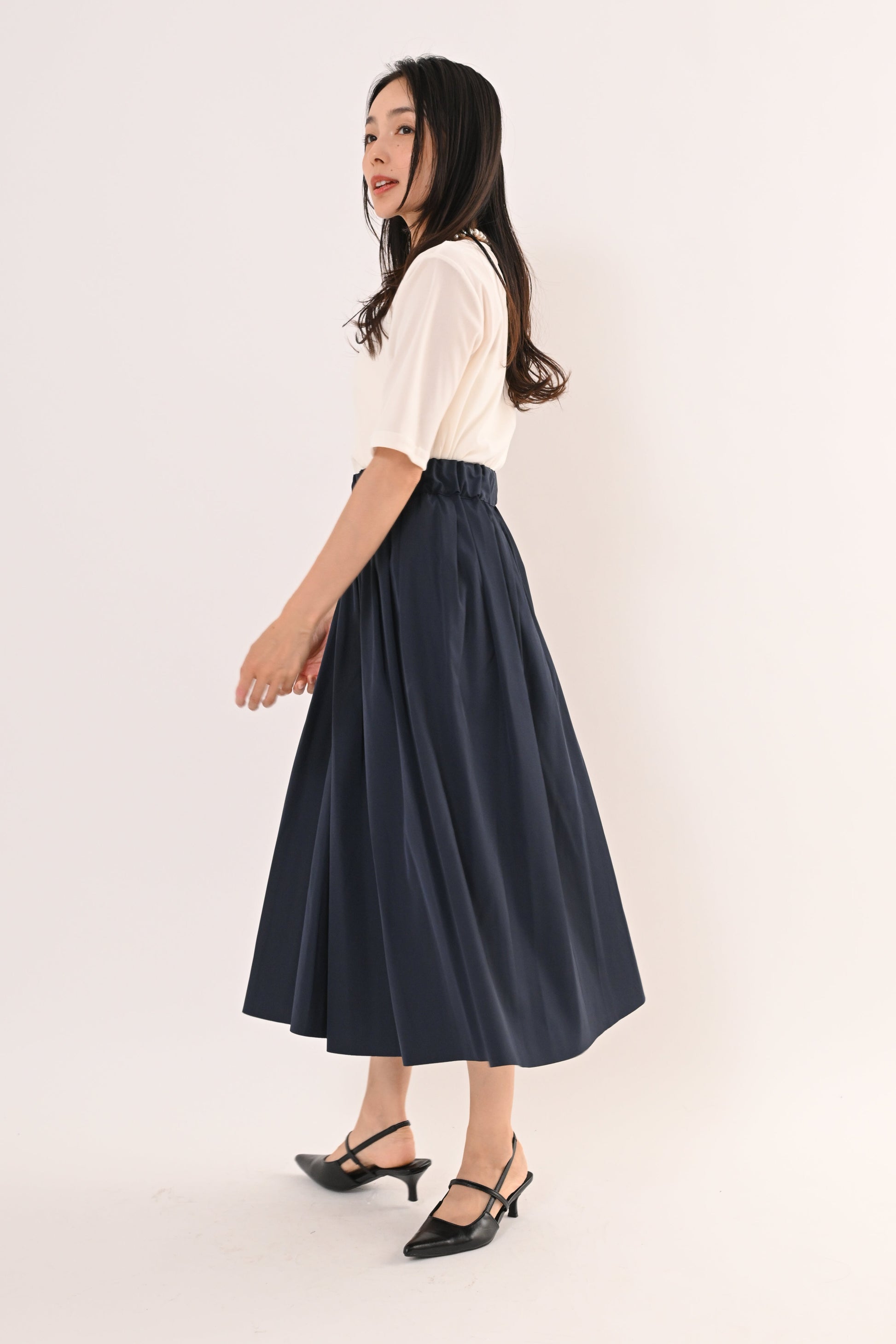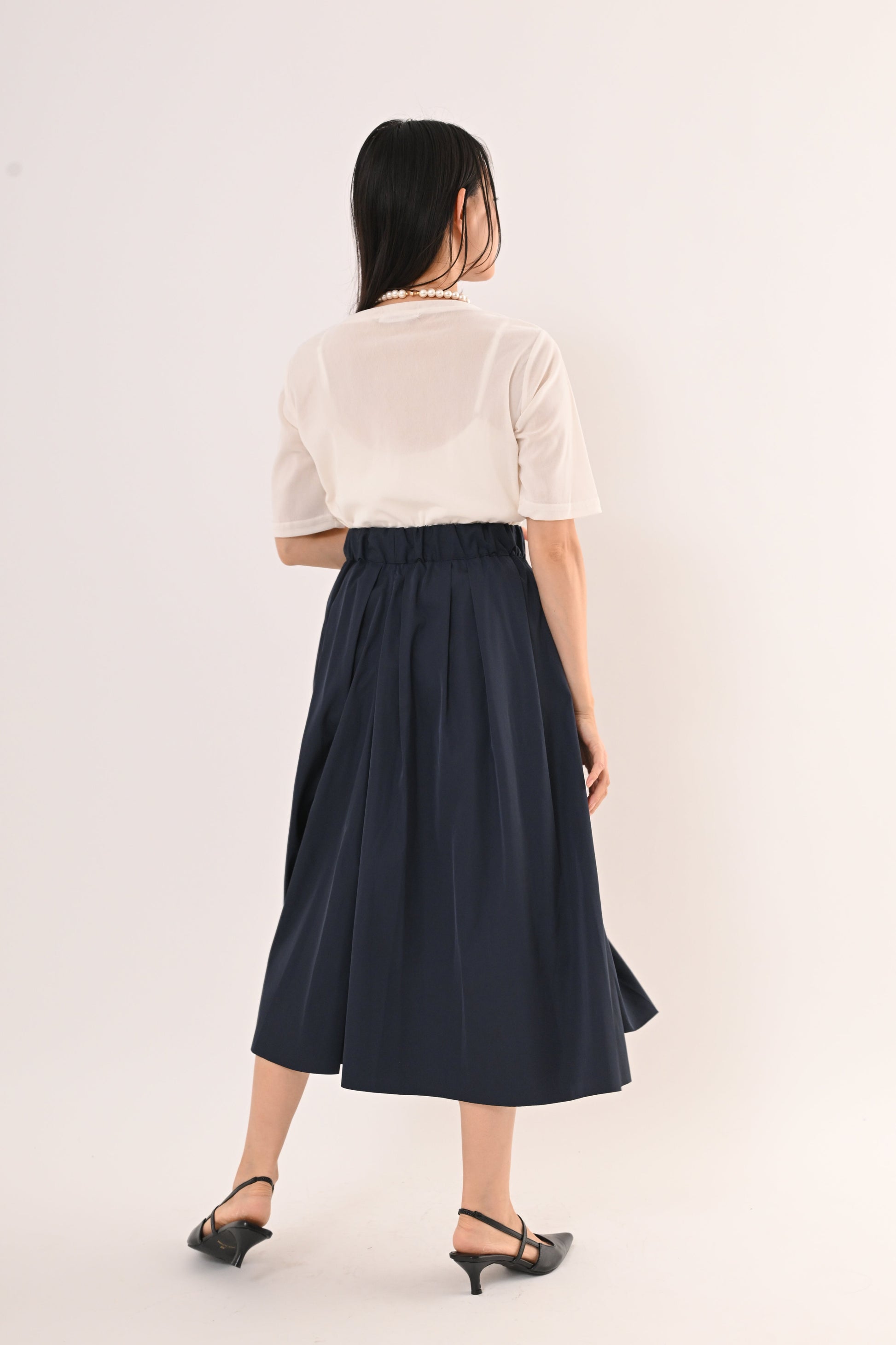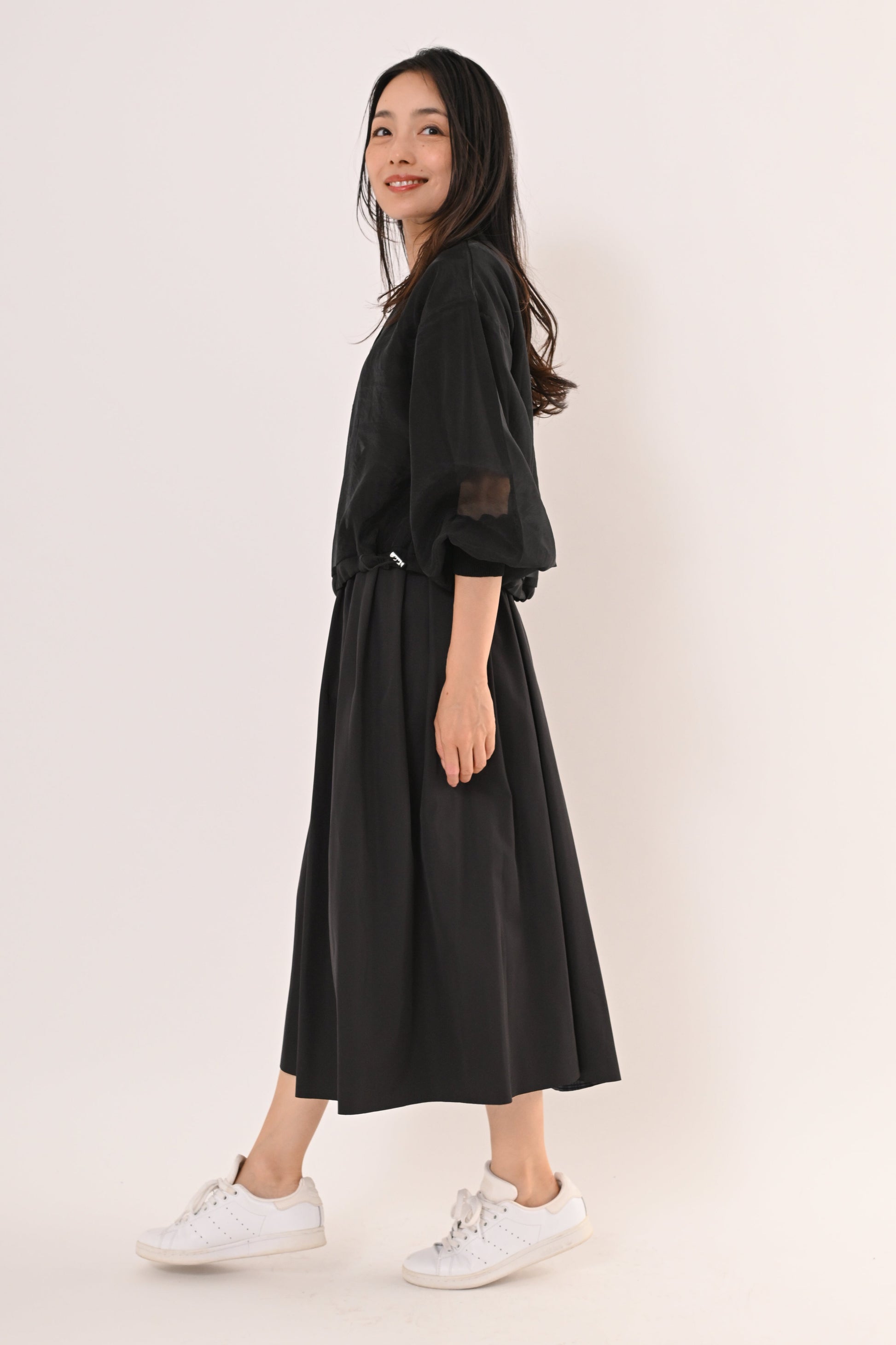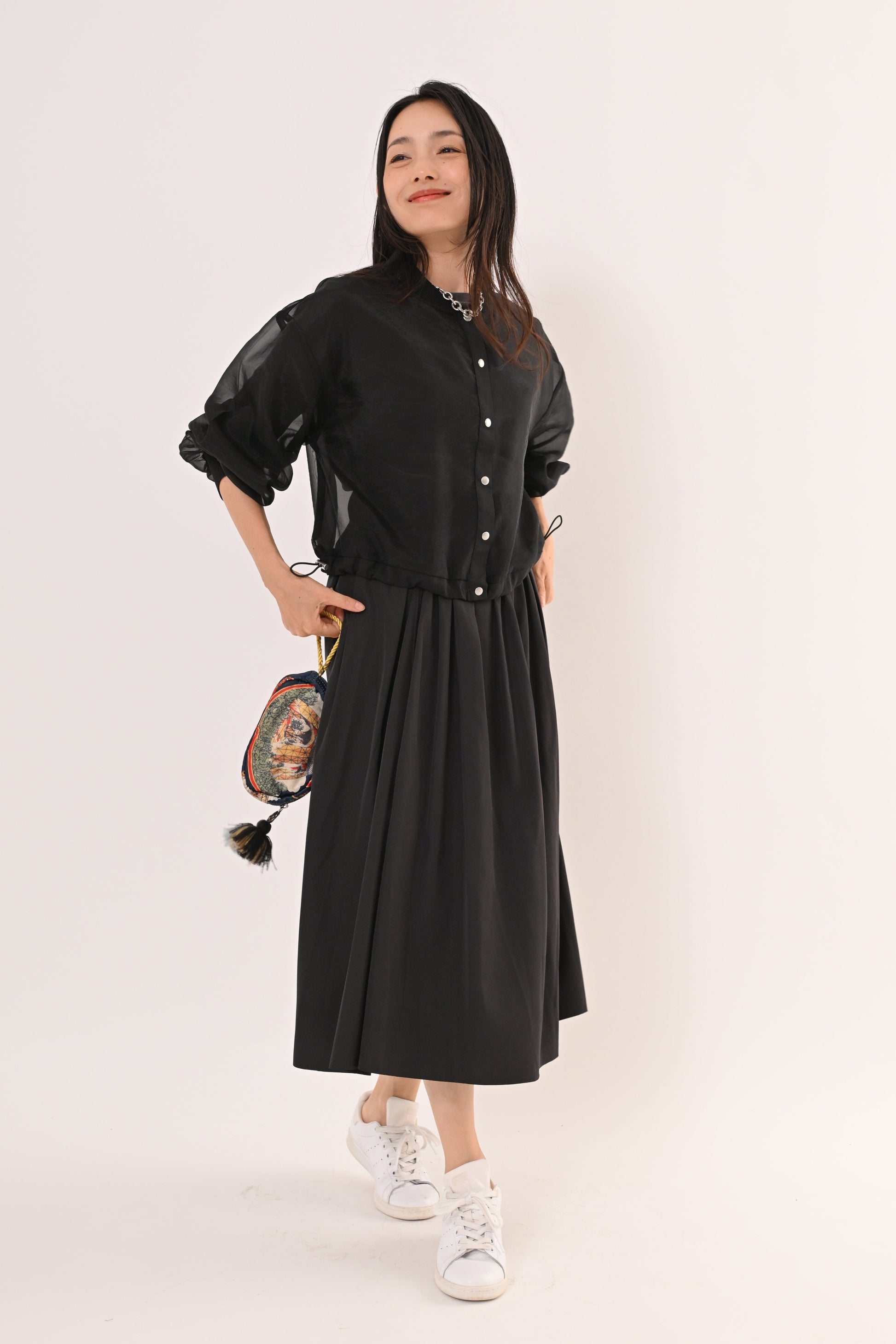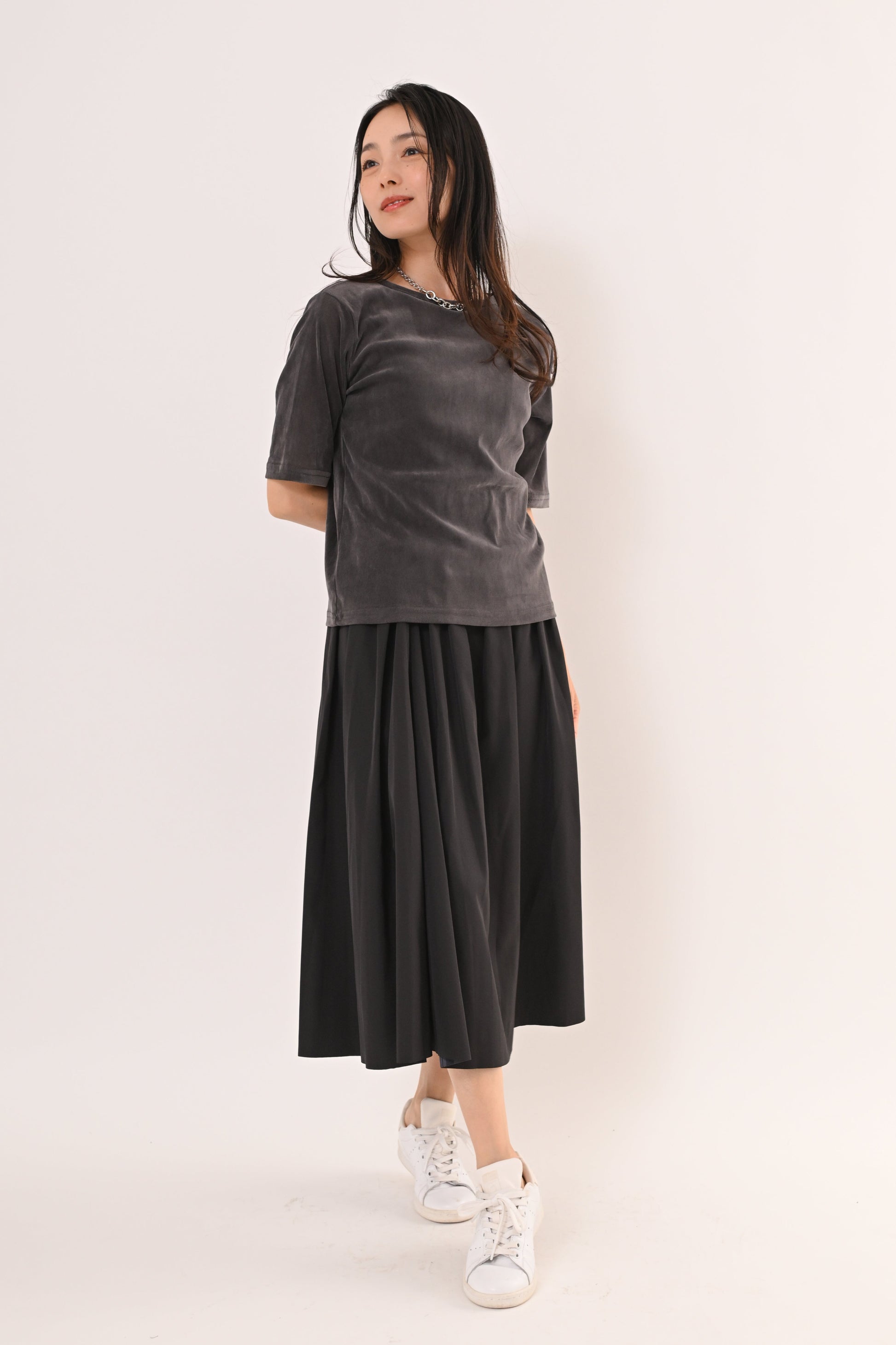 ハリのある素材で、裾にかけて広がる程よいボリュームのフレアラインが、