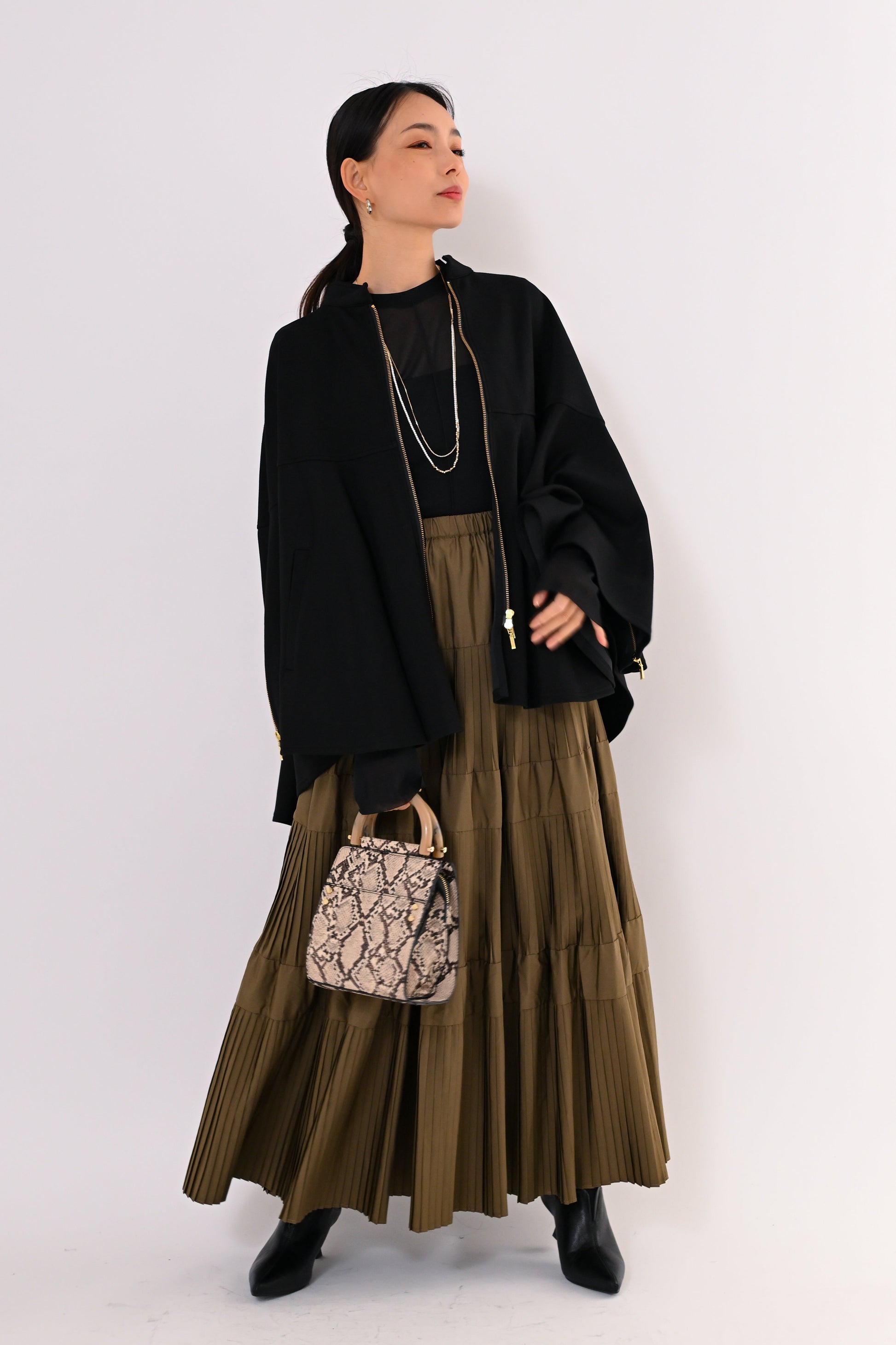 袖口にあしらったジップディテールがモードなアクセントとなり、甘さを抑えた大人のバランスを演出。