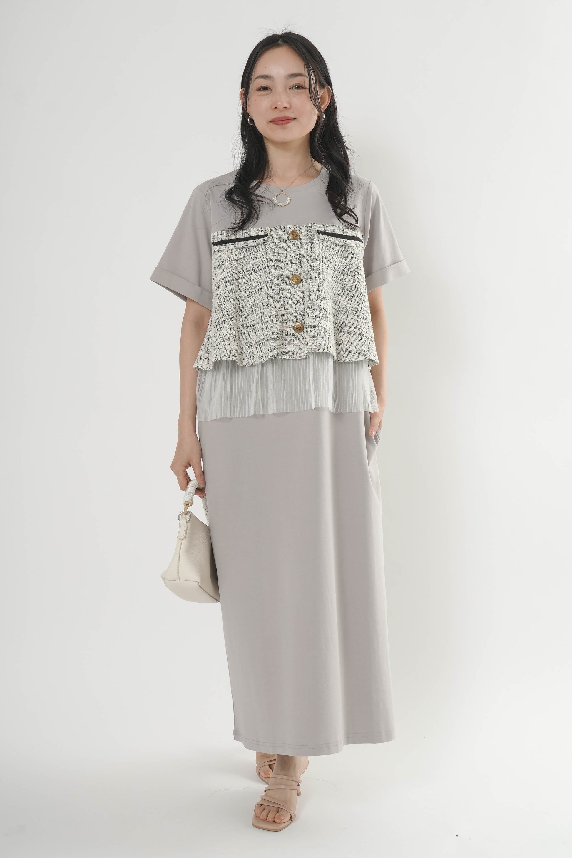 ・胸元のツイード切り替えとゴールドボタンがポイント