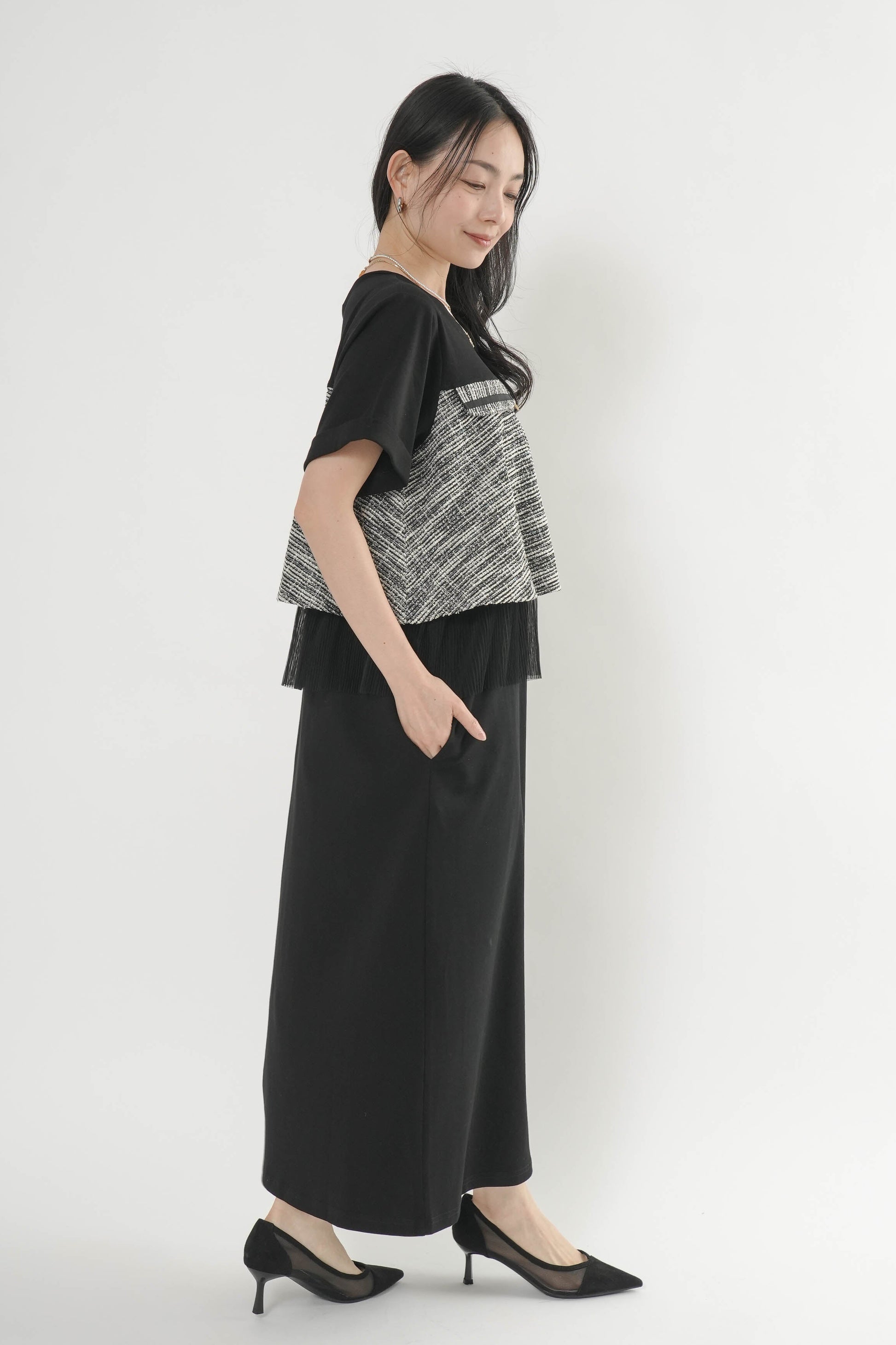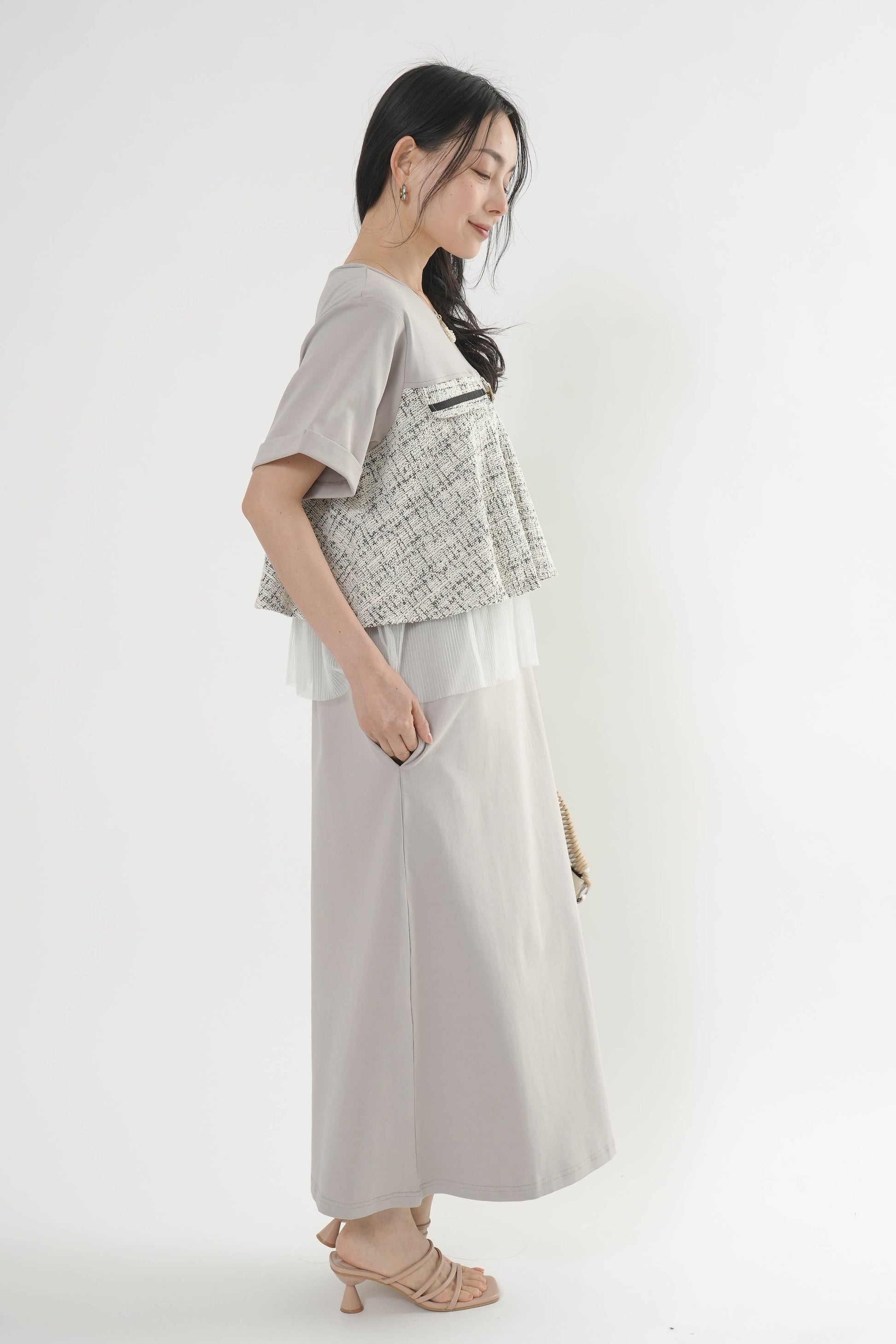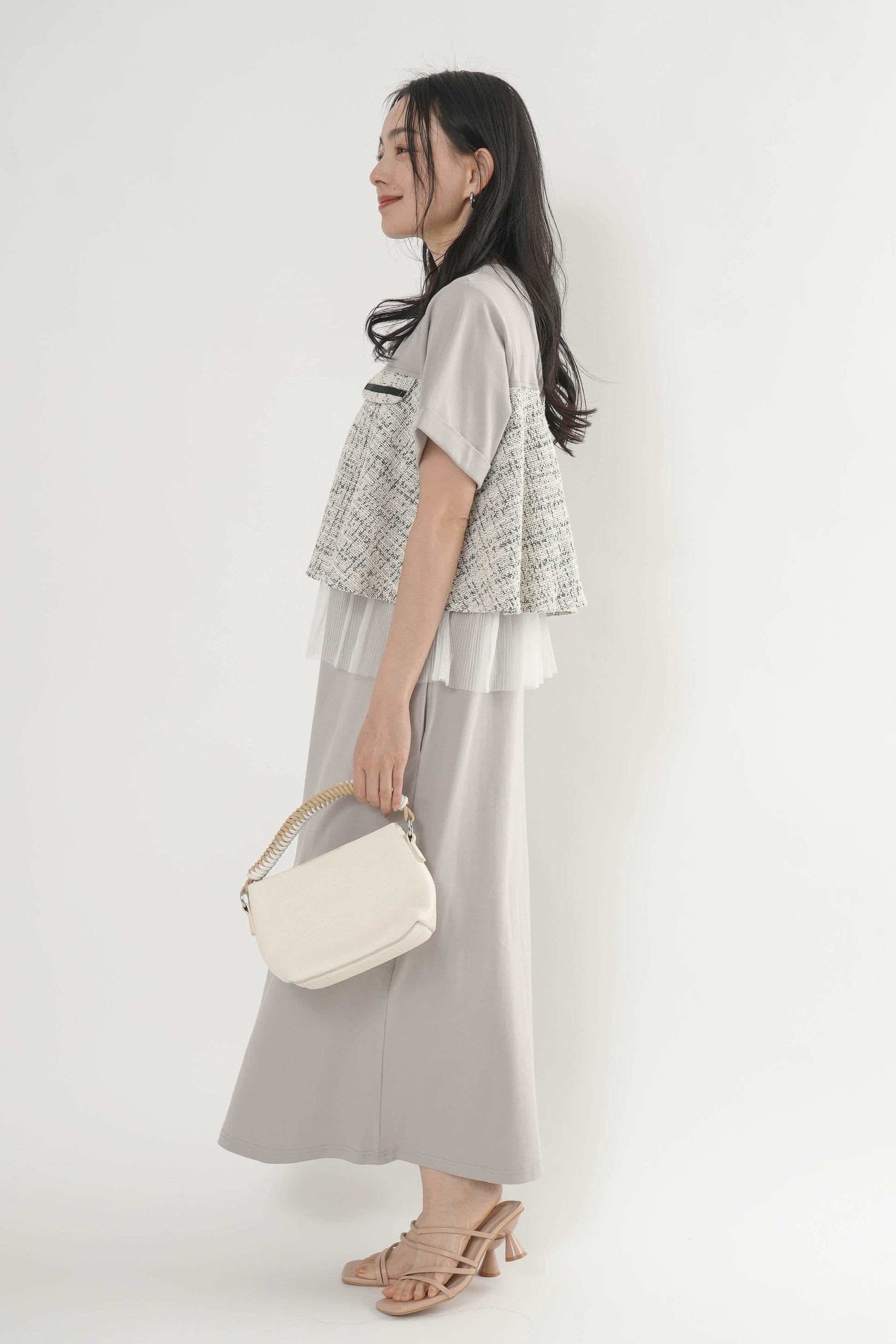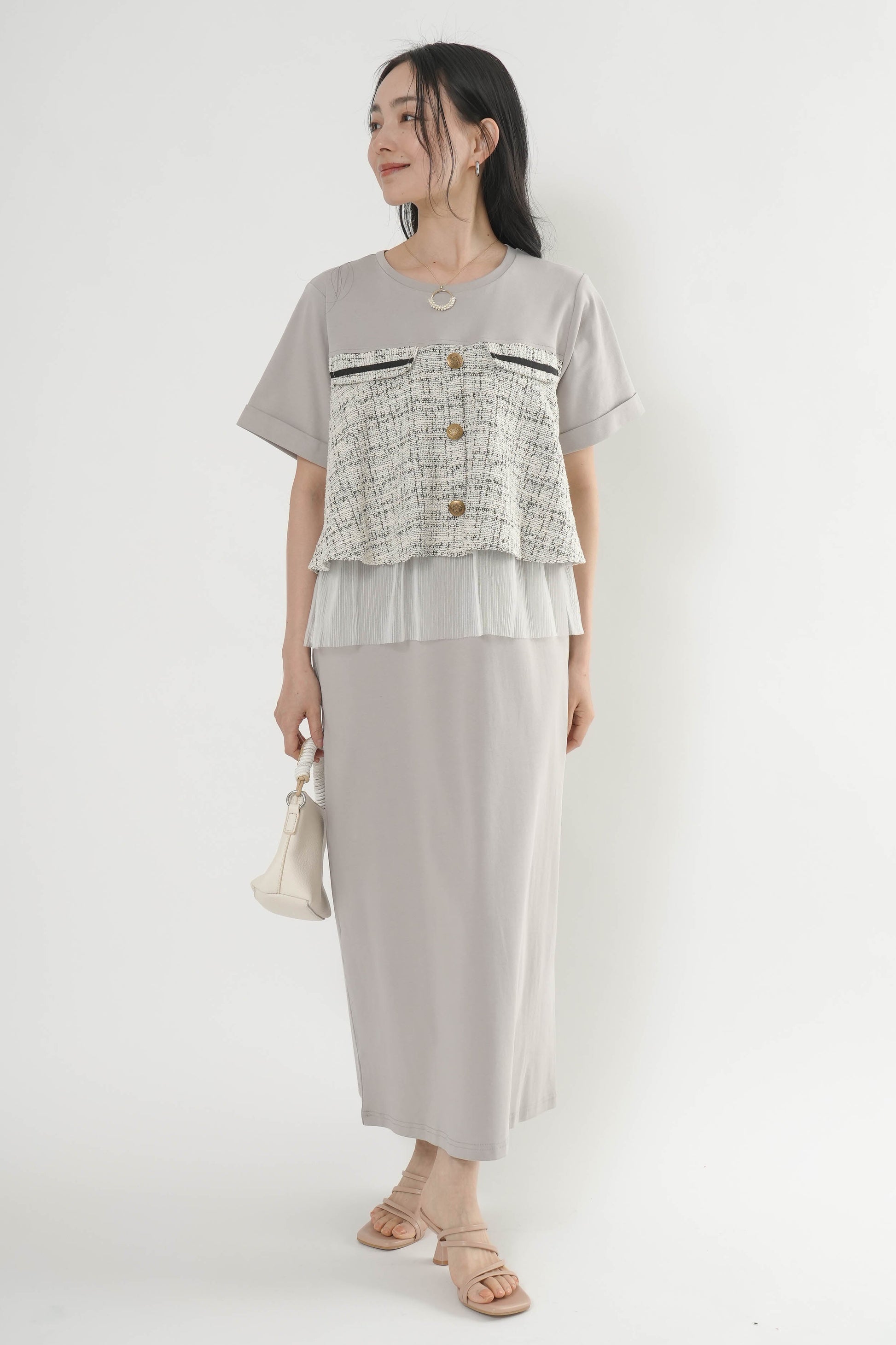 ・カットソー×ツイードの異素材コンビデザイン