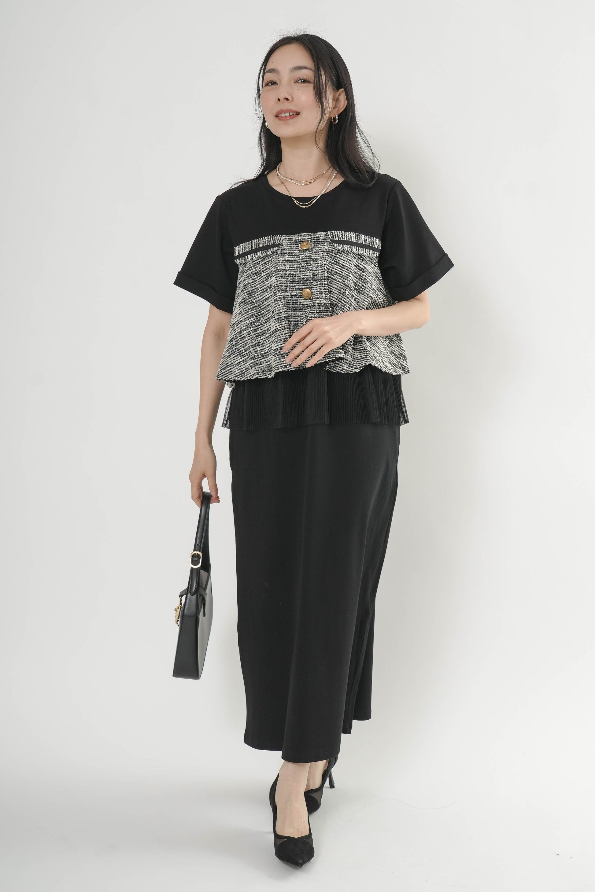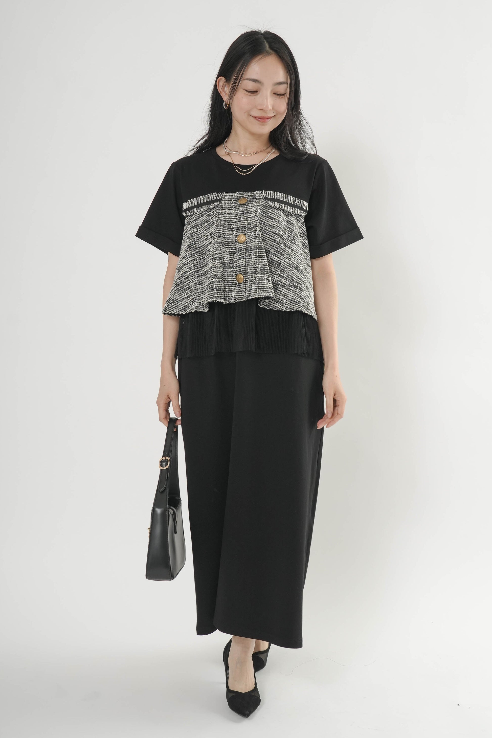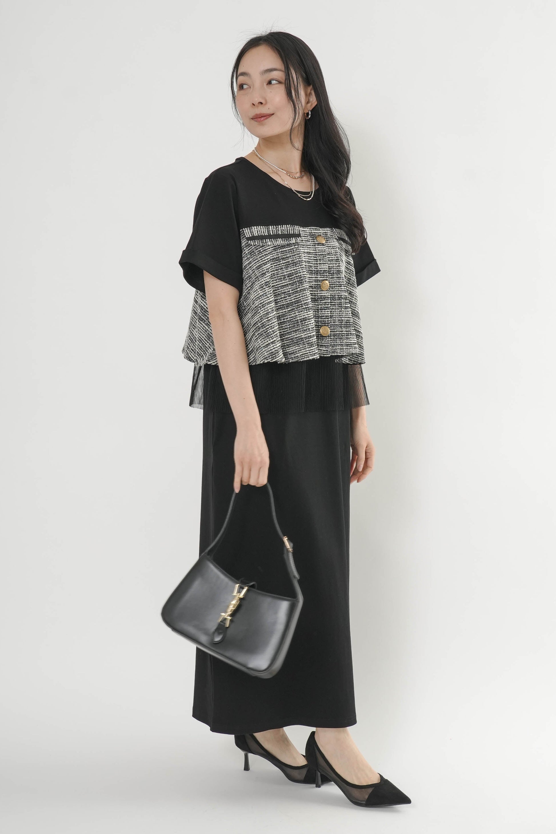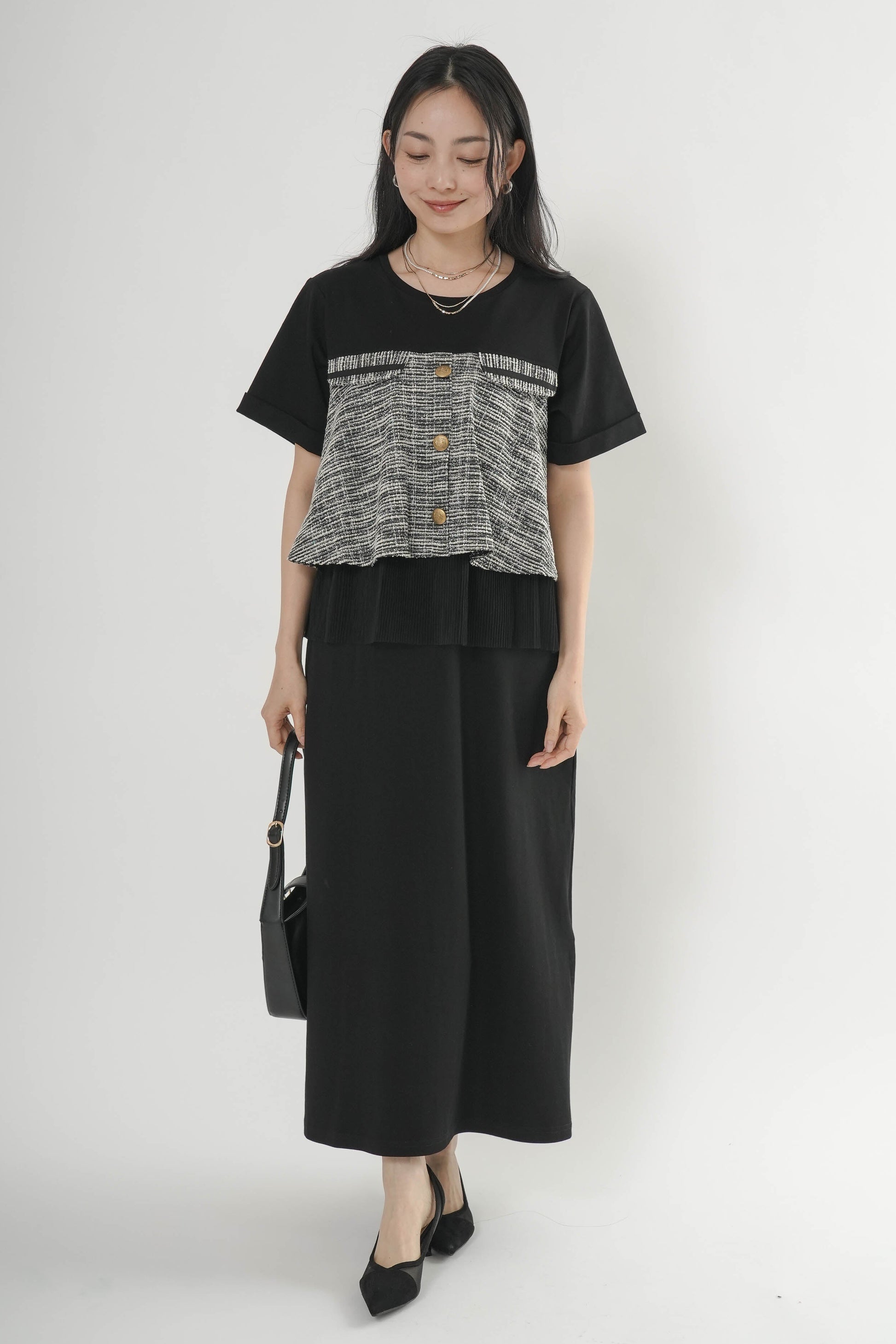 ・胸元のツイード切り替えとゴールドボタンがポイント