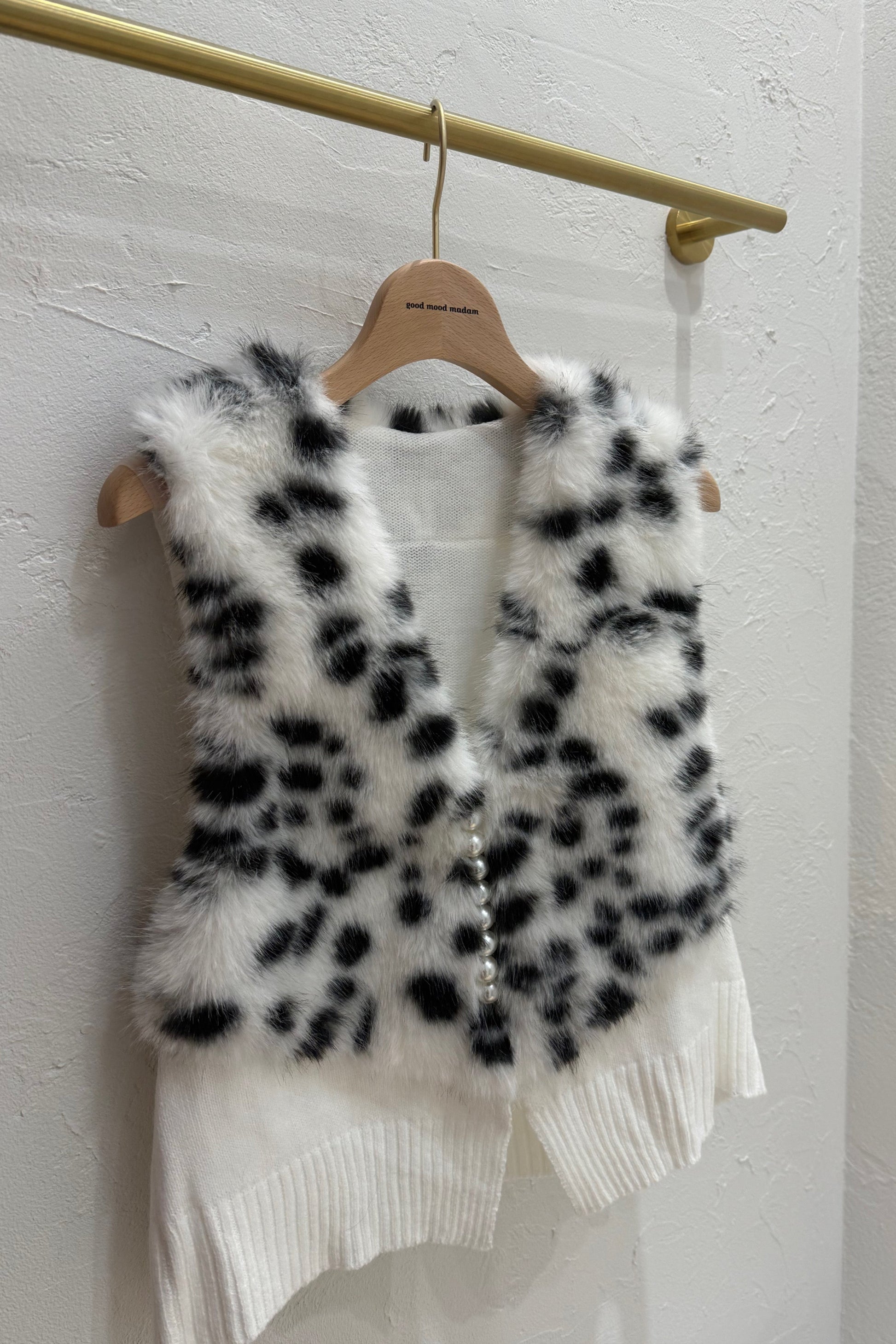 ふんわりとした毛足の長いフェイクファーとニットの異素材コンビが目を惹き、高級感を感じるベスト。