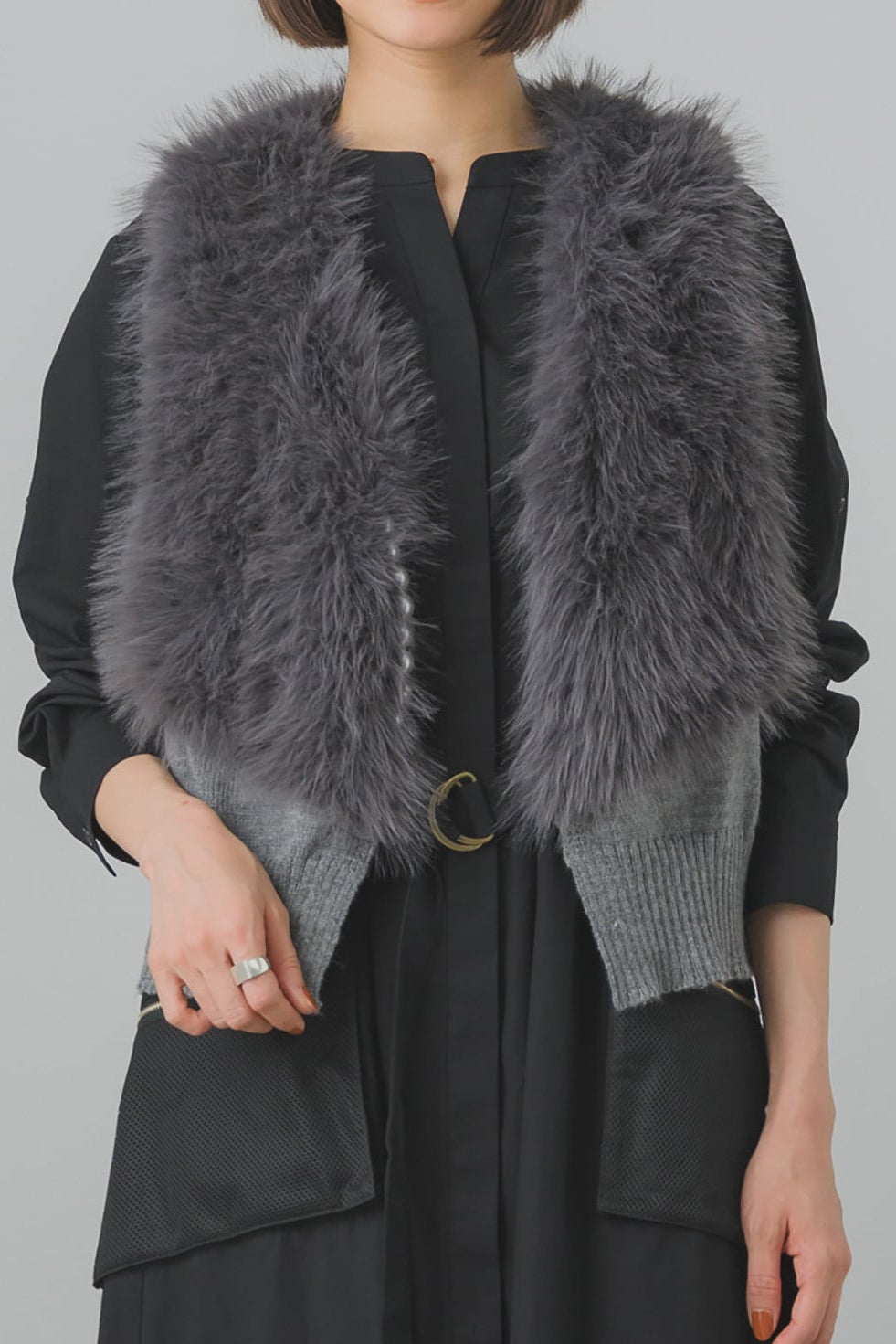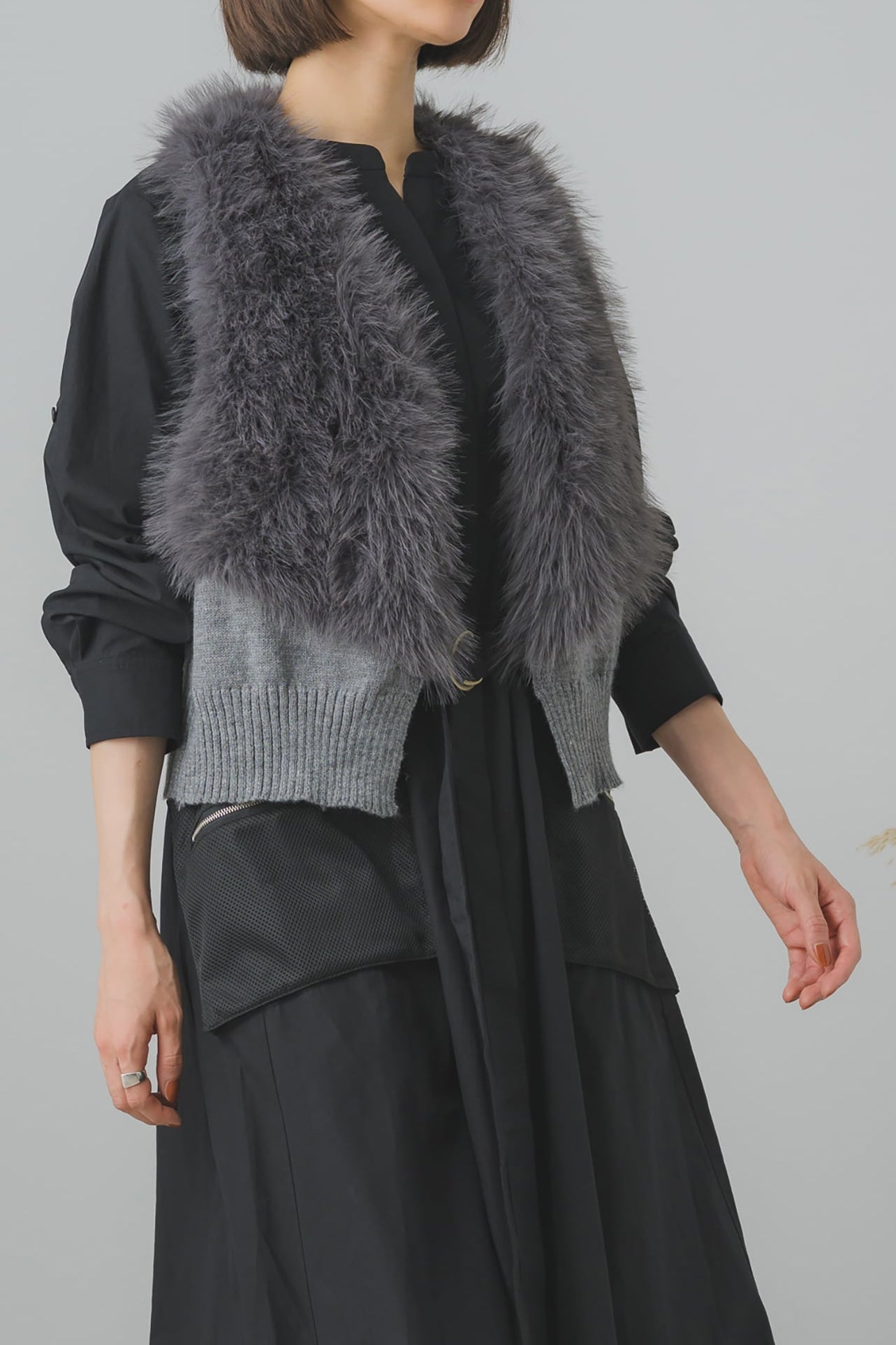 商品ディティールとしては、ファーとニットのバランスが秀逸で、特に裾のラインが中心に向けて斜めにカットされているのが計算されたデザインだなぁと感動。直線にカットするより断然エレガントだしスタイルも良く見えます。ファーもふわふわでクオリティー◎ それと、背中の部分は首元だけがファーで全体的にはニットデザインなので、アウターを着る季節でも着膨れせず着こなせます。