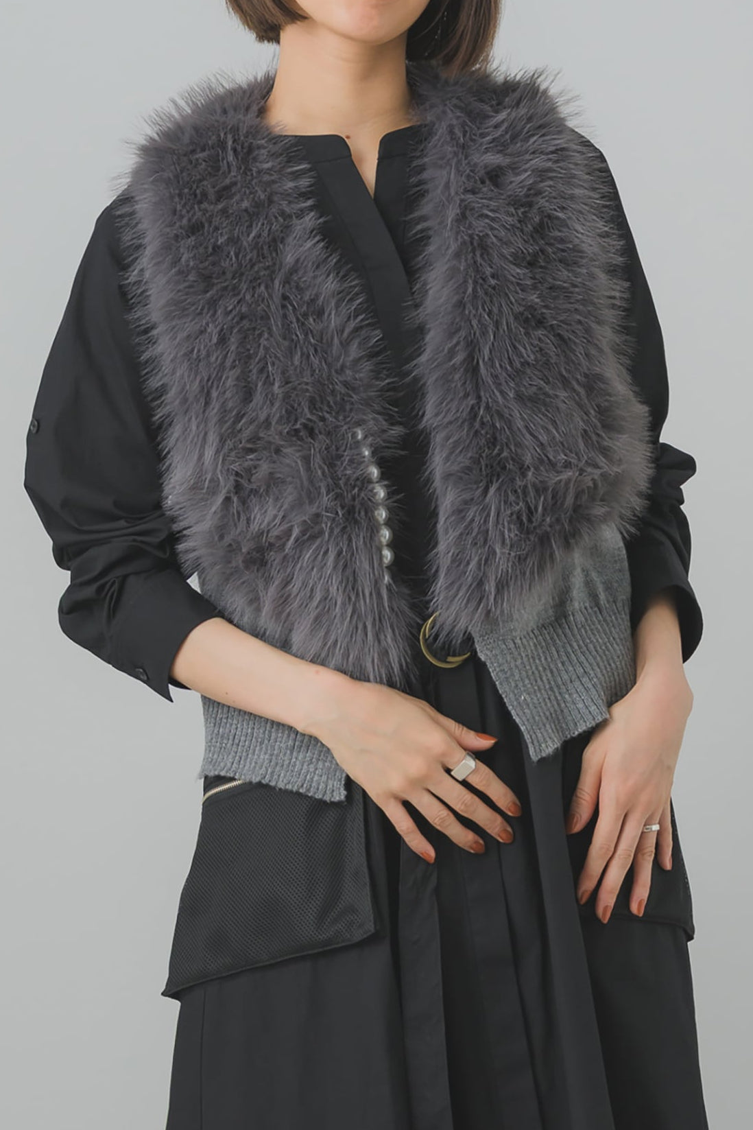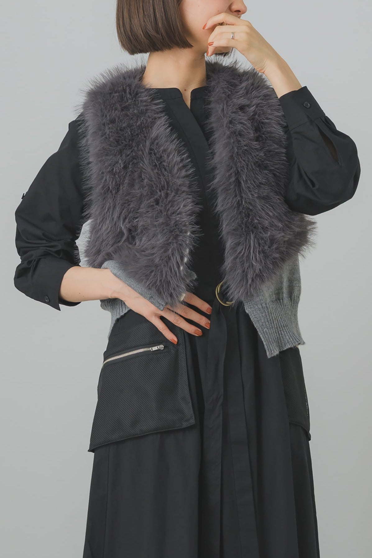 ボリュームのあるファーが顔まわりを華やかに演出しつつ、コンパクトな丈とフィット感のあるニットが全体を引き締め、バランスのとれたシルエットを実現します。