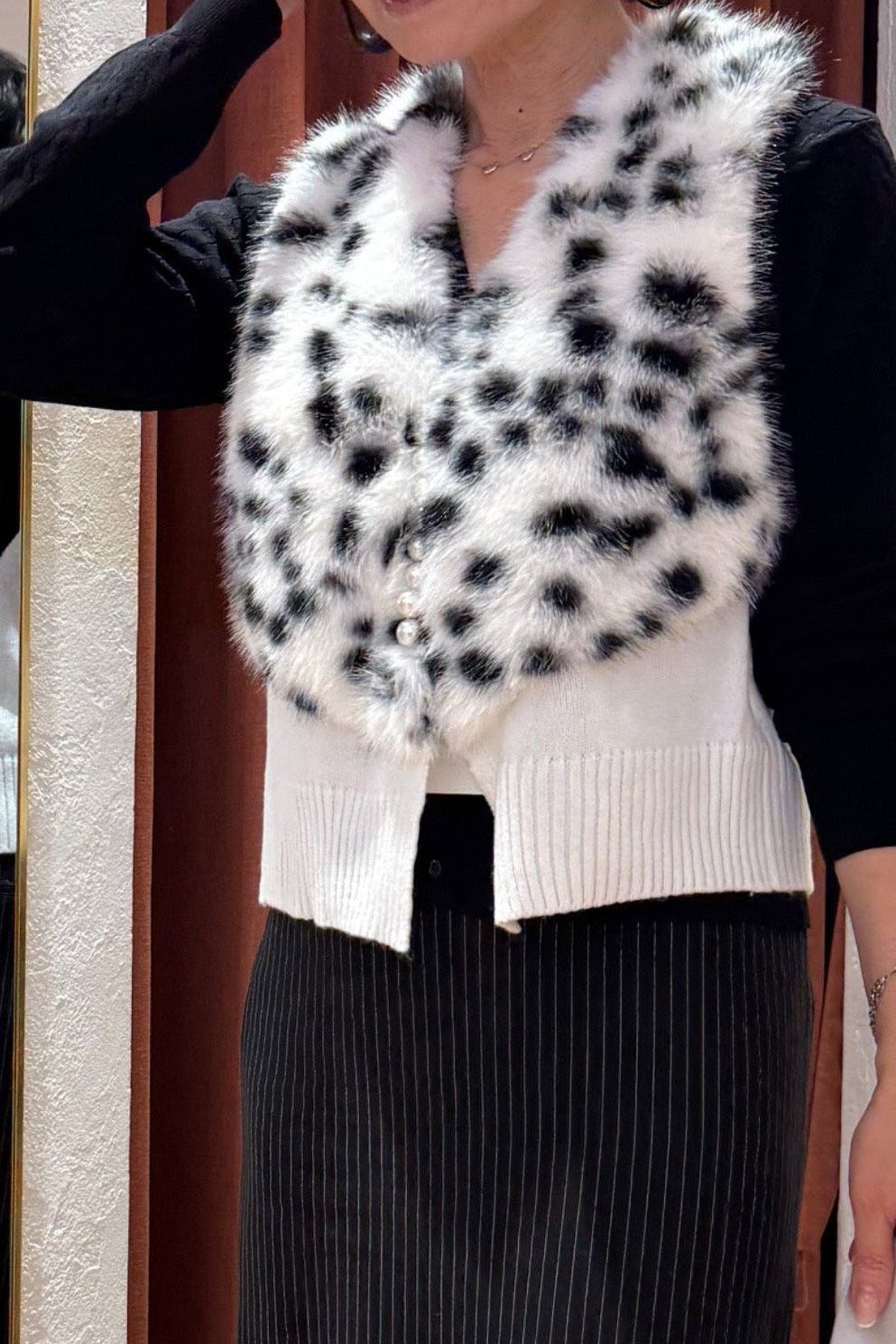 ダルメシアン柄は白黒配色なので、意外とどんな色にも合わせやすい。グレー系、ベージュ系、ペールブルーとも相性がよく、シンプルなニットやワンピースに羽織るだけでエレガントで一気にオシャレ感がUPします。