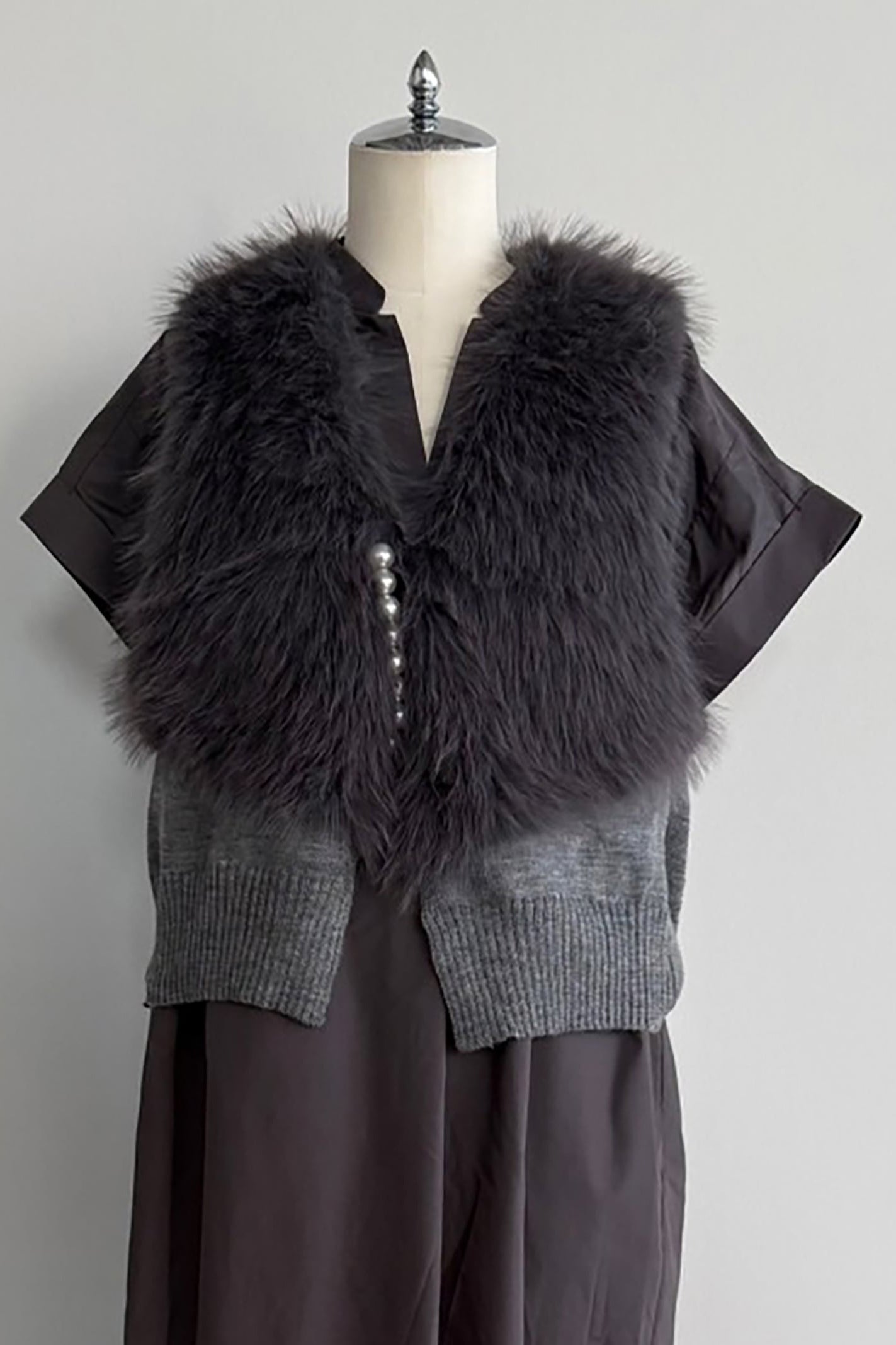 ふんわりとした毛足の長いフェイクファーとニットの異素材コンビが目を惹き、高級感を感じるベスト。