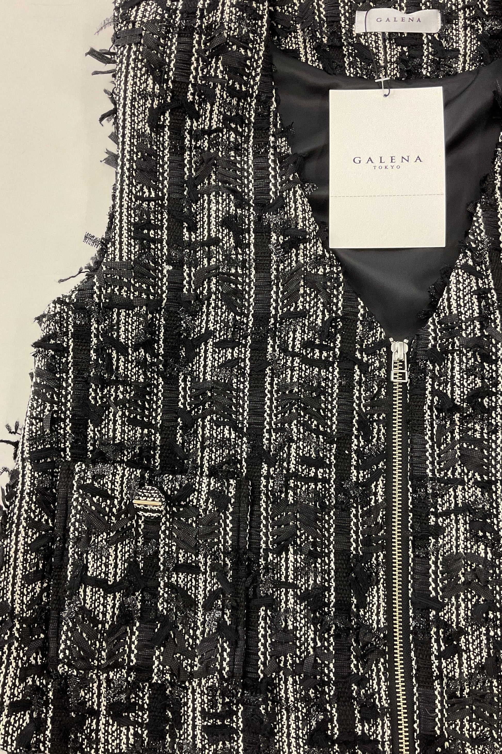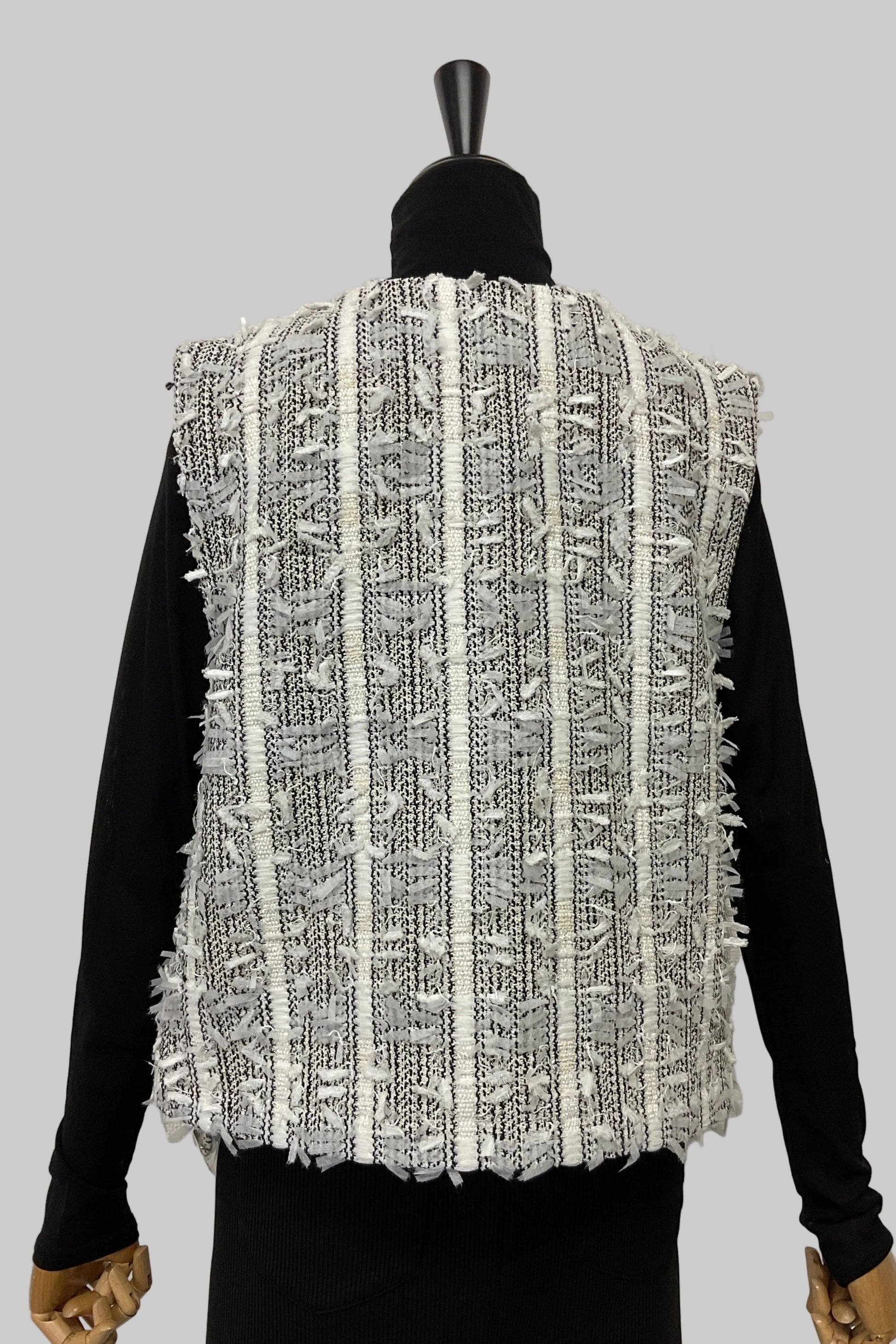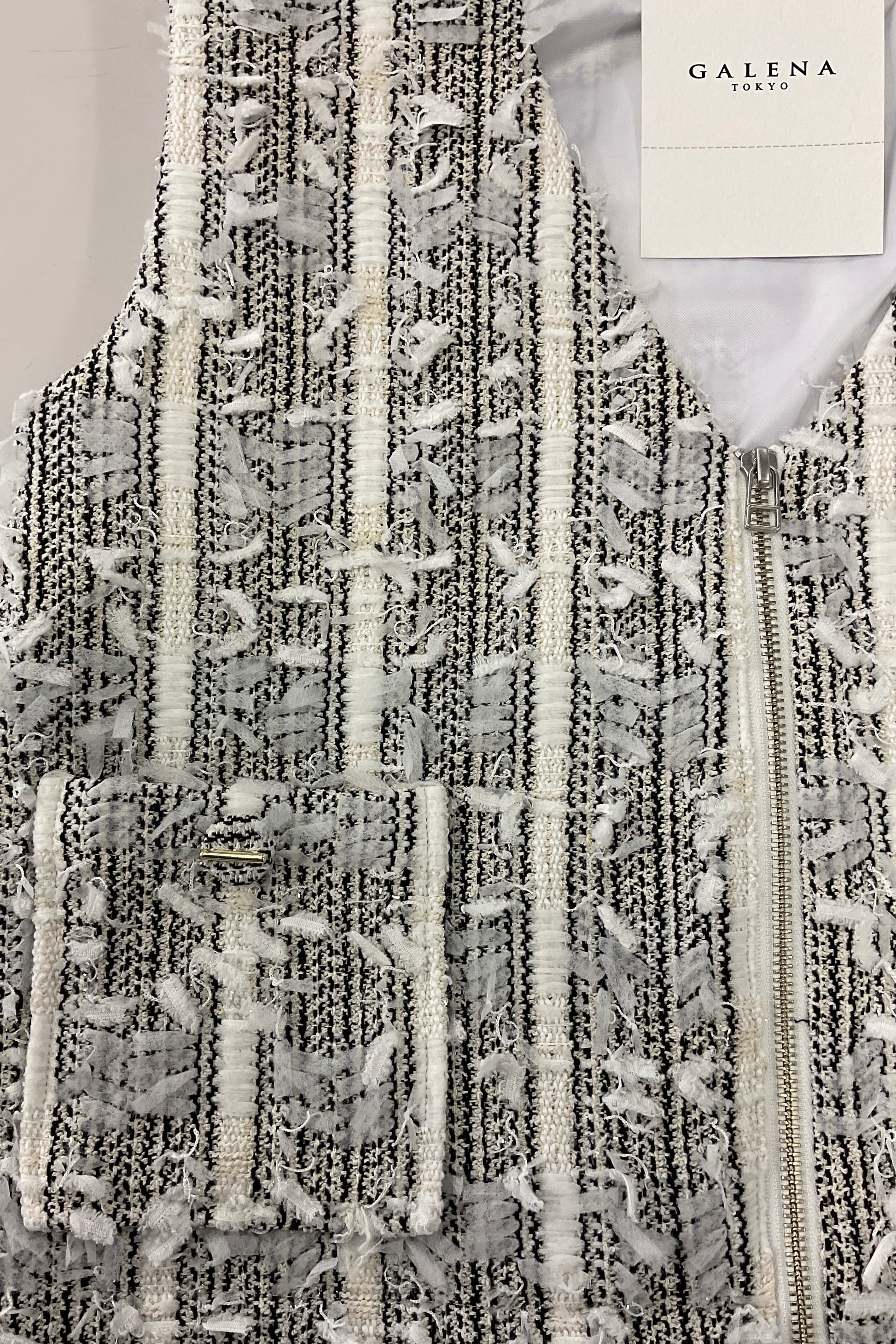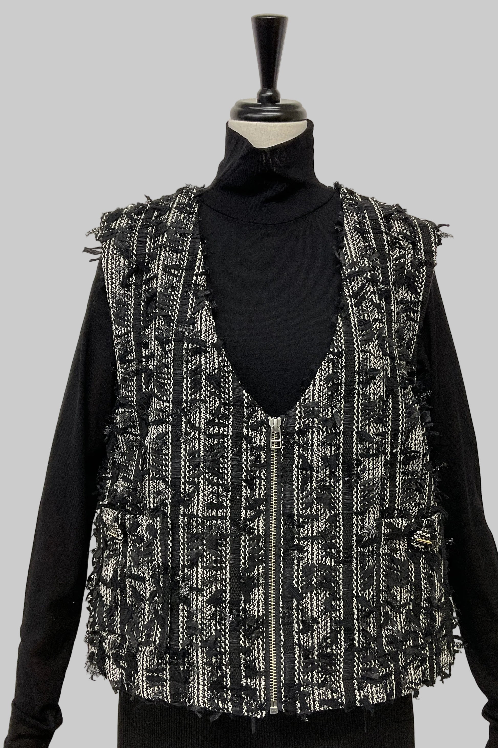 表情豊かなツイード素材が目を惹く、クラシカルな雰囲気漂うジップアップジレ。凹凸感のある織りとフリンジディテールが、シンプルなスタイリングにさりげない華やかさをプラスします。