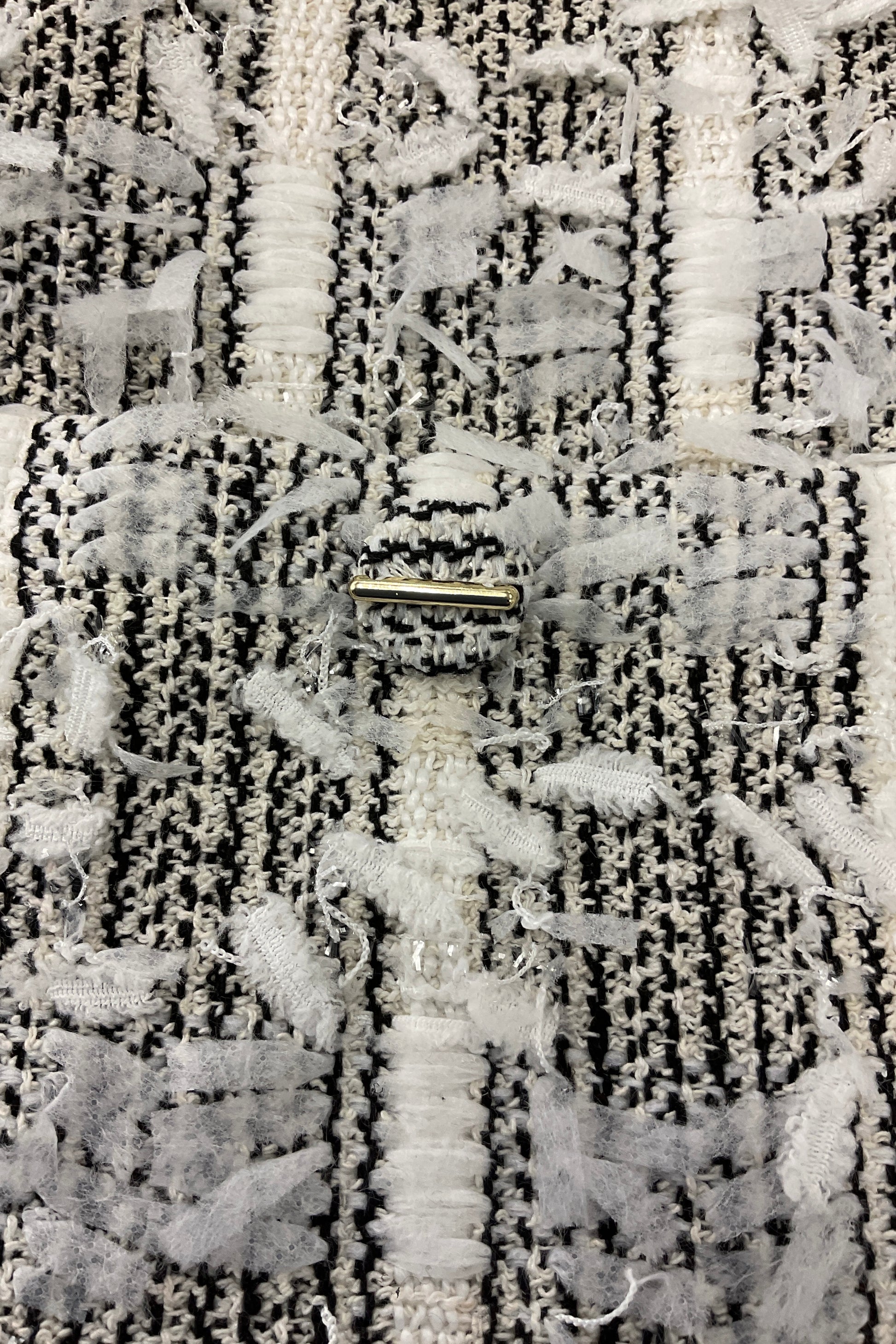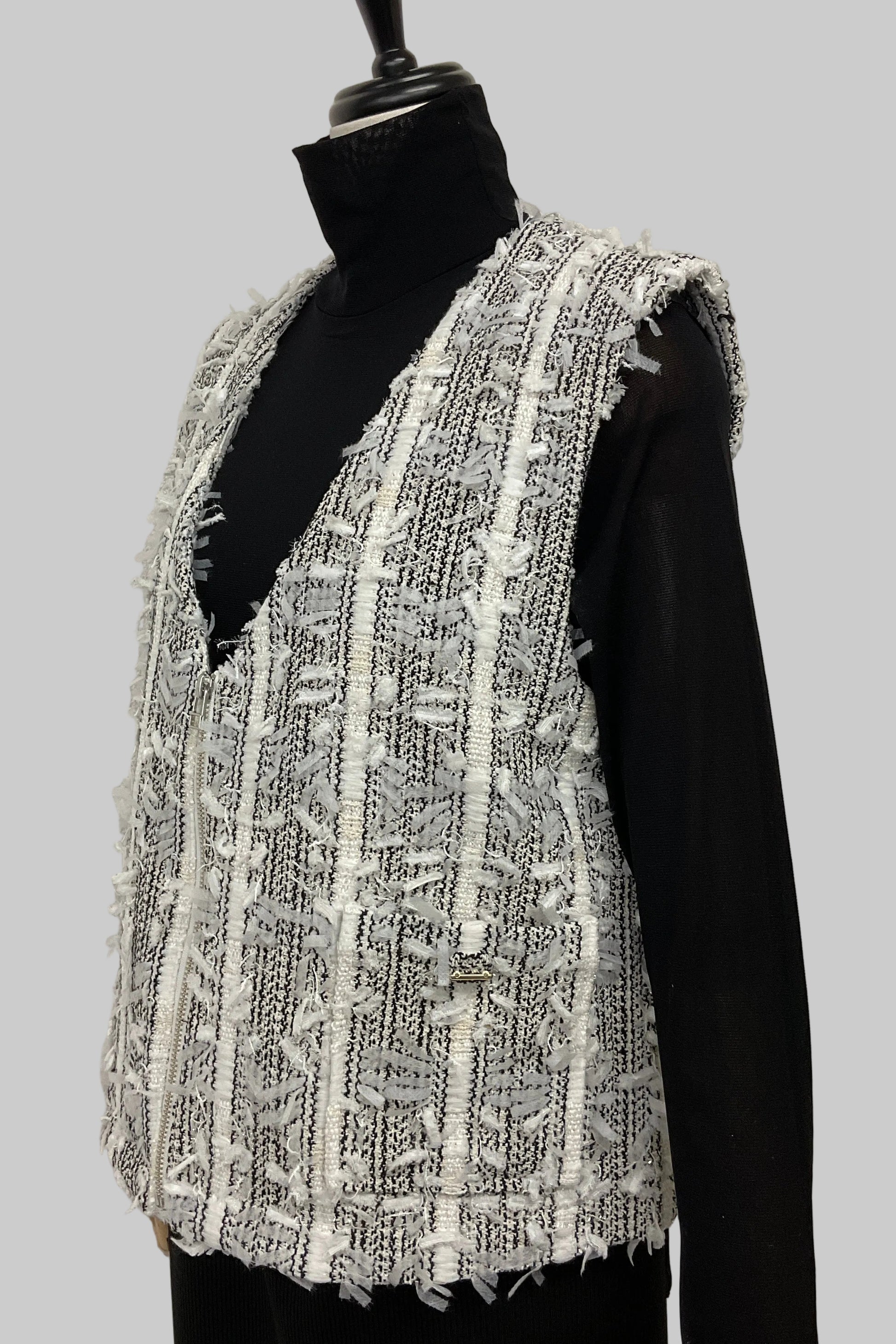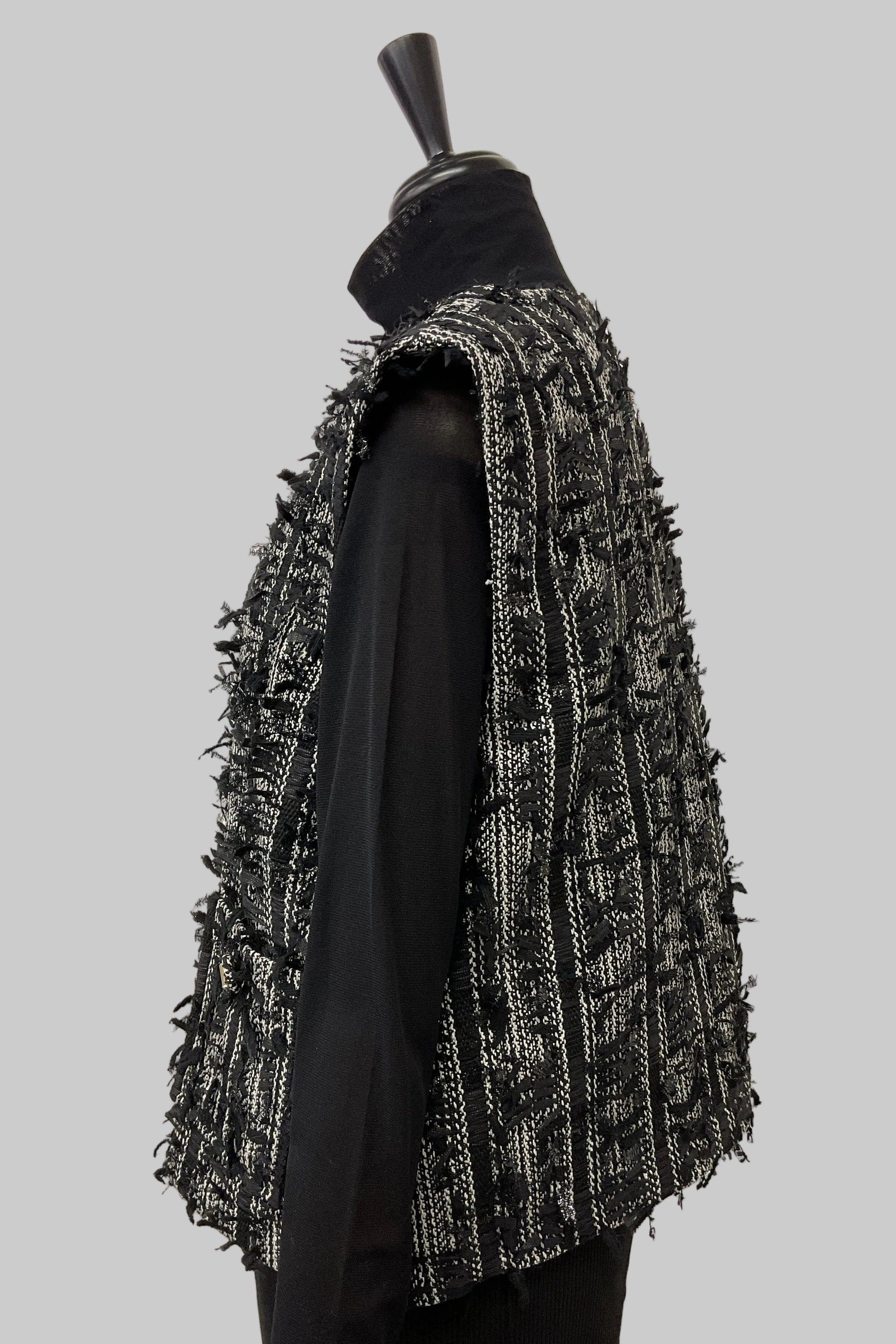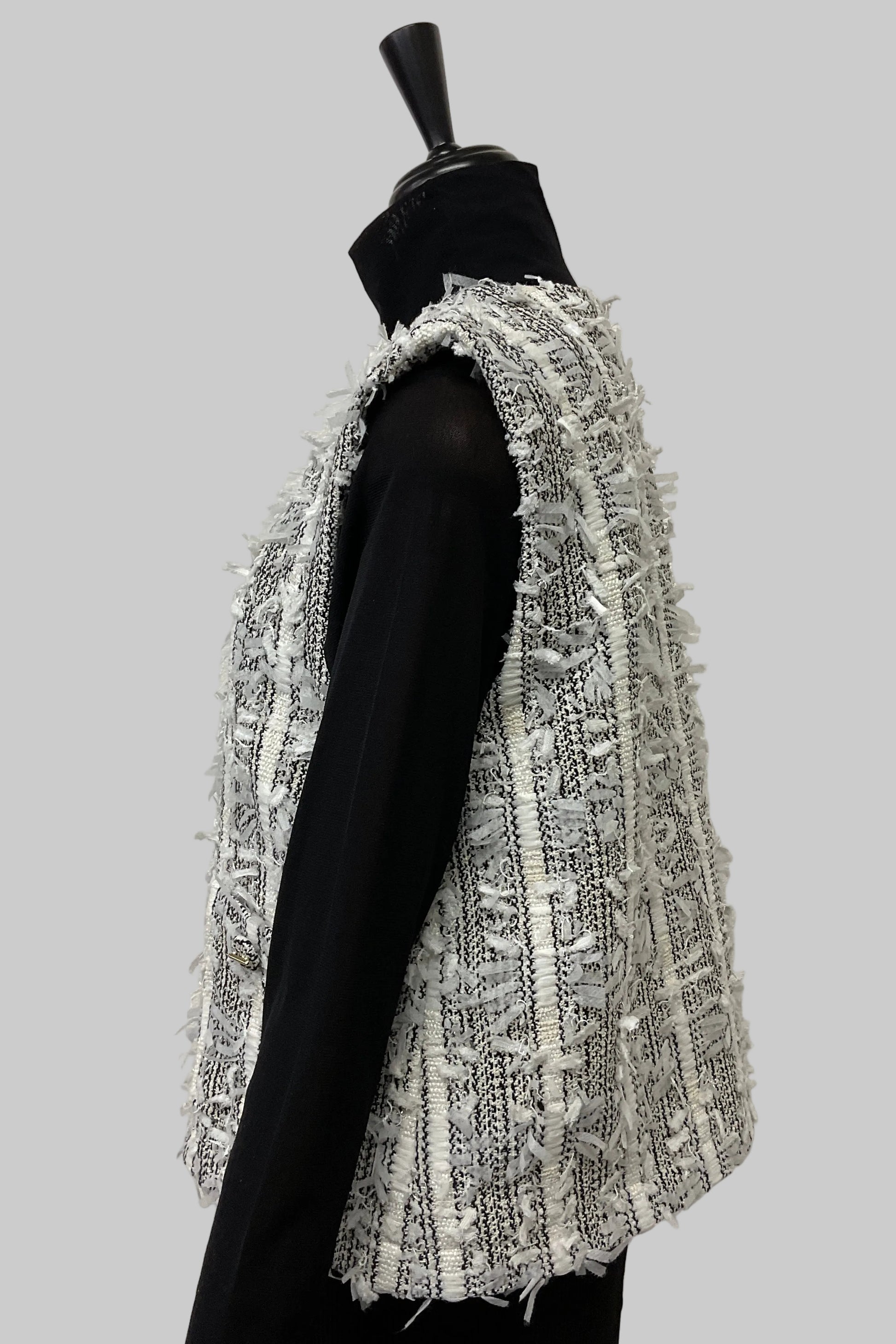 表情豊かなツイード素材が目を惹く、クラシカルな雰囲気漂うジップアップジレ。凹凸感のある織りとフリンジディテールが、シンプルなスタイリングにさりげない華やかさをプラスします。
