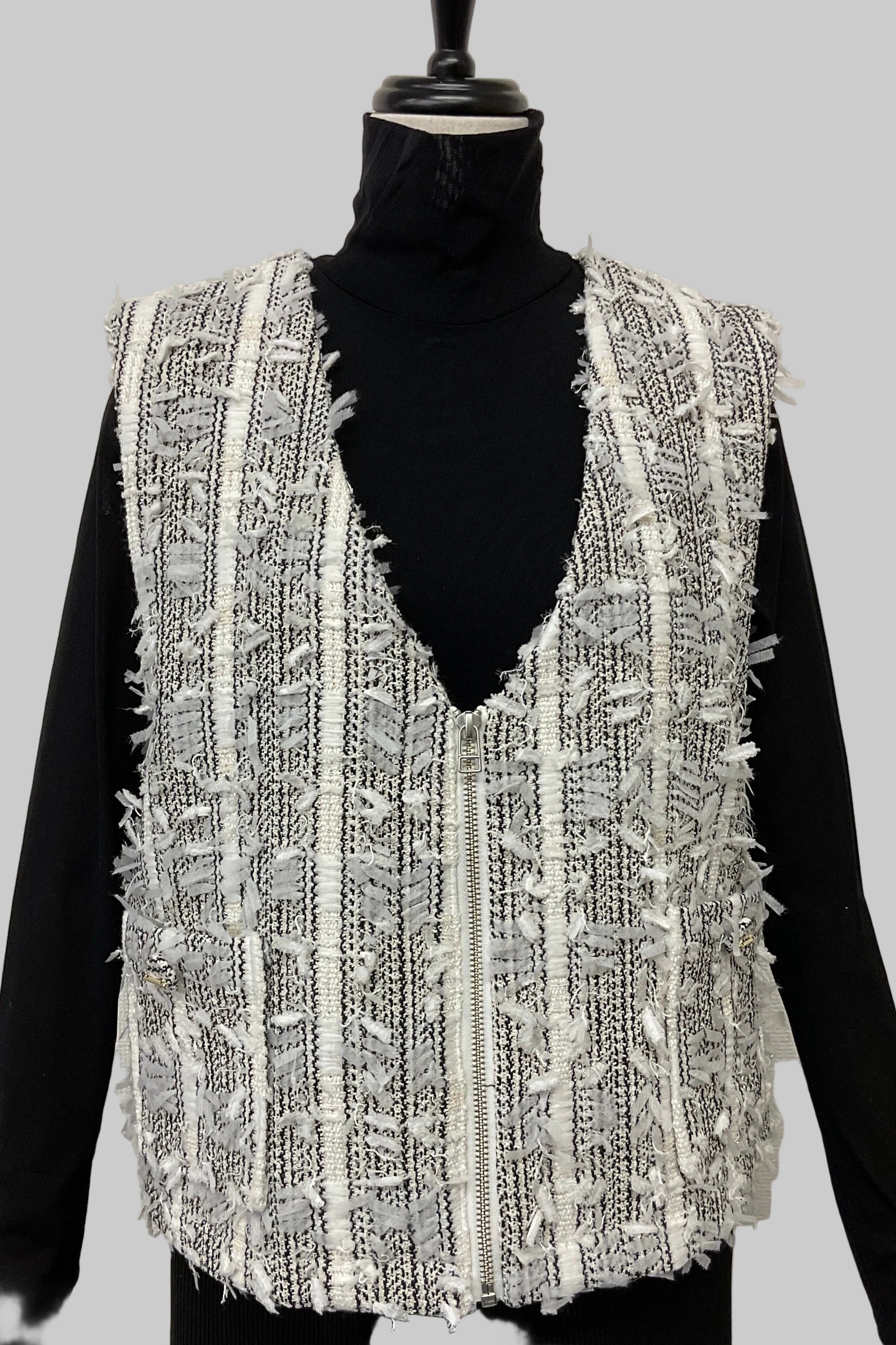 表情豊かなツイード素材が目を惹く、クラシカルな雰囲気漂うジップアップジレ。凹凸感のある織りとフリンジディテールが、シンプルなスタイリングにさりげない華やかさをプラスします。
