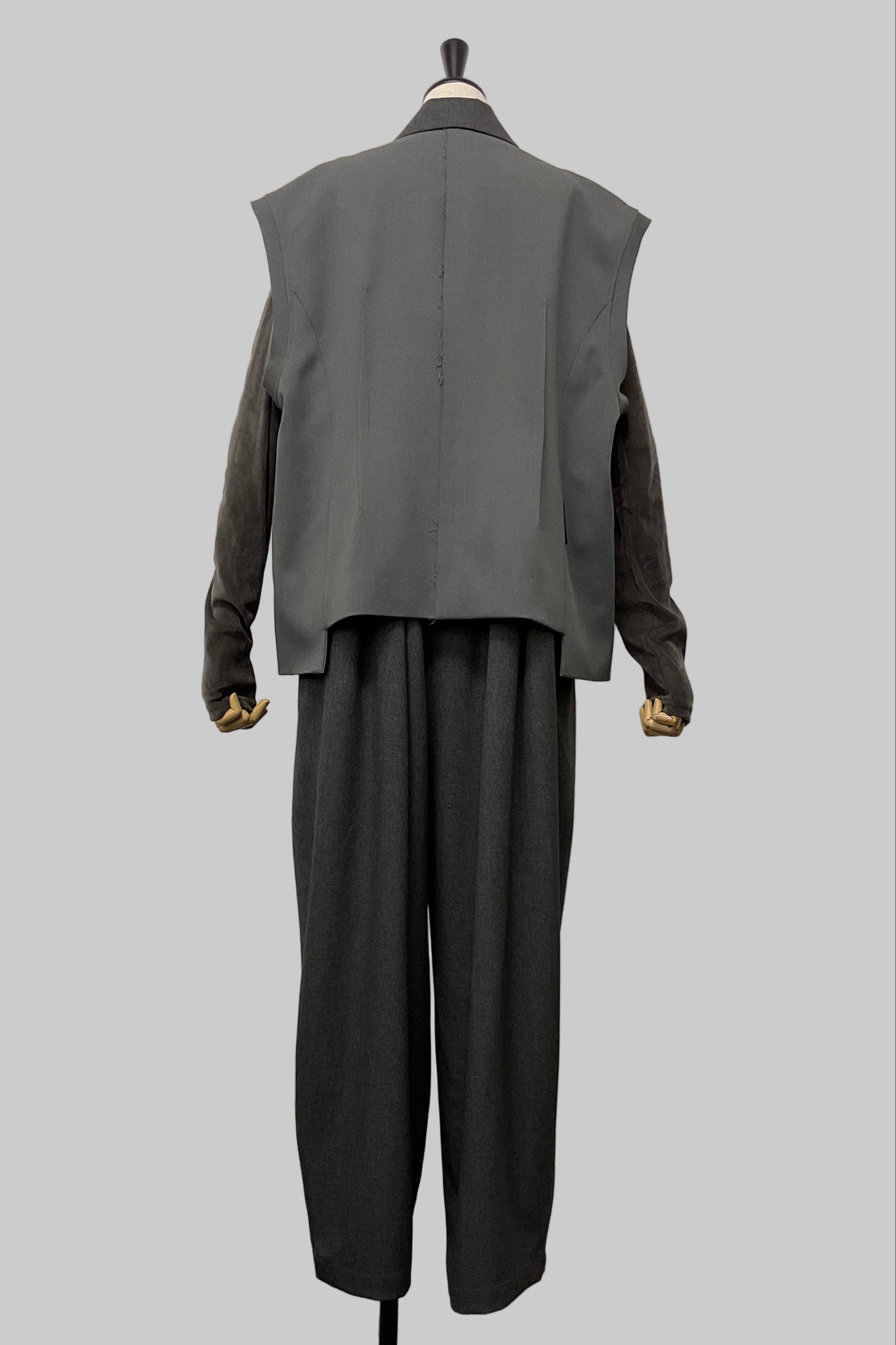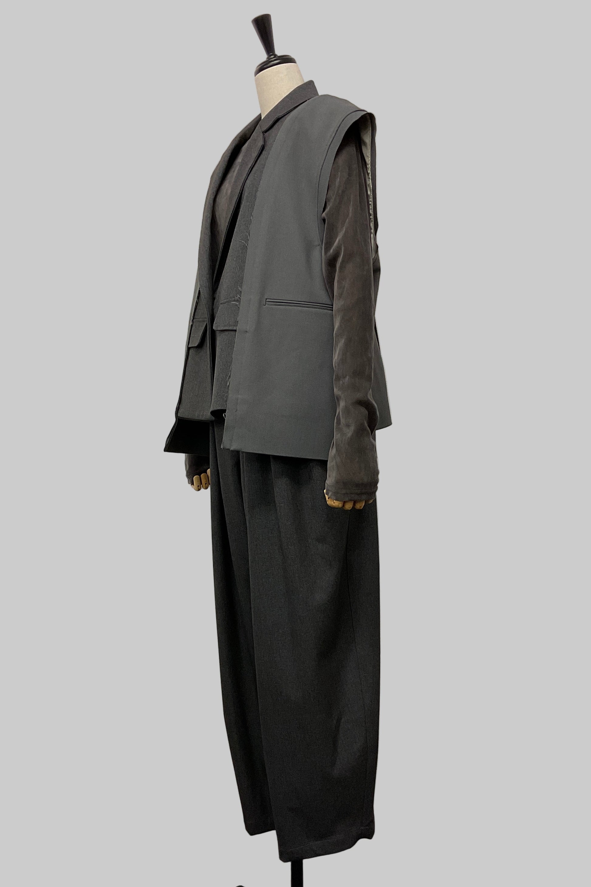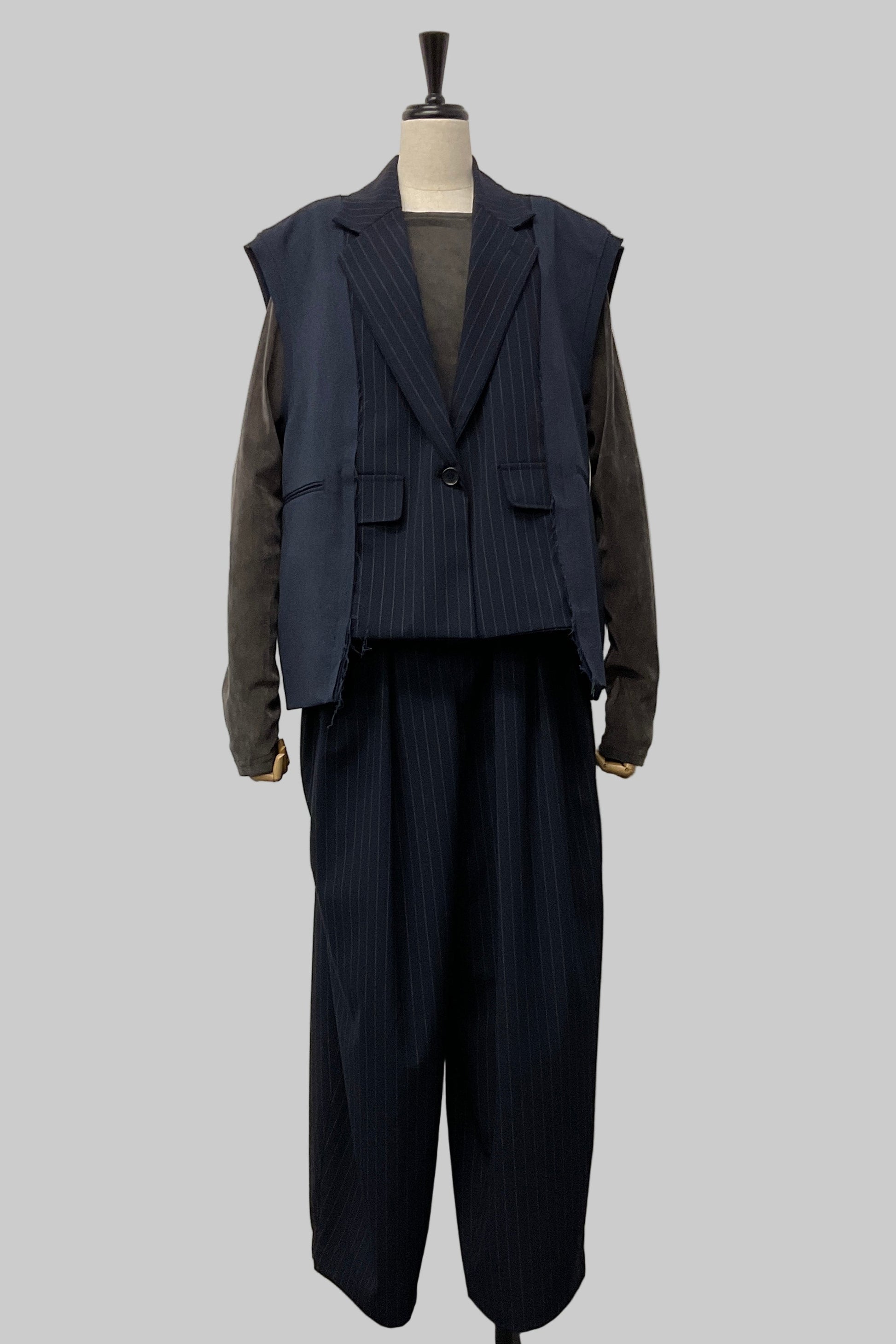 シャープなVネックラインと一つボタンのシンプルなデザインに加え、サイドに切り替えを施し、立体感とモードなアクセントをプラスしました。