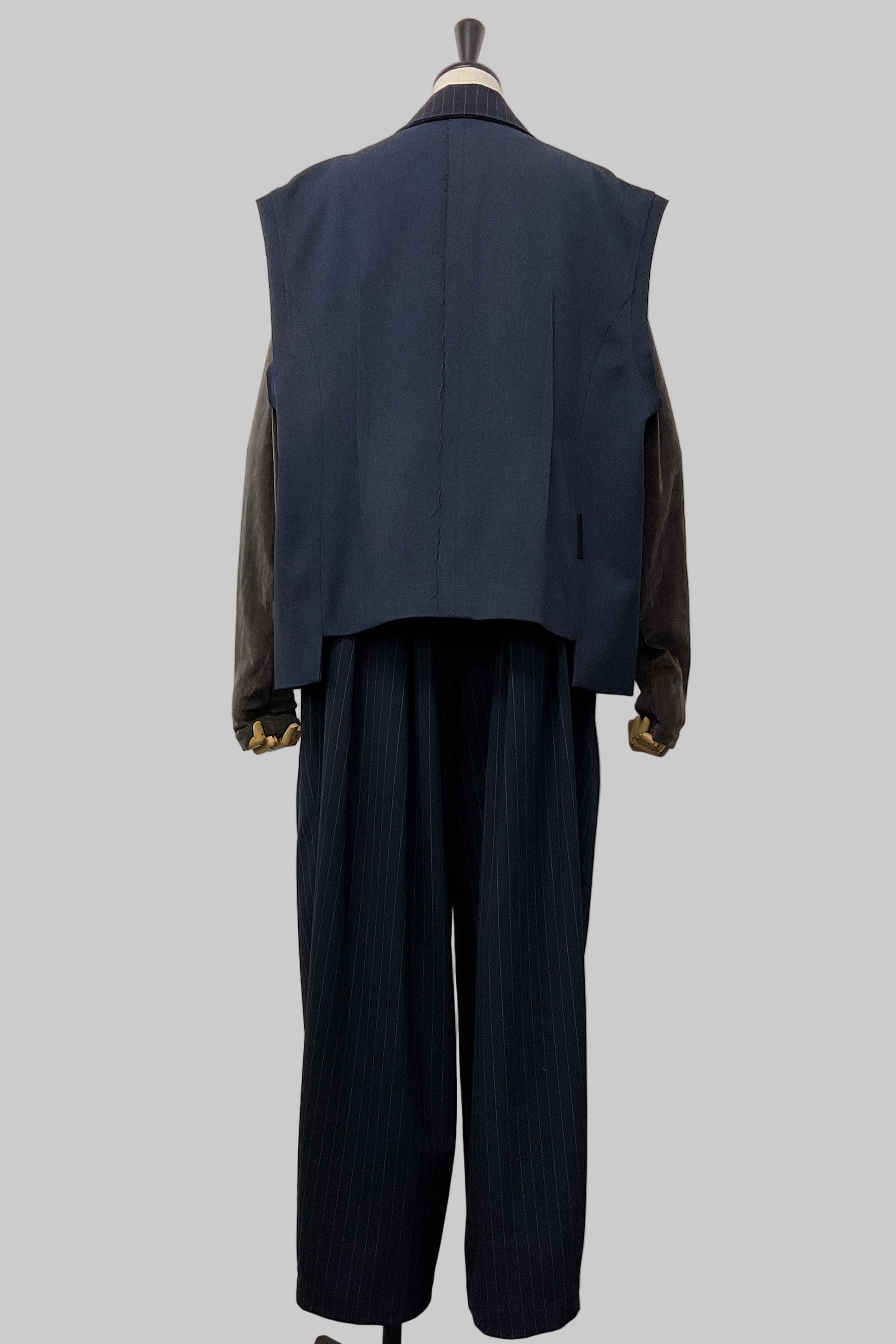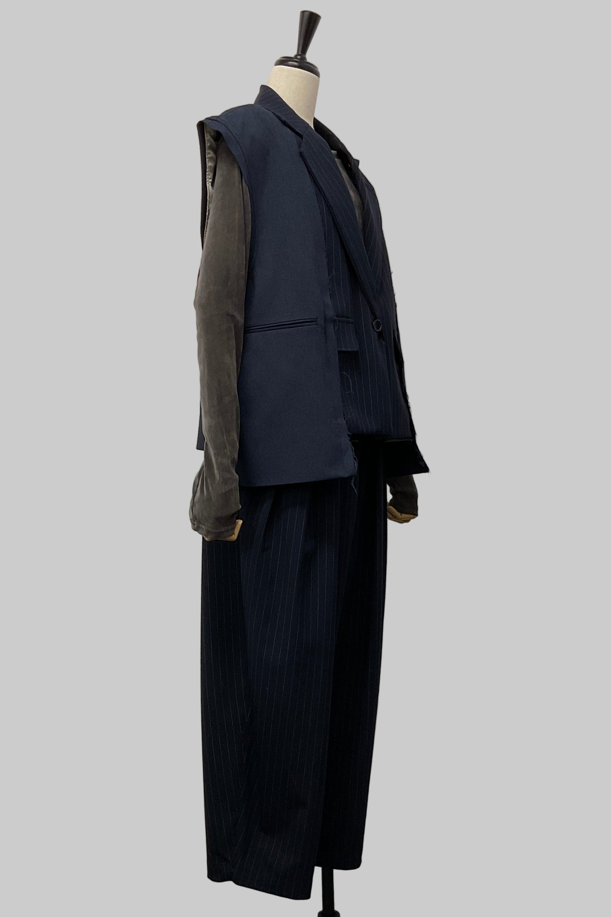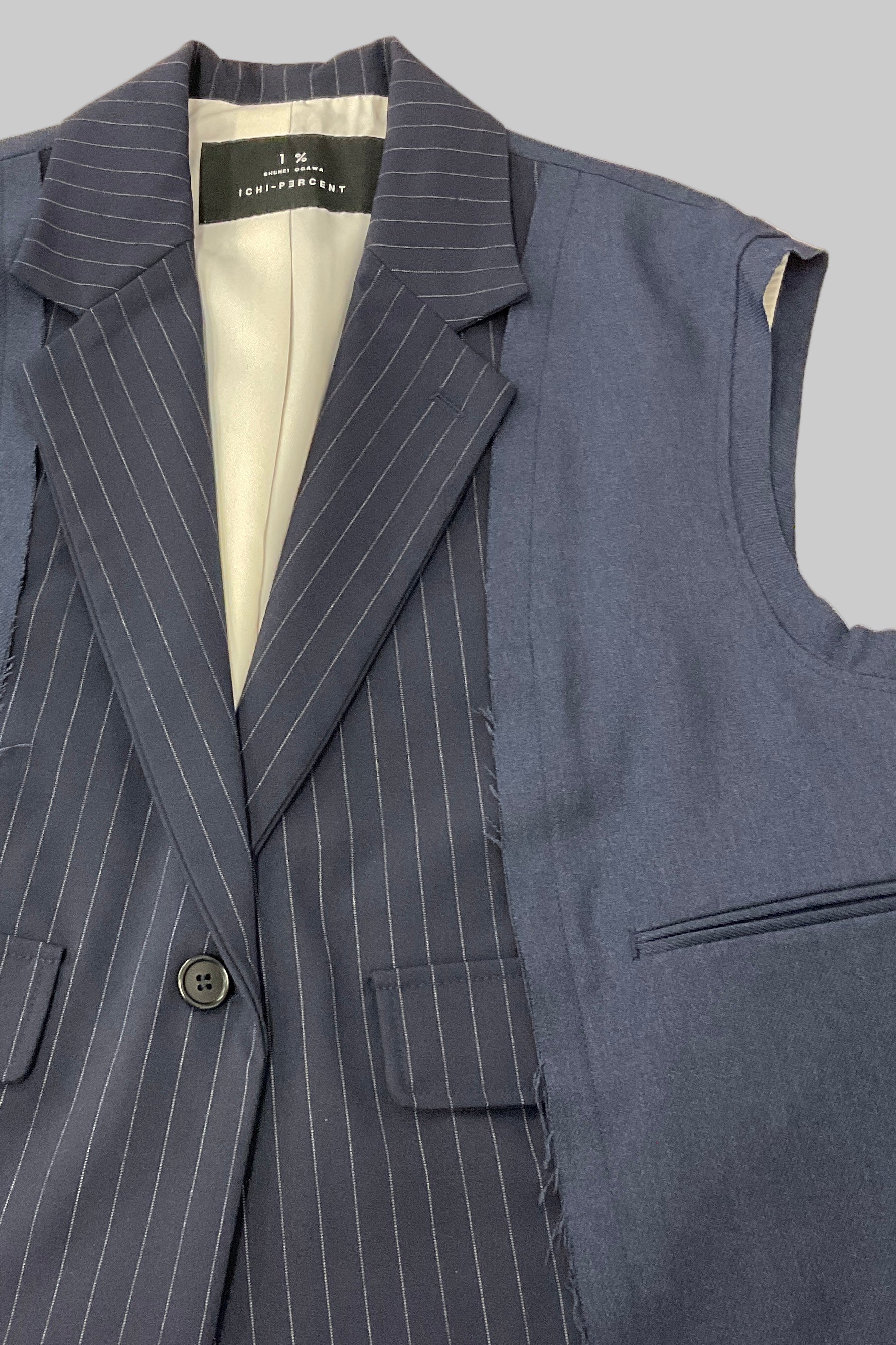 シャープなVネックラインと一つボタンのシンプルなデザインに加え、サイドに切り替えを施し、立体感とモードなアクセントをプラスしました。