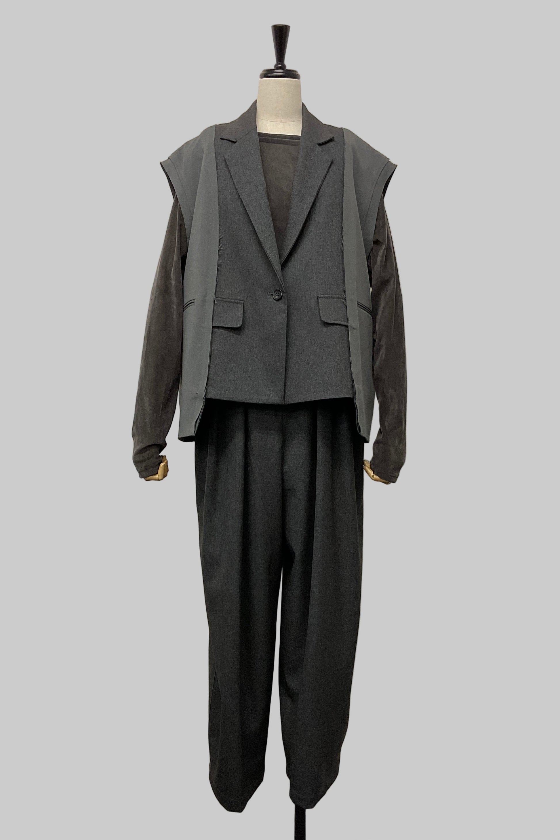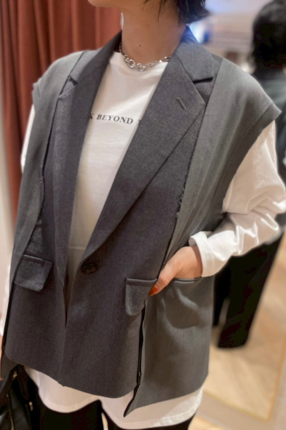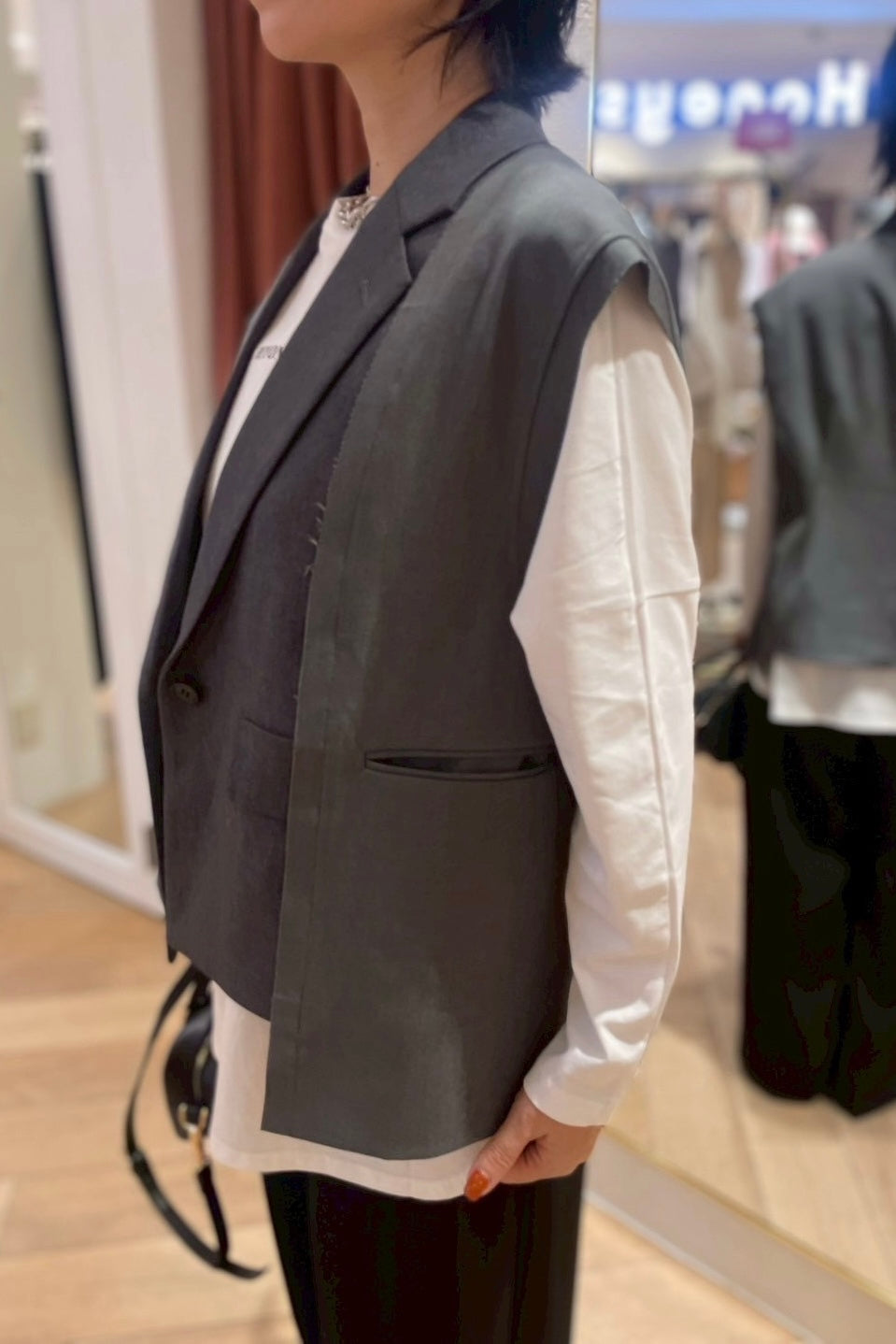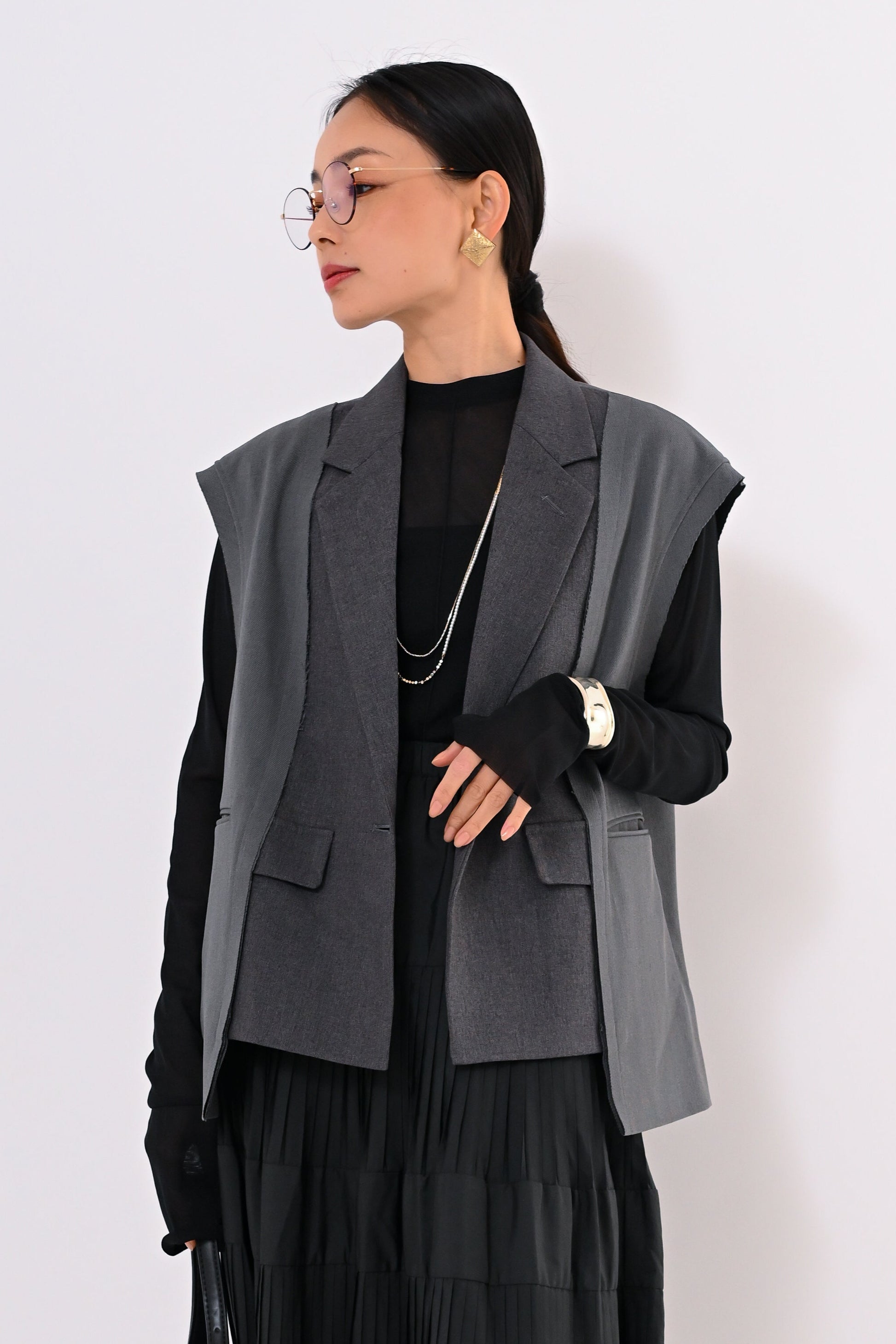 シャープなVネックラインと一つボタンのシンプルなデザインに加え、サイドに切り替えを施し、立体感とモードなアクセントをプラスしました。