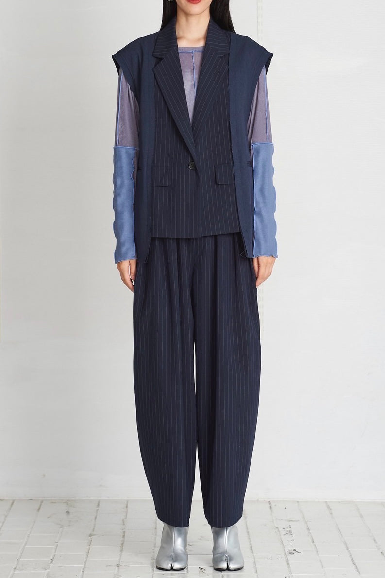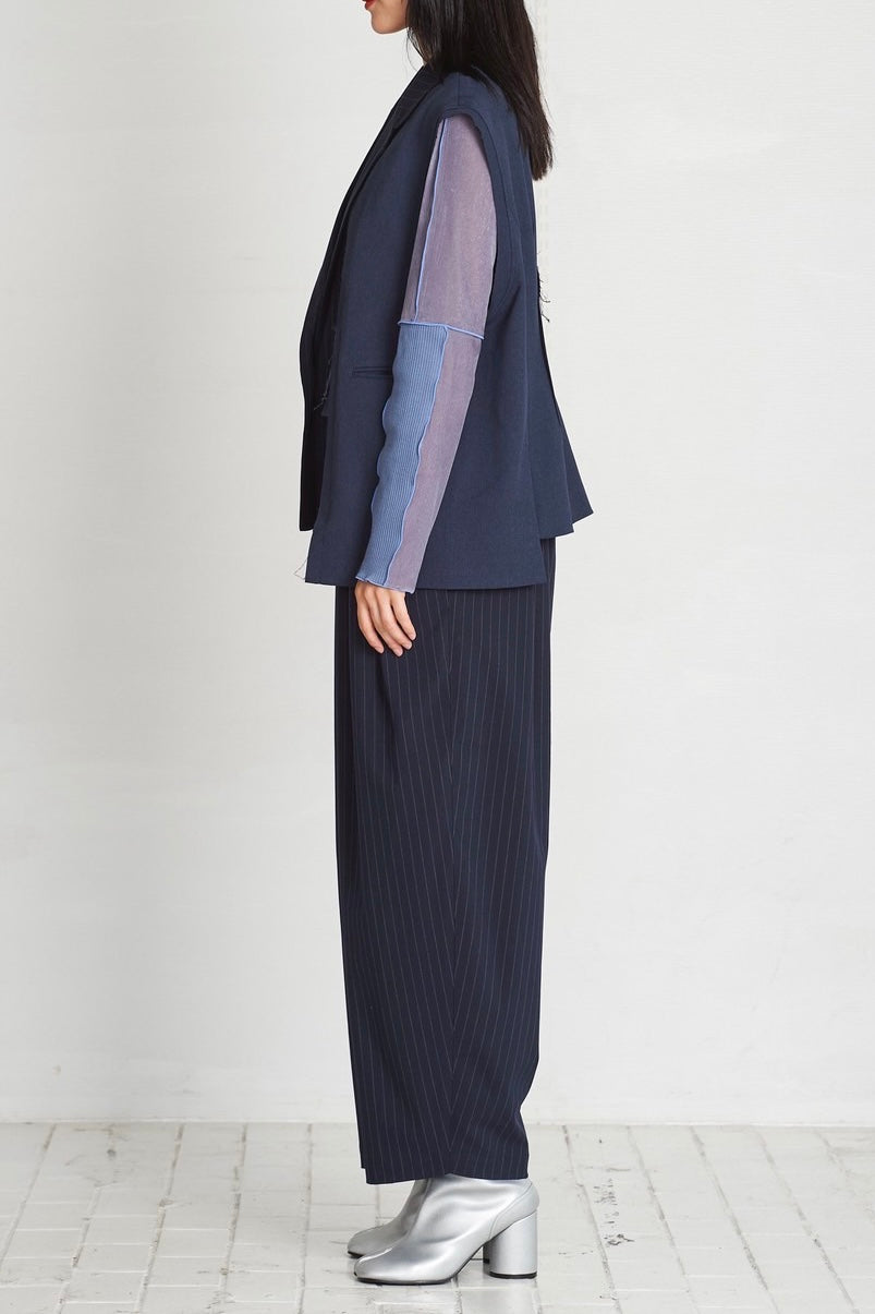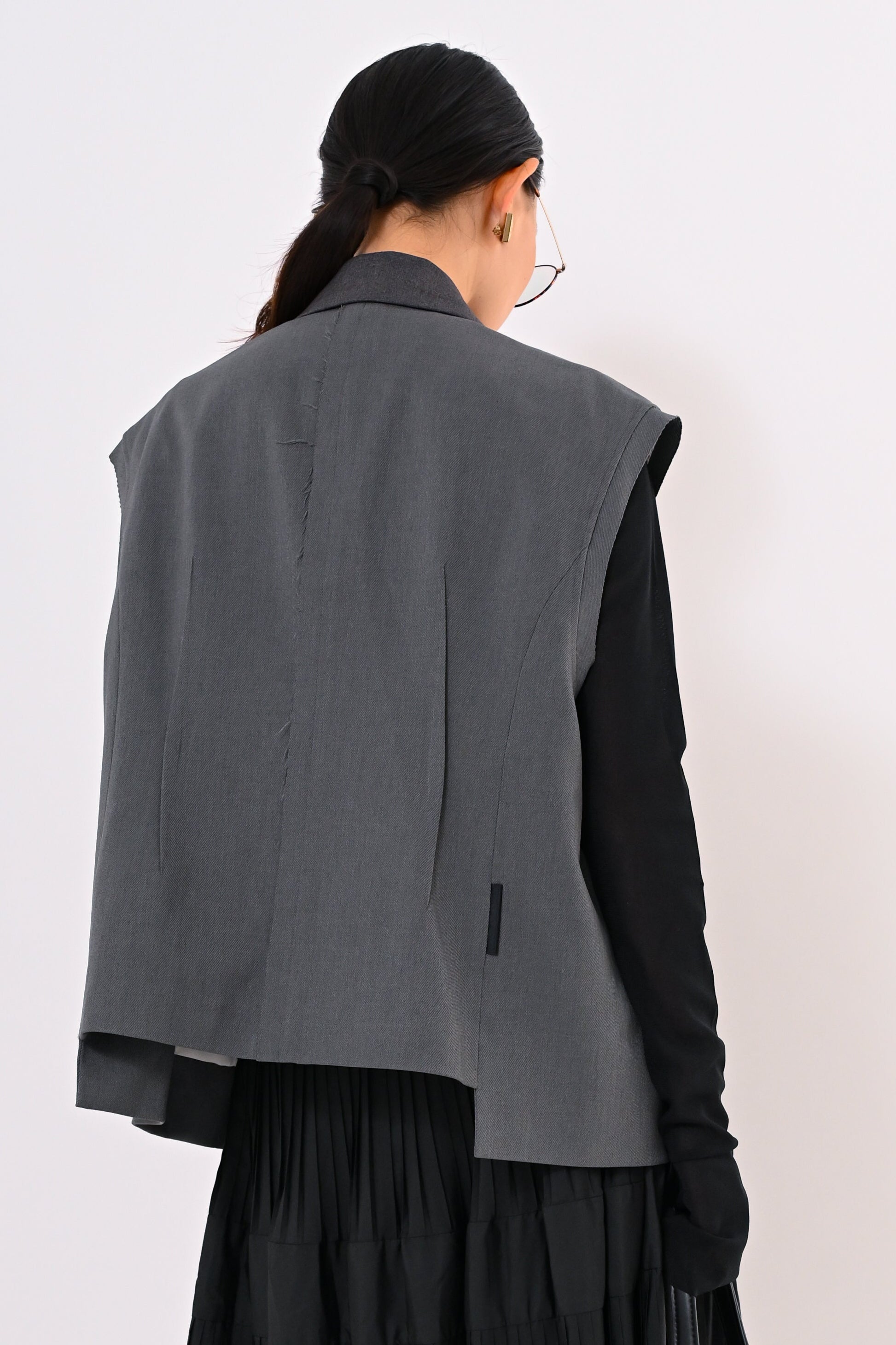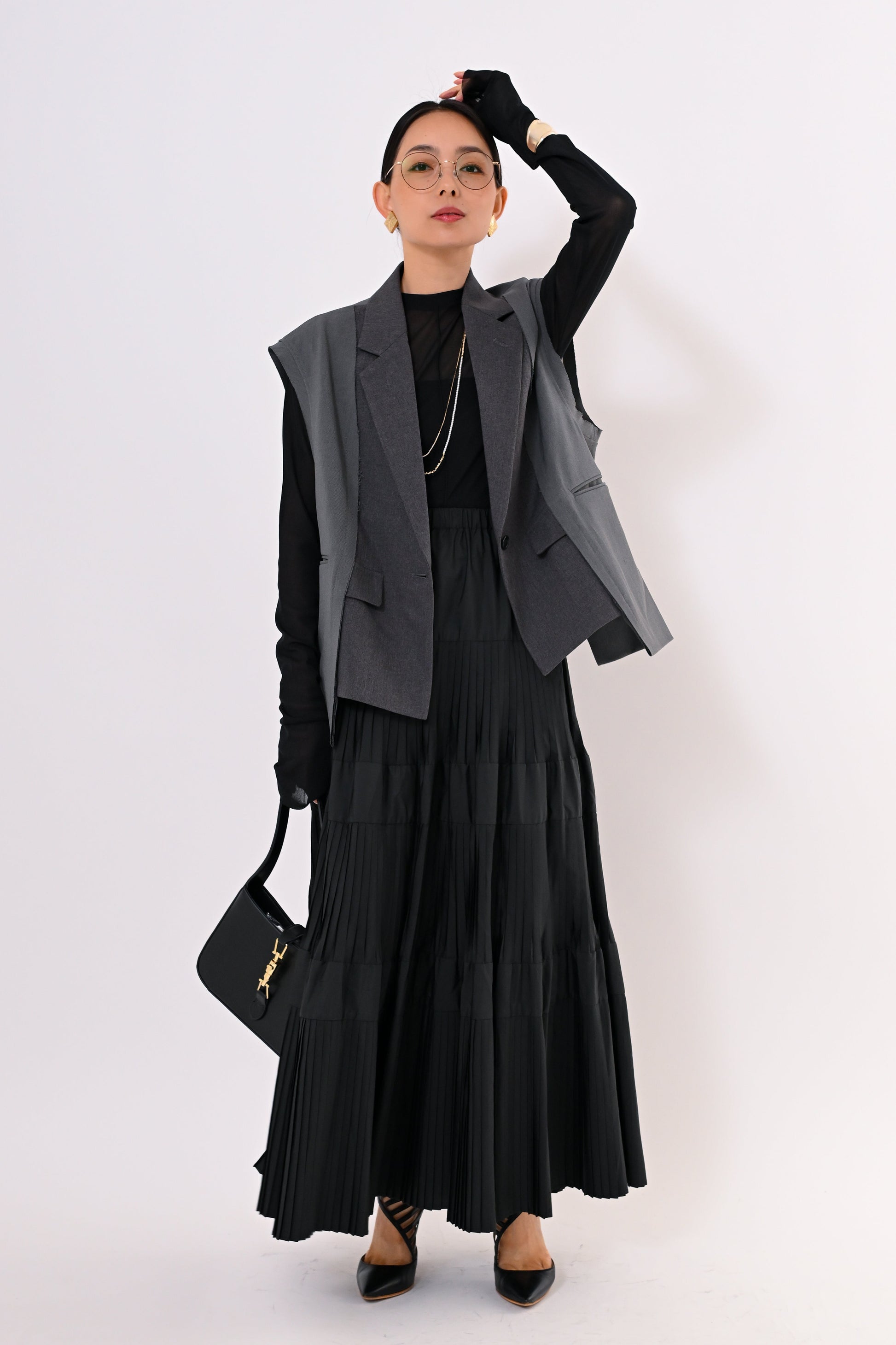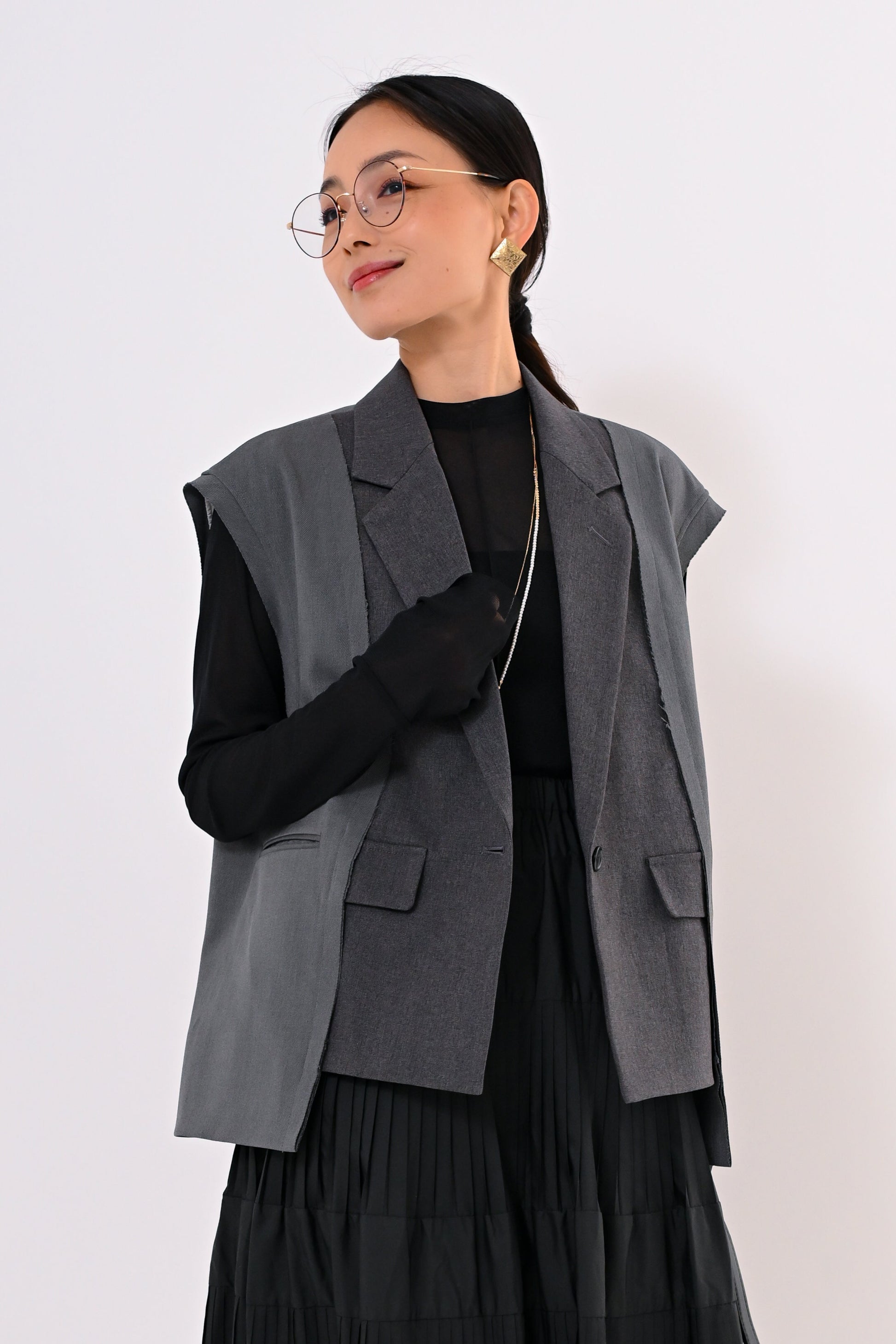シャープなVネックラインと一つボタンのシンプルなデザインに加え、サイドに切り替えを施し、立体感とモードなアクセントをプラスしました。