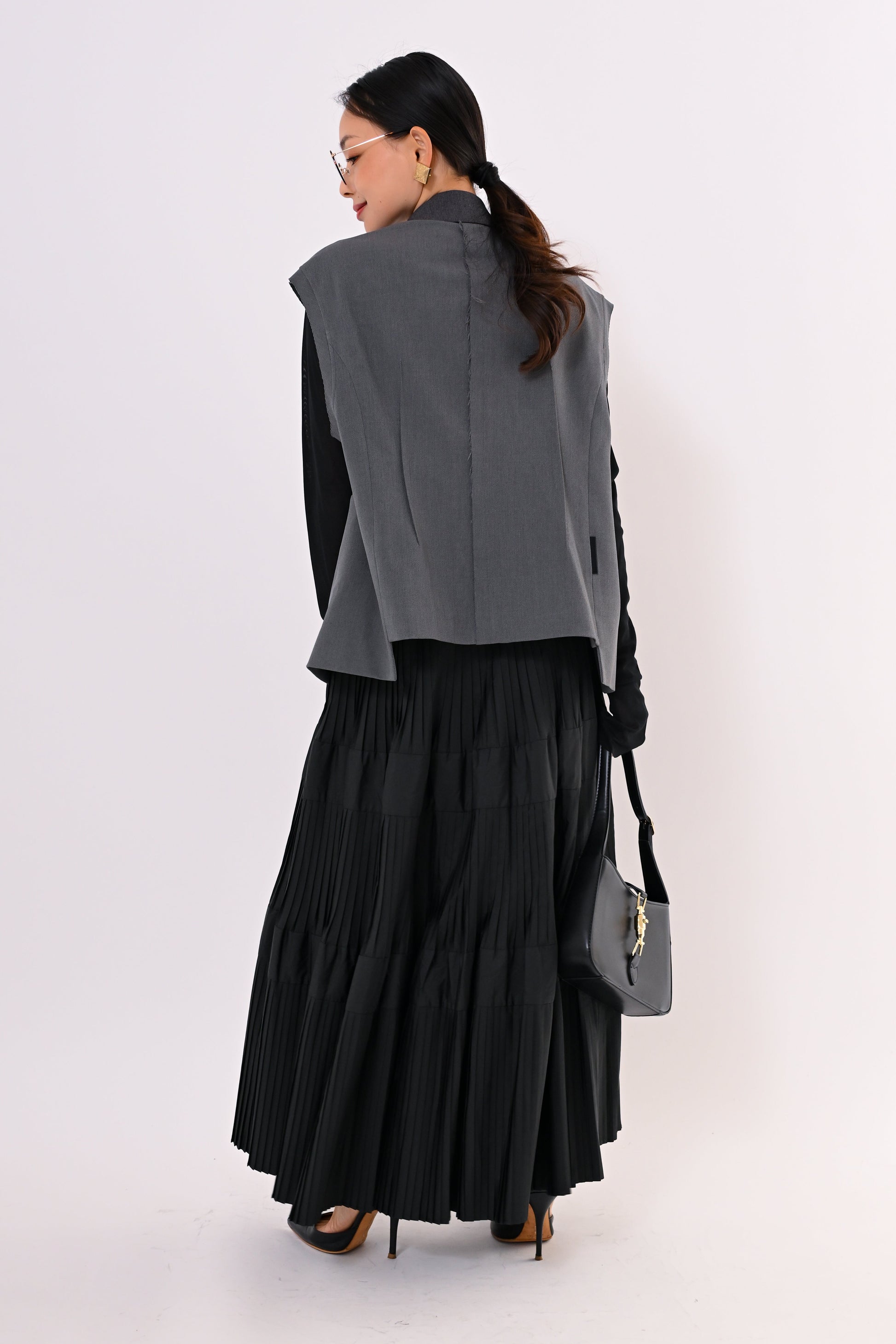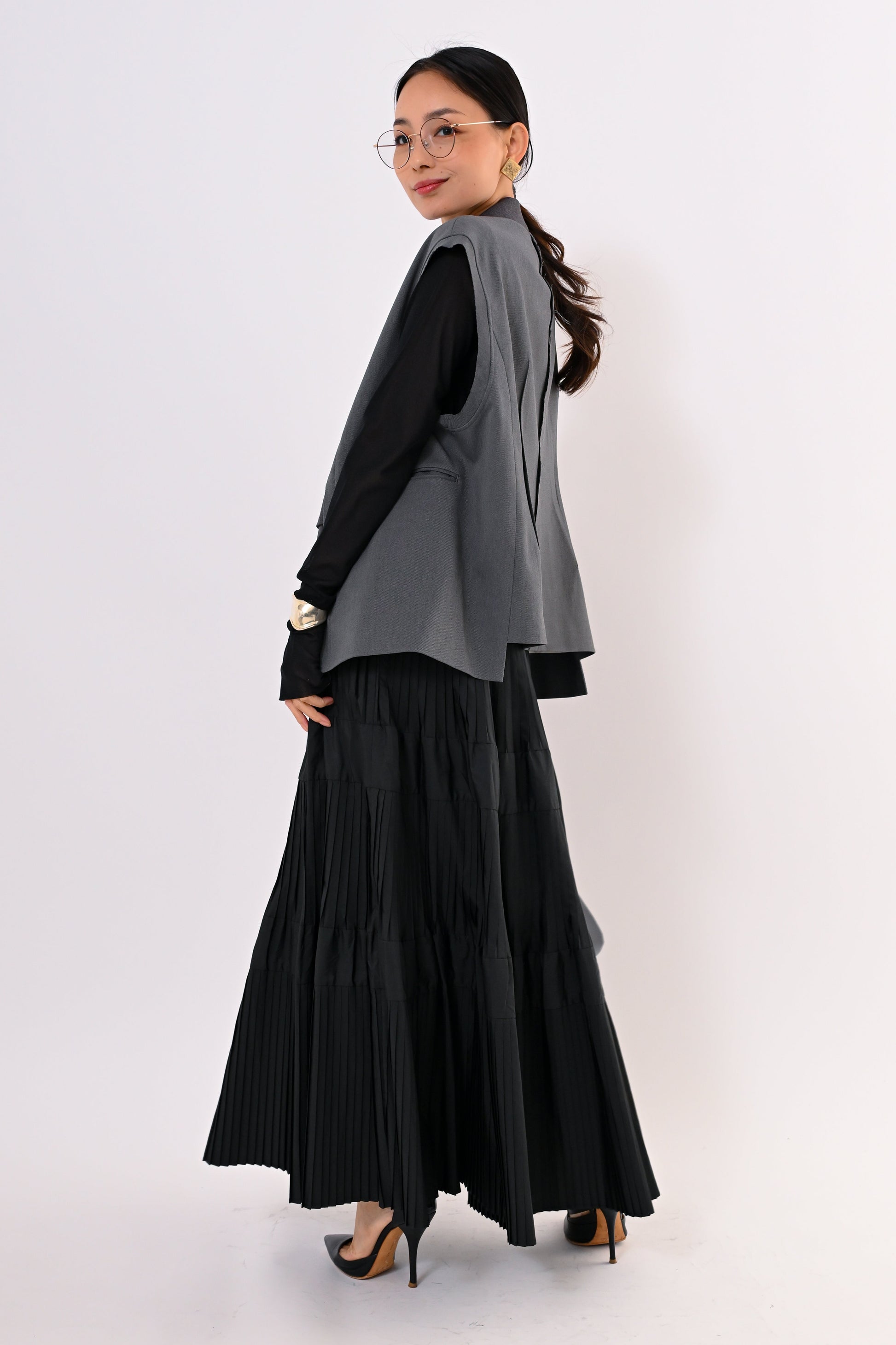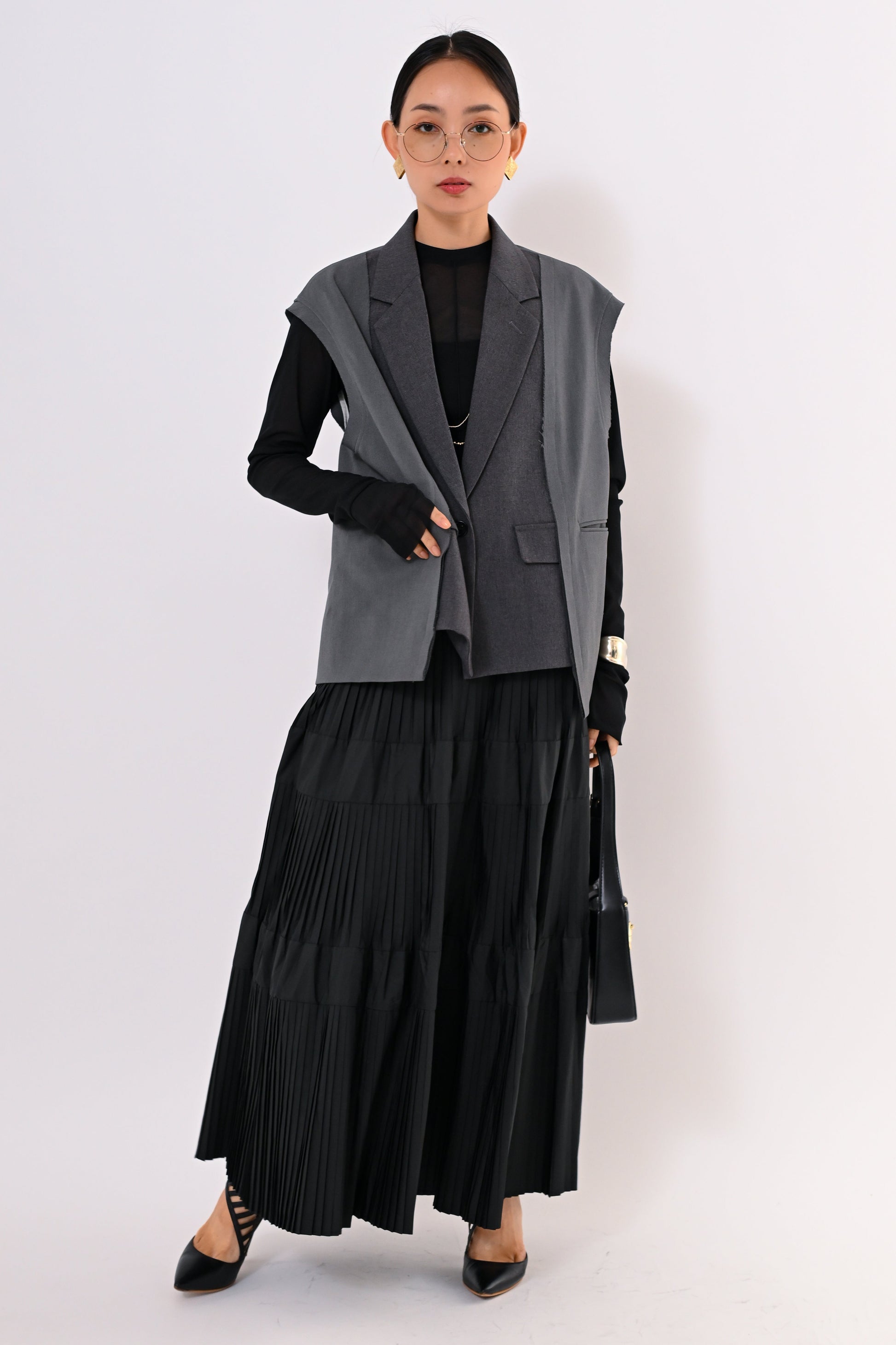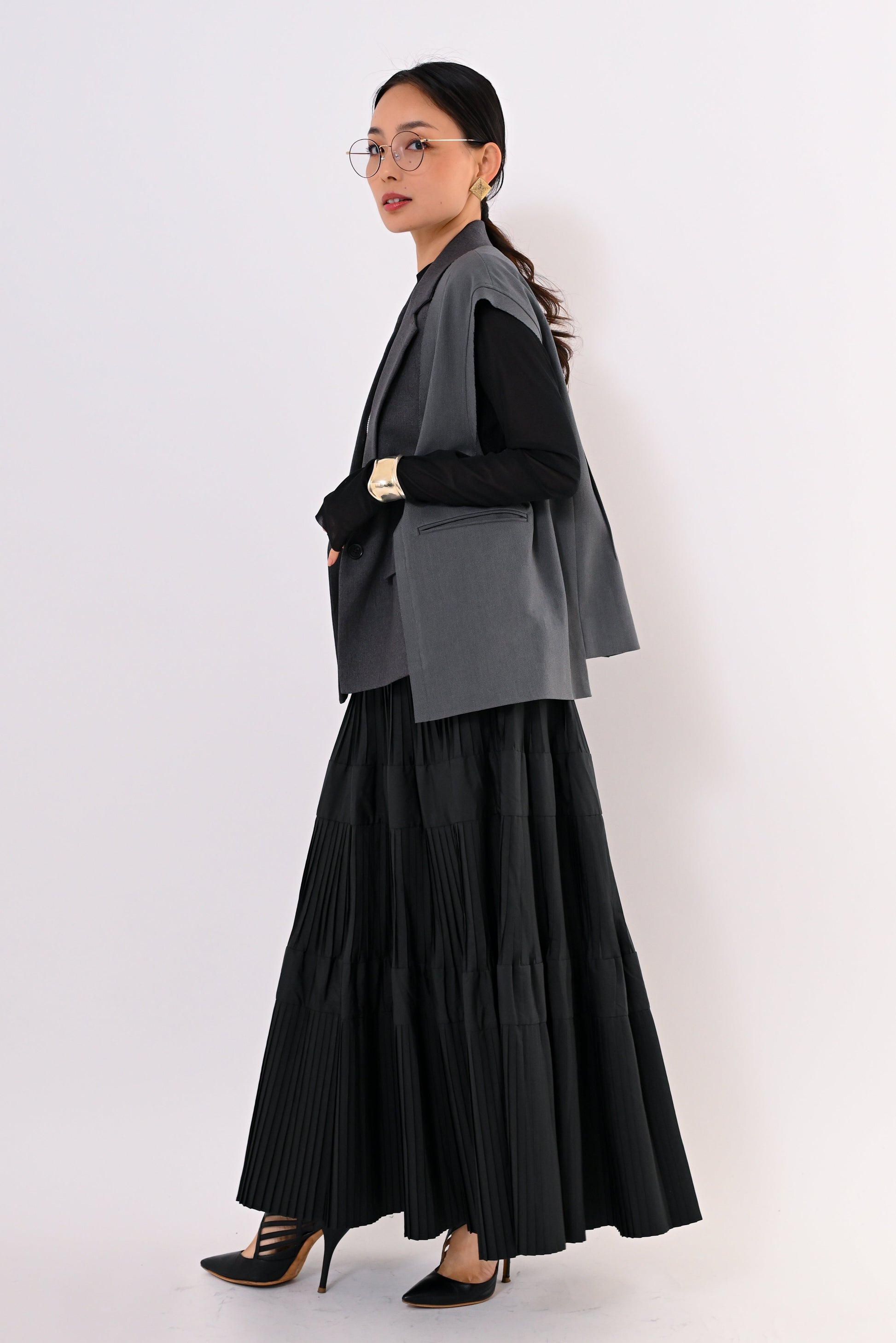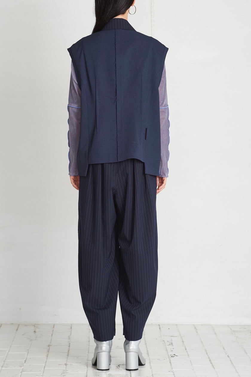 シャープなVネックラインと一つボタンのシンプルなデザインに加え、サイドに切り替えを施し、立体感とモードなアクセントをプラスしました。