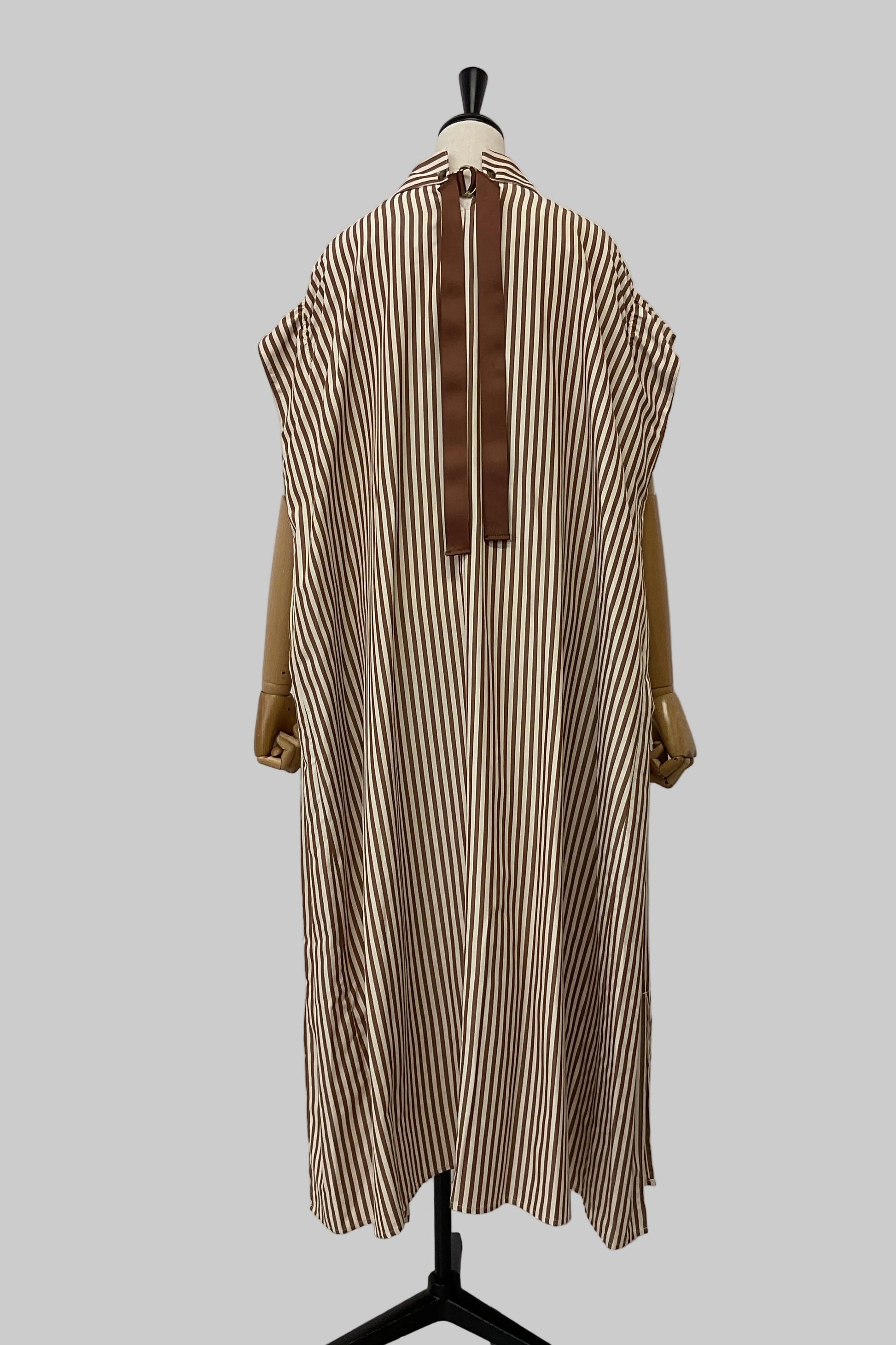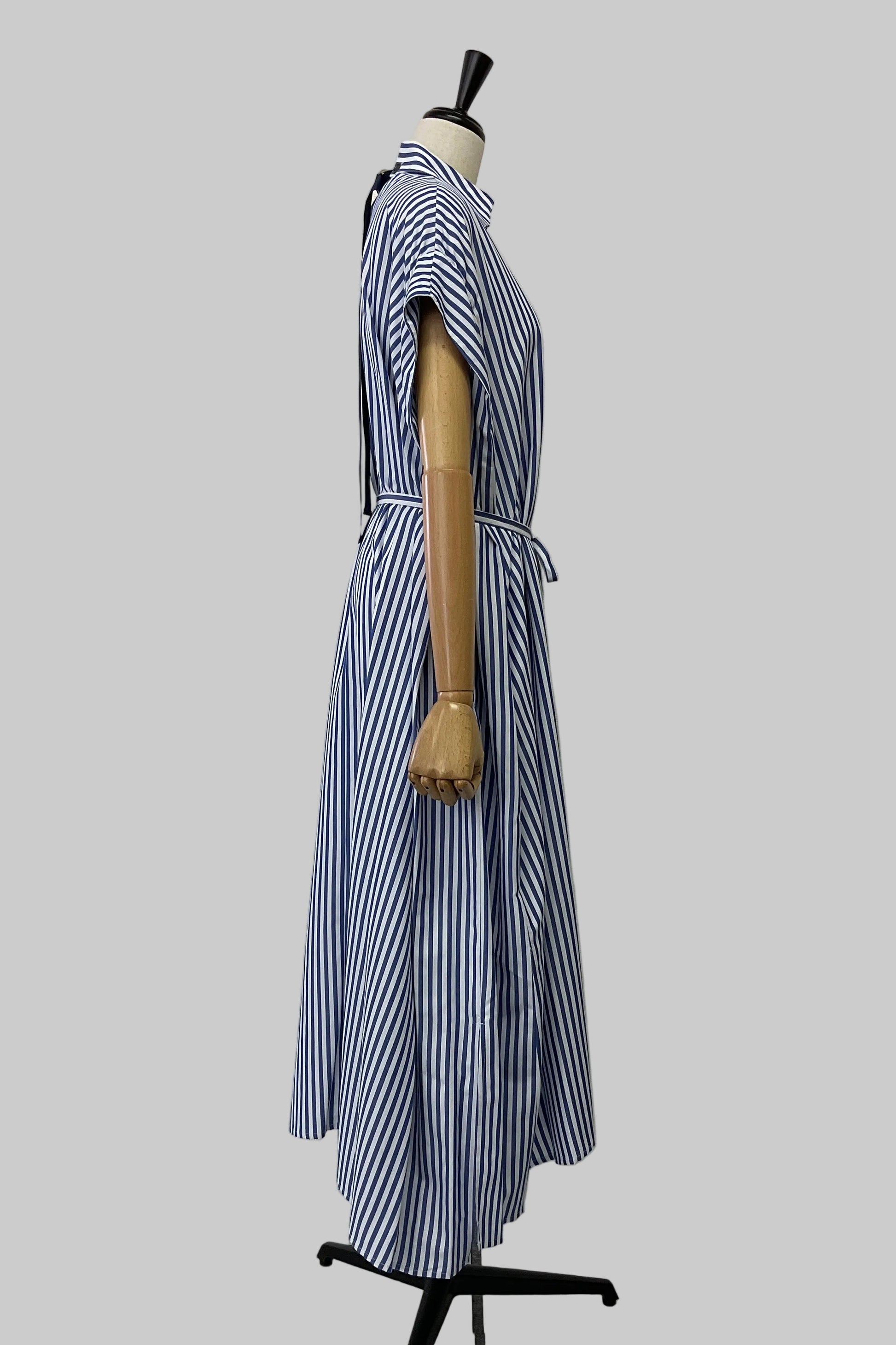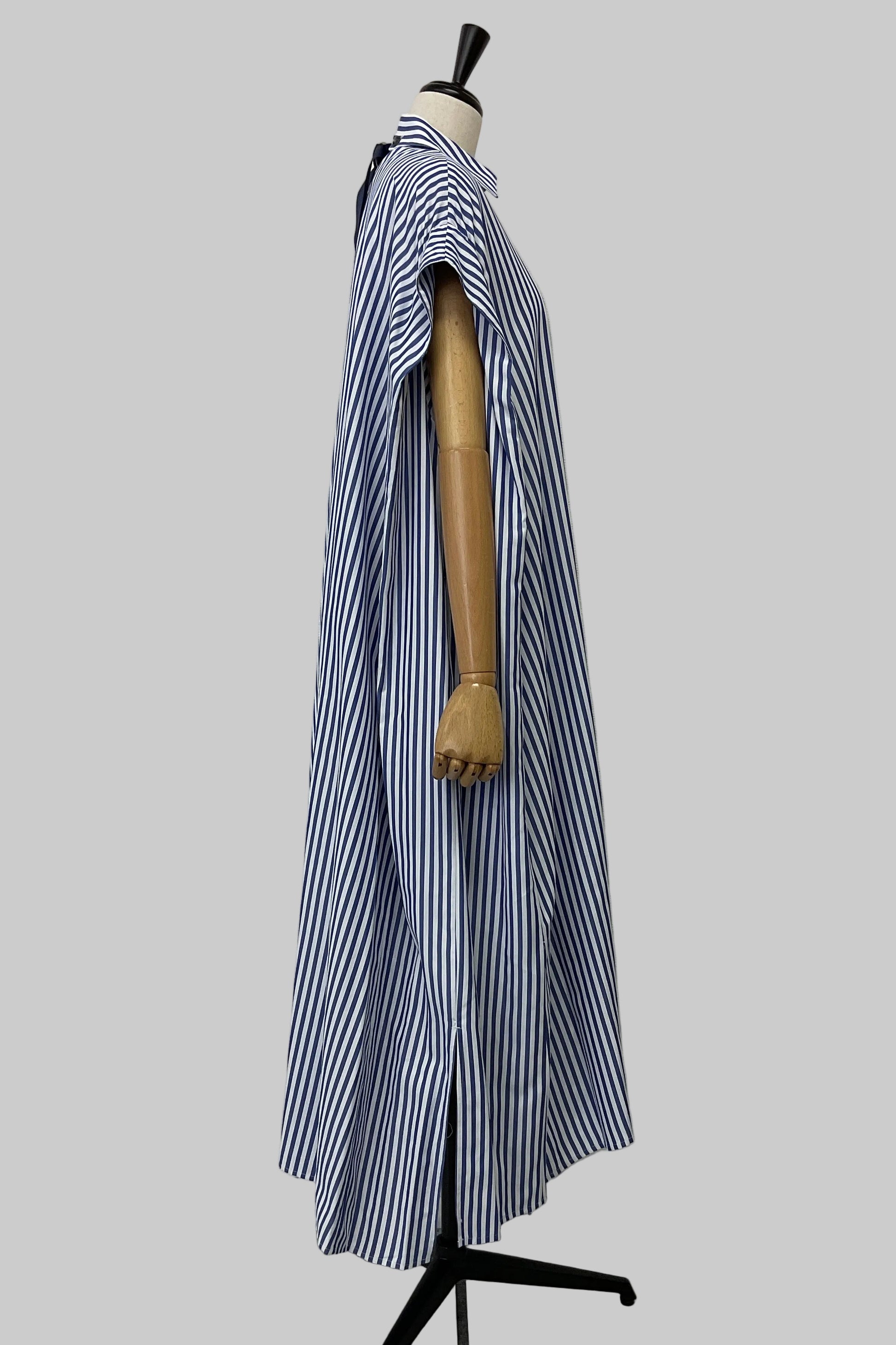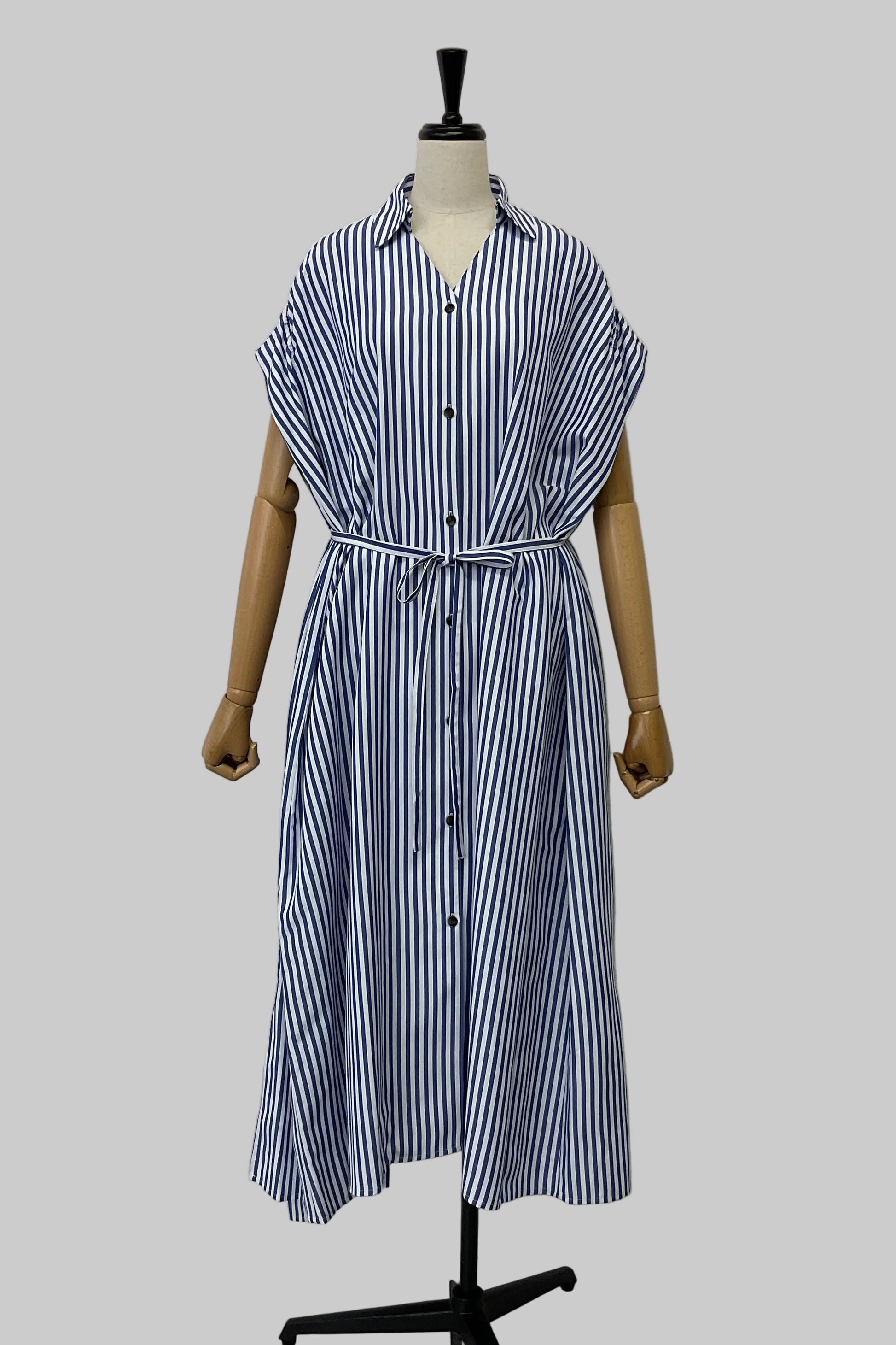 爽やかなストライプ柄が目を引く、ゆったりシルエットのシャツワンピース。