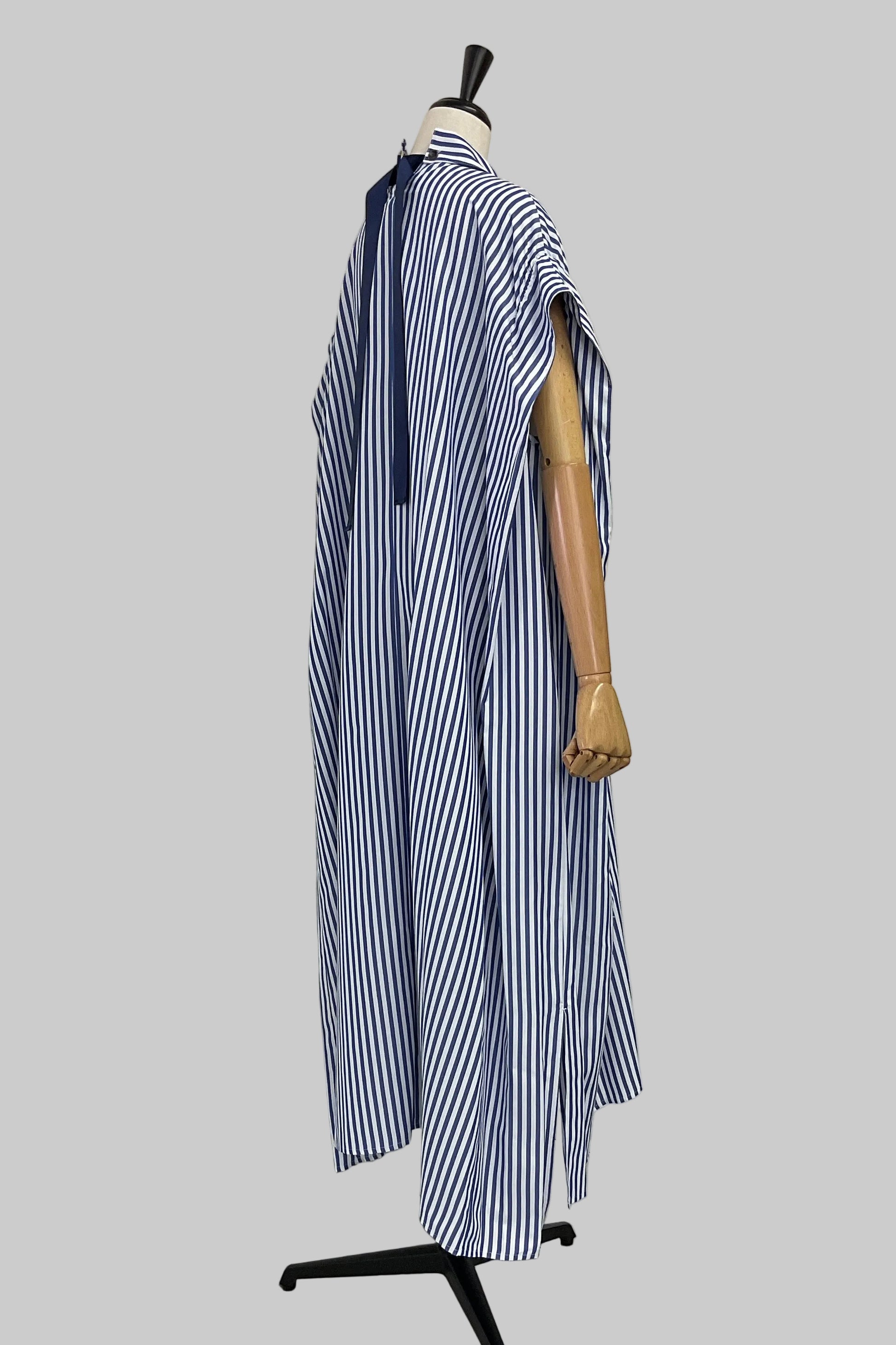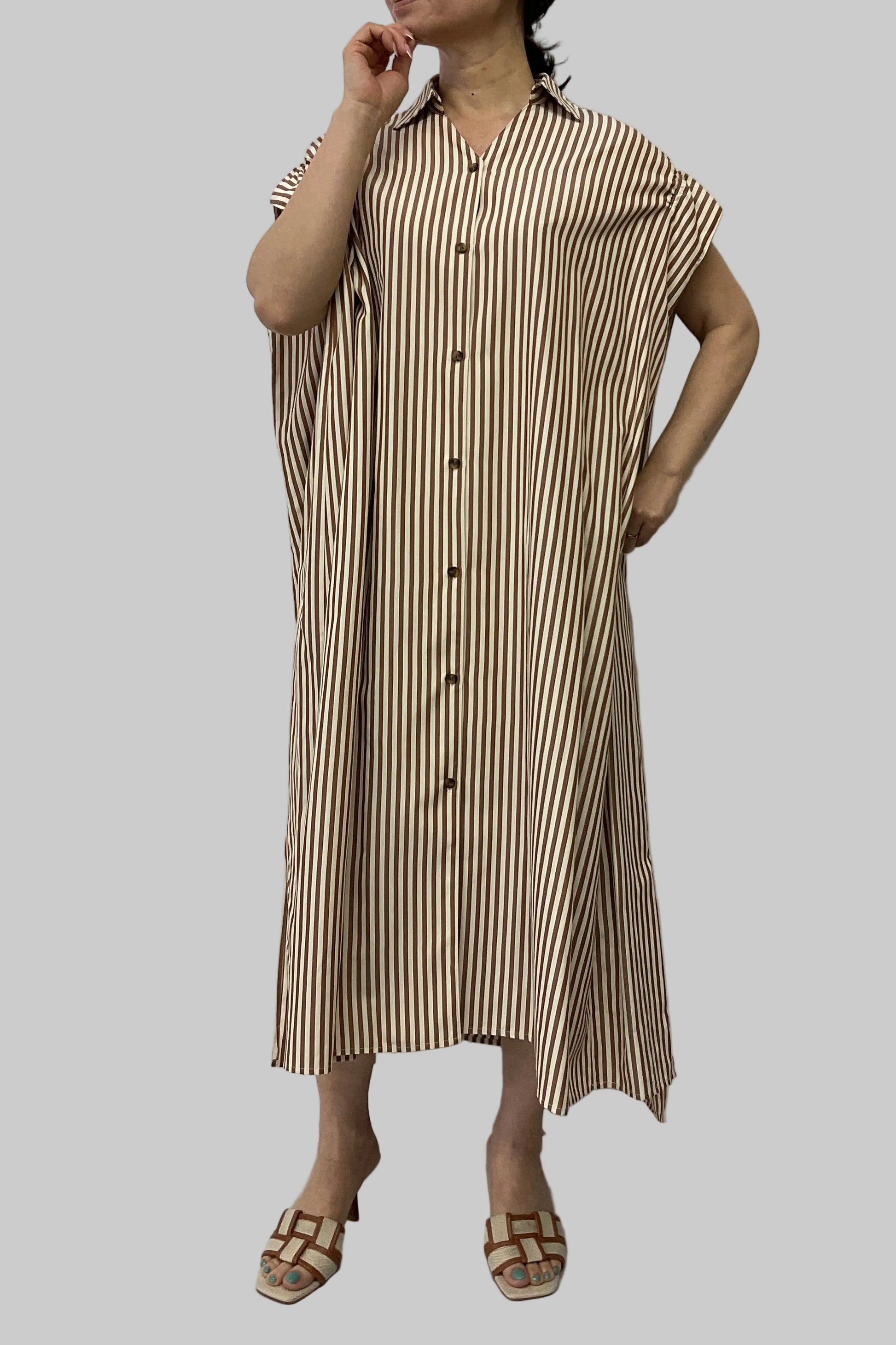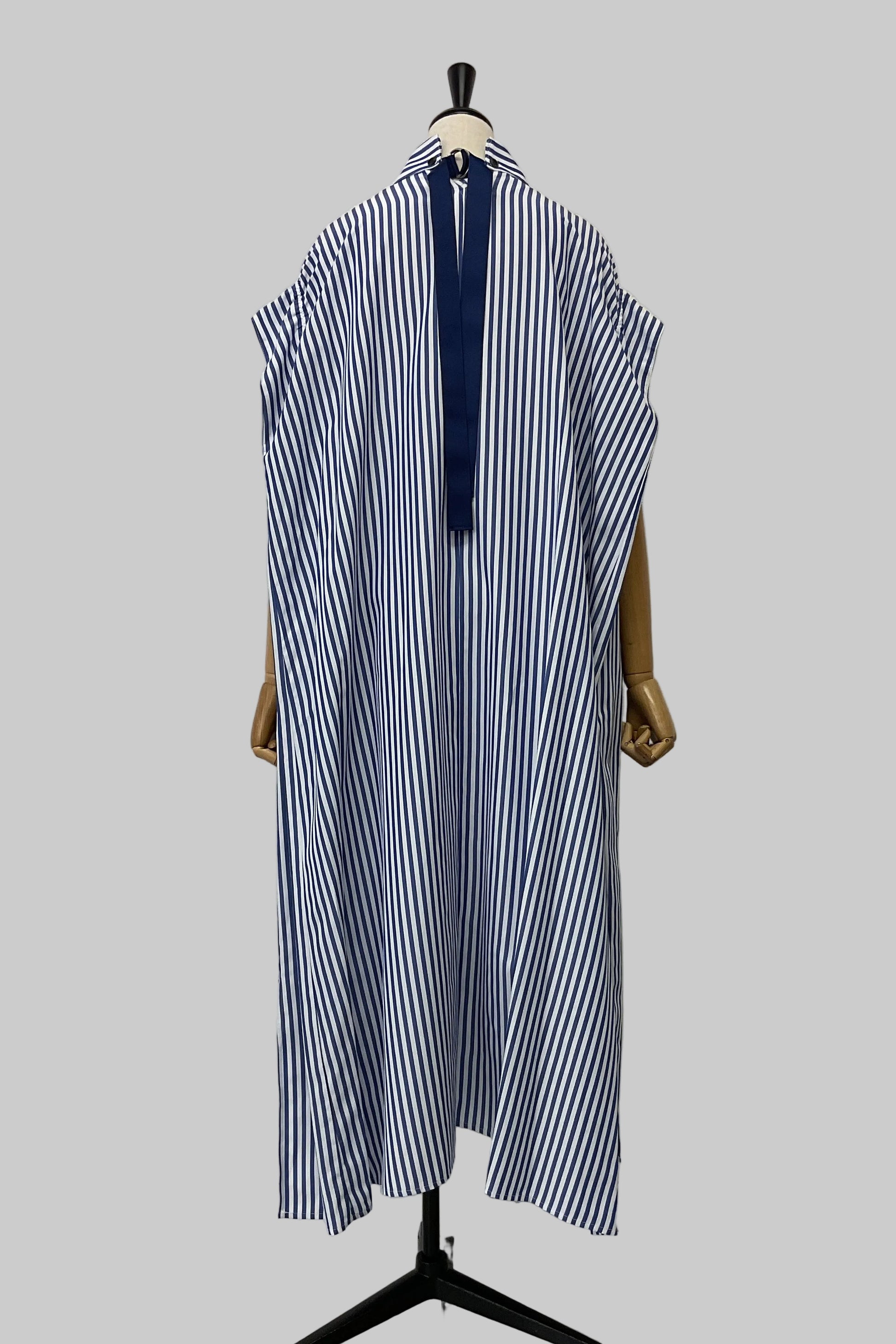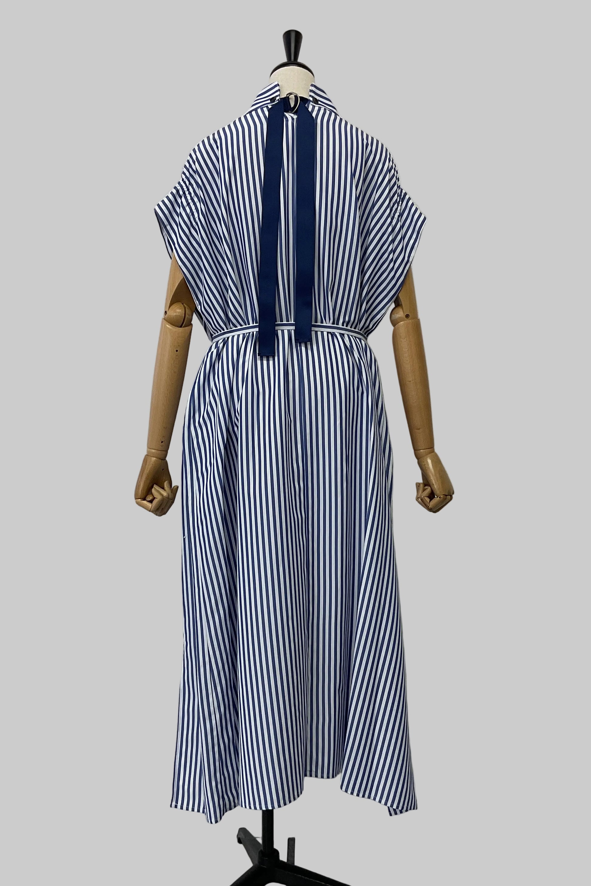 爽やかなストライプ柄が目を引く、ゆったりシルエットのシャツワンピース。