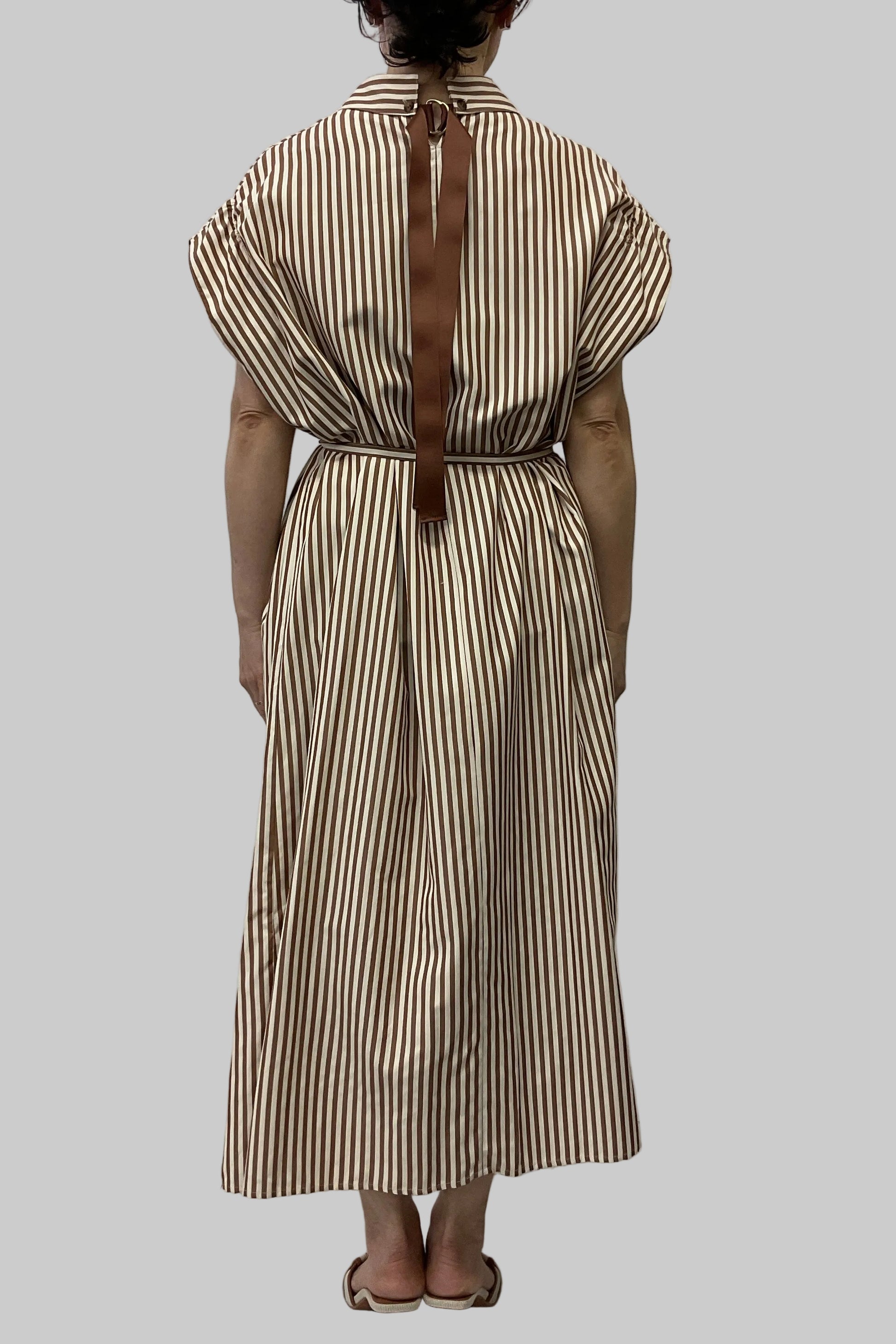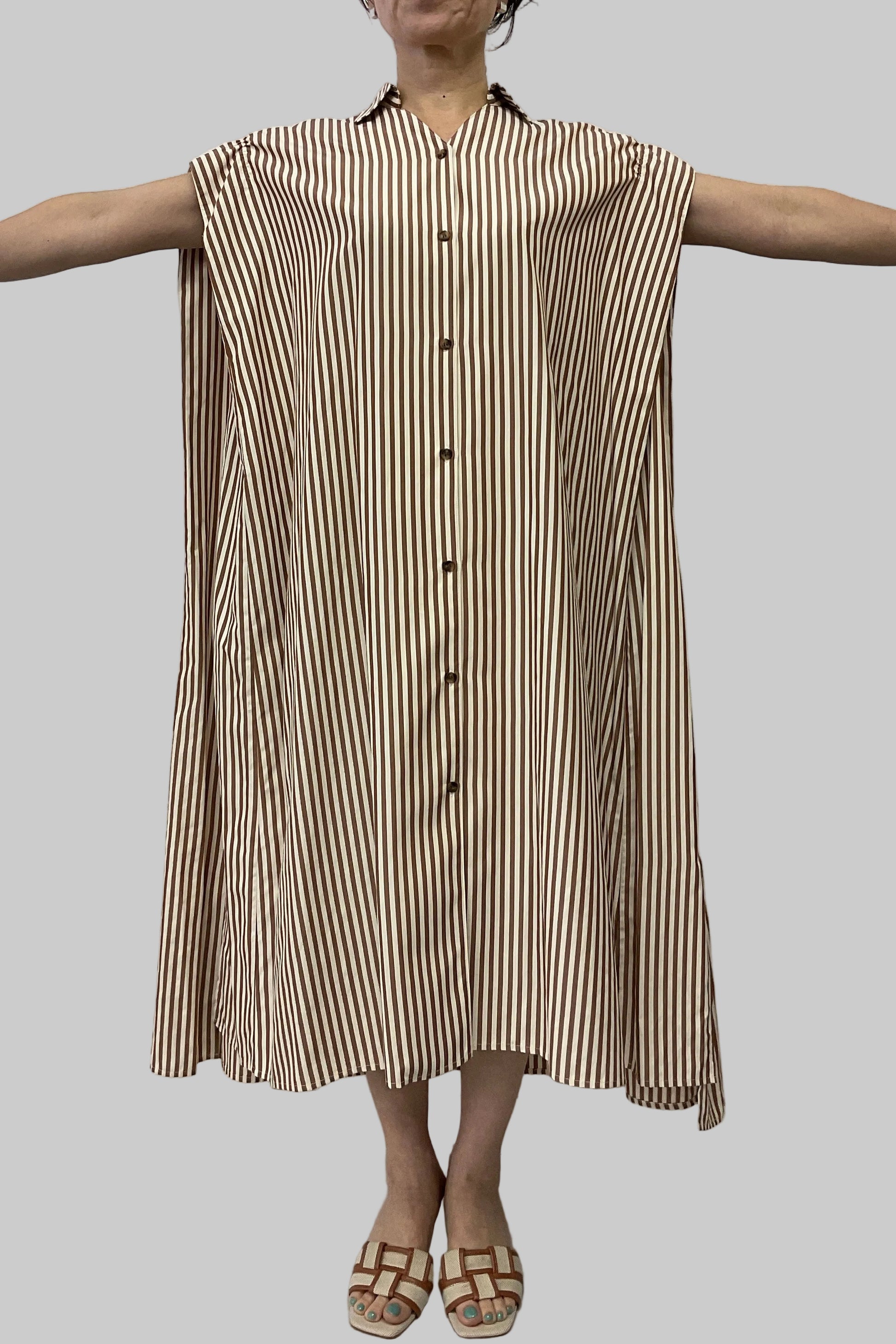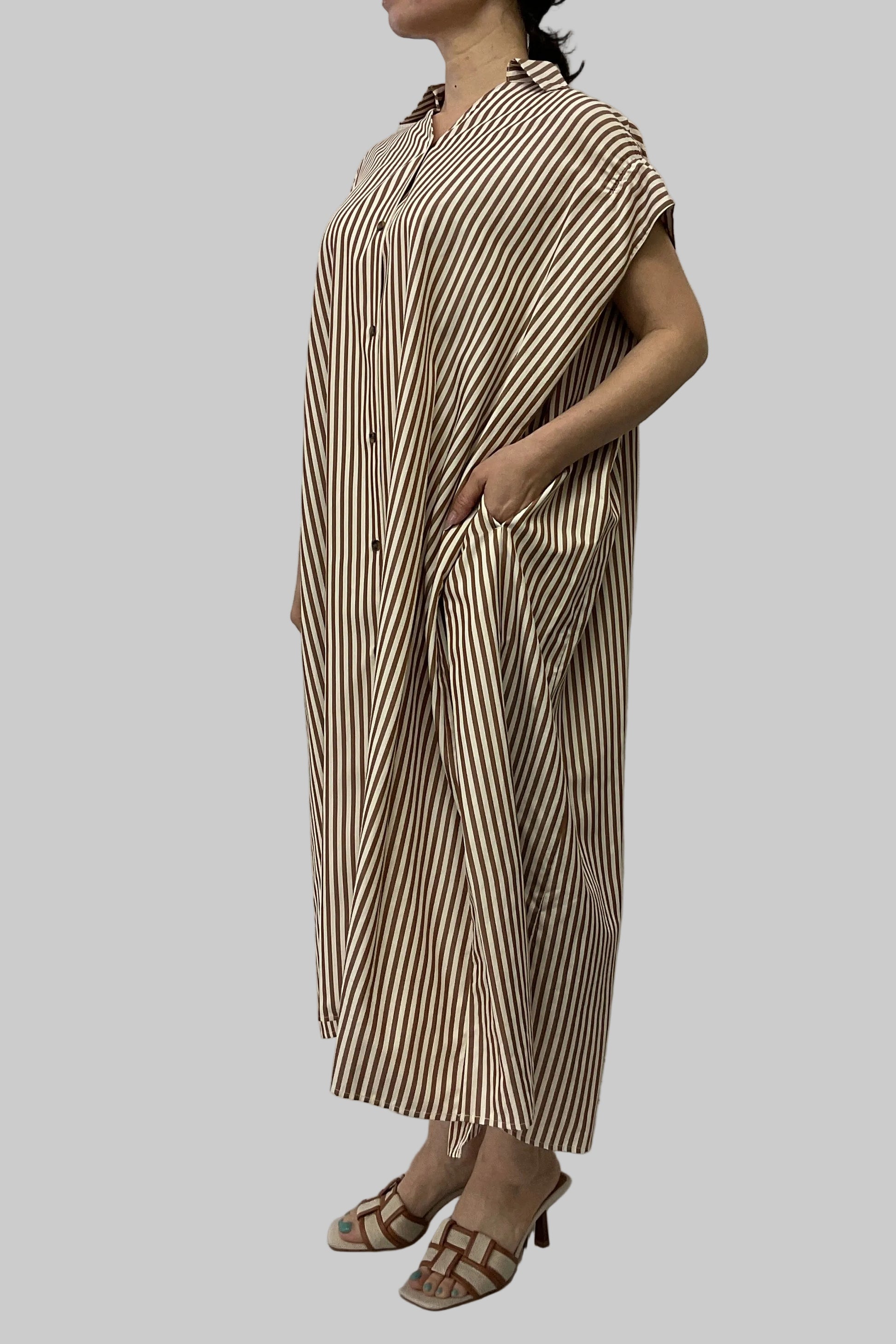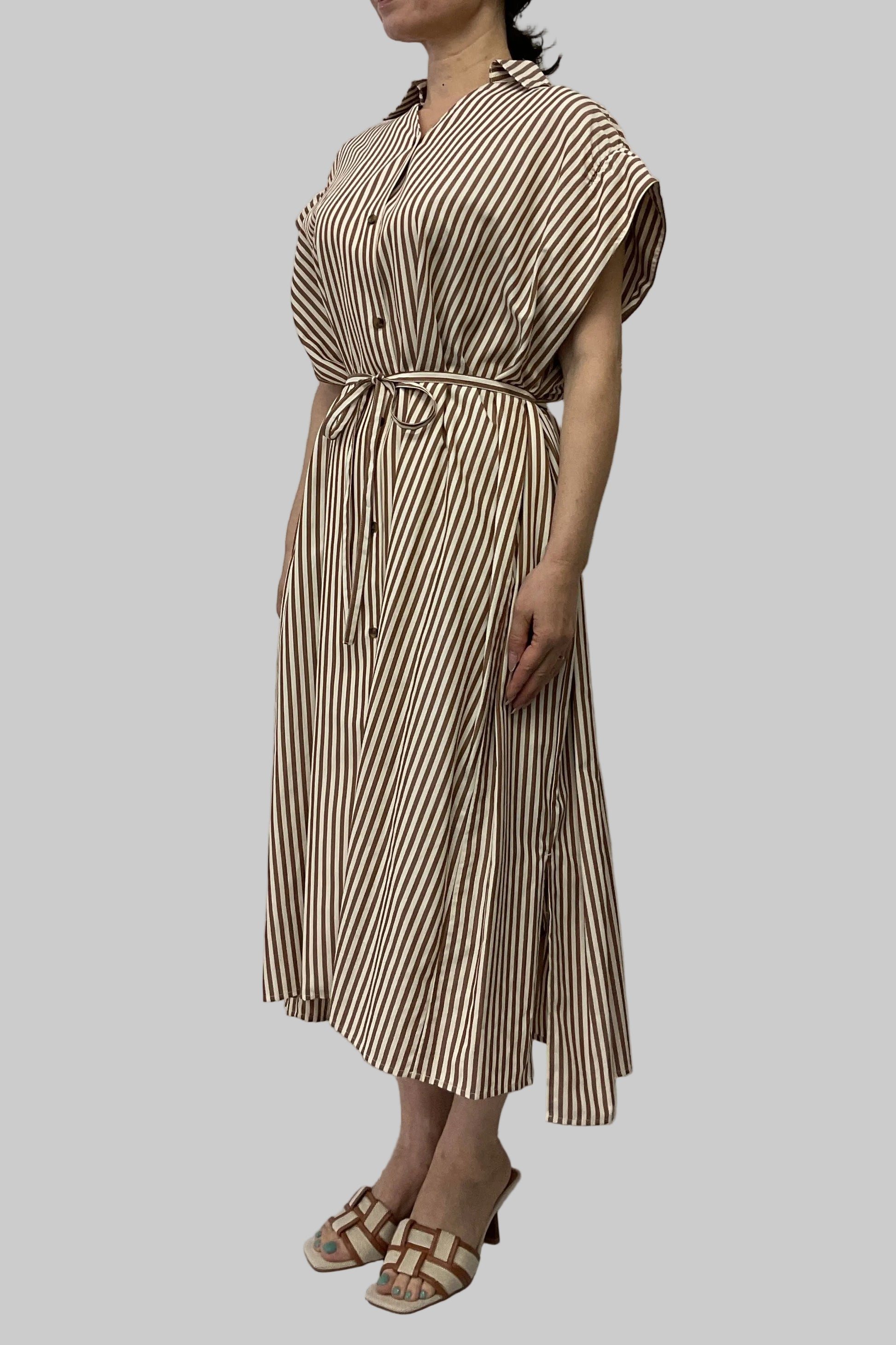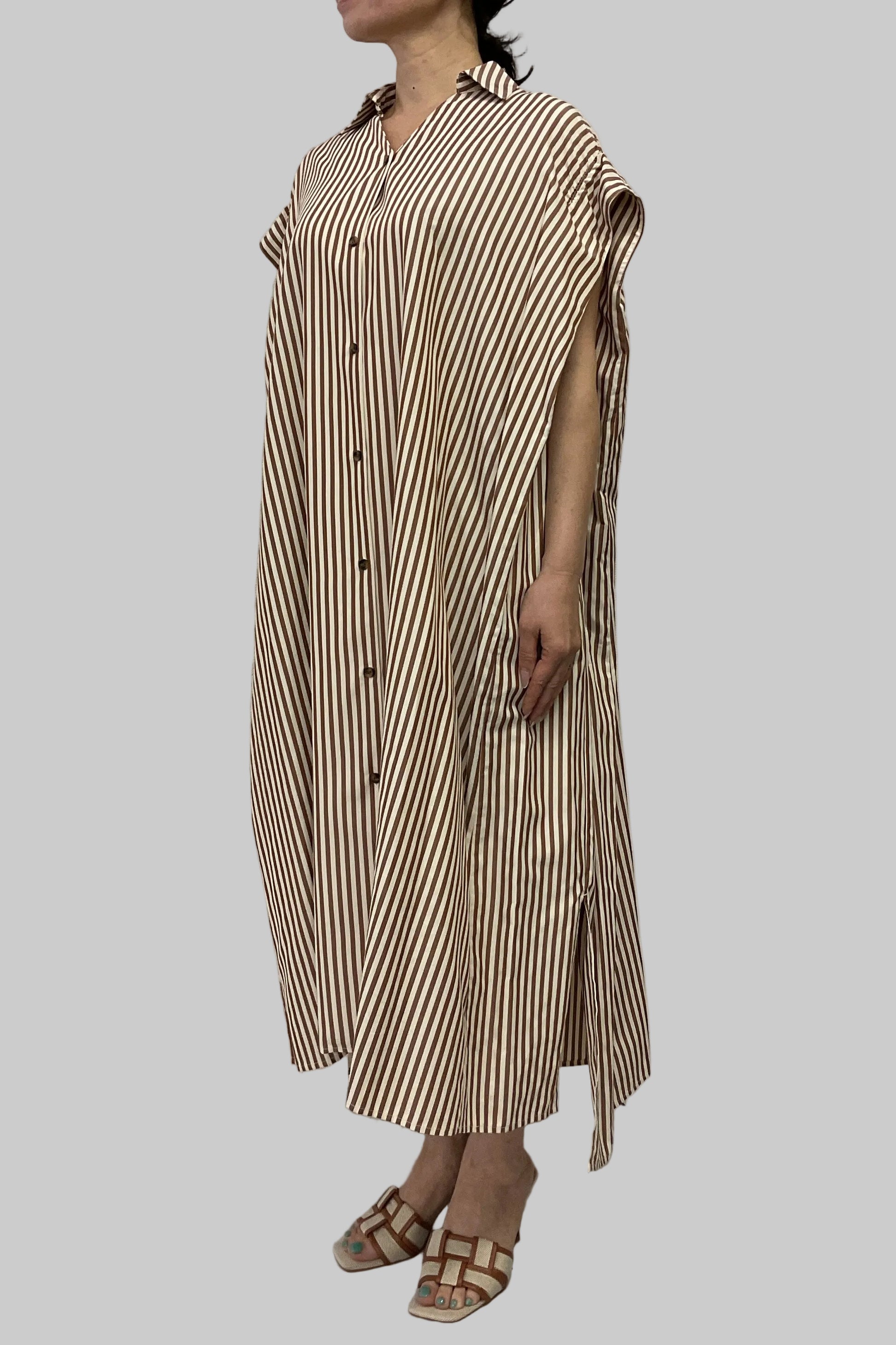 爽やかなストライプ柄が目を引く、ゆったりシルエットのシャツワンピース。