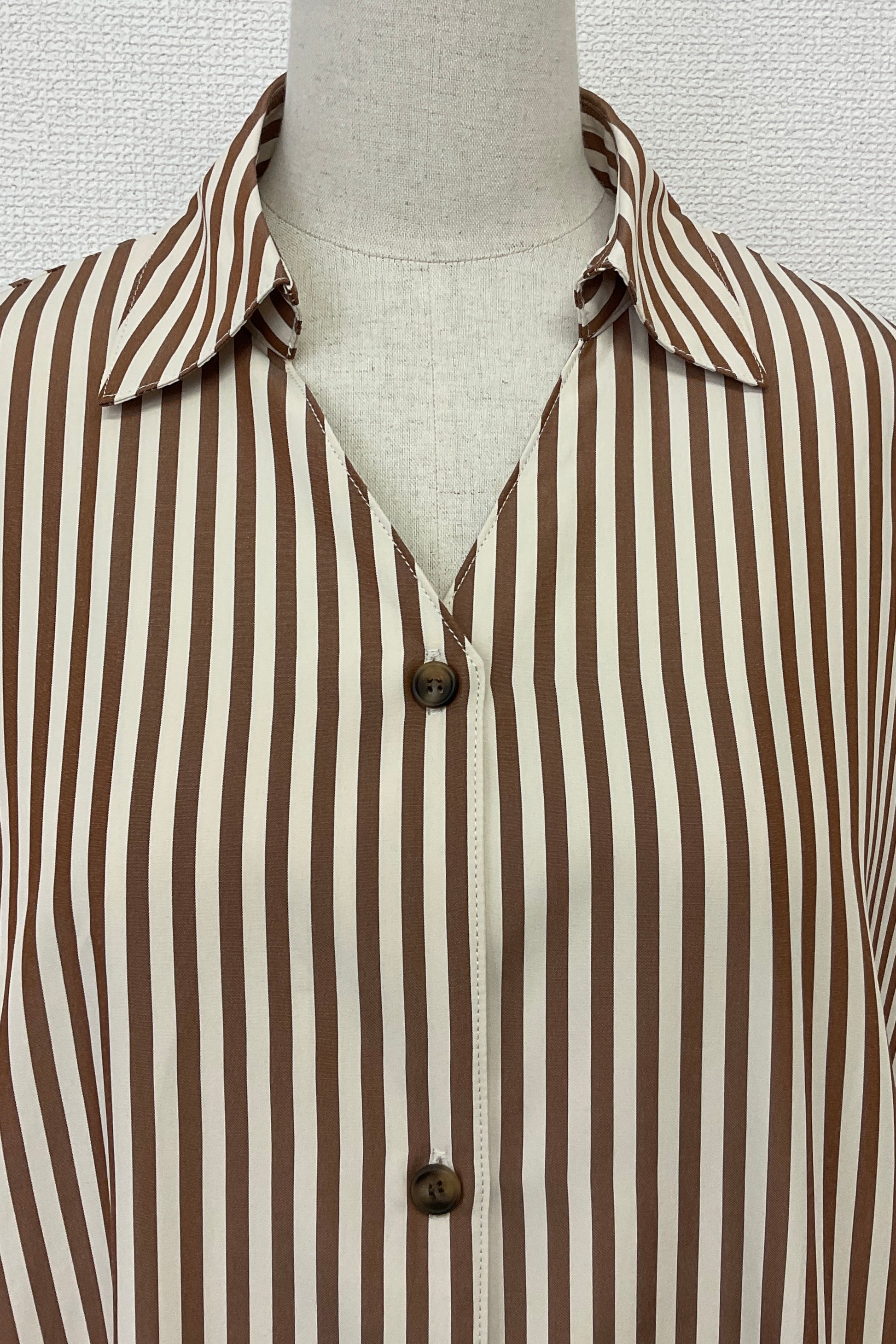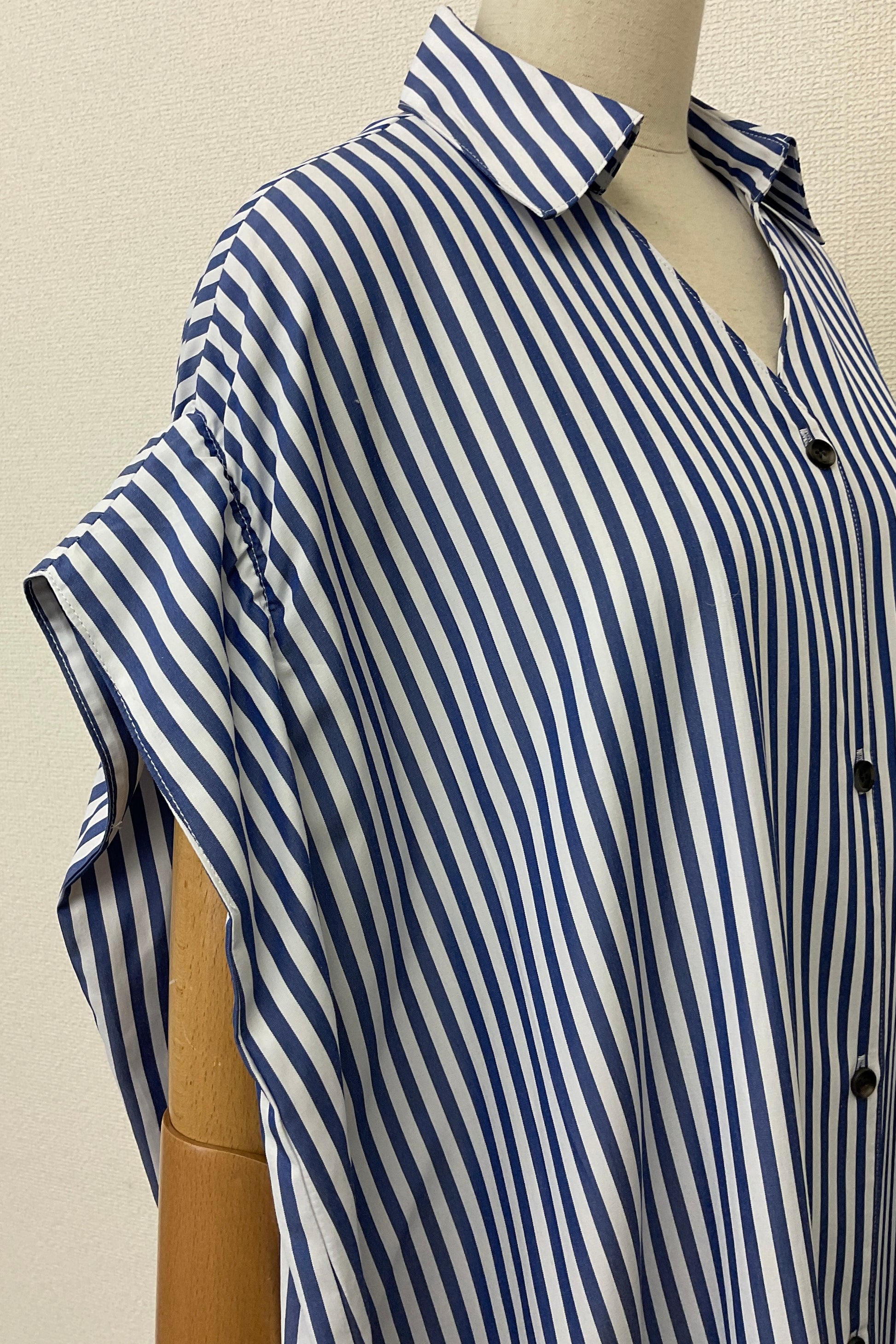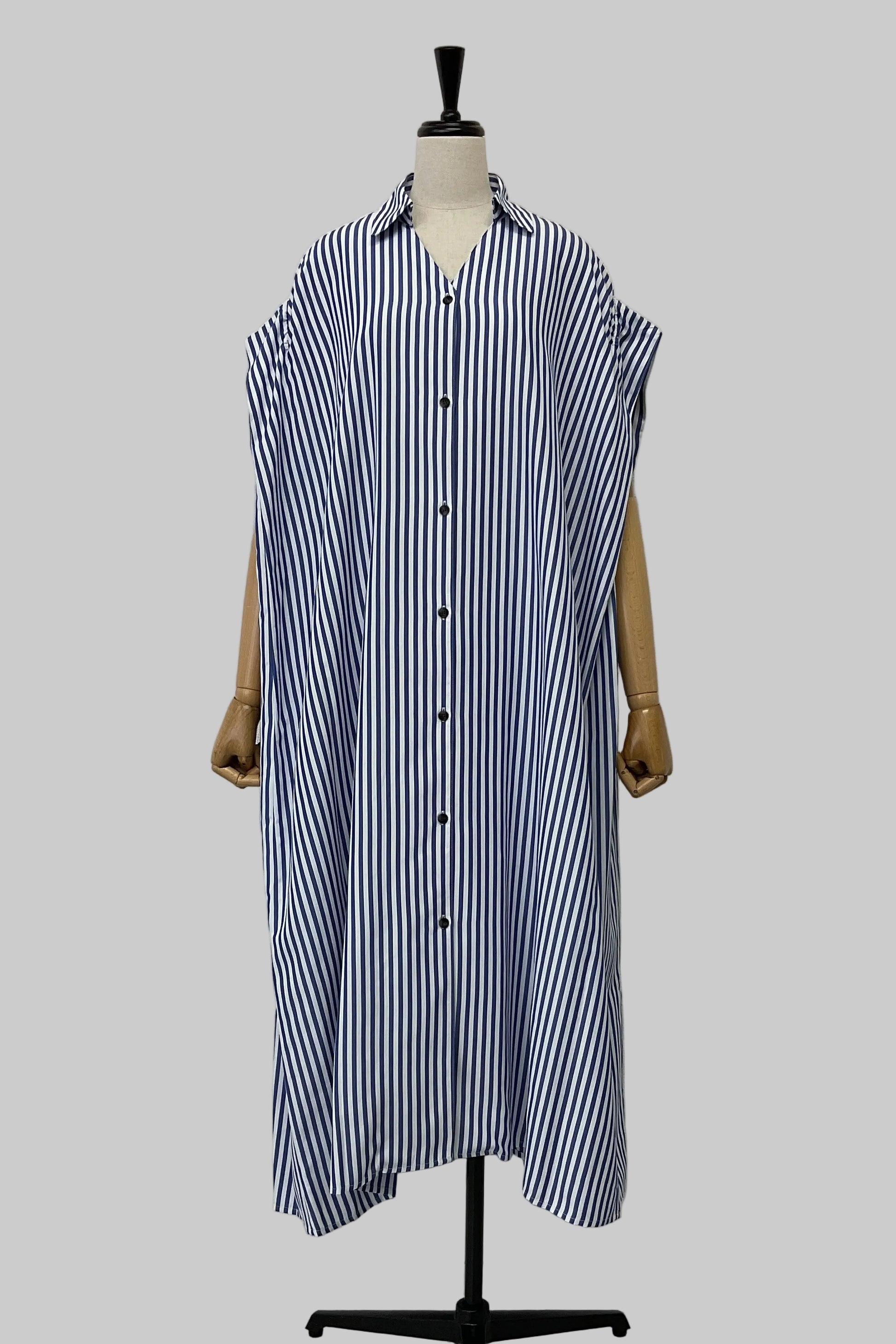 ・爽やかなストライプ柄で縦ラインを強調しすっきり見え・肩に入った細かなギャザーデザインで立体感をプラス