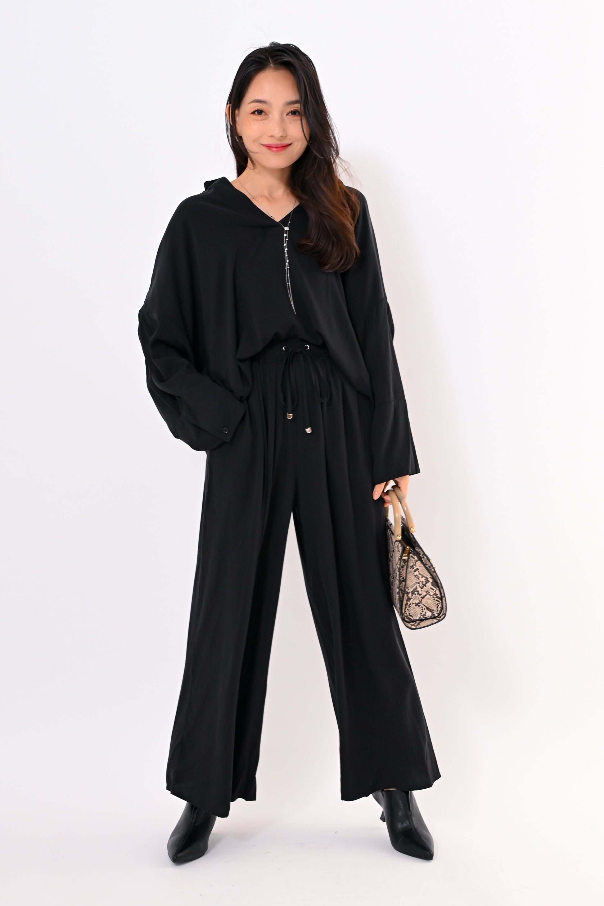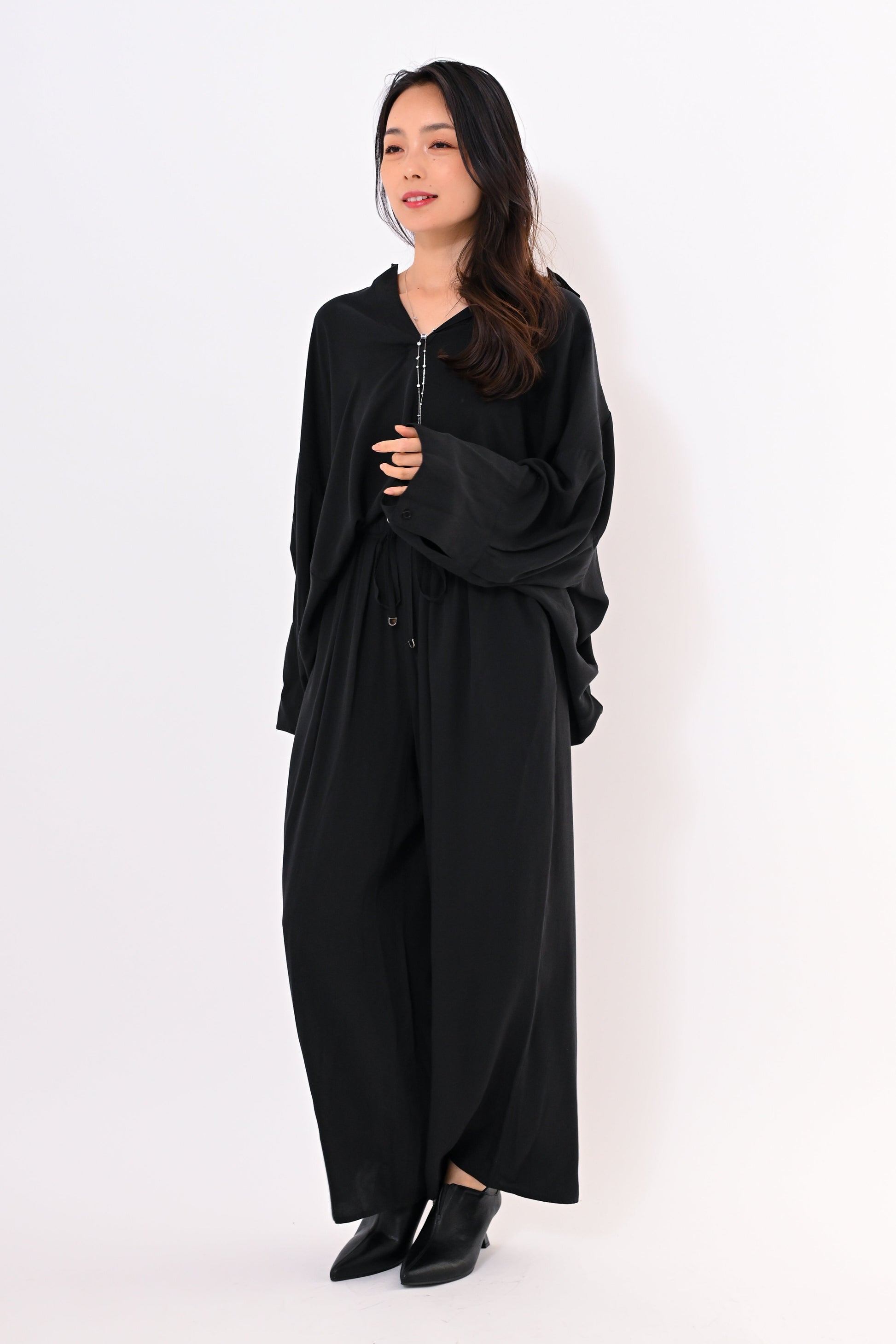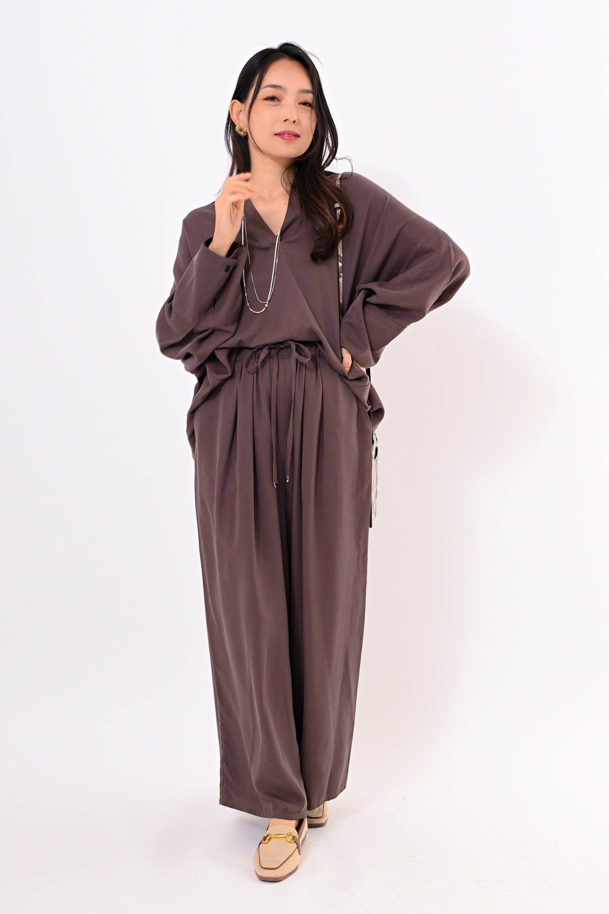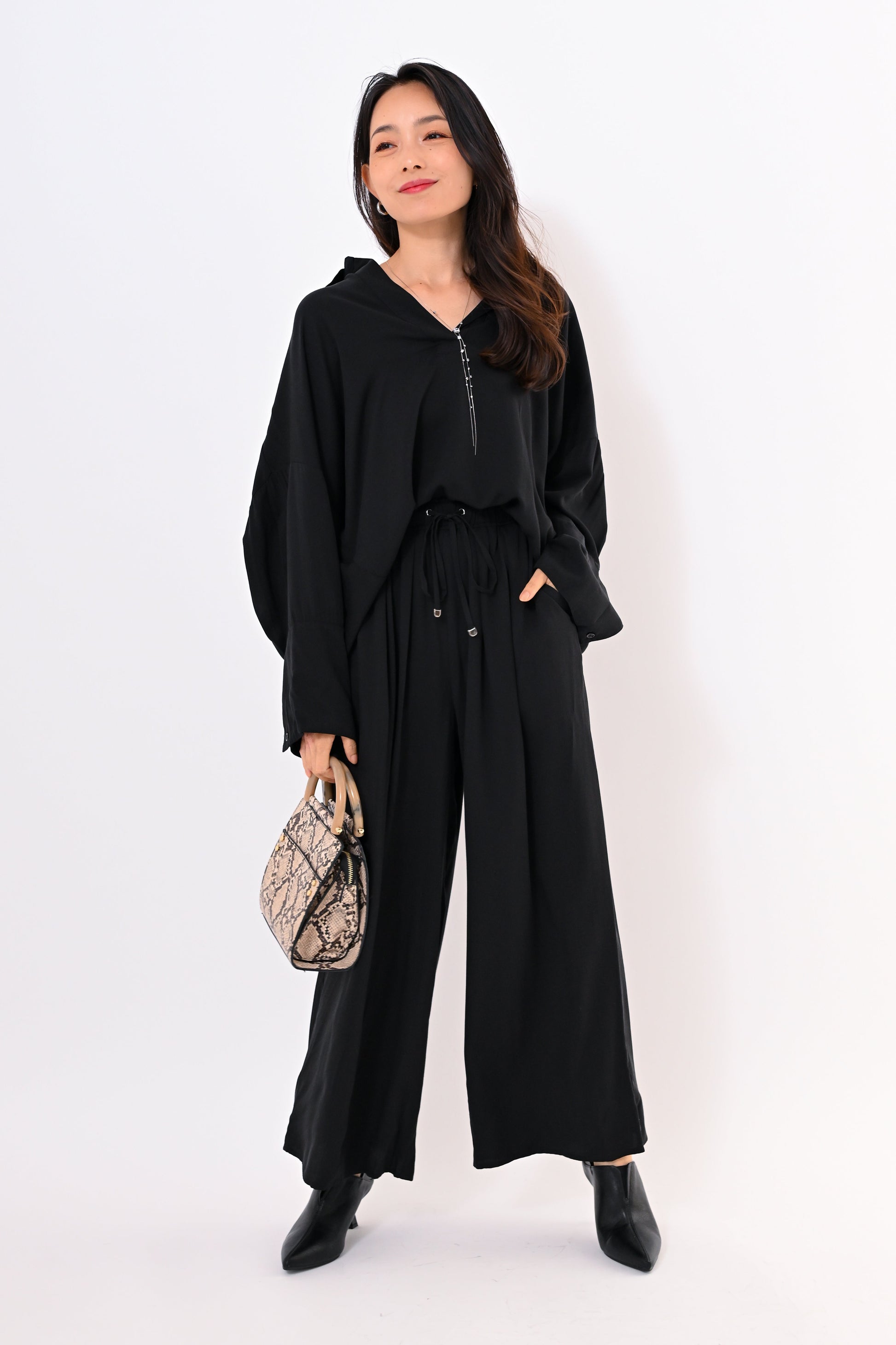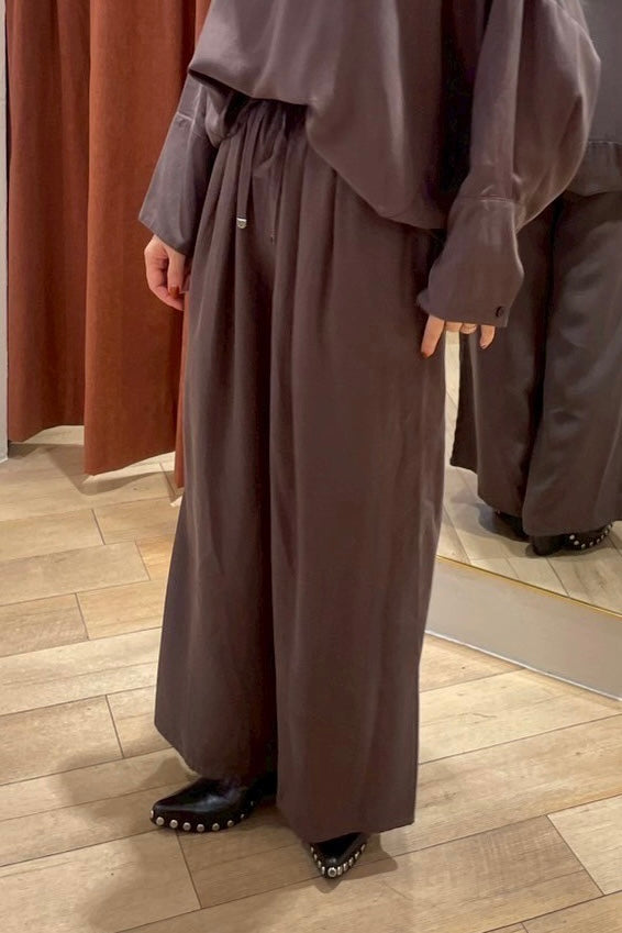 滑らかな落ち感と上品な光沢が魅力のテンセルツイルワイドパンツ。