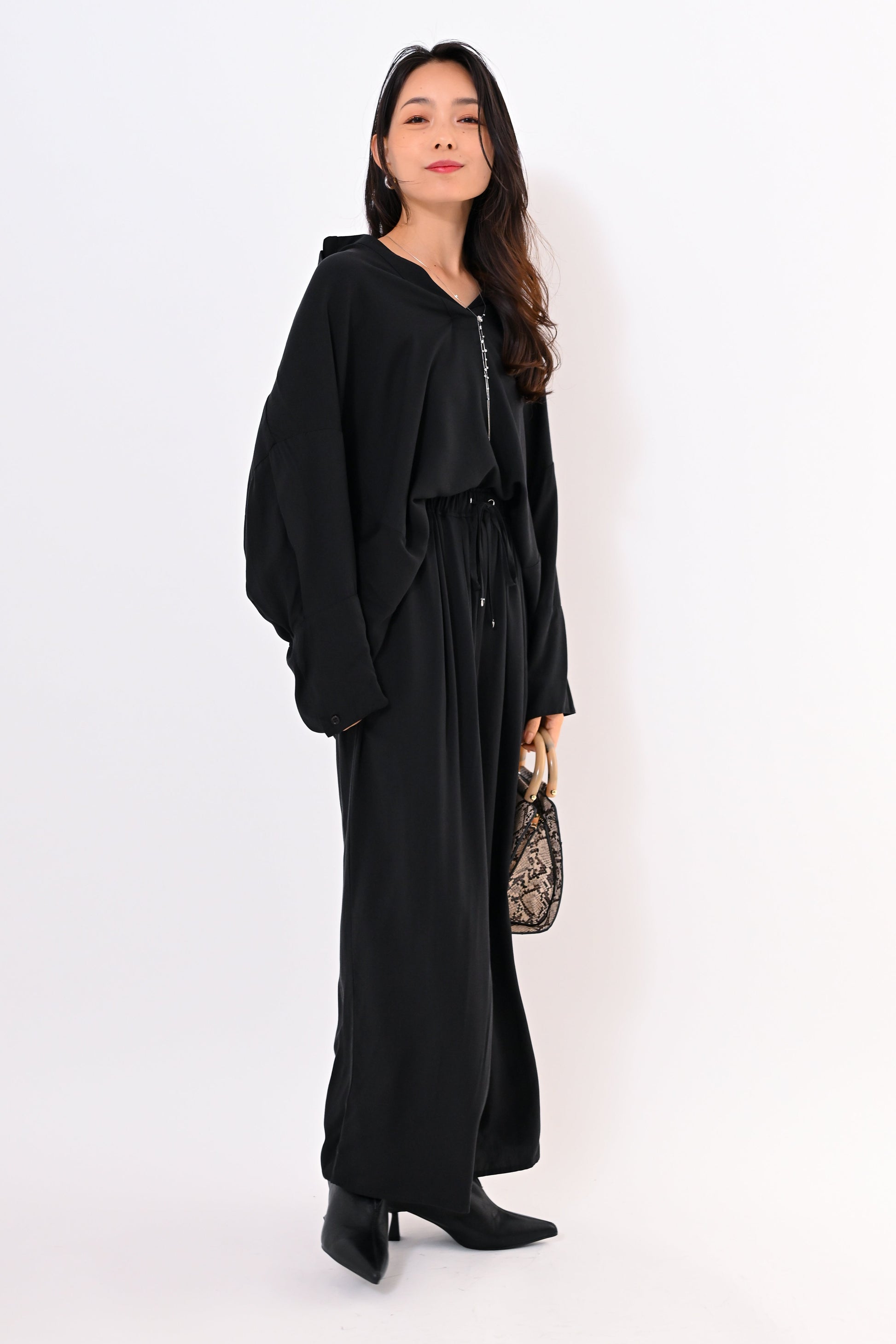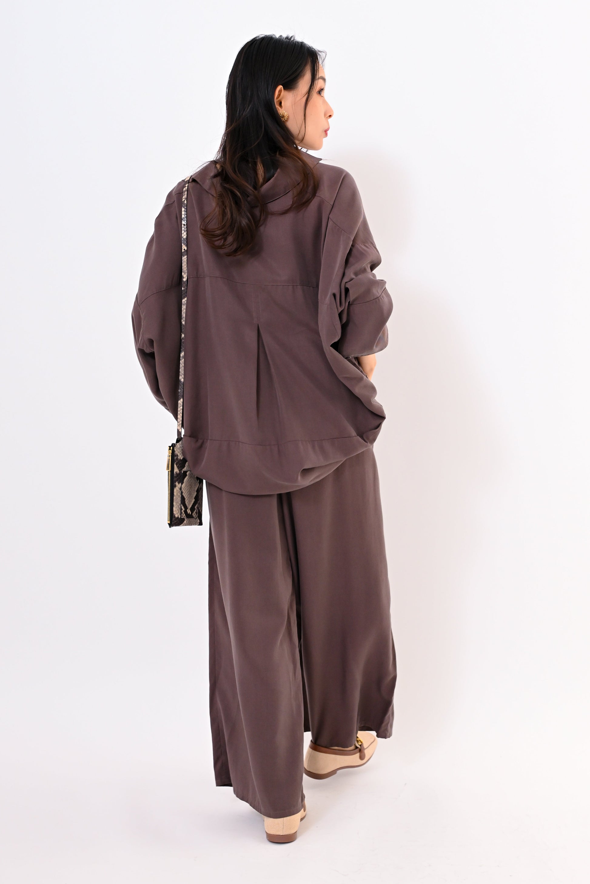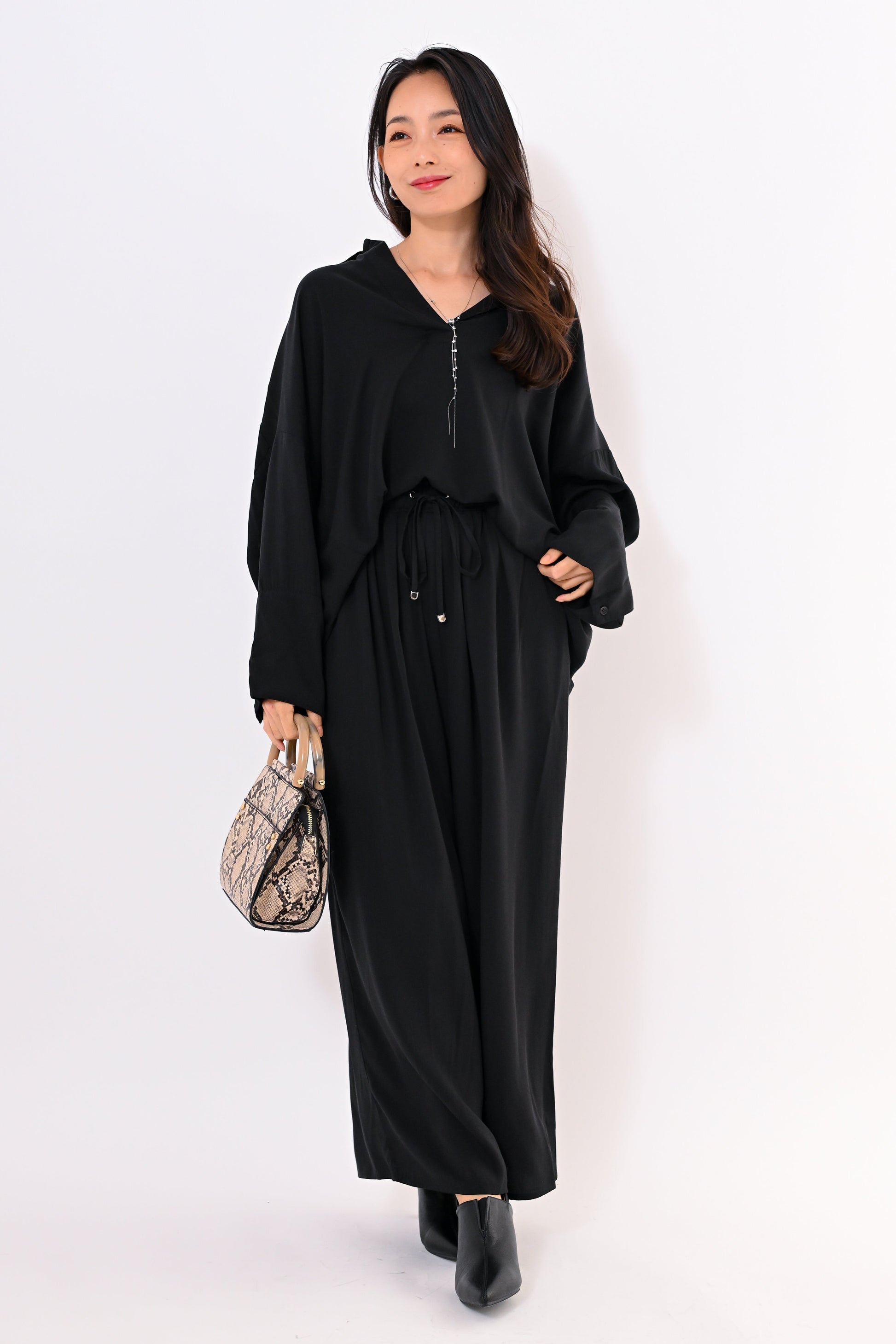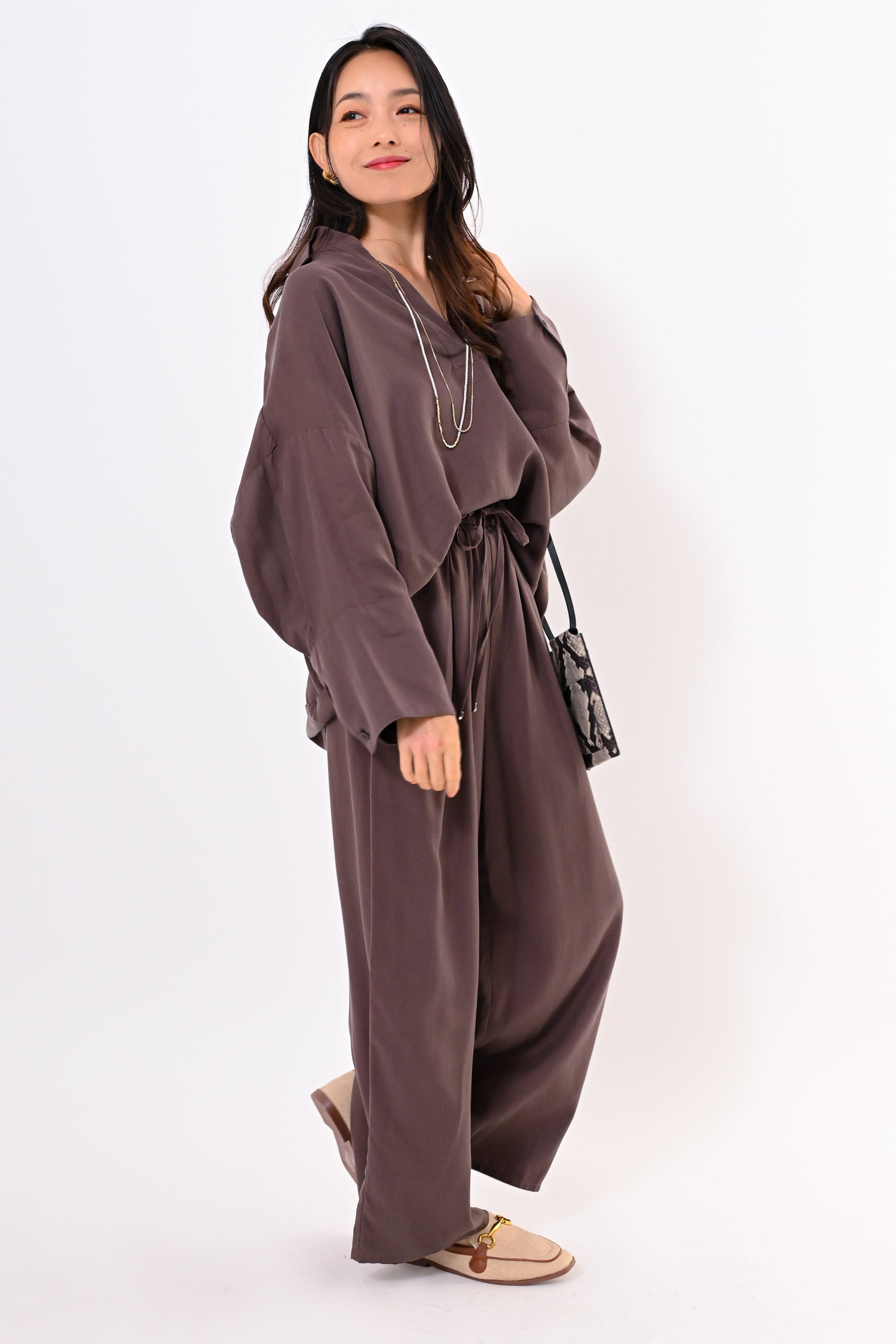 滑らかな落ち感と上品な光沢が魅力のテンセルツイルワイドパンツ。