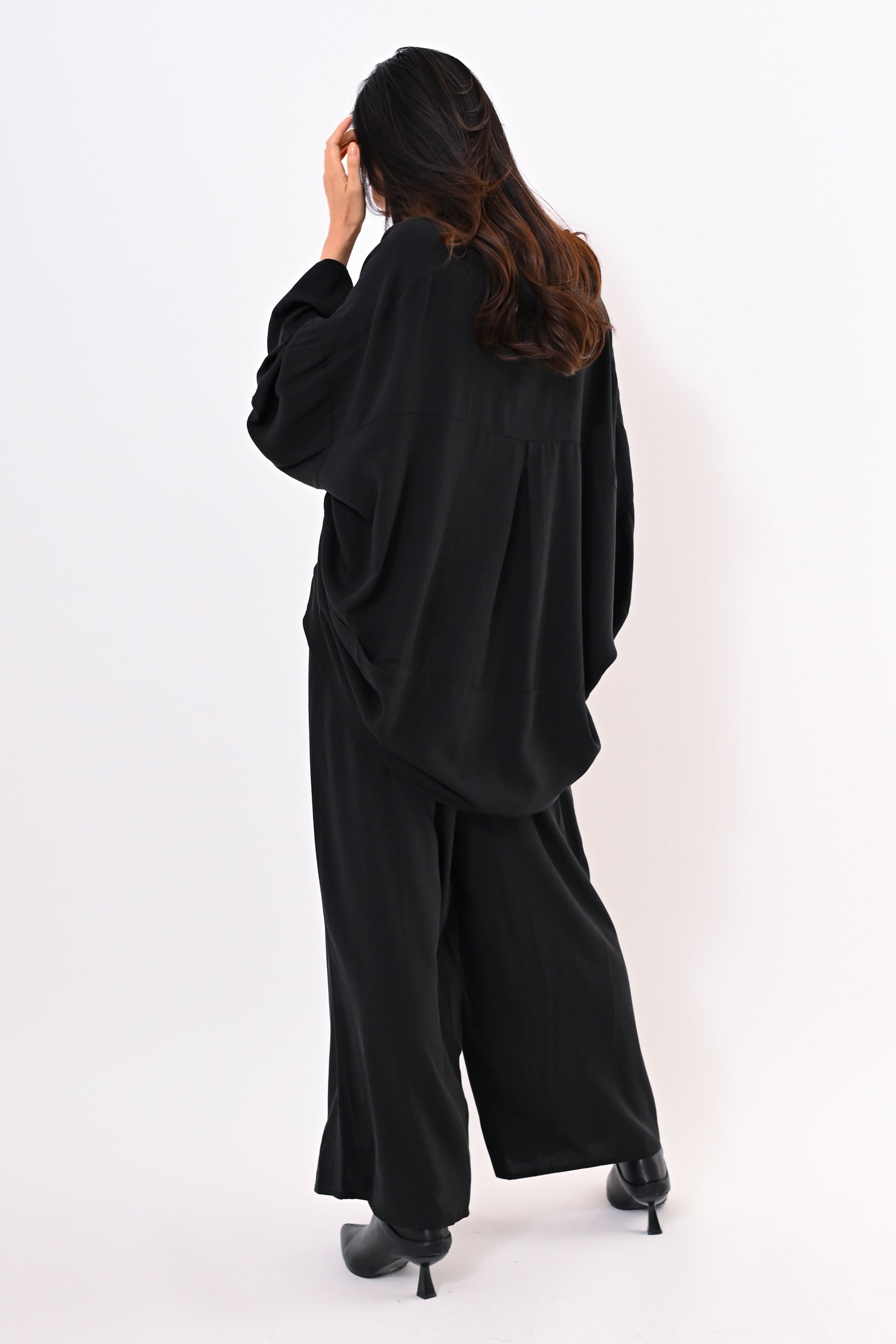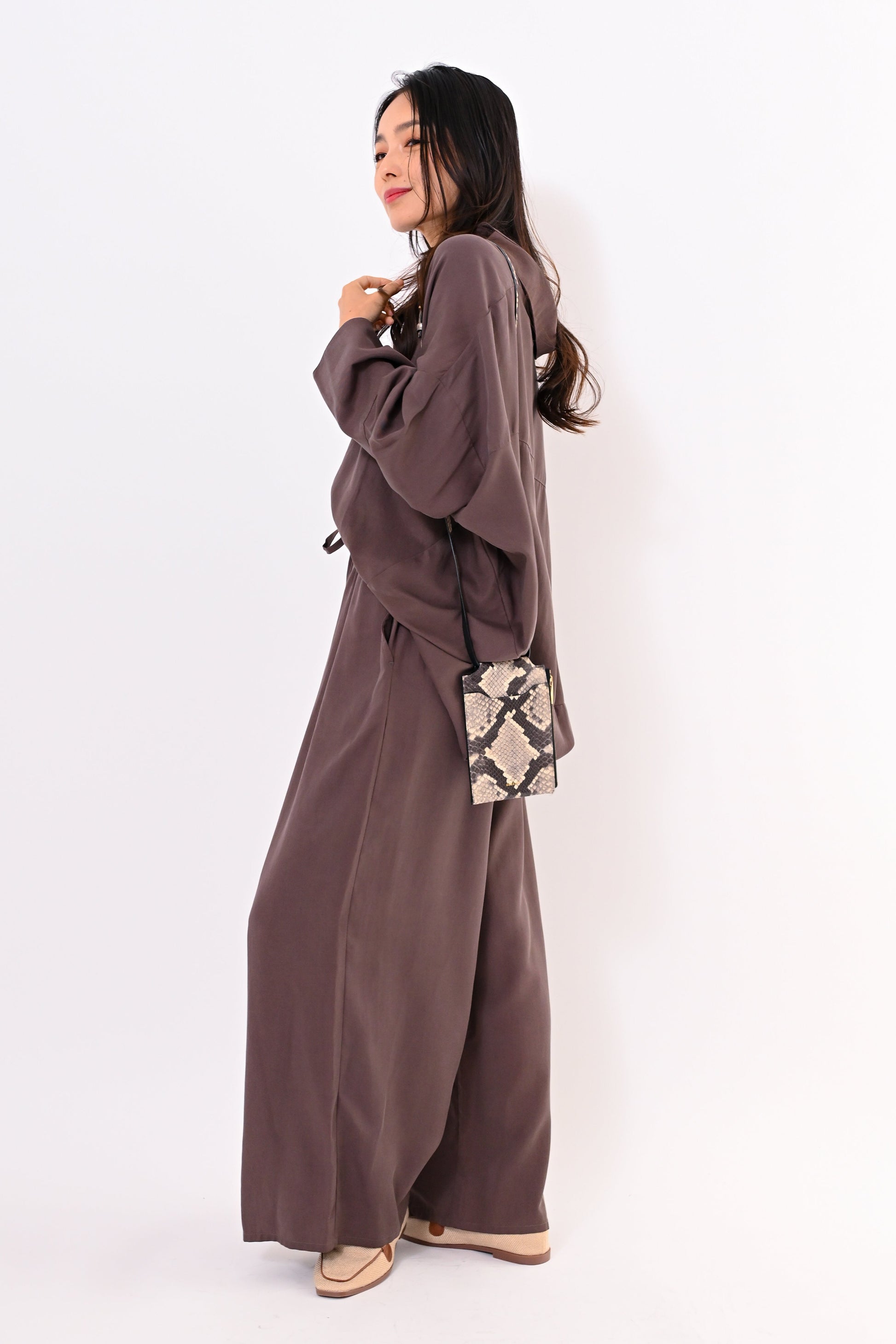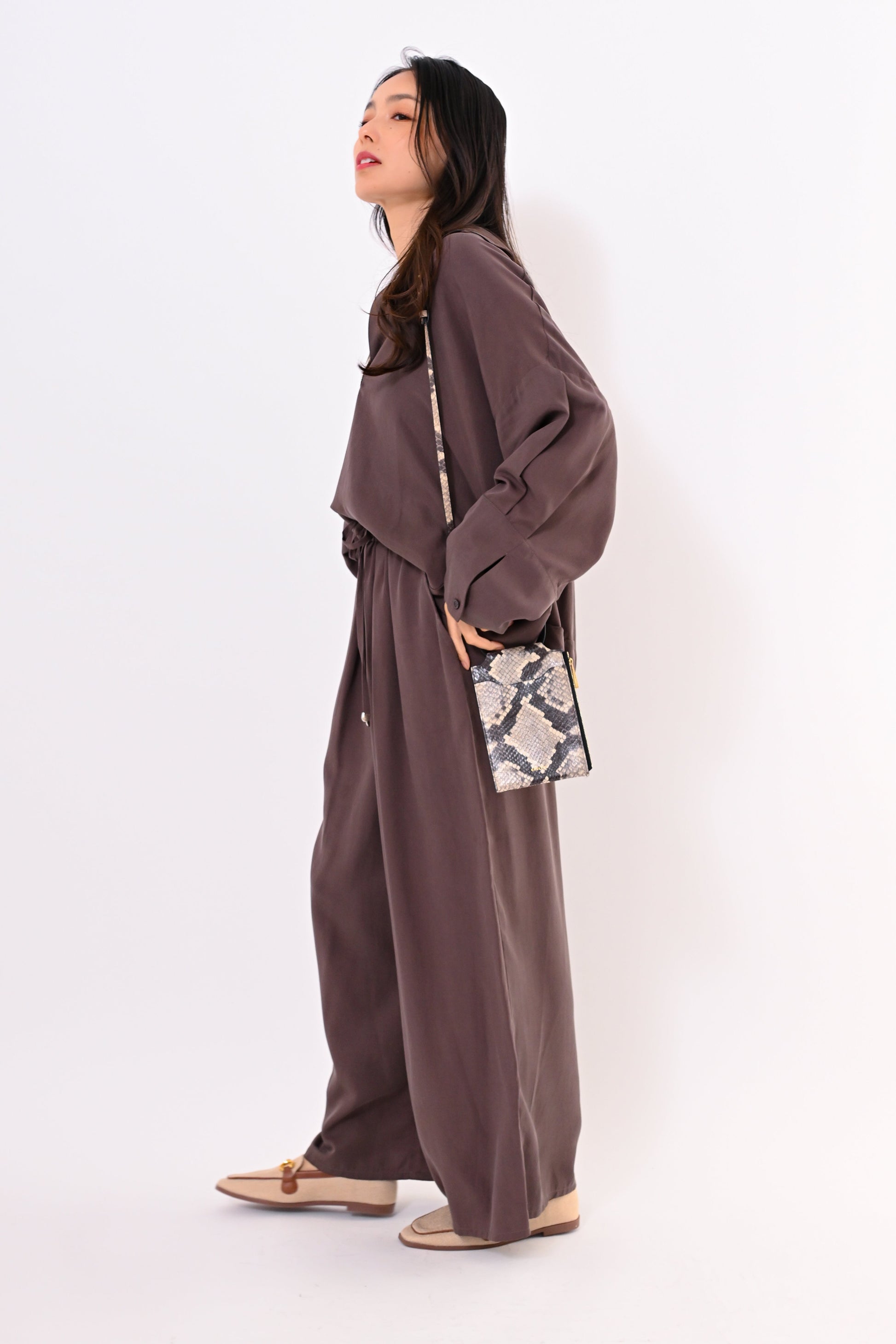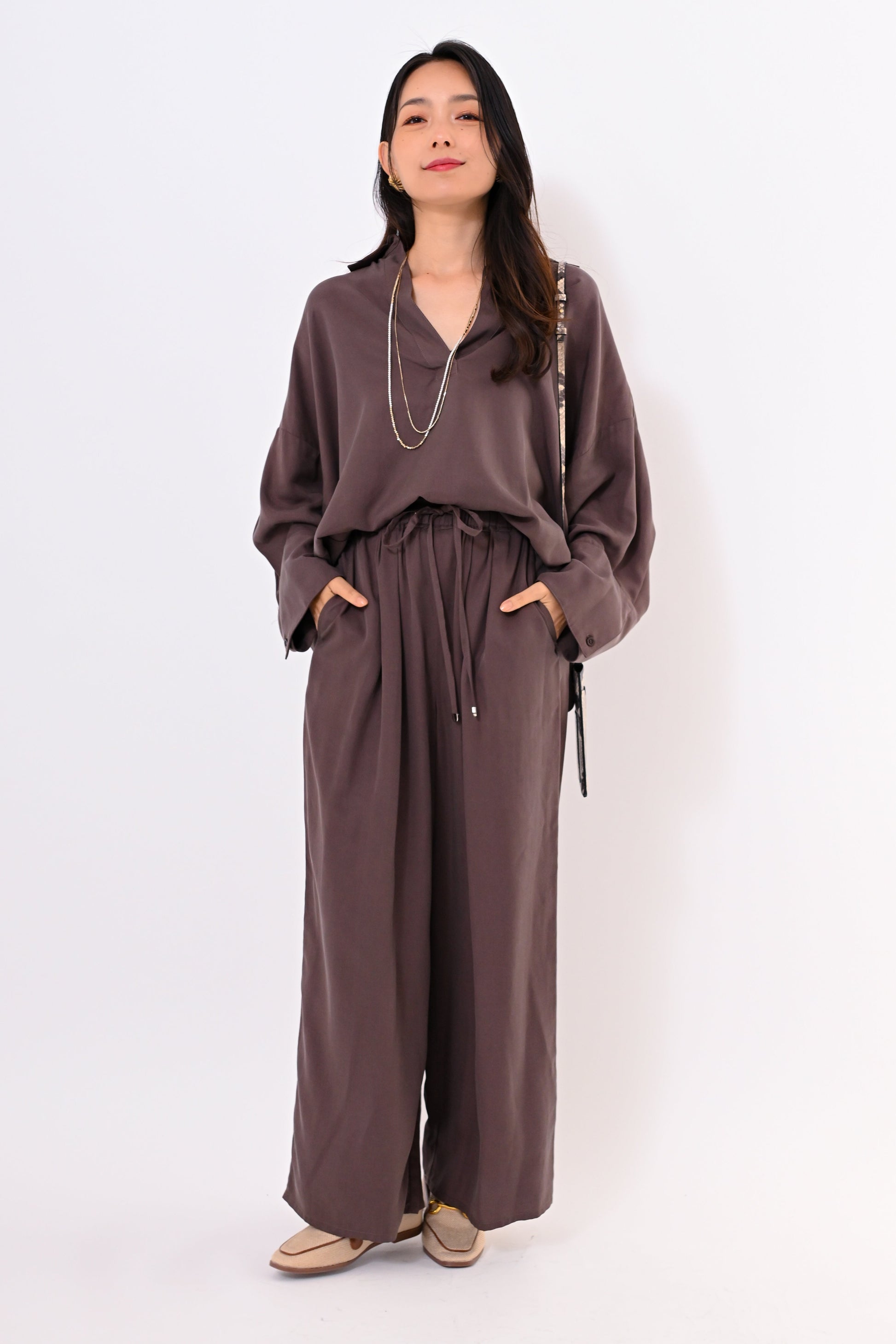 滑らかな落ち感と上品な光沢が魅力のテンセルツイルワイドパンツ。