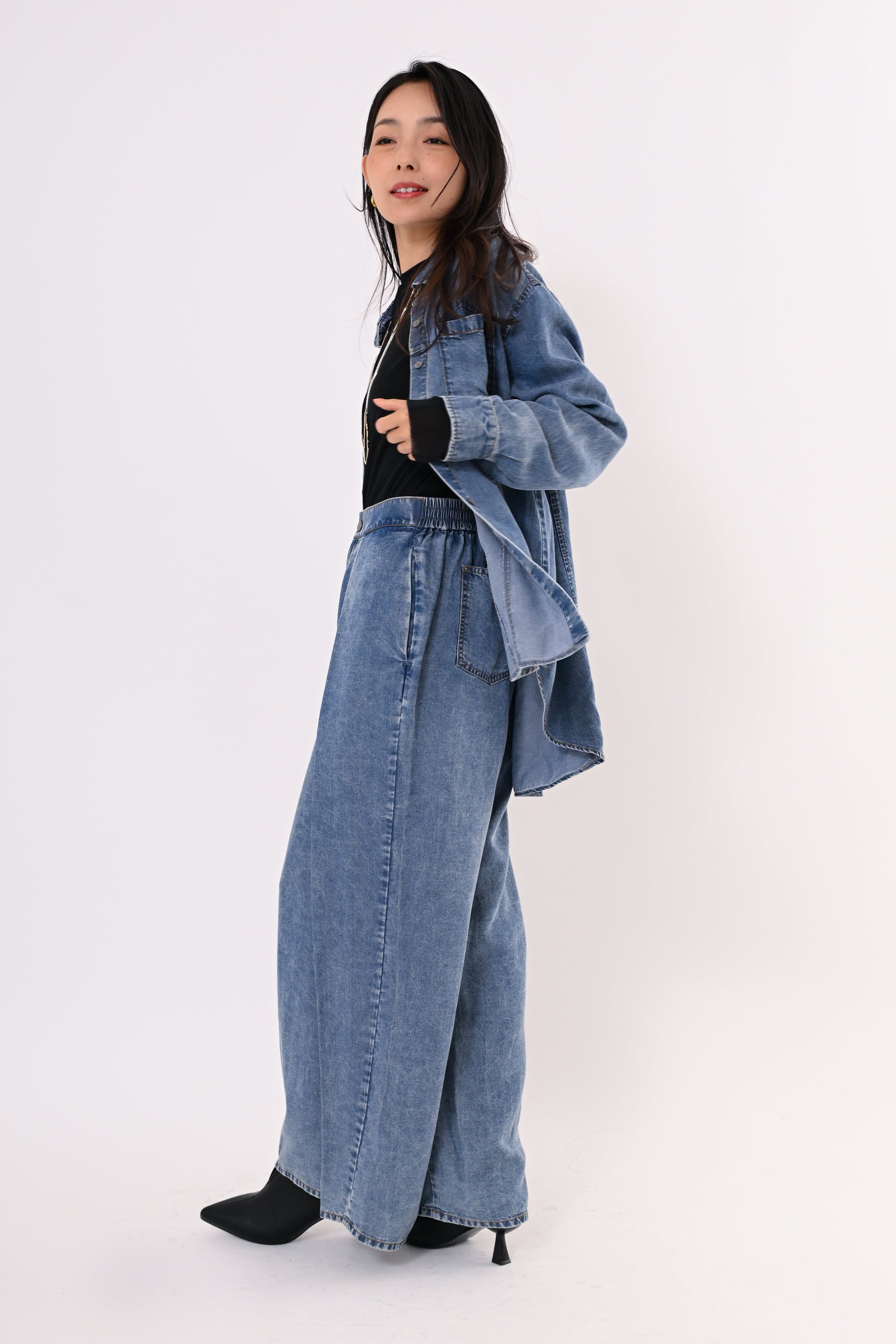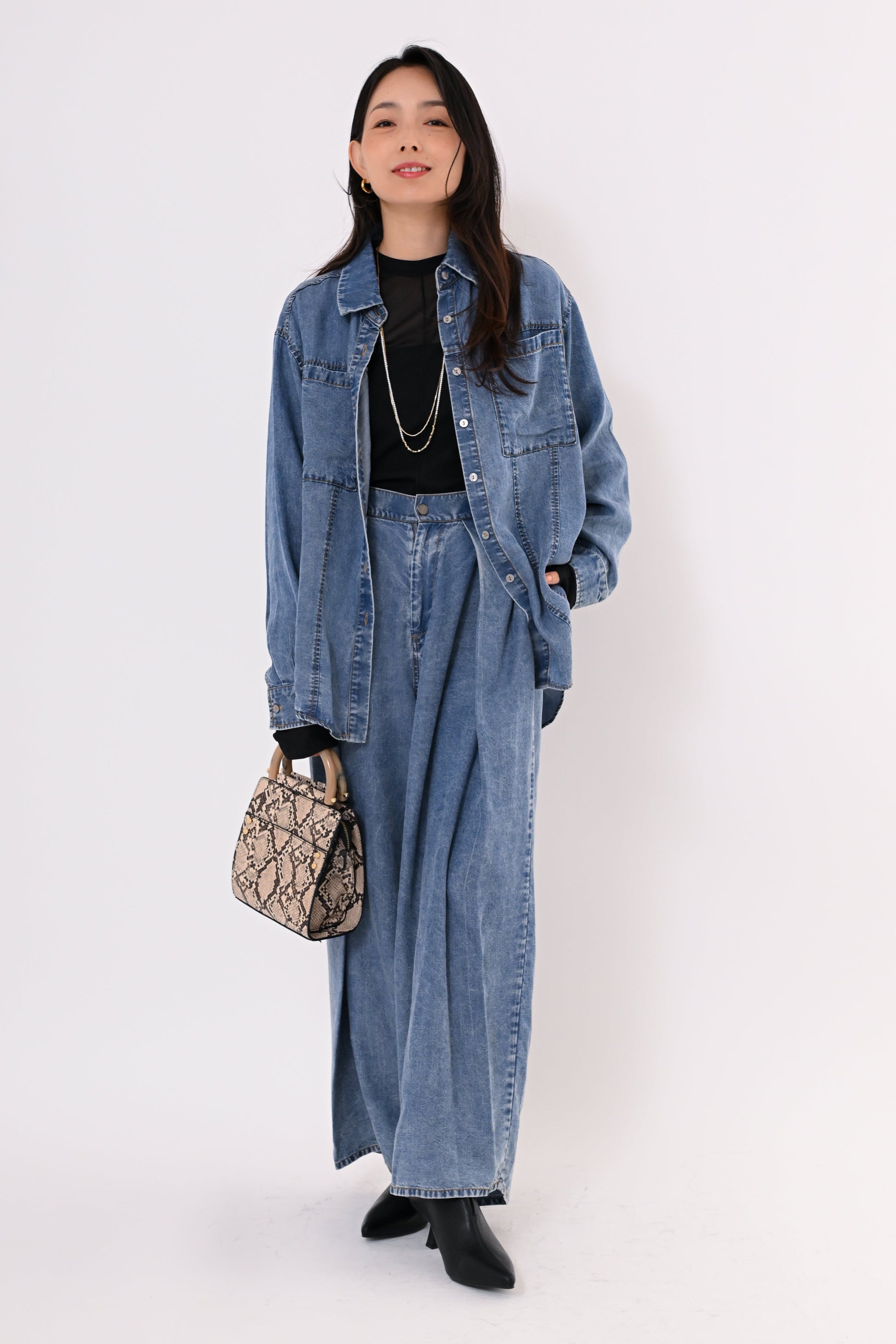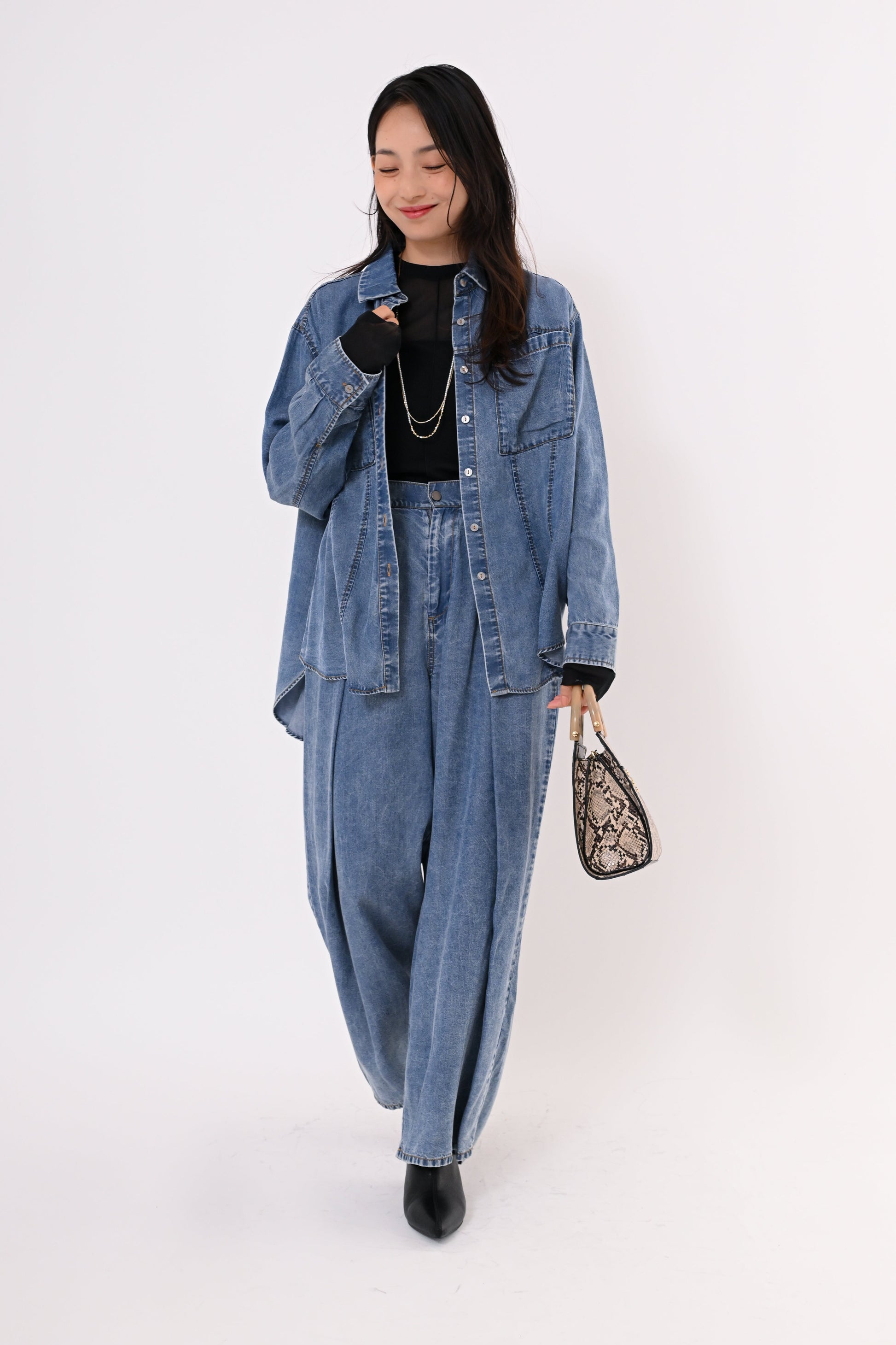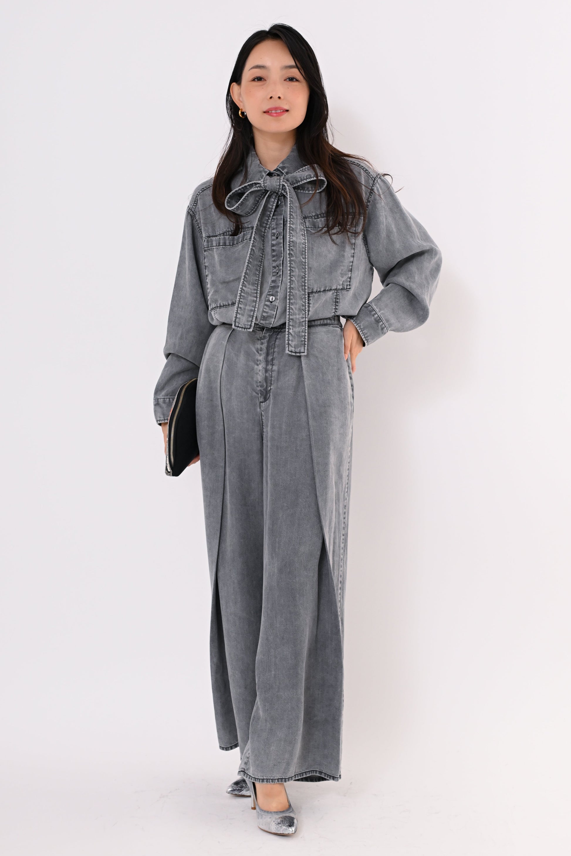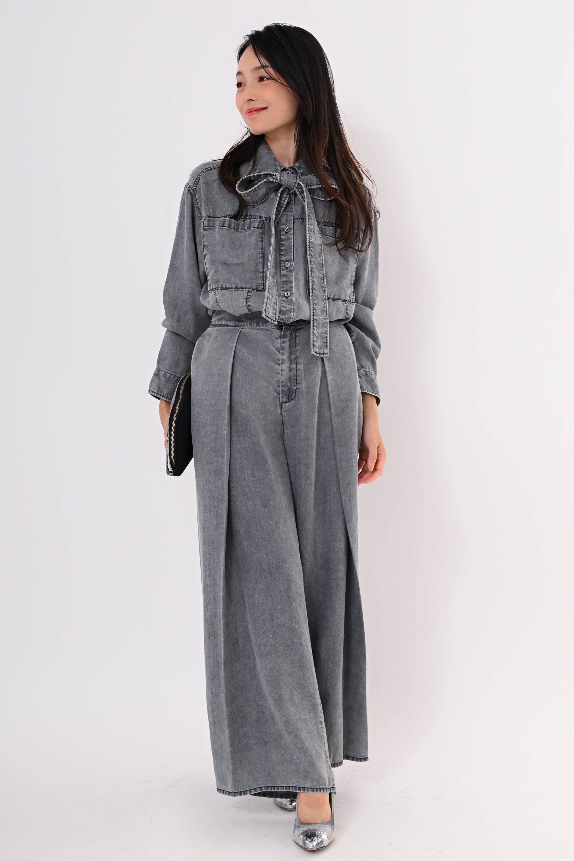 セットアップアイテムとしてテンセルデニムワイドタックパンツも展開しています。