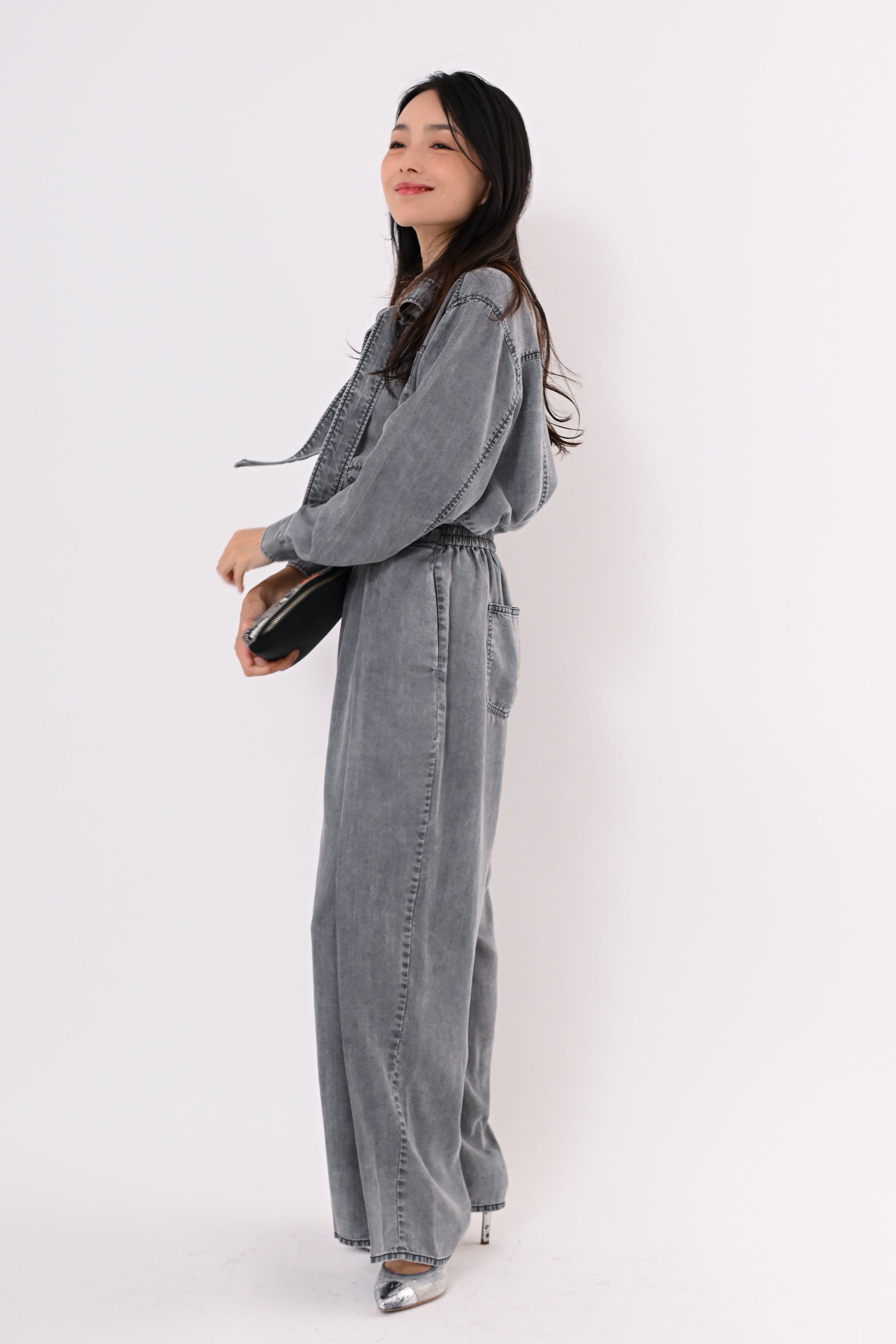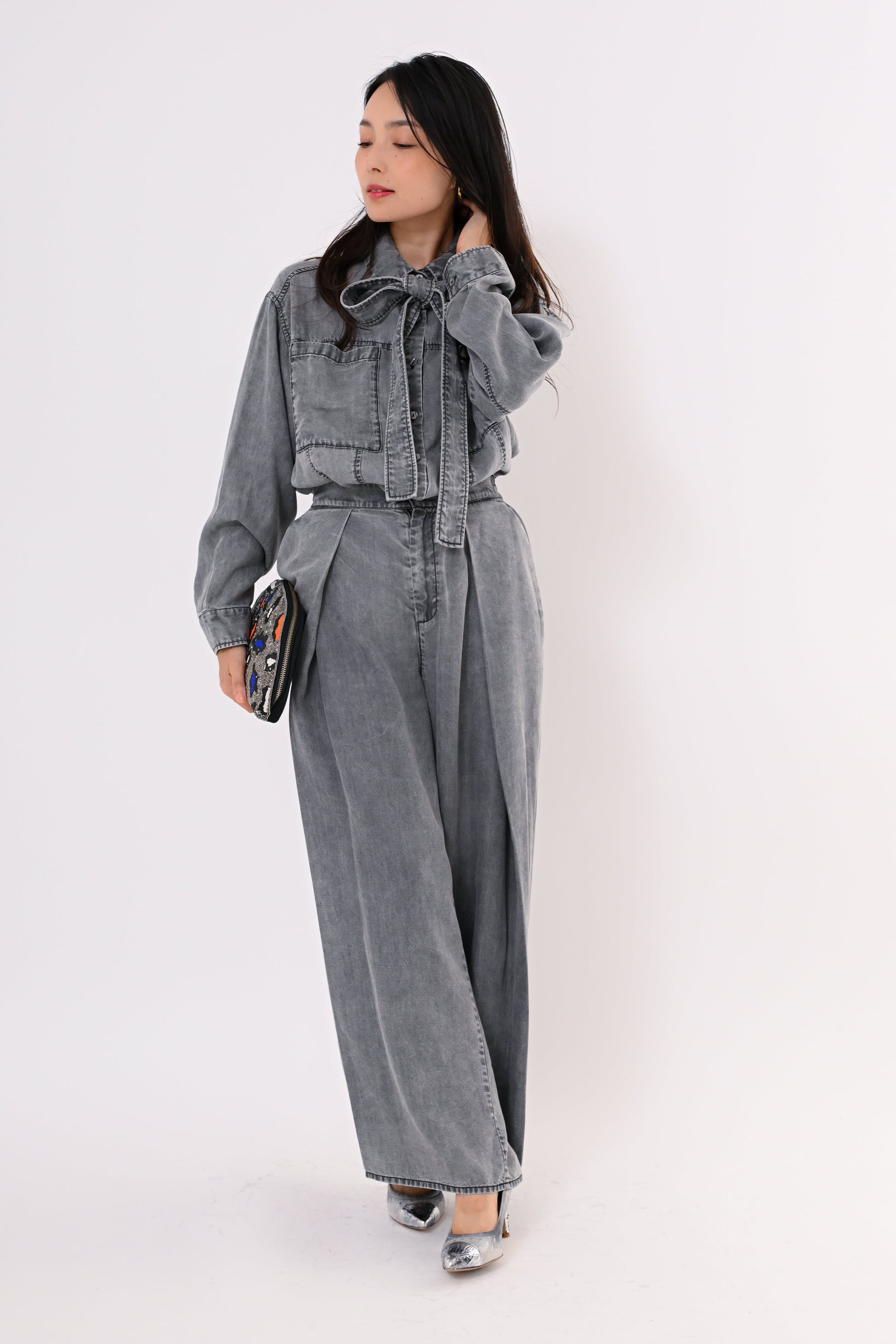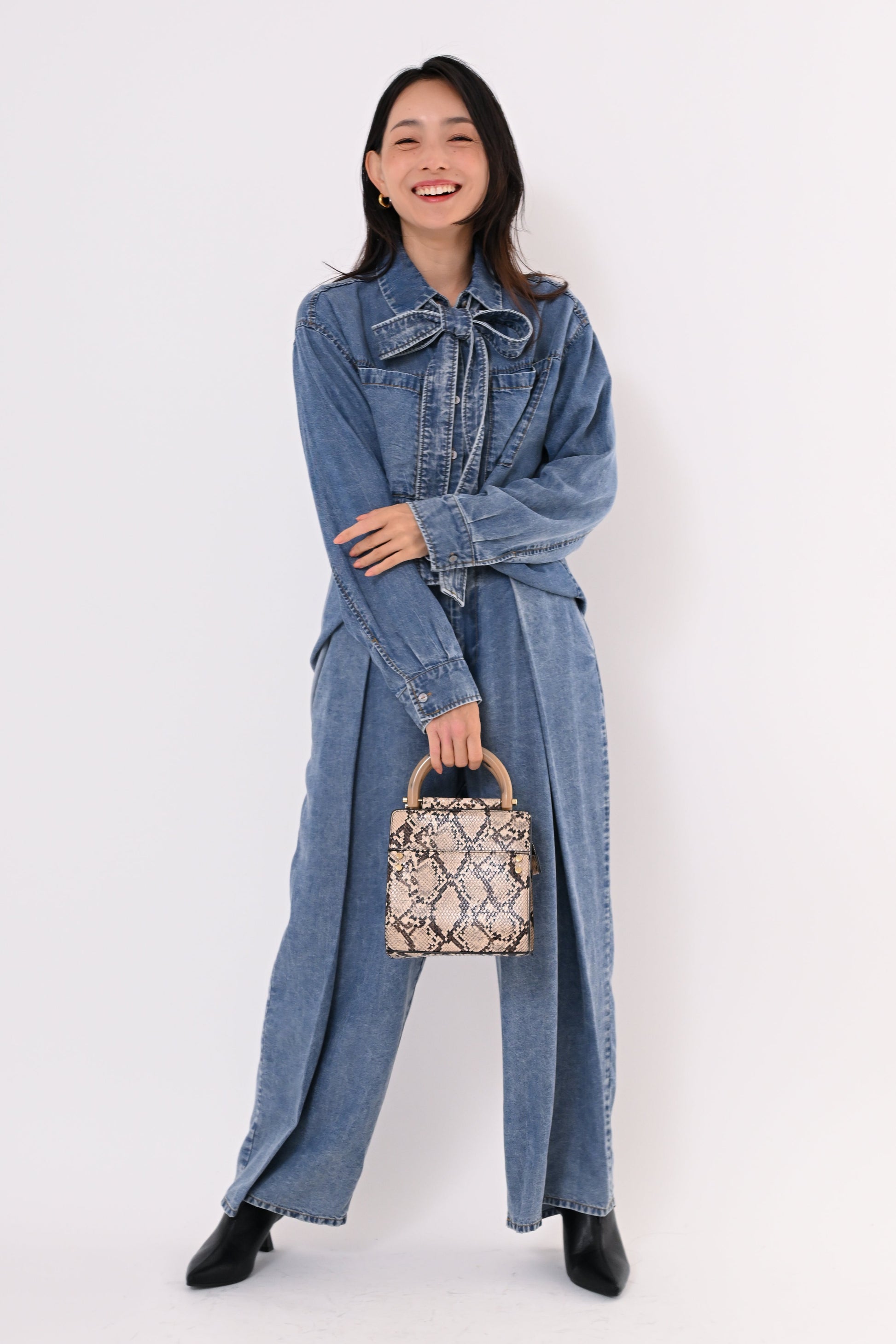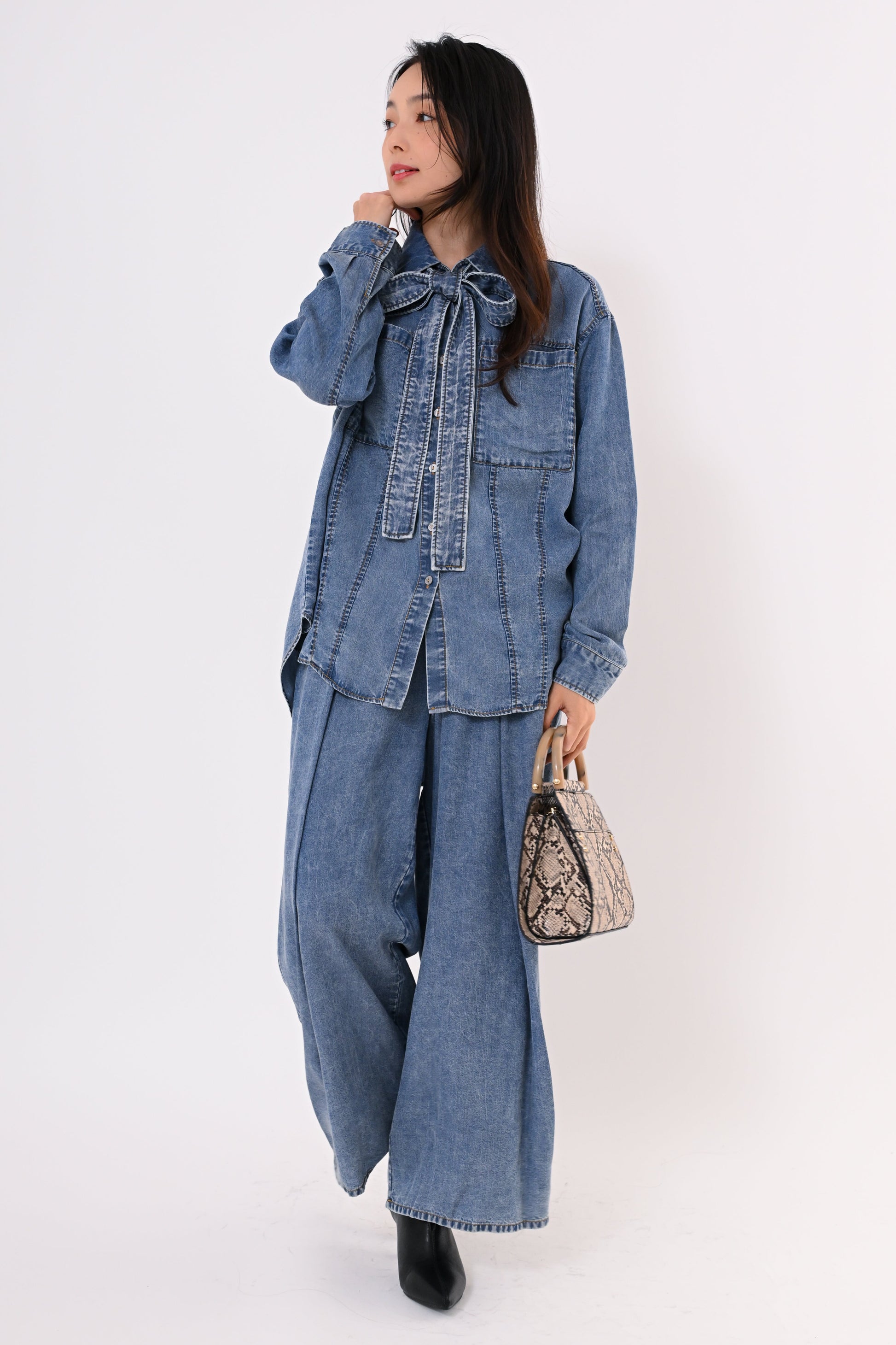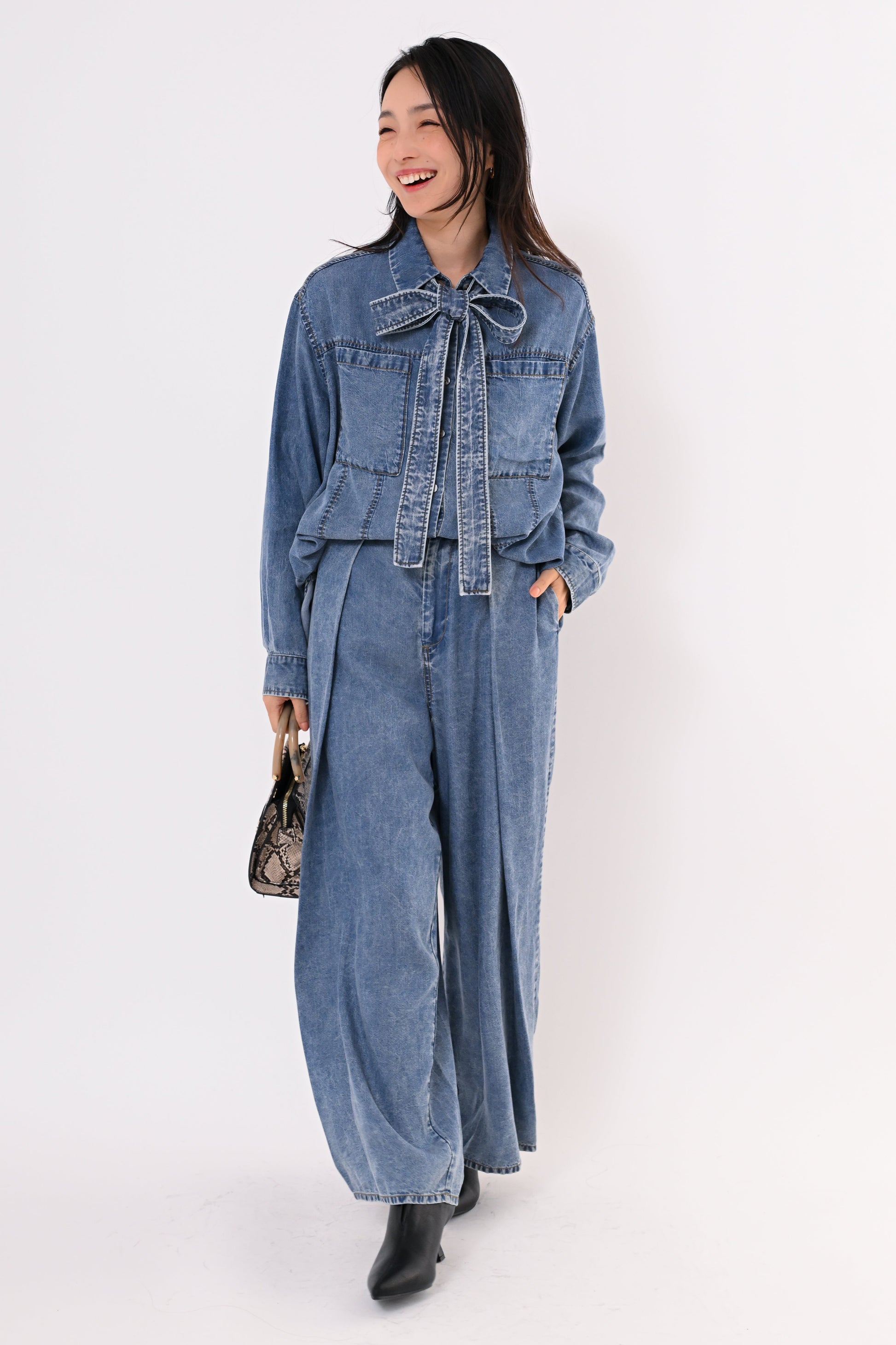 胸元の大きめのリボンが視線を引き、甘すぎない大人の可愛らしさを演出します。柔らかい素材感と程よい落ち感が、デニム特有のカジュアルさを抑えて上品な印象に。