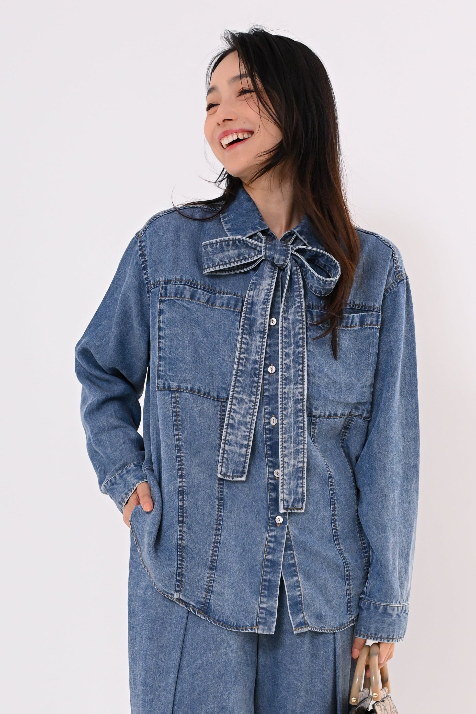 しなやかなテンセルデニムを使用した、女性らしさ漂うリボンタイ付きブラウス。