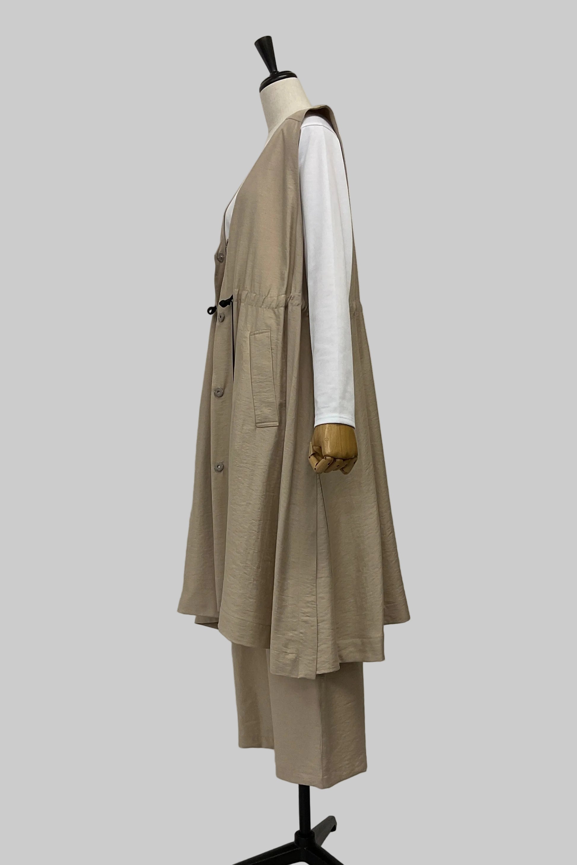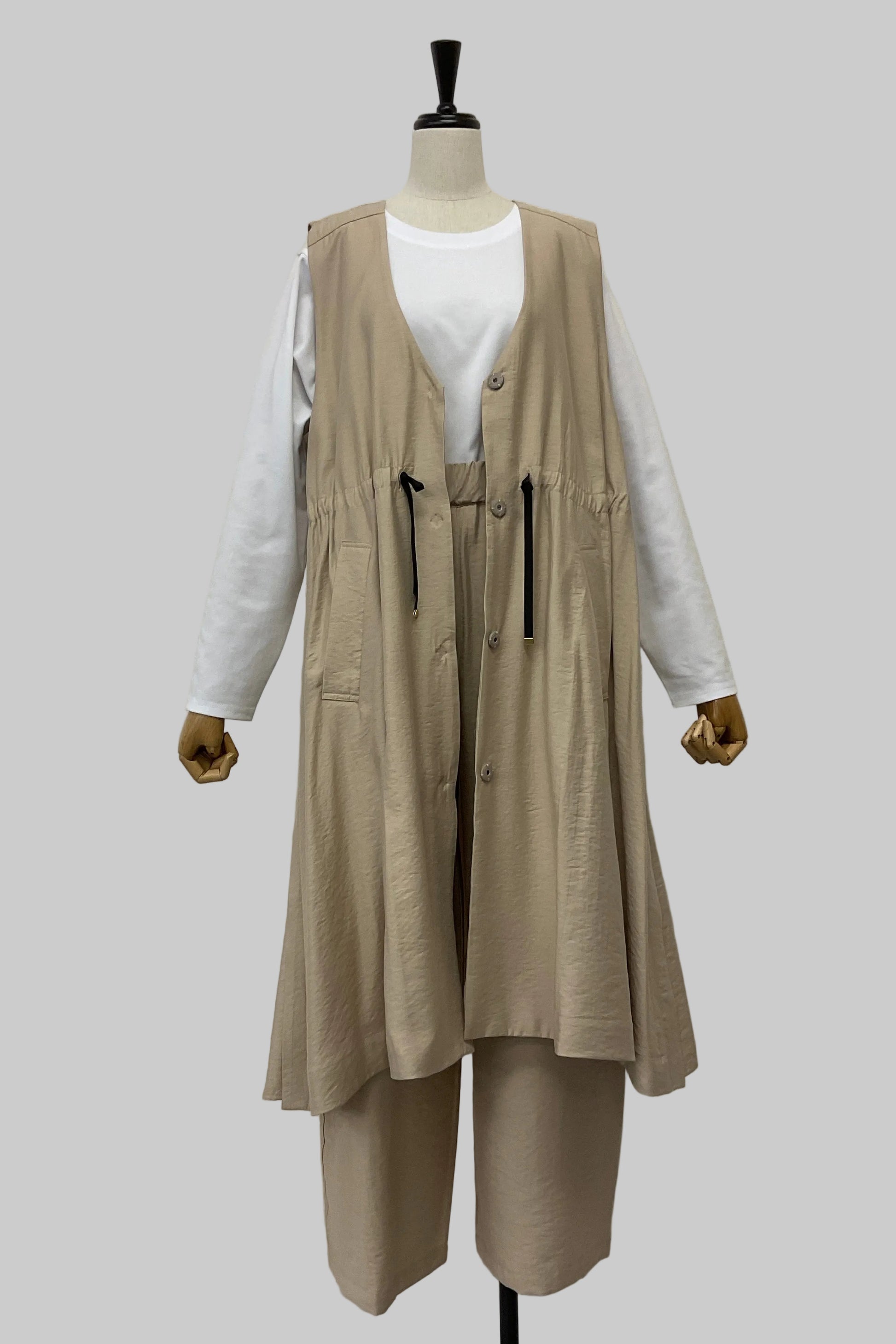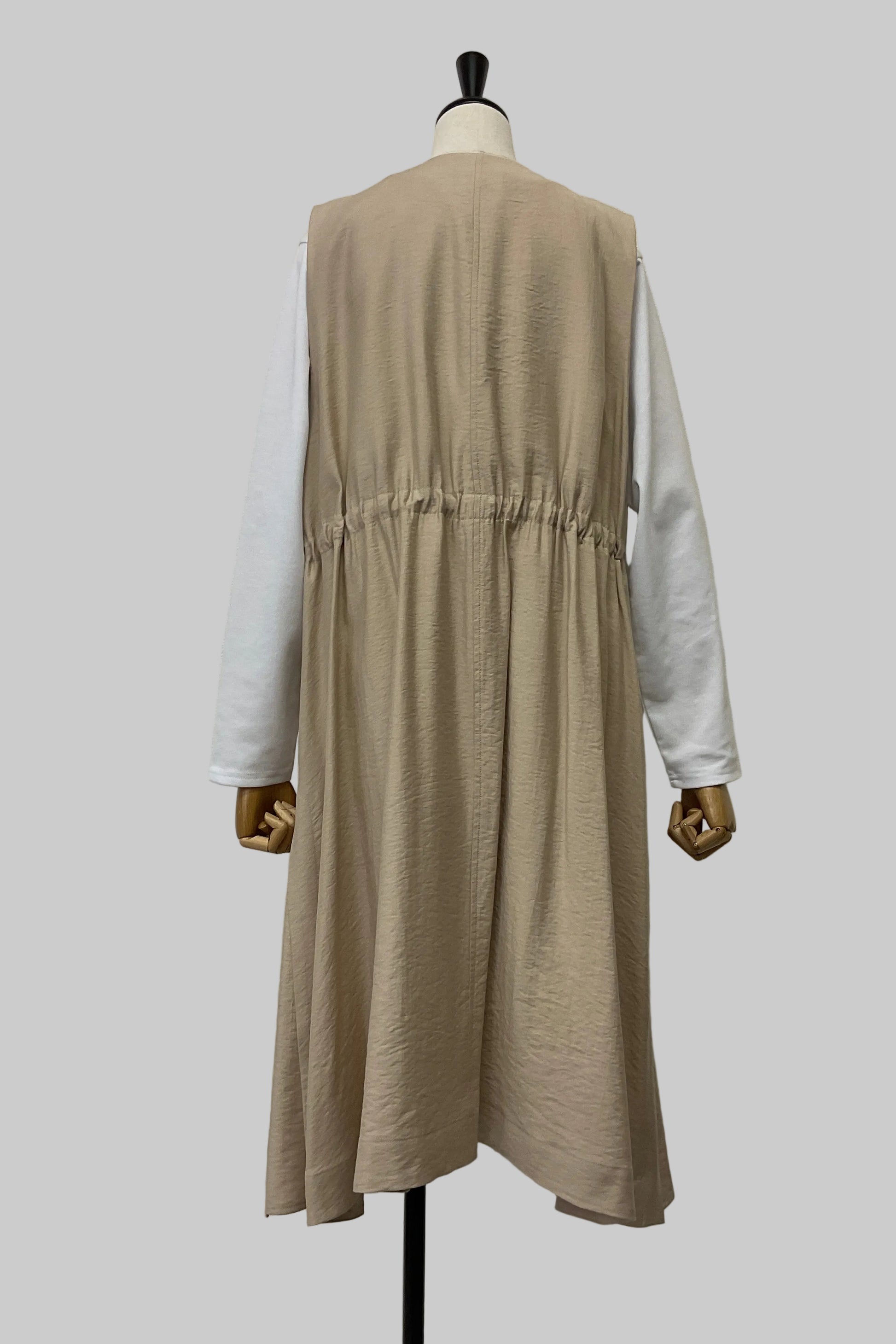 落ち感のあるワッシャーデシン素材を使用した、軽やかなロングジレ。フロントは無駄のないすっきりとしたデザインで、さらっと羽織るだけでスタイリングに自然な奥行きと縦ラインを演出します。ウエスト部分はドロスト仕様になっており、きゅっと絞ってメリハリをつけたり、ゆるめてリラクシーに着たりとシルエットのアレンジが可能。